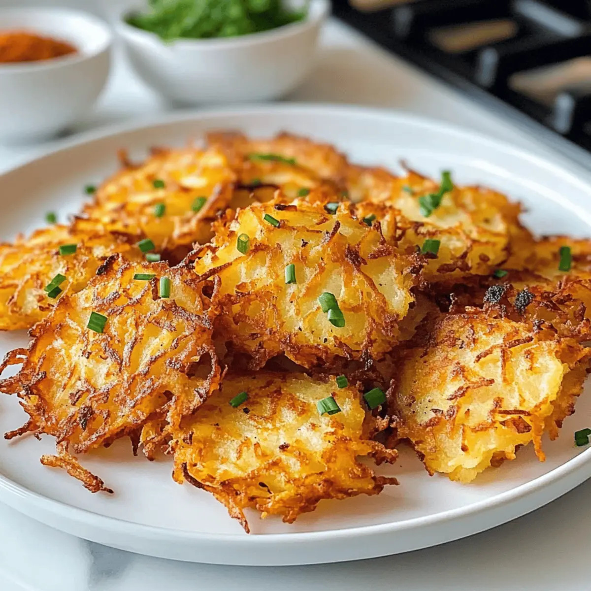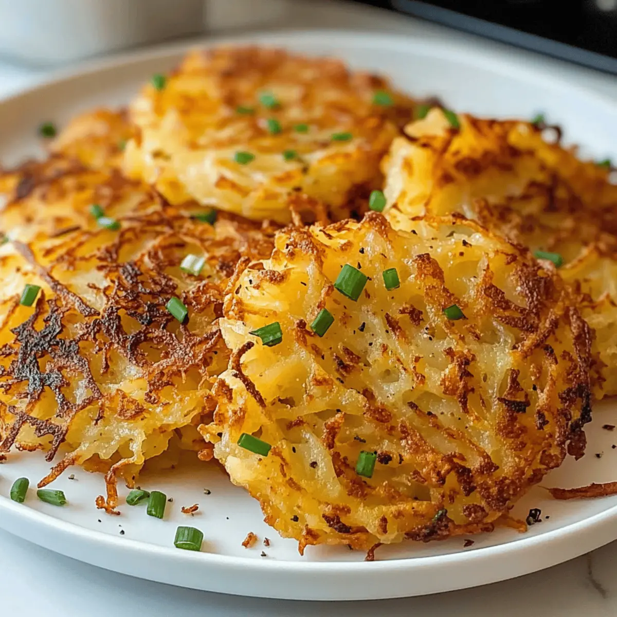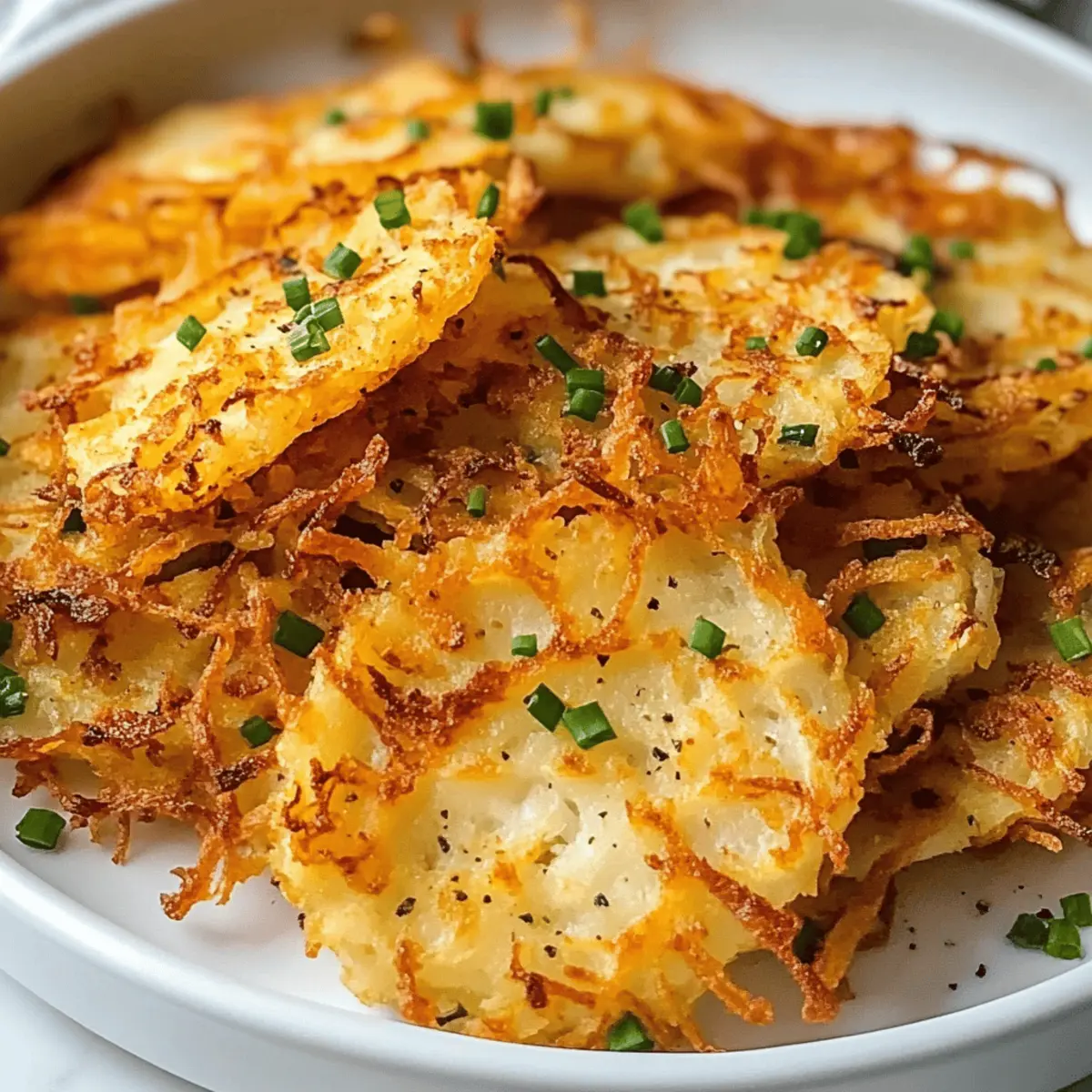Wenn ich am Wochenende in die Küche marschiere, ist es oft der unwiderstehliche Duft von knusprigen Hash Browns, der mich in die neue Woche begleitet. Diese luftigen Luftfritteusen-Hash Browns sind nicht nur goldbraun und zart, sie bringen auch das Gefühl eines Frühstücks im Diner direkt zu mir nach Hause – ganz ohne das übermäßige Öl! Sie sind schnell zubereitet und verschwinden innerhalb von Minuten vom Tisch, egal ob als Beilage zum Frühstück oder als Hingucker auf deiner Brunch-Party. Außerdem sind sie glutenfrei und vegan, sodass sie für jeden Genussberechtigten geeignet sind. Bist du bereit, deine Morgen zu verwandeln und diese köstlichen Hash Browns auszuprobieren? Warum sind diese Röstis so besonders? Krosse Textur: Diese Hash Browns erreichen eine perfekte Knusprigkeit durch die Luftfritteuse, ohne dabei viel Öl zu benötigen. Vielseitig verwendbar: Ob als Beilage zu Eiern oder als Star deiner Brunch-Party, sie passen zu vielen Gerichten. Gesundheit und Geschmack: Mit glutenfreien und veganen Eigenschaften sind sie ideal für alle Ernährungsweisen. Schnelle Zubereitung: In wenigen Minuten zauberst du ein köstliches Frühstück, das garantiert schnell verschwindet. Du kannst sogar mit verschiedenen Gewürzen spielen oder sie nach Belieben anpassen! Probiere dazu Air Fryer Mozzarella oder Air Fryer Churro für ein Upgrade deiner Morgenroutine! Air Fryer Hash Browns Zutaten Hinweis: Dieses Rezept ist nicht nur glutenfrei und vegan, sondern verspricht auch ein unvergessliches Geschmackserlebnis! Für die Röstis • Yukon-Kartoffeln – Diese sind die Hauptzutat, die Struktur und Stärke für die perfekte Knusprigkeit liefert; du kannst sie auch durch Russet- oder Süßkartoffeln ersetzen. • Paprika – Fügt eine subtile Wärme und Tiefe des Geschmacks hinzu; verwende geräucherte Paprika für eine andere Geschmacksnote. • Knoblauchpulver – Verleiht den Röstis eine herzliche Note; frischer, gehackter Knoblauch kann ebenfalls verwendet werden. • Koscheres Salz – Essenziell für die Würze; passe die Menge deinem persönlichen Geschmack an. • Schwarzer Pfeffer – Fügt eine milde Schärfe hinzu; ersetze ihn durch weißen Pfeffer für einen sanfteren Geschmack. • Spray für antihaftende Beschichtung – Verhindert das Ankleben in der Luftfritteuse; ein leichter Ölfilm sorgt für noch mehr Knusprigkeit, falls gewünscht. Für die Garnitur • Schnittlauch oder Petersilie – Optional, um Frische und Farbe zum Gericht hinzuzufügen. Step-by-Step Instructions für Krosse Air Fryer Röstis Step 1: Vorbereitung Schäle die Yukon-Kartoffeln und reibe sie mit einer Boxreibe mit großen Löchern in eine Schüssel. Dies sorgt dafür, dass die Röstis eine gute Struktur erhalten. Achte darauf, dass die Raspeln gleichmäßig dick sind, damit sie gleichmäßig garen können. Step 2: Abspülen Gib die geriebenen Kartoffeln in eine Schüssel mit kaltem Wasser und spüle sie gründlich, bis das Wasser klar ist. Dies entfernt überschüssige Stärke und sorgt dafür, dass die Röstis schön knusprig werden. Es ist wichtig, diesen Schritt sorgfältig zu befolgen. Step 3: Trocknen Lass die Kartoffeln gut abtropfen und trockne sie mit Küchenpapier gründlich ab. Ein gut getrockneter Kartoffelteig ist entscheidend, um gummiartige Röstis zu vermeiden. Stelle sicher, dass keine Feuchtigkeit zurückbleibt, um die Knusprigkeit zu gewährleisten. Step 4: Würzen Vermische in einer großen Schüssel die getrockneten Raspeln mit Paprika, Knoblauchpulver, Koscherem Salz und schwarzem Pfeffer. Rühre alles gut um, bis die Kartoffeln gleichmäßig gewürzt sind. Diese Gewürzmischung wird den Krossen Air Fryer Röstis das besondere Aroma verleihen. Step 5: Luftfrittieren (Teil 1) Spraye den Korb der Luftfritteuse leicht mit Antihaftspray ein. Verteile die gewürzten Kartoffeln gleichmäßig im Korb, aber überlade ihn nicht. Sprühe die Oberfläche der Kartoffeln mit etwas Öl ein und stelle die Luftfritteuse auf 180°C ein. Brate sie für 8 Minuten. Step 6: Luftfrittieren (Teil 2) Öffne den Korb nach 8 Minuten und rühre die Röstis vorsichtig um, um Klumpen zu lösen. Setze den Korb zurück in die Luftfritteuse und brate erneut für weitere 6-8 Minuten, bis die Röstis goldbraun und knusprig sind. Überprüfe regelmäßig die perfekte Knusprigkeit, um optimale Ergebnisse zu erzielen. Step 7: Servieren Nimm die Crosse Air Fryer Röstis aus dem Korb und richte sie auf einem Teller an. Garniere sie nach Belieben mit frischem Schnittlauch oder Petersilie für einen Farbtupfer. Serviere sie heiß, um die beste Textur und den herrlichen Geschmack zu genießen. Variationen & Ersatzmöglichkeiten für Air Fryer Röstis Lass deiner Kreativität freien Lauf und mache dieses Rezept ganz nach deinem Geschmack! Zwiebeln hinzufügen: Diced onions bringen eine süße, aromatische Note. Einfach mit den Kartoffeln vermengen, um zusätzlichen Geschmack zu entfalten. Süßkartoffeln ersetzen: Verwandle deine Röstis mit Süßkartoffeln für eine nahrhafte, süßere Variante. Die Farbe und der Geschmack werden überraschend köstlich! Geräucherte Paprika: Ersetze normale Paprika durch geräucherte Paprika, um eine tiefe, rauchige Geschmacksnote hinzuzufügen. Dies verleiht dem Gericht eine ganz neue Dimension. Cayennepfeffer für Schärfe: Wenn du es schärfer magst, füge einen Hauch von Cayennepfeffer zu den Gewürzen hinzu. Dies sorgt für eine angenehme Würze. Frische Kräuter: Anstelle von Schnittlauch kannst du auch frischen Oregano oder Thymian ausprobieren. Diese Kräuter verleihen den Röstis eine wunderbare Frische. Käse oben drauf: Für eine gehaltvollere Variante kannst du geriebenen Käse über die Röstis streuen, bevor du sie in die Luftfritteuse gibst. Schmelzender Käse macht alles besser! Kokosöl verwenden: Ersetze das normale Öl durch Kokosöl für einen tropischen Geschmack und eine gesunde Fettquelle. Es wird eine warme Süße hinzufügen. Servieren mit Dip: Ergänze 