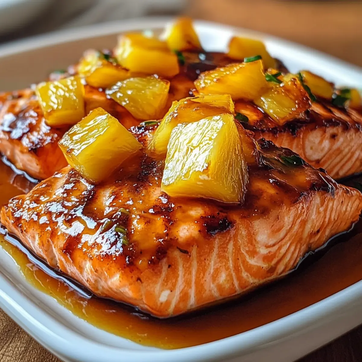 „Warum immer zu Fast Food greifen, wenn man mit nur wenigen Zutaten etwas Außergewöhnliches zaubern kann?“ Wenn ich den süß-sauren Duft von ananas-glasiertem Lachs in meiner Küche wahrnehme, schlägt mein Herz höher. Diese Kombination aus saftigen Lachsfilets und einer glänzenden Ananasglasur verwandelt ein einfaches Rezept in ein geschmackliches Fest, das zum Staunen einlädt. Mein Rezept für ananas-glasierten Lachs ist nicht nur kinderleicht zu machen, sondern auch perfekt für entspannte Wochentage oder festliche Anlässe. Und das Beste daran: Es ist glutenfrei und bringt einen Hauch asiatischer Küche auf Ihren Tisch. Ich kann Ihnen versichern, dass dieser Lachs beim nächsten Familienessen der Star sein wird! Wer könnte da widerstehen? Sind Sie bereit für ein kulinarisches Abenteuer? Warum ist ananas-glasierter Lachs so besonders? Einfachheit, die begeistert: Mit nur wenigen Zutaten und einfachen Schritten zaubern Sie ein köstliches Gericht, das ganz sicher einen bleibenden Eindruck hinterlässt. Tropische Aromen: Die Kombination aus süßer Ananas und herzhaftem Lachs ist eine Geschmacksexplosion, die an Urlaub erinnert. Perfekt für jede Gelegenheit: Ob für ein schnelles Abendessen unter der Woche oder ein festliches Familientreffen – dieses Rezept passt immer! Gesund und nahrhaft: Lachs ist reich an Omega-3-Fettsäuren, und die glasierte Note macht es zu einer gesunden Wahl. Flexibel und anpassbar: Experimentieren Sie mit unterschiedlichen Früchten oder Gewürzen und schaffen Sie Ihre eigene, einzigartige Variante. Werfen Sie auch einen Blick auf unsere Variationen für mehr Inspiration. Ananas-Glasierte Lachs Zutaten • Entdecken Sie, was Sie für dieses köstliche Gericht benötigen! Für den Lachs Lachsfilets – Wählen Sie frische, vorzugsweise wild gefangene Filets für den besten Geschmack. Olivenöl – Hilft beim perfekten Anbraten und verhindert ein Ankleben. Salz – Verstärkt den natürlichen Geschmack des Lachses. Schwarzer Pfeffer – Fügt eine milde Wärme und Tiefe hinzu. Für die Glasur Frische oder Dosenananas – Sorgt für Süße und Textur; wenn Sie Dosen verwenden, gut abtropfen lassen. Brauner Zucker – Für zusätzliche Süße und Karamellisierung in der Glasur. Sojasauce – Liefert eine umami Tiefe; achten Sie darauf, eine glutenfreie Variante zu wählen, wenn nötig. Reisessig – Bringt Frische in die Glasur; kann durch Apfelessig oder weißen Essig ersetzt werden. Gehackter Knoblauch – Verleiht der Glasur herzhaften Geschmack und Aroma. Frisch geriebener Ingwer (optional) – Bringt eine angenehme Wärme und frischen Pfiff. Für die Garnitur Frische Petersilie – Für den letzten Schliff; sorgt für Farbe und Kräuternote. Mit diesen Zutaten können Sie einen unwiderstehlichen ananas-glasierten Lachs zaubern, der ganz sicher die Herzen Ihrer Gäste erobern wird! Step-by-Step Instructions für Ananas-Glasierte Lachs Step 1: Ofen vorheizen und Backform vorbereiten Heizen Sie Ihren Ofen auf 200 °C (400 °F) vor. In der Zwischenzeit fetten Sie eine Backform mit etwas Olivenöl ein, um sicherzustellen, dass der Lachs beim Backen nicht anklebt. Diese Vorbereitungen helfen dabei, den perfekten Ananas-Glasierten Lachs zu kreieren. Step 2: Glasur zubereiten In einer kleinen Schüssel mischen Sie den braunen Zucker, die Sojasauce, den Reisessig, den gehackten Knoblauch und optional den geriebenen Ingwer. Rühren Sie alles mit einem Schneebesen glatt, bis die Mischung eine einheitliche Konsistenz erreicht. Diese schmackhafte Glasur wird dem Lachs ein köstliches Aroma verleihen. Step 3: Lachs vorbereiten Tupfen Sie die Lachsfilets mit einem Papiertuch trocken, um überschüssige Feuchtigkeit zu entfernen, und reiben Sie sie mit Olivenöl ein. Würzen Sie die Filets großzügig mit Salz und schwarzem Pfeffer. Diese Schritte sorgen dafür, dass der Ananas-Glasierte Lachs geschmacklich intensiv und saftig bleibt. Step 4: Lachs in die Backform legen Legen Sie die Lachsfilets mit der Hautseite nach unten in die vorbereitete Backform. Achten Sie darauf, die Filets gleichmäßig zu verteilen, um eine gleichmäßige Garung zu gewährleisten. Diese Anordnung ist wichtig, damit jeder Lachs perfekt gart und die Aromen der Glasur gut einziehen können. Step 5: Glasur auftragen Löffeln Sie zwei Drittel der vorbereiteten Glasur gleichmäßig über jedes Lachsfilet und streuen Sie die geschnittene Ananas gleichmäßig um die Filets herum. Die Glasur wird beim Backen eine köstliche, glänzende Oberfläche bilden, die ideal zu dem saftigen Lachs passt. Step 6: Backen des Lachses Backen Sie den Lachs im vorgeheizten Ofen für 12 bis 15 Minuten, bis er undurchsichtig ist und sich leicht mit einer Gabel zerteilen lässt. Der Lachs ist perfekt gegart, wenn er sich in der Mitte leicht flöten lässt und noch saftig aussieht. Step 7: Optionales Karamellisieren Falls gewünscht, können Sie den Lachs für 1-2 Minuten unter den Grill stellen, um eine karamellisierte Oberfläche zu erzielen. Dabei sollten Sie unbedingt darauf achten, nicht wegzusehen, da der Zucker der Glasur schnell verbrennen kann. Step 8: Anrichten und garnieren Lassen Sie den Lachs nach dem Backen 5 Minuten ruhen, damit sich die Säfte setzen können. Garnieren Sie ihn dann mit frischer Petersilie für einen Farbtupfer und servieren Sie ihn zusammen mit den Austrittsflüssigkeiten aus der Backform. Dieser ananas-glasierte Lachs wird Ihr nächstes Familienessen zu einem unvergesslichen Erlebnis machen. Meal Prep für Ananas-Glasierte Lachs Ananas-Glasierte Lachs ist perfekt für die Wochenplanung! Sie können die Glasur bis zu 3 Tage im Voraus zubereiten und im Kühlschrank aufbewahren, um Zeit zu sparen. Mischen Sie einfach den braunen Zucker, die Sojasauce, Reisessig, Knoblauch und optional den Ingwer, und bewahren Sie die Mischung in einem luftdichten Behälter auf. Auch die Lachsfilets können Sie bereits 24 Stunden vorher abtupfen und mit Olivenöl sowie dem Salz und Pfeffer würzen. 