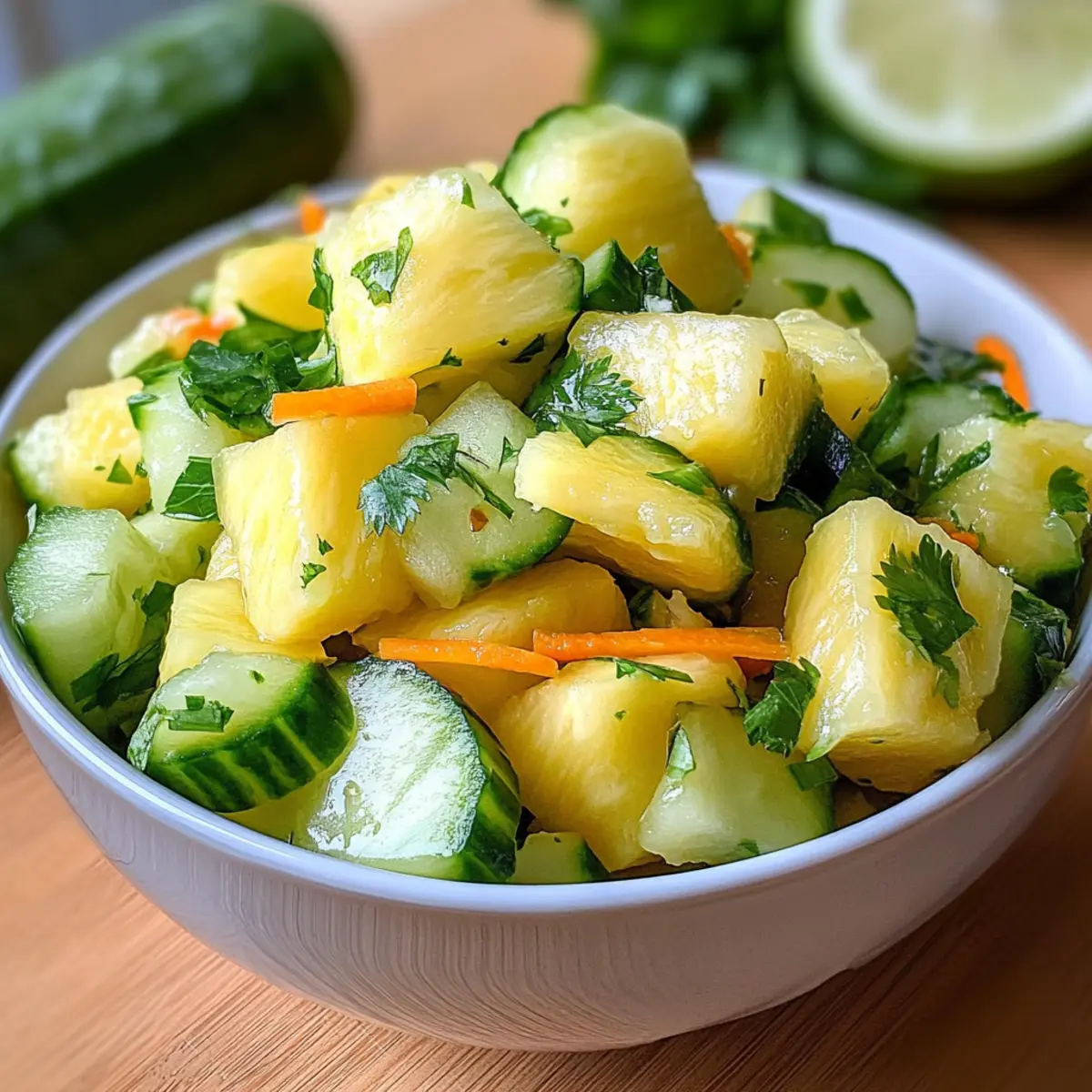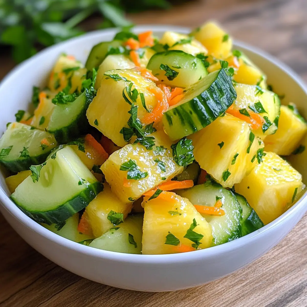 Es war einer dieser heißen Sommertage, an denen das einzige, was ich wollte, etwas Erfrischendes und Leichtes zu essen. In diesem Moment habe ich mich für einen Ananas Gurkensalat entschieden, der nicht nur erfrischend, sondern auch unglaublich einfach zuzubereiten ist. Mit süßer, saftiger Ananas und knackiger Gurke wird dieser vegane Salat zum perfekten Begleiter für Grillabende oder ein leichtes Mittagessen. Ein weiterer Vorteil? Er ist nicht nur gesund, sondern auch ein echter Hingucker auf jeder sommerlichen Tafel. Wirst du ihn heute ausprobieren oder vielleicht eine Variante mit Avocado oder Karotten zaubern? Warum solltest du diesen Ananas Gurkensalat lieben? Einfachheit: Die Zubereitung ist kinderleicht und benötigt nur wenige Schritte, sodass auch Kochanfänger diesen Salat perfekt hinkriegen. Frischer Geschmack: Die süße Ananas kombiniert mit der knackigen Gurke bietet ein erfrischendes Geschmackserlebnis, das ideal für heiße Sommertage ist. Vielseitigkeit: Du kannst mit verschiedenen Zutaten wie Avocado oder Karotten kreativ werden und so immer wieder neue Variationen ausprobieren. Gesundheitliche Vorteile: Dieser Salat ist reich an Vitaminen und Mineralstoffen, was ihn zu einem gesunden Snack oder Beilage für jede Gelegenheit macht. Augenschmaus: Die leuchtenden Farben der Zutaten machen den Ananas Gurkensalat zu einem echten Hingucker auf dem Tisch, perfekt für Sommerpartys! Ananas Gurkensalat Zutaten • Der Ananas Gurkensalat ist nicht nur einfach zuzubereiten, sondern auch eine Augenweide! Für den Salat Ananas – frische Ananas sorgt für eine süße, saftige Note; Dosenananas kann als Ersatz dienen, verändert jedoch die Textur. Gurke – für einen knackigen Biss; Englandsgurken sind ideal, da sie weniger Samen enthalten und frischer schmecken. Limettensaft – bringt Säure und Frische; frisch gepresster Saft ist am besten, aber im Notfall kann auch Flaschenlimettensaft verwendet werden. Avocado (optional) – fügt Cremigkeit und gesunde Fette hinzu; kann weggelassen werden, wenn du einen rein erfrischenden Salat möchtest. Geraspelte Karotten (optional) – fürs zusätzliche Crunch und Farbe; eine lebendige Ergänzung, die aber nicht zwingend notwendig ist. Minze oder Basilikum (optional) – für ein zusätzliches Geschmacksaroma; kannst auch Koriander dafür tauschen. Optionaler Hinweis: Mit einem Schuss Chili-Flocken kannst du dem Ananas Gurkensalat eine leichte Schärfe verleihen; experimentiere mit frischen Kräutern für deine persönliche Note! Schritt-für-Schritt-Anleitung für Ananas Gurkensalat Step 1: Zutaten vorbereiten Beginne, indem du die frische Ananas sorgfältig schälst und in kleine, mundgerechte Stücke schneidest. Die Gurke wird ebenfalls gewaschen und in dünne Scheiben oder Würfel geschnitten. Achte darauf, die Englische Gurke zu wählen, da sie weniger Samen hat und knackiger ist. Diese bunten Zutaten werden die Basis für deinen Ananas Gurkensalat bilden. Step 2: Dressing zubereiten Nehme eine kleine Schüssel und presse den Saft von einer frischen Limette hinein. Füge eine Prise Salz und Pfeffer hinzu, um dem Dressing Geschmack zu verleihen. Mit einem Schneebesen vermischen, bis die Zutaten gut kombiniert sind. Das Dressing sollte frisch und zitrisch riechen, was perfekt zu den süßen und knackigen Aromen des Salats passt. Step 3: Zutaten vermengen Gieße das zubereitete Dressing über die geschnittene Ananas und Gurke in einer großen Schüssel. Mit zwei großen Löffeln vorsichtig vermengen, bis alle Stücke gleichmäßig mit dem Dressing überzogen sind. Diese Schritt ist entscheidend, um sicherzustellen, dass der Ananas Gurkensalat harmonisch schmeckt und die Aromen vollständig zur Geltung kommen. Step 4: Optionale Zutaten hinzufügen Wenn du möchtest, füge in diesem Schritt auch die gewürfelte Avocado und die geraspelten Karotten hinzu. Diese ergänzen den Salat um Farbe und Cremigkeit. Verwende einen großen Löffel, um alles sanft zu falten, sodass die Avocado nicht zerdrückt wird. So erhält dein Ananas Gurkensalat noch mehr Textur und Vielfalt. Step 5: Servieren Lasse den Salat für mindestens 20 Minuten im Kühlschrank ziehen, damit die Aromen sich entfalten können und der Salat schön kühl ist. Je länger er zieht, desto intensiver wird der Geschmack. Bereite dich darauf vor, ihn kühl und frisch zu servieren. Ideal als leichtes Mittagessen oder als Beilage zu Grillgerichten – dein Ananas Gurkensalat wird bestimmt alle begeistern! Expert Tips für Ananas Gurkensalat Frische Zutaten verwenden: Achte darauf, frische Ananas und Gurke zu verwenden. Das macht den Ananas Gurkensalat besonders aromatisch und knackig. Dressing nicht vorher hinzufügen: Vermeide es, das Dressing zu früh hinzuzufügen. Dadurch wird die Gurke matschig und verliert ihren crunchy Biss. Avocado zum Schluss: Wenn du Avocado hinzufügst, mache dies erst kurz vor dem Servieren, um ein Braunwerden zu verhindern. Kühlen für mehr Geschmack: Lass den Salat mindestens 20 Minuten im Kühlschrank ziehen. So können die Aromen gut durchziehen und die Frische bleibt erhalten. Variationen ausprobieren: Experimentiere mit verschiedenen Kräutern oder anderen Obstsorten wie Mango, um deinem Ananas Gurkensalat eine persönliche Note zu verleihen. Ananas Gurkensalat Variationen Erlebe die Freiheit, deinen Ananas Gurkensalat ganz nach deinem Geschmack zu gestalten und neue Aromen zu entdecken! Tropische Frucht: Ersetze die Ananas durch Mango für eine süße, fruchtige Abwandlung. Der Geschmack wird wunderbar exotisch! Nussiger Crunch: Füge eine Handvoll gerösteter Mandeln oder Walnüsse hinzu, um extra Crunch und gesunde Fette zu bieten. Diese bringen eine herzhafte Note in den Salat. Leicht scharf: Ein Hauch von Chili-Flocken verursacht einen pikanten Kick. Perfekt, wenn du es etwas würziger magst! Zitroniger Twist: Statt Limettensaft verwende frischen Zitronensaft für einen anderen, erfrischenden Zitrusgeschmack. Kräuter-Kick: Experimentier