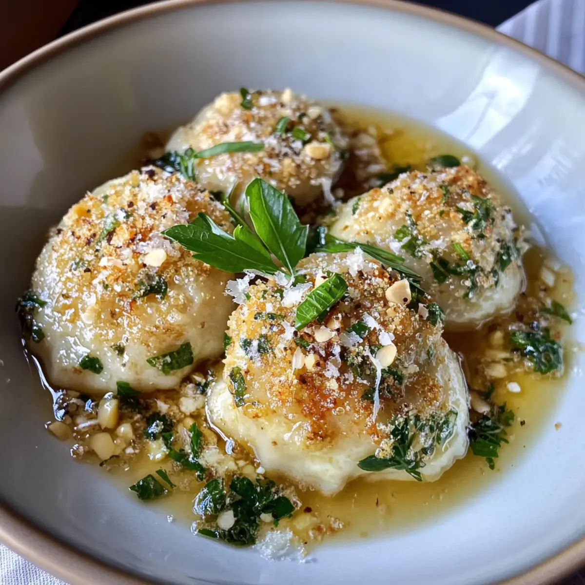 8. Die Bärlauch-Parmesan-Knödel auf einem Teller anrichten und mit der frisch zubereiteten Nussbutter übergießen.