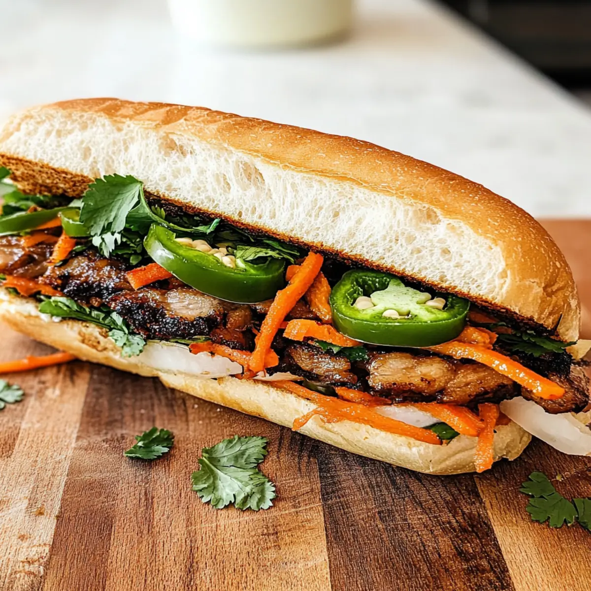 Die Straßen von Ho-Chi-Minh-Stadt pulsieren vor Leben, und der verlockende Duft von frisch zubereiteten Banh Mi-Sandwiches zieht Spaziergänger magisch an. Diese vietnamesische Delikatesse steckt voller Geschmack und Tradition, und heute möchte ich euch zeigen, wie ihr ein authentisches Banh Mi Sandwich mit einer köstlichen Lemongrass-Marinade selbst zubereiten könnt. Dieses Rezept bietet nicht nur eine schnelle und einfache Möglichkeit, ein beliebtes Street Food aus Vietnam nach Hause zu holen, sondern sorgt auch für das ultimative Geschmackserlebnis, das eure Familie und Freunde begeistern wird. Perfekt für neue Kochideen und den Übergang zu gesünderem Essen, wird dieses Sandwich garantiert zum neuen Liebling auf eurem Esstisch. Seid ihr bereit, in die Welt der Aromen einzutauchen? Warum ist dieses Banh Mi ein Must-Have? Vielfältige Optionen: Egal, ob ihr Fleischliebhaber oder Vegetarier seid, dieses Rezept bietet euch die Möglichkeit, mit Hähnchen oder Tofu zu experimentieren. Einzigartige Aromen: Die Kombination aus mariniertem Schweinefleisch, frischen Kräutern und knackigem Gemüse bringt den Geschmack Vietnams direkt auf euren Tisch. Schnelle Zubereitung: Mit nur wenigen Schritten kreiert ihr im Handumdrehen ein schmackhaftes Sandwich, das sogar für spontane Gäste geeignet ist. Kreativer Höhepunkt: Passt die Zutaten nach Lust und Laune an – von würzigen Jalapeños bis hin zu verschiedenen eingelegten Gemüsesorten, die Möglichkeiten sind endlos! Beliebtheit garantieren: Dieses Banh Mi ist nicht nur ein Gericht, sondern ein Erlebnis, das eure Familie und Freunde lieben werden. Wenn ihr nach weiteren leckeren Ideen sucht, schaut doch mal bei unserem Ciabatta Sandwich Rezept oder dem Chicken Caesar Sandwich vorbei! Banh Mi Sandwich Zutaten Für das Fleisch • Schweinefilet – Die Hauptzutat sorgt für Zartheit und Saftigkeit; Ersatz: Hähnchen (vorzugsweise mit Oberschenkel für mehr Feuchtigkeit) oder Tofu als vegetarische Option. • Lemongrass – Fügt einen zitrusartigen, aromatischen Twist hinzu; Vorbereitung: Verwendet nur den weißen inneren Teil des Stängels oder ersetzt ihn durch Lemongrass-Paste (1 TL pro Stängel). • Schalotten – Bringen eine süße, milde Zwiebelfnote; Ersatz: Gelbe Zwiebeln funktionieren auch. • Fischsauce – Unverzichtbar für Umami und Tiefe, ohne fischigen Geschmack. • Austernsauce – Fügt Süße und eine herzhafte Note hinzu; Ersatz: Sojasauce, aber damit ändert sich das Geschmacksprofil. • Limettensaft – Bringt Säure und Frische; immer frisch gepresst für den besten Geschmack. • Ahornsirup & Brauner Zucker – Balancieren die herzhaften mit süßen Aromen; Braunen Zucker nur ersetzen, wenn notwendig. • Ingwer & Knoblauch – Verbessern die aromatische Qualität der Marinade; frische Zutaten sind vorzuziehen. • Geröstetes Sesamöl – Sorgt für einen nussigen Geschmack, der für die Tiefe notwendig ist. • Chilipaste – Fügt Schärfe und Geschmack hinzu; optional je nach Würzempfindlichkeit. Für die eingelegten Gemüse • Reisessig & Zucker – Erstellen eine süß-saure Lake für das Gemüse. • Karotten & Daikon-Rettich – Wesentliche Elemente für das Einlegen, die Crunch und Säure bringen; Alternative: Normale Radieschen verwenden, wenn Daikon nicht verfügbar ist. Für die Frische • Frisches Gemüse (Gurke, Jalapeños, Koriander) – Bringt Frische und geschmackliche Kontraste. • Brot (Französische Baguettes) – Hält alle Elemente zusammen; muss außen knusprig und innen luftig sein. Dieses Banh Mi Sandwich wird dank dieser Zutaten nicht nur ein Fest für die Geschmacksnerven sein, sondern auch eine aufregende, authentische Erfahrung bieten! Schritt-für-Schritt-Anleitung für das Authentische Pork Banh Mi Sandwich mit Lemongrass-Marinade Step 1: Marinade zubereiten Mixe alle Marinade-Zutaten, einschließlich Lemongrass, Schalotten, Fischsauce, Austernsauce, Limettensaft, Ahornsirup, braunem Zucker, Ingwer, Knoblauch, geröstetem Sesamöl und Chilipaste in einem Mixer, bis eine glatte Mischung entsteht. Dieser Schritt dauert etwa 5 Minuten. Ein intensives Aroma wird sich entfalten, das die Basis für dein Banh Mi Sandwich bilden wird. Step 2: Schweinefilet vorbereiten Schneide das Schweinefilet der Länge nach in dünne Streifen und klopfe sie auf eine Dicke von etwa 0,5 cm. Lege die geschnittenen Fleischstücke in die Marinade und lasse sie für 4 bis 8 Stunden im Kühlschrank ziehen. Achte darauf, dass das Fleisch vollständig bedeckt ist, um die Aromen optimal einzuziehen. Step 3: Gemüse einlegen Mische Reisessig, Wasser und Zucker in einem kleinen Topf und erhitze die Mischung, bis der Zucker aufgelöst ist. Gieße die warme Lake über die vorbereiteten Karotten und den Daikon in ein Glas und lasse es abkühlen. Stelle das Glas mindestens eine Stunde in den Kühlschrank, am besten über Nacht, damit die Gemüse richtig durchziehen. Step 4: Baguettes rösten Halbiere die Baguettes längs und grille die Innenseiten in einer Grillpfanne bei mittlerer Hitze für 1-2 Minuten, bis sie goldbraun und knusprig sind. Achte darauf, sie nicht zu lange zu rösten, damit sie nicht zu trocken werden. Das Rösten verleiht dem Banh Mi Sandwich den perfekten Crunch. Step 5: Schweinefilet garen Grille die marinierten Schweinefiletstreifen auf hoher Hitze für etwa 1-2 Minuten pro Seite, bis sie durchgegart sind und leicht karamellisiert aussehen. Überprüfe das Fleisch auf eine schöne Bräunung, um die besten Aromen zu entfalten und ein zartes Ergebnis zu erzielen. Step 6: Sandwich zusammenstellen Verteile Mayonnaise und optional Pâté auf den gerösteten Baguettehälften. Schichte die geschnittenen, gegrillten Schweinefiletstreifen, eingelegtes Gemüse, Gurken, Jalapeños und frischen Koriander gleichmäßig darauf. Träufle nach Wunsch etwas Maggi-Sauce über die Füllung und serviere das Sandwich sofort für das beste Geschmackserlebnis. Was passt gut zu einem Banh Mi Sandwich? Eine gesch