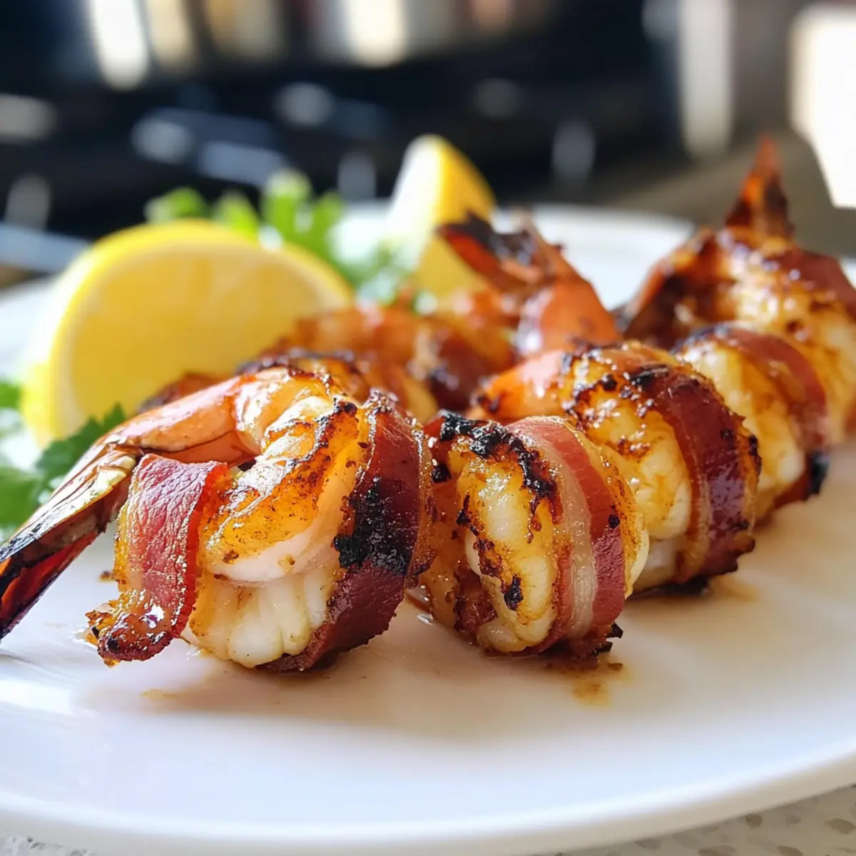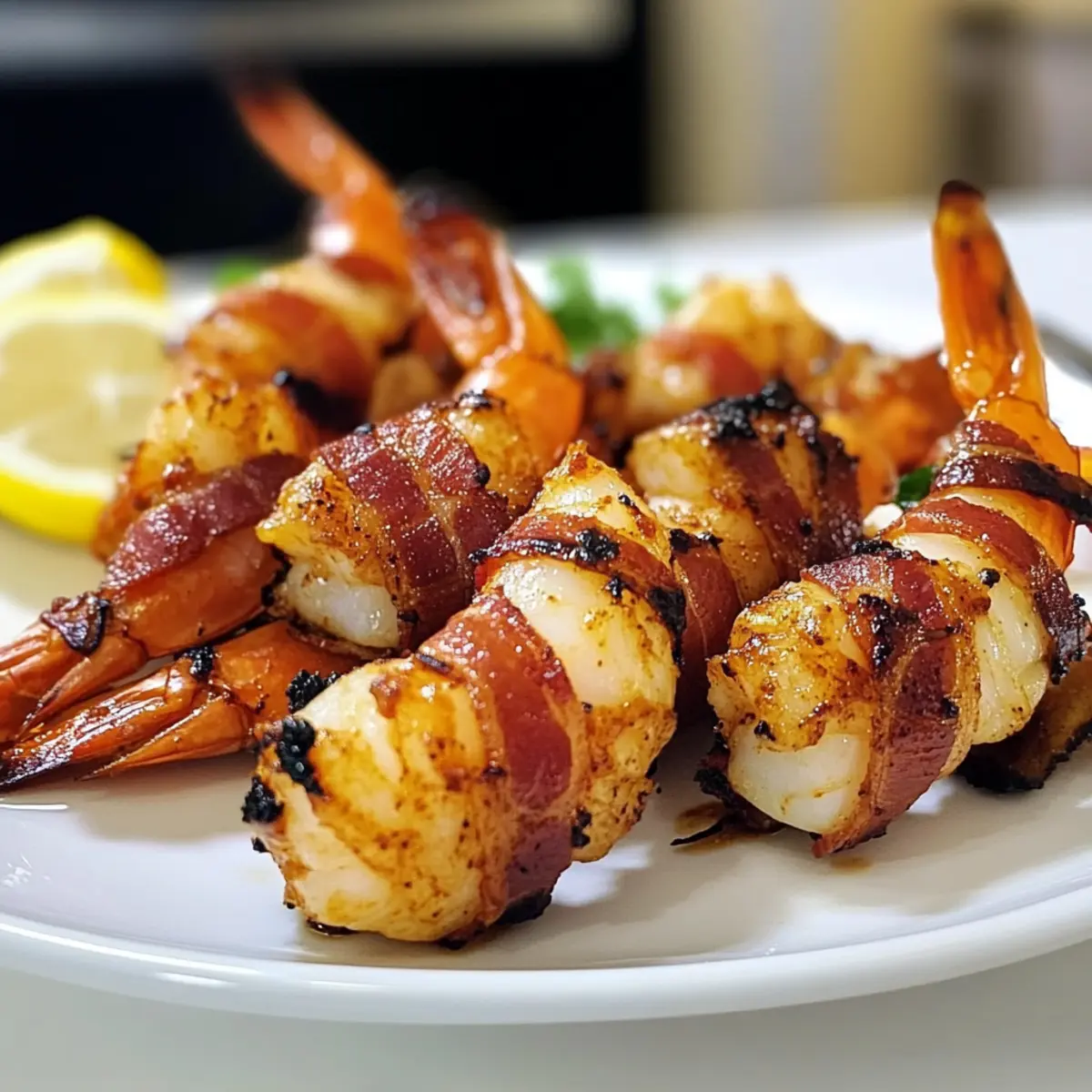 Es gibt Momente in der Küche, in denen man einfach das Gefühl hat, etwas Außergewöhnliches zu zaubern. Dieser ist einer davon! Die BBQ Speck-umwickelten Garnelen vereinen den herzhaften Geschmack von knusprigem Speck mit der zarten Saftigkeit der Garnelen und sind das perfekte Paar für Grillabende und Festlichkeiten. In nur wenigen Schritten lassen sich diese köstlichen Häppchen zubereiten, die nicht nur schnell gehen, sondern auch bei deinen Gästen garantiert für Begeisterung sorgen werden. Sie sind äußerst anpassbar, sodass du sie mit deinen Lieblingsgewürzen verfeinern oder sogar mit fruchtigen Akzenten wie Ananas ergänzen kannst. Denn wer kann schon widerstehen, wenn der Grill sich mit dem verführerischen Aroma von geröstetem Speck und Meerestieren füllt? Lass uns gemeinsam entdecken, wie einfach es ist, diesen Grilltraum wahr werden zu lassen! Warum werden diese Garnelen zum Hit? Einfachheit: Die Zubereitung ist kinderleicht und erfordert nur wenige Schritte, perfekt für jeden Grillliebhaber! Herzhafter Genuss: Kombination aus knusprigem Speck und zarten Garnelen sorgt für ein Geschmackserlebnis, das die Sinne verwöhnt. Vielseitigkeit: Du kannst verschiedene Gewürze verwenden und sogar fruchtige Elemente wie Ananas hinzufügen, um neue Geschmacksrichtungen zu entdecken. Perfekt für jeden Anlass: Ob Grillparty oder Familienfeier – diese Häppchen sind ein Publikumsmagnet. Schnell zubereitet: Mit minimalem Aufwand und kurzer Garzeit bist du im Handumdrehen fertig, sodass du mehr Zeit mit deinen Gästen verbringen kannst! BBQ Speck-umwickelte Garnelen Zutaten • Eine aufregende Mischung an Köstlichkeiten für den perfekten Grillabend! Für die Garnelen Große Garnelen (20-25 Stück) – Hauptzutat, geschält und entdarmt, mit oder ohne Schwanz nach Vorliebe. Olivenöl – Hilft, die Garnelen und den Speck zu überziehen, damit die Marinade gut eindringen kann. Frischer Zitronensaft – Fügt eine erfrischende Säure hinzu, die die Aromen aufhellt; Limettensaft kann ebenfalls verwendet werden. Für das Bacon-Wickel Speck – Bringt den rauchigen Geschmack; verwende dünnen, mittleren Speck für optimales Wickeln und Knusprigkeit. Zucker – Balanciert die Gewürze und verbessert die Karamellisierung; kann durch Honig ersetzt werden für einen tieferen Geschmack. Für die Marinade Paprika – Fügt eine süße Note hinzu und sorgt für die rote Farbe der Marinade. Cayennepfeffer – Gibt Schärfe; nach persönlichem Geschmack anpassen. Currypulver – Sorgt für ein einzigartiges Geschmacksprofil; für eine andere Note kann auch Garam Masala verwendet werden. Gemahlener Kreuzkümmel – Verstärkt den erdigen Geschmack der Marinade. Gemahlener Koriander – Bringt eine zitrusartige Note; optional, falls nicht verfügbar. Salz – Verstärkt alle Geschmäcker. Schwarzer Pfeffer – Zum Würzen; frisch gemahlen ist vorzuziehen. Optionales Topping Ananasstücke – Fügen eine süße Note hinzu, die hervorragend mit dem salzigen Speck harmoniert. Fruchtige Salsa – Perfekt als Dip, um zusätzliche Aromen zu kreieren. Diese BBQ Speck-umwickelten Garnelen sind nicht nur einfach zuzubereiten, sondern auch äußerst anpassbar für deinen persönlichen Geschmack! Schritt-für-Schritt-Anleitung für BBQ Speck-umwickelte Garnelen Schritt 1: Bacon vorbereiten Schneide die Speckscheiben in der Hälfte und brate sie in einer Pfanne bei mittlerer Hitze an, bis sie Fett abgeben, aber nicht knusprig werden (ca. 4-5 Minuten). Die Scheiben sollten weich bleiben, damit sie sich später gut um die Garnelen wickeln lassen. Lass den Speck auf Küchenpapier abtropfen, um überschüssiges Fett zu entfernen. Schritt 2: Marinade zubereiten In einer Schüssel vermischst du Paprika, Cayennepfeffer, Currypulver, Kreuzkümmel, Koriander, Salz, schwarzen Pfeffer, Olivenöl, Zucker und Zitronensaft zu einer gleichmäßigen Marinade. Gib nun die großen, geschälten Garnelen dazu und rühre alles gut um, damit die Garnelen gleichmäßig überzogen sind. Lass sie 30-60 Minuten bei Raumtemperatur marinieren. Schritt 3: Grill vorbereiten Heize den Grill vor, bis die Kohlen glühen und eine gleichmäßige Hitze erreicht ist. Wenn du einen Gasgrill verwendest, stelle ihn auf mittlere bis hohe Temperatur ein. Lege ein Stück Alufolie auf die Grillplatte, um die Garnelen später darauf zu platzieren und ein Ankleben zu verhindern. Schritt 4: Garnelen wickeln Nimm jeweils eine marinierte Garnele und wickele eine halbe Speckscheibe darum. Wenn nötig, sichere die Enden mit einem Spieß oder Zahnstocher. Achte darauf, dass der Speck eng anliegt, um während des Grillens den perfekten Geschmack zu entfalten. Wiederhole diesen Schritt, bis alle Garnelen umwickelt sind. Schritt 5: Grillen Platziere die vorbereiteten und umwickelten Garnelen auf der mit Alufolie bedeckten Grillplatte. Träufle etwas von der restlichen Marinade über die Garnelen. Grille sie etwa 5 Minuten pro Seite, bis der Speck knusprig ist und die Garnelen eine opake, zarte Textur erreicht haben. Achte darauf, sie nicht zu übergaren, um die Saftigkeit zu bewahren. Schritt 6: Servieren Nimm die BBQ Speck-umwickelten Garnelen direkt vom Grill und serviere sie heiß oder warm. Überlege, ob du sie mit einer fruchtigen Salsa oder einer leckeren Dipsauce kombinieren möchtest, um den Genuss zu vervollständigen. Lass deine Gäste die Kombination aus knusprigem Speck und saftigen Garnelen genießen! Lagerung und Einfrieren von BBQ Speck-umwickelten Garnelen Kühlschrank: Bewahre die BBQ Speck-umwickelten Garnelen in einem luftdichten Behälter im Kühlschrank auf, wo sie bis zu 3 Tage frisch bleiben. Einfrieren: Lege die ungarnierten Garnelen mit Speck einzeln auf ein Backblech und friere sie für 1-2 Stunden ein, bevor du sie in einen gefrierfesten Beutel umschichtest. Auftauen: Lasse die gefrorenen Garnelen über Nacht im Kühlschrank auftauen, bevor du sie grillst oder erwärmst. Vermeide die Verwendung von Mikrowelle, um die Textur nicht z