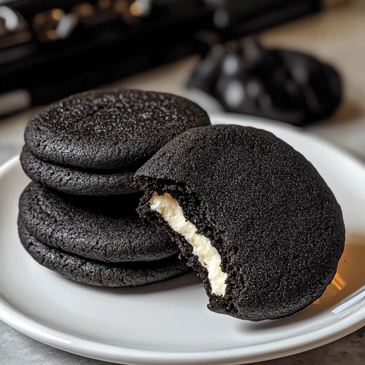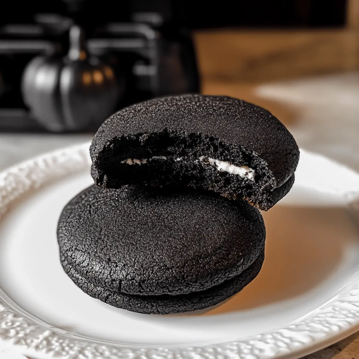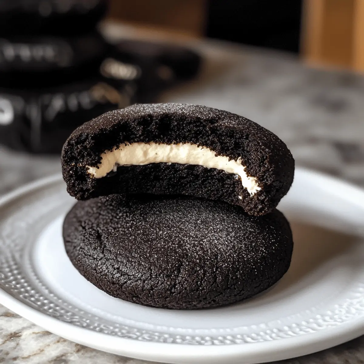 Ein wohlbekannter Duft schwebt durch meine Küche, als ich die Zutaten für diese Black Velvet Cheesecake Cookies zubereite. Es ist die perfekte Zeit des Jahres, um sich mit Schokolade und etwas Geheimnisvollem zu verwöhnen! Diese Kekse sind nicht nur optisch ein Hit mit ihrem tiefschwarzen Farbton, sie sind auch ein wahres Geschmackswunder mit einer cremigen Cheesecake-Füllung. Perfekt für Halloween, bieten sie einen schnellen und köstlichen Genuss, der garantiert alle begeistert. Ihre zarte, chewy Textur kombiniert mit dem dunklen Kakao macht sie zur idealen Wahl für festliche Zusammenkünfte oder einfach als besondere Aufmerksamkeit für sich selbst. Bist du bereit, die Geheimnisse dieser unwiderstehlichen Leckerei zu entdecken? Warum wirst du diese Kekse lieben? Einzigartige Kombination: Entdecke die perfekte Verbindung aus schokoladigem Keks und cremiger Cheesecake-Füllung, die jeder Biss unvergesslich macht. Einfach zuzubereiten: Diese Kekse erfordern keine komplizierten Techniken, sodass du sie auch als Backanfänger meistern kannst. Perfekte Halloween-Leckerei: Ihre tiefschwarze Farbe und der verführerische Geschmack machen sie zu einem echten Hingucker auf jeder Halloween-Party. Vielseitige Optionen: Ob du die Füllung mit anderen Geschmacksrichtungen wie Schokolade oder Kürbis anpassen möchtest, die Möglichkeiten sind endlos! Menge und Aufbewahrung: Diese köstlichen Kekse sind ideal zum Teilen, lassen sich aber auch perfekt für den späteren Genuss aufbewahren. Vielleicht magst du auch andere köstliche Rezepte wie den Vanille Bohnen Butterkaesekuchen oder das Avocado Toast mit Radieschen. Lass dich inspirieren! Zutaten für Black Velvet Cheesecake Cookies • Ein köstliches Rezept, das du nicht verpassen solltest! Für die Cheesecake-Füllung Frischkäse – Sorgt für eine cremige Füllung; achte darauf, dass er kalt ist für einfaches Mixen. Zucker – Süßt die Cheesecake-Füllung; du kannst auch Pudersüße verwenden, um eine glattere Konsistenz zu erzielen. Vanilleextrakt – Verstärkt den Geschmack der Füllung; verwende am besten reinen Vanilleextrakt für den besten Genuss. Für die Kekse Mehl – Gibt den Keksen Struktur; achte auf genaue Messung, indem du das Mehl vorsichtig in die Tasse löffelst. Schwarzes Kakaopulver – Bringt intensiven Schokoladengeschmack und die charakteristische Farbe; ist unverzichtbar für das Aussehen der Kekse. Backpulver – Wirkt als Treibmittel für leichte Kekse; stelle sicher, dass es frisch ist für beste Ergebnisse. Salz – Balanciert die Süße aus und hebt den Geschmack hervor. Ungesalzene Butter – Fügt Reichtum und Feuchtigkeit hinzu; sollte weich sein. Du kannst auch gesalzene Butter verwenden, dann aber die Zugabe von Salz reduzieren. Brauner Zucker – Sorgt für Feuchtigkeit und Zähigkeit; kann durch dunklen braunen Zucker ersetzt werden für einen intensiveren Geschmack. Eigelb – Gibt Struktur und Reichhaltigkeit; vermeide die Verwendung des ganzen Eies für die beste Konsistenz. Die perfekten Zutaten für diese Black Velvet Cheesecake Cookies warten auf dich! Lass dich von diesem köstlichen Rezept inspirieren! Schritt-für-Schritt-Anleitung für Schokoladige Black Velvet Cheesecake Cookies Step 1: Cheesecake-Füllung vorbereiten Mische in einer Schüssel den kalten Frischkäse, Zucker und Vanilleextrakt mit einem Handmixer auf mittlerer Geschwindigkeit, bis die Mischung schön cremig und fluffig ist. Portioniere die Füllung in 16 gleich große Bälle und lege diese auf ein mit Backpapier ausgelegtes Blech. Stelle das Blech für mindestens 1 Stunde in den Gefrierschrank, bis die Cheesecake-Bälle fest sind. Step 2: Trockene Zutaten mischen In einer großen Schüssel siebe das Mehl, das schwarze Kakaopulver, Backpulver und Salz. Verwende einen Schneebesen, um die Zutaten gut zu vermengen und sicherzustellen, dass sich keine Klümpchen bilden. Diese Mischung sorgt für die tiefschwarze Farbe und den schokoladigen Geschmack deiner Black Velvet Cheesecake Cookies. Step 3: Butter und Zucker cremig schlagen Nimm eine weitere Schüssel und schlage die weiche ungesalzene Butter zusammen mit dem hellen braunen Zucker und dem weißen Zucker mit einem Handmixer auf hoher Stufe, bis die Masse hell und cremig ist. Dieser Schritt sollte etwa 3–5 Minuten dauern, um eine luftige Konsistenz zu erreichen, die den Keksen ihre zarte Textur verleiht. Step 4: Eier und Vanille hinzufügen Gib die Eigelbe und den restlichen Vanilleextrakt zur Butter-Zucker-Mischung und schlage die Zutaten weiter, bis alles gut kombiniert ist. Die Mischung sollte eine hellgelbe Farbe annehmen und fluffig erscheinen. Diese feuchten Zutaten sind entscheidend für die feine Struktur der Black Velvet Cheesecake Cookies. Step 5: Trockene Zutaten einarbeiten Reduziere die Mixer-Geschwindigkeit und füge die trockenen Zutaten nach und nach zur Butter-Ei-Mischung hinzu. Mische die Zutaten, bis sie gerade so miteinander verbunden sind. Achte darauf, nicht zu lange zu rühren, da dies die Kekse hart machen kann. Die Teigmasse sollte etwas klebrig sein. Step 6: Kekse formen Verwende einen Esslöffel, um Portionen des Keksteigs abzunehmen. Forme die Portionen in kleine Fladen und lege einen gefrorenen Cheesecake-Ball in die Mitte jedes Fladens. Umhülle den Cheesecake-Ball mit dem Keksteig und forme ihn zu einem runden Keks. Stelle sicher, dass die Füllung vollständig eingehüllt ist. Step 7: In Kakaozucker wälzen Mische in einer kleinen Schüssel den restlichen Zucker mit dem schwarzen Kakaopulver. Rolle jeden Keks in dieser Mischung, sodass er gleichmäßig bedeckt ist. Dies gibt den Keksen einen zusätzlichen schokoladigen Touch und verleiht ihnen das charakteristische Aussehen, das sie perfekt für Halloween macht. Step 8: Backen Heize den Ofen auf 180 °C vor und lege die Kekse auf ein mit Backpapier ausgelegtes Backblech. Backe die Kekse 10–11 Minuten lang, bis die Ränder fest sind, aber die Mitte noch leicht weich bleibt. Lass sie im Ble
