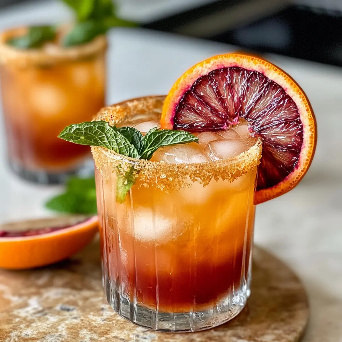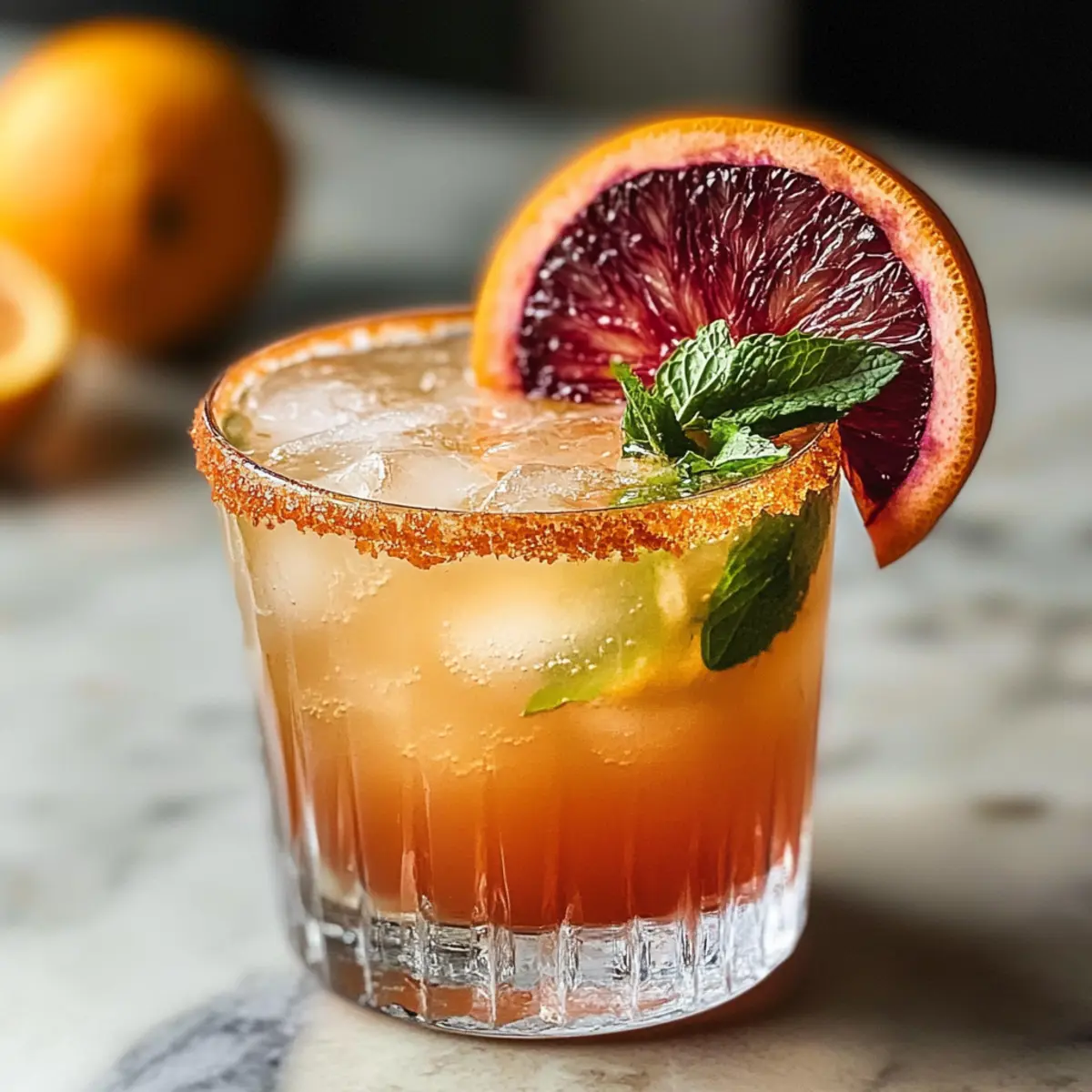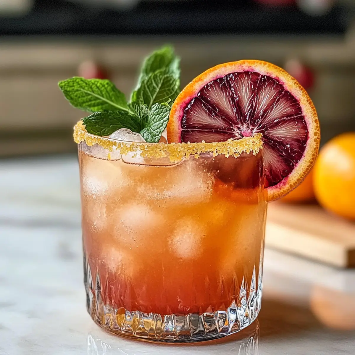 5. Optional garnierst du den Cocktail mit frischen Minzblättern und einer Scheibe Blutorange.