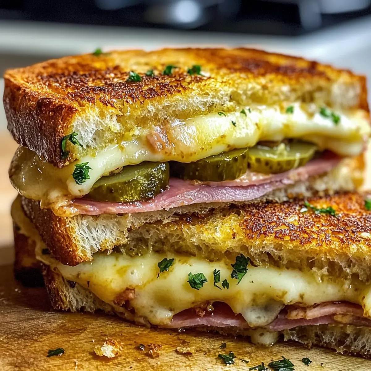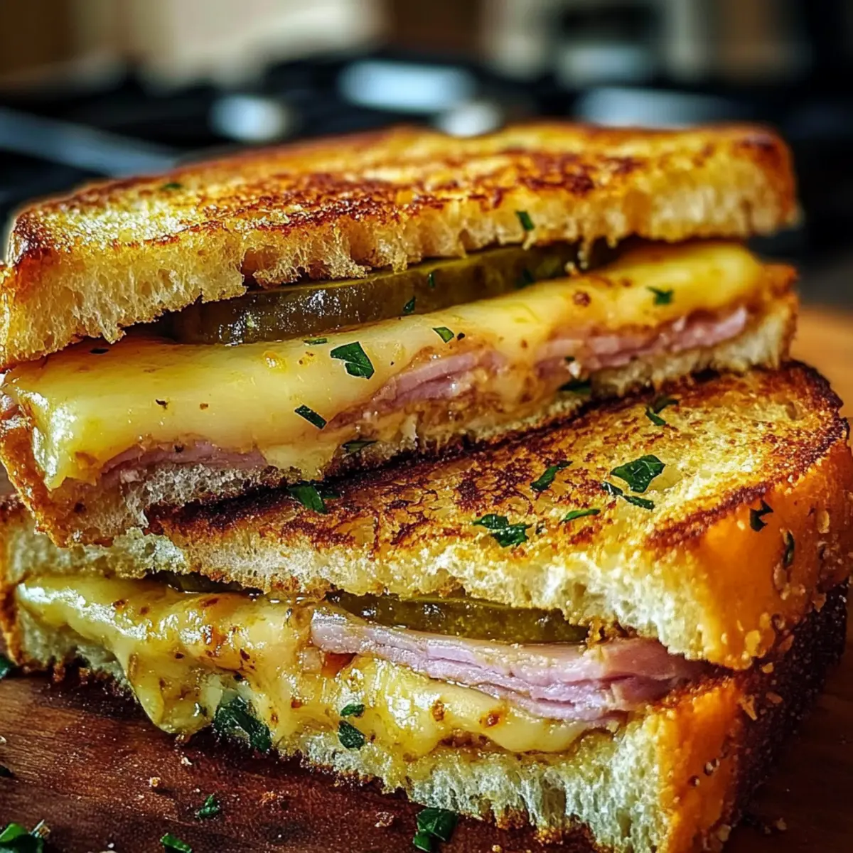 Stellt euch vor, ihr haltet ein Sandwich in der Hand, das nicht nur sättigt, sondern auch den Gaumen mit seiner Knoblauch-Note umgarnt. Diese Bold und Buttrigen Kubanischen Knoblauchbrot-Sandwiches sind nicht nur eine Hommage an die klassische kubanische Küche, sondern auch eine leckere Abwechslung für den Alltag. Mit köstlichen Schichten aus rauchigem Schinken, schmelzendem Käse und knackigen Essiggurken bietet dieses Rezept ein schnelles und unkompliziertes Dinner oder das perfekte Fingerfood für euer nächstes Spielabend. Die Kombination aus knusprigem Äußeren und dem reichhaltigen, buttrigen Inneren sorgt dafür, dass ihr immer wieder nach mehr greifen wollt. Wer kann da schon widerstehen? Seid ihr bereit, in die Welt der kubanischen Aromen einzutauchen? Warum sind diese Sandwiches unwiderstehlich? Einfachheit: Diese Sandwiches sind ein Kinderspiel zubereiten, selbst für Kochanfänger! Nur einige grundlegende Zutaten und schon kann es losgehen. Reichhaltiger Geschmack: Die Kombination von Knoblauchbutter, würzigem Schinken und geschmolzenem Käse entfaltet ein volles Geschmacksspektrum, das jede Gaumenfreude übertrifft. Perfekt für jeden Anlass: Ob für ein schnelles Abendessen oder als Fingerfood bei einem Spieleabend, die kräftigen Aromen und die knusprige Textur werden eure Gäste begeistern! Vielseitigkeit: Experimentiert gerne mit verschiedenen Käsesorten oder belegt das Sandwich mit frischen Gemüse für eine spannende Abwechslung – es gibt endlose Möglichkeiten! Für weitere kulinarische Inspirationen, schaut euch auch unser Rezept für Zimt Schnecken Bananenbrot oder Zimt Kaesekuchen Nach an! Zutaten für Bold und Buttrige Kubanische Knoblauchbrot-Sandwiches Für das Brot • Kubanisches Brot oder knuspriges Weißbrot – Die Basis des Sandwiches, idealerweise kubanisches Brot, aber auch Sauerteig oder Baguette sind passende Alternativen. Für die Knoblauchbutter • Ungesalzene Butter – Sorgt für Reichhaltigkeit und eine goldene Kruste; verwendet weiche Butter für einfaches Bestreichen. • Knoblauch – Ist der Star des Geschmacks; frischer, gehackter Knoblauch bietet das beste Aroma. • Frische Petersilie – Bringt Frische in die Knoblauchbutter; kann durch andere Kräuter ersetzt werden. Für die Füllung • Geräucherter Schinken – Hauptproteinquelle mit herzhaftem Geschmack; kann durch Putenfleisch oder Rinderbraten ersetzt werden. • Salami oder geröstetes Schweinefleisch – Fügt zusätzliche Geschmacksnuancen hinzu; optional, kann je nach Vorliebe variieren. • Mozzarella oder Schweizer Käse – Schmilzt wunderbar und sorgt für eine cremige Konsistenz; vermeidet harte Käsesorten, alternative Käsesorten müssen gut schmelzen. • Essiggurken – Für den knackigen, säuerlichen Biss; unverzichtbar für Authentizität, je nach persönlichem Geschmack anpassbar. • Gelber Senf – Ergänzt die Aromen; kann nach Belieben angepasst oder weggelassen werden. Diese Bold und Buttrigen Kubanischen Knoblauchbrot-Sandwiches sind einfach unwiderstehlich, und jede Zutat trägt zur geschmacklichen Harmonie bei. Also, ran an die Zubereitung und lasst euch von den Aromen verführen! Schritt-für-Schritt-Anleitung für Bold und Buttrige Kubanische Knoblauchbrot-Sandwiches Step 1: Knoblauchbutter zubereiten In einer kleinen Schüssel die weiche, ungesalzene Butter, den gehackten Knoblauch und die frische Petersilie gut vermengen. Mit einem Löffel verrühren, bis alle Zutaten gleichmäßig verteilt sind. Diese aromatische Knoblauchbutter wird das Herzstück eures Bold und Buttrigen Kubanischen Knoblauchbrot-Sandwiches sein, also stellt sicher, dass sie schön cremig und duftend ist. Step 2: Brot vorbereiten Das kubanische Brot oder euer gewähltes Weißbrot in der Länge halbieren. Nehmt einen Pinsel oder einen Löffel zur Hand und bestreicht die Schnittflächen großzügig mit der vorbereiteten Knoblauchbutter. Diese goldenen, buttrigen Seiten werden beim Grillen knusprig und verleihen dem Sandwich seinen unverwechselbaren Charme. Step 3: Sandwich zusammenstellen Das untere Brotstück mit einer großzügigen Schicht gelbem Senf bestreichen, um einen aufregenden Geschmack zu integrieren. Dann beginnen, das Sandwich zu belegen: Schichten von geräuchertem Schinken, gefolgt von optionaler Salami oder geröstetem Schweinefleisch, dann einige Essiggurken und großzügig Käse darauflegen. Diese Mischung sorgt für ein Geschmackserlebnis in eurem Bold und Buttrigen Kubanischen Knoblauchbrot-Sandwich. Step 4: Sandwich schließen Das obere Brotstück auf das belegte Sandwich legen, wobei die buttrige Seite nach außen zeigt. Sanft andrücken, um die Füllungen etwas zu fixieren. Dieser Schritt stellt sicher, dass beim Grillen alle leckeren Zutaten zusammenbleiben und das Sandwich eine tolle Form hat. Step 5: Grillpfanne erhitzen Eine gusseiserne Pfanne oder Grillpfanne bei mittlerer Hitze vorheizen. Um sicherzustellen, dass die Pfanne die richtige Temperatur hat, könnt ihr ein paar Tropfen Wasser hinein spritzen; wenn sie brutzeln und verdampfen, ist sie bereit für das Sandwich. Diese Methode garantiert, dass die Bold und Buttrigen Kubanischen Knoblauchbrot-Sandwiches perfekt goldbraun und knusprig werden. Step 6: Sandwich grillen Das Sandwich in die heiße Pfanne legen und mit einem Spatel oder einem Panini-Grill leicht andrücken. Grillt das Sandwich für etwa 3–4 Minuten auf jeder Seite, bis die Brotrinde schön goldig und knusprig ist und der Käse darin schmilzt. Achtet darauf, das Sandwich nicht zu lange zu lassen, um das Brot nicht zu verbrennen. Step 7: Sandwich servieren Nach dem Grillen das Sandwich vorsichtig aus der Pfanne heben und es für 1 Minute ruhen lassen, damit sich die Aromen setzen können. Dann in passende Stücke schneiden und sofort servieren. Diese Bold und Buttrigen Kubanischen Knoblauchbrot-Sandwiches sind nun bereit, genossen zu werden – perfekt für jeden Anlass! Was passt zu Bold und Buttrigen Kubanischen Knoblauchbrot-Sa