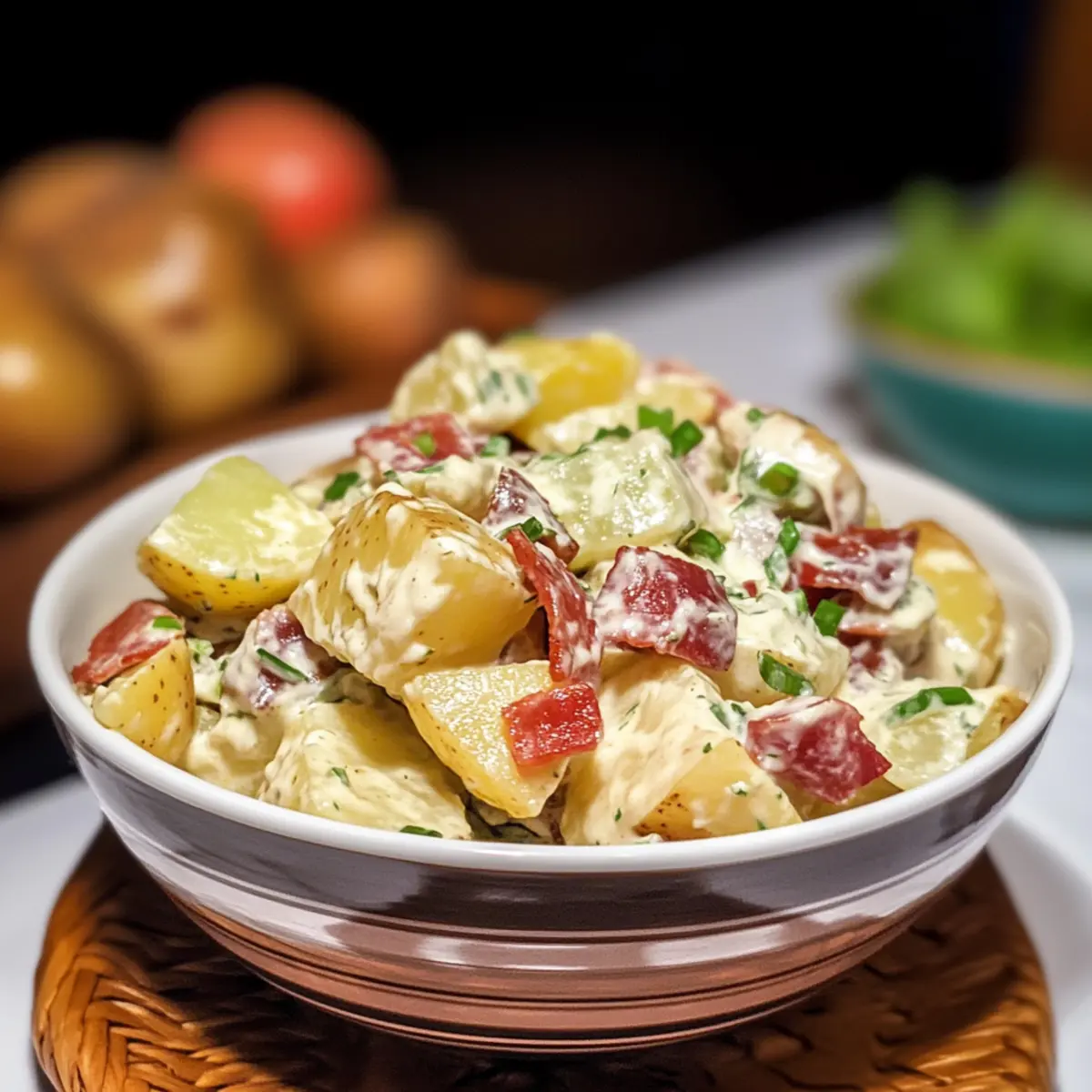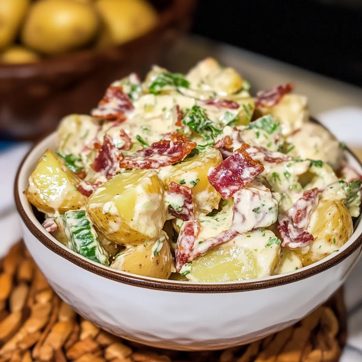 Stellt euch vor, der Sommer steht vor der Tür und mit ihm die Vorfreude auf gesellige Grillabende und Picknicks im Freien. Was könnte da besser passen als ein Caesar Kartoffelsalat, der die klassischen Aromen von Kartoffelsalat mit der cremigen Raffinesse von Caesar-Dressing kombiniert? Diese köstliche Beilage begeistert nicht nur mit einem wunderbar geschmeidigen Mundgefühl, sondern auch mit der perfekten Balance aus frischen Zutaten und herzhaftem Bacon. Egal, ob als kühlender Begleiter zu gegrilltem Fleisch oder als Highlight auf dem Buffet, dieser Salat lässt sich im Handumdrehen zubereiten und ist zudem anpassbar – sogar für Veganer! Seid ihr bereit, das Rezept für euren neuen Sommerliebling zu entdecken? Warum ist dieser Caesar Kartoffelsalat einzigartig? Ein echter Hingucker: Dieser Caesar Kartoffelsalat verbindet das Beste aus zwei Welten und wird garantiert zum Star auf jedem Sommerbuffet. Einfache Zubereitung: Mit nur wenigen Zutaten und einfach zu befolgenden Schritten, bietet dieses Rezept auch Anfängern ein beeindruckendes Ergebnis. Cremige Köstlichkeit: Das Caesar-Dressing sorgt für einen unverwechselbaren Geschmack und eine samtige Textur, die alle begeistern wird. Vielseitig anpassbar: Ob mit extra Gemüse oder vegan – jeder kann seine eigene Note hinzufügen. Perfekt für gesellige Runden: Egal, ob beim Grillen oder Picknick, dieser Salat passt zu jedem Anlass. Werfen Sie einen Blick auf unser Chicken Caesar Sandwich für eine Ergänzung zu diesem tollen Rezept! Caesar Kartoffelsalat Zutaten Entdecke die besten Zutaten für deinen Caesar Kartoffelsalat! Für die Kartoffeln Rote Kartoffeln – Diese wachsartige Sorte bleibt gut formstabil; du kannst auch Yukon Gold oder Fingerling-Kartoffeln verwenden. Für den Geschmack Dick geschnittener Bacon – Fügt eine rauchige Note und Knusprigkeit hinzu; ersetze ihn durch Truthahn-Bacon oder Kokosnuss-Bacon für eine leichtere oder vegane Option. Mayonnaise – Sorgt für Cremigkeit und bindet die Zutaten; ein leichterer Ersatz wäre griechischer Joghurt. Caesar-Dressing – Verleiht dem Salat seine besondere Geschmacksnote; achte darauf, dass es deinen diätetischen Bedürfnissen entspricht (vegan, glutenfrei). Geriebener Parmesan – Enhält den umami-Geschmack; für eine milchfreie Option kannst du Nährhefe verwenden. Weißer Essig – Bringt eine angenehme Säure ins Spiel; kann im Notfall durch Zitronensaft ersetzt werden. Worcestershiresauce – Verleiht herzliche Tiefe; wähle eine vegane Version, falls notwendig. Selleriesalz – Verstärkt den Geschmack mit einer leichten Sellerienote; nach Geschmack regulieren. Für die Frische Selleriestangen & rote Zwiebeln – Sorgen für Frische und Knackigkeit; Karotten für Süße oder Frühlingszwiebeln für einen milderen Zwiebelgeschmack sind ebenfalls Alternativen. Hartgekochte Eier – Liefert Protein und Cremigkeit; für eine vegane Variante einfach weglassen. Frische Schnittlauch – Optionale Garnitur für zusätzlichen Farbtupfer und Frische; du kannst auch Frühlingszwiebeln oder Petersilie verwenden. Mit diesen Zutaten bist du bestens ausgestattet, um einen köstlichen Caesar Kartoffelsalat zu kreieren, der alle begeistern wird! Schritt-für-Schritt-Anleitung für Caesar Kartoffelsalat Schritt 1: Kartoffeln kochen Die gewaschenen und gewürfelten roten Kartoffeln in einen großen Topf geben und mit Wasser bedecken. Bring das Wasser zum Kochen und lasse die Kartoffeln etwa 10–12 Minuten kochen, bis sie gabelzart sind. Achte darauf, dass sie nicht überkochen, um eine angenehme Textur für deinen Caesar Kartoffelsalat zu gewährleisten. Dann abgießen und etwas abkühlen lassen. Schritt 2: Bacon zubereiten In einer großen Pfanne den dick geschnittenen Bacon bei mittlerer Hitze auslassen. Brate ihn ca. 10–15 Minuten, bis er schön knusprig ist. Am Ende den Bacon auf Küchenpapier abtropfen lassen, um überschüssiges Fett zu entfernen. Dieser Schritt bringt eine rauchige Note in deinen Caesar Kartoffelsalat. Schritt 3: Zutaten mischen In einer großen Schüssel den abgekühlten Bacon, die Mayonnaise, das Caesar-Dressing, den geriebenen Parmesan, den weißen Essig, die Worcestershiresauce und das Selleriesalz vermengen. Füge die gewürfelten Selleriestangen und die roten Zwiebeln hinzu und rühre gut um, bis alle Zutaten gleichmäßig vermischt sind. So bekommst du die Basis für deinen cremigen Caesar Kartoffelsalat. Schritt 4: Kartoffeln und Eier kombinieren Die warmen Kartoffeln sowie die grob gehackten hartgekochten Eier in die Schüssel mit der Dressingmischung geben. Vorsichtig unterheben, um die Kartoffeln nicht zu zerdrücken. Dieser Schritt sorgt dafür, dass die Aromen des Caesar Kartoffelsalats gleichmäßig verteilt werden, ohne dass die Kartoffeln matschig werden. Schritt 5: Kühlen Die fertige Mischung abdecken und für mindestens 4 Stunden im Kühlschrank kühlen. Dies ermöglicht es den Aromen, sich zu verbinden und sorgt dafür, dass der Caesar Kartoffelsalat frisch und erfrischend bleibt. Vor dem Servieren überprüfen, ob die Konsistenz und der Geschmack deinen Vorstellungen entsprechen. Caesar Kartoffelsalat Variationen Probiert diese kreativen Ideen aus, um euren Caesar Kartoffelsalat ganz nach eurem Geschmack zu gestalten! Veganer Twist: Ersetzt die Mayonnaise durch veganen Joghurt oder eine pflanzliche Mayonnaise für einen frischen und leichten Geschmack. Würzige Note: Fügt einen Teelöffel scharfen Senf oder etwas Sriracha hinzu, um dem Dressing einen extra Kick zu verleihen. Cremige Frische: Wechselt das Caesar-Dressing gegen ein cremiges Ranch-Dressing, um die Aromen zu variieren und einen neuen Geschmack zu entdecken. Knackige Ergänzung: Mischt klein gehackte Paprika oder süßen Mais unter, um zusätzliche Textur und Süße zu integrieren. Diese Zutaten bringen einen bunten Frischekick! Kräuterzauber: Verfeinert den Salat mit frischen Kräutern wie Dill oder Petersilie für eine aromatische Note, die dem Gericht etwas 