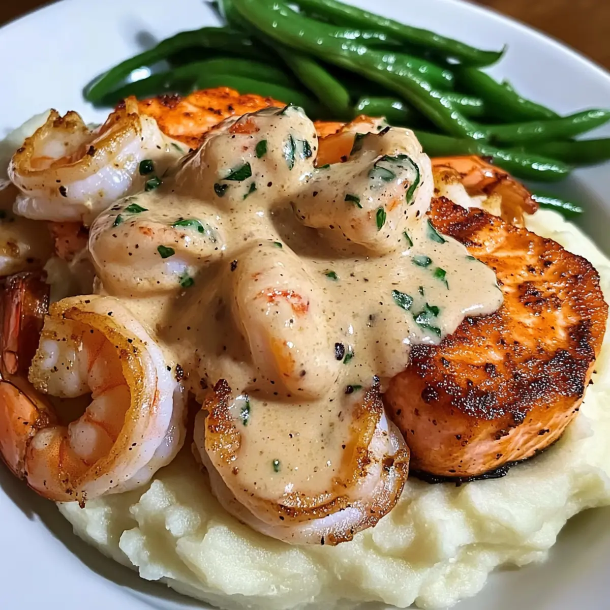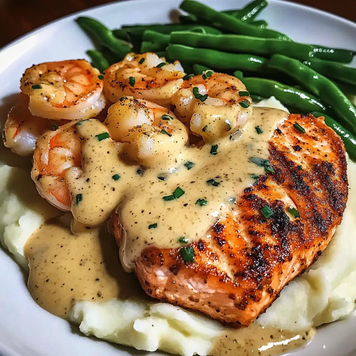 Ein perfektes Abendessen nach einem langen Tag? Für mich ist das Cajun Garnelen mit Lachs in einer cremigen Knoblauchsoße. Diese köstliche Kombination bringt den aufregenden Geschmack der Cajun-Küche direkt auf den Tisch und sorgt für ein wahres Geschmackserlebnis. Schnelle Zubereitung und frische Zutaten machen dieses Gericht zu einem Favoriten für jeden leidenschaftlichen Hobbykoch. Saftige Garnelen und zarter Lachs treffen auf eine reichhaltige Soße, die sich perfekt mit cremigen Kartoffelpüree und knackigen grünen Bohnen verbindet. Es ist nicht nur ein Genuss, sondern auch leicht anpassbar – so wird jeder Bissen zu einer neuen Entdeckung! Bist du bereit, deinen Küchenkünsten einen aufregenden Twist zu verleihen? Warum sind Cajun Garnelen so beliebt? Einzigartiger Geschmack: Die Kombination aus Cajun-Gewürzen und zartem Fisch sorgt für ein unverwechselbares Geschmackserlebnis, das deine Geschmacksknospen begeistert. Einfachheit: Bereits in kurzer Zeit zauberst du ein beeindruckendes Gericht, das selbst Anfänger mühelos meistern können. Vielfältige Alternativen: Du kannst Garnelen durch andere Meeresfrüchte oder sogar Hähnchen ersetzen, was dir unzählige Anpassungsmöglichkeiten bietet. Komfort-Essen: Dieses Rezept vereint die besten Elemente von Komfortnahrung – cremige Sauce und fluffiges Kartoffelpüree, die Wärme und Freude in jedem Bissen bringen. Publikumsliebling: Egal ob für ein Familienessen oder ein romantisches Dinner, Cajun Garnelen sind ein Hit bei allen Gästen! Entdecke auch andere köstliche Gerichte wie Reis Tomatensosse Einfaches oder Spinat Haehnchen Pasta, die sich perfekt für dein nächstes Abendessen eignen. Cajun Garnelen Zutaten • Entdecke die köstlichen Zutaten für dein persönliches Cajun Garnelen Erlebnis! Für die Garnelen und den Lachs Garnelen – Frisch oder gefroren, sie sind eine hervorragende Proteinquelle und werden in Cajun-Gewürzen mariniert. Lachs – Reichhaltiger, buttriger Fisch; ideal für eine harmonische Kombination mit den Garnelen. Für die Knoblauchsoße Knoblauch – Frisch, fein gehackt, sorgt für intensiv würzigen Geschmack in der Soße. Schlagsahne – Verleiht der Soße die cremige Textur; schwerer Rahm sorgt für die beste Konsistenz. Für die Beilagen Kartoffeln – Ideal für das cremige Püree, das den würzigen Geschmack der Garnelen perfekt ausbalanciert. Grüne Bohnen – Frisch und knackig; sie bringen einen schönen Crunch in die Kombination. Fühle dich frei, die Garnelen durch andere Meeresfrüchte oder Hähnchen zu ersetzen, um deinen ganz persönlichen Geschmack zu treffen! Schritt-für-Schritt-Anleitung für Cajun Garnelen mit cremiger Knoblauchsauce Step 1: Garnelen und Lachs vorbereiten Beginne damit, die Garnelen und den Lachs gründlich abzuspülen und trocken zu tupfen. Mariniere beide mit Cajun-Gewürzen, sodass sie gleichmäßig bedeckt sind. Lass sie für etwa 10 Minuten marinieren, während du die Zutaten für die Knoblauchsoße vorbereitest. Achte darauf, die Gewürze gut einzuarbeiten, damit die Aromen optimal in das Fleisch ziehen. Step 2: Garnelen und Lachs anbraten Erhitze eine große Pfanne bei mittelhoher Temperatur und füge etwas Öl hinzu. Lege die marinierten Garnelen und den Lachs in die heiße Pfanne. Brate sie etwa 3-4 Minuten auf jeder Seite, bis sie goldbraun und durchgegart sind. Achte darauf, die Garnelen rosa und den Lachs flockig zu braten; das richtige Timing sorgt für perfekten Genuss. Step 3: Knoblauchsoße zubereiten Entferne die Garnelen und den Lachs aus der Pfanne und halte sie warm. Gib in die gleiche Pfanne den fein gehackten Knoblauch und lasse ihn für etwa 1 Minute anbraten, bis er duftet. Füge dann die Schlagsahne hinzu und lasse die Mischung bei schwacher Hitze köcheln, bis sie etwas eingedickt ist. Rühre dabei häufig um, damit nichts anbrennt. Step 4: Kartoffelpüree zubereiten In der Zwischenzeit bringe einen Topf mit Wasser zum Kochen und füge die geschälten und gewürfelten Kartoffeln hinzu. Koche sie für etwa 15-20 Minuten, bis sie weich sind. Gieße das Wasser ab, füge Butter, Salz und Pfeffer hinzu und püriere die Kartoffeln, bis sie cremig und glatt sind. Halte sie warm, während du die anderen Komponenten fertigstellst. Step 5: Grüne Bohnen sautieren Erhitze in einer separaten Pfanne etwas Öl und füge die frischen grünen Bohnen hinzu. Sauté sie für etwa 5-7 Minuten, bis sie leuchtend grün und knackig sind. Rühre gelegentlich um, damit sie gleichmäßig garen, und achte darauf, dass sie noch etwas Biss haben. Diese Bohnen werden eine schöne Textur zu deinem Cajun Garnelen Gericht hinzufügen. Step 6: Anrichten und Servieren Um dein Cajun Garnelen Gericht zu servieren, verteile das Kartoffelpüree gleichmäßig auf den Tellern. Arrangiere die Garnelen und den Lachs darauf, und überziehe sie großzügig mit der cremigen Knoblauchsoße. Platziere die sautierten grünen Bohnen neben dem Püree. Diese Anrichtung sorgt für ein ansprechendes und köstliches Gesamtbild auf dem Tisch. Cajun Garnelen Variationen Fühle dich frei, dieses Rezept nach deinem Geschmack anzupassen und neue Geschmackserlebnisse zu entdecken! Vegan: Ersetze Garnelen und Lachs durch geräucherten Tofu und weißer Bohnenpüree für eine pflanzenbasierte Variante. Damit erhältst du eine tolle Textur und Geschmack. Schärfer: Füge zusätzlich frischen gehackten Chili oder mehr Cajun-Gewürz für die extra Schärfe in der Soße hinzu. Gib deinem Gericht so den richtigen Kick! Kräuter-Boost: Ergänze die Knoblauchsoße mit frischen Kräutern wie Petersilie oder Dill für eine frische, aromatische Note. Diese Kräuter verleihen deinem Gericht zusätzliche Frische. Gemüsevielfalt: Ersetze grüne Bohnen durch eine Mischung aus Zucchini, Paprika und Brokkoli. Diese Gemüse sorgen für eine bunte und nährstoffreiche Beilage. Alternative Beilagen: Tausche das klassische Kartoffelpüree gegen Blumenkohlpüree aus. So erhältst du eine leichtere Variante, die