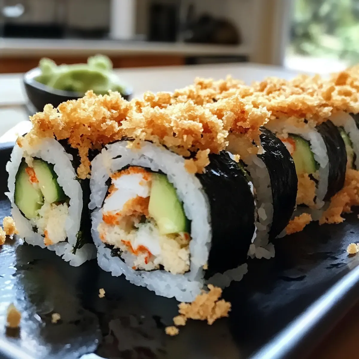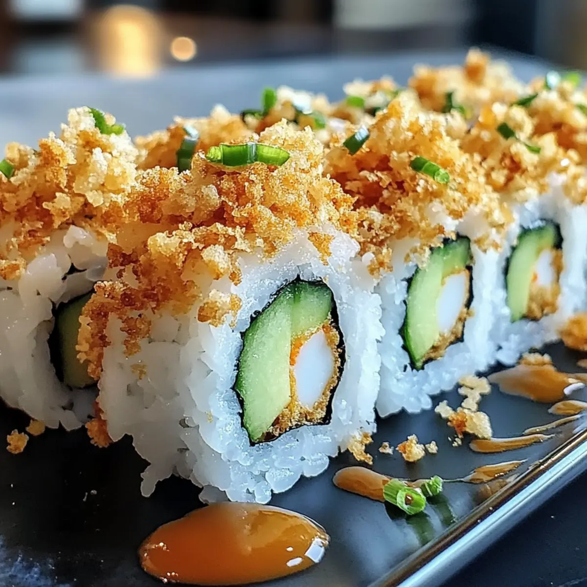Als ich das erste Mal beim Sushi-Rollen eine kleine missratene Kreation kreierte, war ich überrascht, wie viel Freude das Experimentieren in der Küche bereiten kann. Heute lade ich dich ein, dir mit meinem Rezept für California Crunch Roll Sushi einen Moment voller Geschmack und Kreativität zu gönnen. Diese leckeren Rollen sind nicht nur anfängerfreundlich und einfach zuzubereiten, sondern ermöglichen dir auch, deine eigenen Vorlieben zu berücksichtigen – sei es in veganer Form oder mit glutenfreien Alternativen. Die Kombination aus cremigem Avocado, knackiger Gurke und herzhaftem Krebsfleisch, umhüllt von klebrigem Sushi-Reis, sorgt für ein Geschmackserlebnis, das sicher beim nächsten Abendessen beeindrucken wird. Wer kann da schon widerstehen? Also, bereit für deinen eigenen Sushi-Erfolg? Lass uns gemeinsam die Rollkunst entdecken! Warum wirst du dieses Rezept lieben? Einfachheit, die begeistert: Die Zubereitung von California Crunch Roll Sushi ist ein absolutes Kinderspiel! Selbst wenn du ein Anfänger bist, wirst du mit diesem Rezept viel Spaß beim Rollen haben. Kreative Vielfalt: Du kannst die Zutaten ganz nach deinem Geschmack anpassen, sei es mit veganen Alternativen oder glutenfreien Optionen. Denk daran, Variationen auszuprobieren und deinen liebsten Twist hinzuzufügen! Unvergesslicher Geschmack: Die Kombination aus cremiger Avocado, knackiger Gurke und würzigem Krebsfleisch verbindet sich zu einem unvergleichlichen Geschmackserlebnis – so gut, dass das Sushirestaurant um die Ecke in Vergessenheit geraten wird. Geselliges Kochen: Perfekt für eine gemütliche Sushi-Nacht mit Freunden oder Familie! Zusammen macht das Rollen noch mehr Freude und bringt alle zum Schmunzeln. Genuss in jedem Biss: Genieße die köstliche Textur der knusprigen Toppings auf deinen selbstgemachten Rollen und erlebe das befriedigende Gefühl, etwas Einzigartiges kreiert zu haben! California Crunch Roll Sushi Zutaten • Die perfekte Mischung für dein Sushi-Abenteuer! Für den Sushi-Reis Sushi Reis – bildet die Grundlage deiner Rolls; für eine gesündere Option kannst du auch Vollkornreis verwenden. Reisessig – verleiht dem Reis eine sanfte Säure, die das Gesamtaroma hebt. Zucker – sorgt für eine harmonische Süße im Sushi-Reis. Salz – verstärkt die Aromen des Reises. Für das Füllen Nori Blätter – sie sind unerlässlich für das Rollen; achte darauf, dass sie auf einer Seite glänzen, um ein optimales Ergebnis zu erzielen. Krebsersatz (oder echter Krebs) – sorgt für den herzhaften Geschmack; verwende marinierten Tofu als vegane Alternative. Avocado – bringt Cremigkeit; wähle eine reife Avocado für die beste Textur. Gurke – sorgt für einen frischen Crunch; schneide sie in dünne Streifen zur einfachen Rollung. Für die Saucen und Toppings Würzige Mayo – verstärkt die Aromen; passe das Verhältnis von Mayo und Sriracha nach deinem Geschmack an. Aal-Sauce – eine süßliche und salzige Ergänzung; kann durch Sojasauce ersetzt werden, wenn gewünscht. Knuspriges Topping – sorgt für einen letzten krossen Biss; wähle zwischen gerösteten Panko-Bröseln oder französischen Zwiebelringen. Das Rezept für California Crunch Roll Sushi bietet dir die Möglichkeit, deine Küche in ein Sushi-Paradies zu verwandeln! Schritt-für-Schritt-Anleitung für California Crunch Roll Sushi Step 1: Reis zubereiten Spüle 1 Tasse Sushi-Reis unter kaltem Wasser, bis das Wasser klar ist. Koche den Reis mit 1¼ Tassen Wasser bei mittlerer Hitze für etwa 18 Minuten, bis er weich und das Wasser vollständig absorbed ist. Füge eine Mischung aus 2 Esslöffeln Reisessig, 1 Esslöffel Zucker und ½ Teelöffel Salz hinzu und lasse den Reis auf Zimmertemperatur abkühlen. Step 2: Arbeitsbereich vorbereiten Wickele eine Bambus-Sushi-Matte in Frischhaltefolie, um das Rollverfahren zu erleichtern. Bereite dir eine kleine Schüssel mit Wasser und einem Schuss Reisessig vor, um die Hände während des Rollens feucht zu halten und ein Kleben des Reises zu verhindern. Step 3: Sushi zusammenstellen Lege ein Nori-Blatt mit der glänzenden Seite nach unten auf die Sushi-Matte. Verteile den abgekühlten Sushi-Reis gleichmäßig über die untere Hälfte des Nori und lasse dabei an der Oberkante etwa 2 cm Platz. Lege in der Mitte eine Schicht aus Imitationskrabben, Avocado und Gurkenstreifen. Step 4: Sushi rollen Beginne damit, das Nori über die Füllungen zu rollen, während du die Füllungen sanft mit einem Daumen nach innen drückst. Rolle das Sushi eng und gleichmäßig von dir weg, bis das Nori vollständig gerollt ist. Verwende etwas Wasser an der offenen Kante, um die Rolle zu versiegeln. Step 5: Crunch hinzufügen Bestreiche die Oberfläche der Rolle leicht mit der würzigen Mayo oder der Aal-Sauce. Streue das knusprige Topping darüber und drücke sanft, damit es haftet. Dies verleiht deinem California Crunch Roll Sushi die gewünschte knusprige Textur und macht es unwiderstehlich. Step 6: Sushi schneiden und servieren Nutze ein scharfes, feuchtes Messer, um die Rolle in 8 gleichmäßige Stücke zu schneiden. Achte darauf, dass du sanfte, gleichmäßige Schnitte machst, um die Füllung nicht herauszupressen. Serviere die Stücke auf einem Teller mit Sojasauce, eingelegtem Ingwer und Wasabi für ein komplettes Sushi-Erlebnis. Expert Tips für California Crunch Roll Sushi Reis perfekt kochen: Achte darauf, den Sushi-Reis gründlich zu spülen, bevor du ihn kochst. So entfernt du überschüssige Stärke und erzielst die ideale Konsistenz. Füllung nicht überladen: Vermeide es, die Rollen zu überfüllen, um ein Platzen beim Schneiden zu verhindern. Eine moderate Menge an Füllung sorgt für ein besseres Rolling. Temperatur beachten: Stelle sicher, dass der Sushi-Reis auf Zimmertemperatur abgekühlt ist. Dadurch bleibt das Nori knusprig und wird nicht zäh. Scharfes Messer verwenden: Nutze ein feuchtes, scharfes Messer für saubere Schnitte. So bleibt der Reis an den Rollen haften und du e