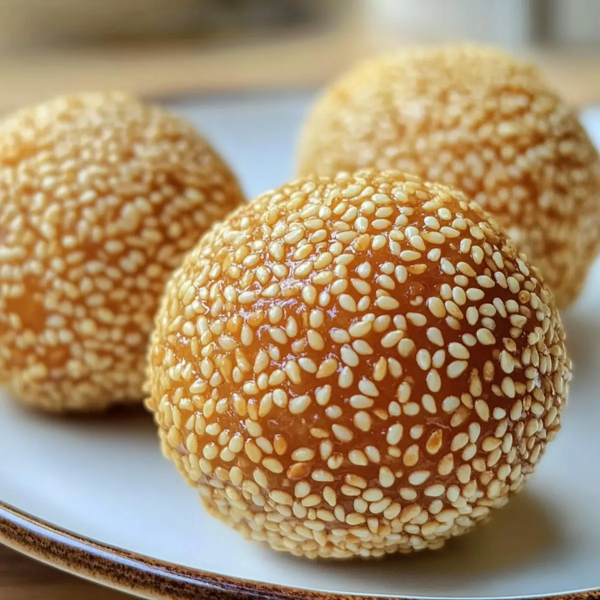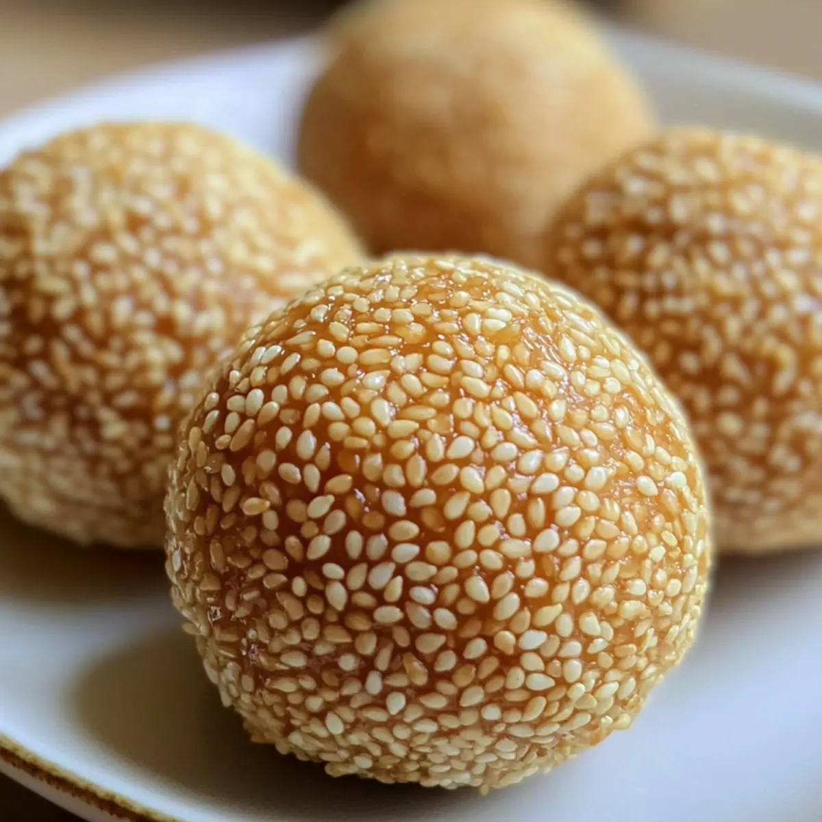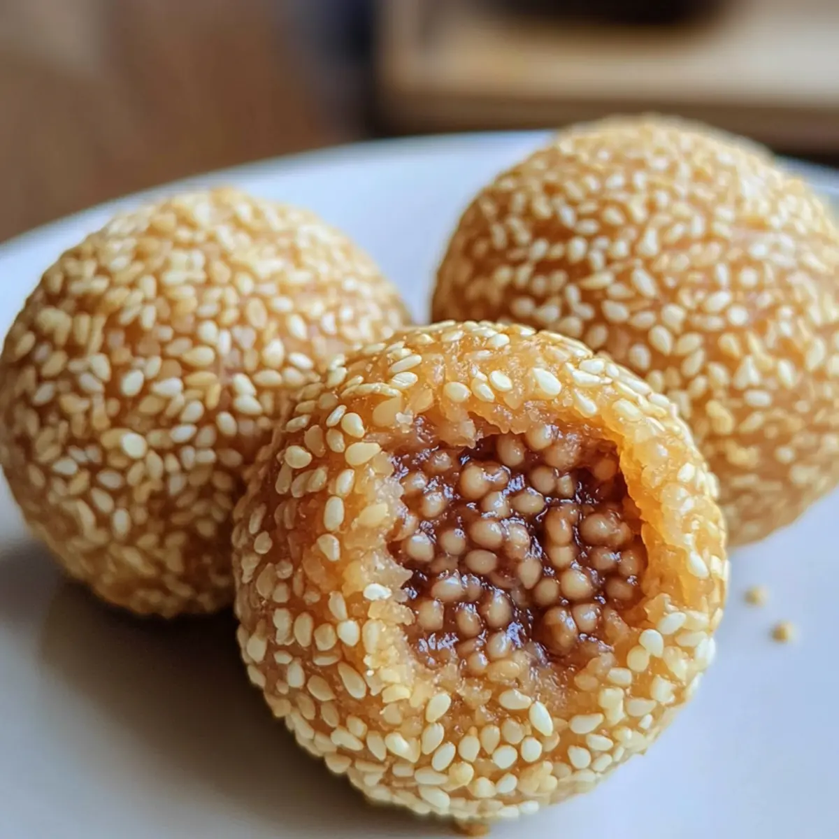 Ein Biss in diese knusprigen Chinesischen gebratenen Sesamkugeln (Jian Dui) ist wie eine Reise in meine Kindheit, als ich oft fieberhaft darauf wartete, dass meine Großmutter ihren berühmten Nachtisch zubereitete. Diese kleinen, goldenen Köstlichkeiten, gefüllt mit süßer roter Bohnenpaste, sind nicht nur eine Freude während des chinesischen Neujahrs, sondern eignen sich hervorragend für jeden Anlass. Mit ihrer angenehm chewy-Textur und dem knusprigen Überzug bieten sie eine wunderbare Abwechslung zu herkömmlichen Snacks und sind zudem glutenfrei, was sie für viele zugänglich macht. Sie sind schnell zubereitet und haben die Macht, jeden Gaumen zu begeistern. Wer würde da nicht gerne mehr erfahren und sie selbst ausprobieren? Warum sind diese Sesamkugeln ein Muss? Nostalgie pur: Ein Biss in diese Chinesische gebratene Sesamkugeln bringt Erinnerungen an Kindheit und Familienfeiern zurück. Einfach zu machen: Der gesamte Prozess ist unkompliziert und benötigt kaum spezielle Fertigkeiten – perfekt für Küchenneulinge und Profis gleichermaßen. Vielfältige Füllungen: Während die klassische Variante mit roter Bohnenpaste gefüllt ist, ermöglichen diese Kugeln eine Vielzahl an Füllmöglichkeiten wie Lotus- oder schwarze Bohnenpaste. Glutenfreier Genuss: Durch die Verwendung von klebrigem Reis mehl sind sie für viele Personen geeignet und bieten einen leckeren Snack für alle. Crowd-Pleaser: Egal ob bei Festlichkeiten oder gemütlichen Abenden – diese Köstlichkeiten sind immer ein Hit, der Gaumen und Herz erfreut. Warum probierst du sie nicht einfach aus? Zutaten für Chinesische gebratene Sesamkugeln • Diese köstlichen Leckereien verlangen nach frischen Zutaten! Rote Bohnen – Sie liefern die Süße und Textur für die Füllung; idealerweise über Nacht einweichen für beste Ergebnisse. Wasser – Essentiell zum Kochen und Mischen der Bohnen sowie zum Auflösen von Zucker im Teig. Zucker – Er süßt sowohl die rote Bohnenpaste als auch den Teig; Alternativen können nicht die gleiche Süße bieten. Klebereis-Mehl – Es sorgt für einen chewy Teig und ist für das Rezept unerlässlich; ein Austausch könnte die Textur verändern. Kocht heißes Wasser – Hydriert das Mehl und sorgt für eine glatte Teigkonsistenz. Pflanzenöl – Wird zum Frittieren verwendet und sorgt für eine knusprige Außenfläche; kann durch Raps- oder Erdnussöl ersetzt werden. Weiße Sesamsamen – Wichtig für die Beschichtung der Kugeln, die Crunch und Geschmack liefern; geröstete Samen haben einen intensiveren Geschmack. Lass dich von diesen Chinesischen gebratenen Sesamkugeln verführen und erlebe, wie sie deine nächste Feier verzaubern können! Step-by-Step Instructions für Chinesische gebratene Sesamkugeln Step 1: Rote Bohnenpaste zubereiten Weiche 1 Tasse rote Bohnen über Nacht in Wasser ein. Am nächsten Tag koche die Bohnen in 2 Tassen Wasser, bis sie zart sind (ca. 30–40 Minuten). Püriere die gekochten Bohnen zu einer glatten Paste und koche sie anschließend mit ½ Tasse Zucker in einer Pfanne, bis die Mischung dick wird. Lasse die Paste abkühlen. Step 2: Teig herstellen Löse ¾ Tasse Zucker in 1 ⅓ Tassen kochendem Wasser auf. Siebe 3 Tassen Klebereis-Mehl in eine große Schüssel und füge nach und nach den Zuckersirup hinzu. Mische alles gründlich mit einem Holzlöffel, bis ein glatter, geschmeidiger Teig entsteht. Füge ½ Teelöffel Pflanzenöl hinzu und knete es leicht unter. Step 3: Kugeln formen Lasse den Teig 15 Minuten ruhen, damit er sich setzen kann. Teile den Teig anschließend in etwa 20 gleich große Portionen. Drücke jede Portion flach und füge einen Teelöffel der abgekühlten roten Bohnenpaste in die Mitte. Falte den Teig über der Füllung zusammen, forme die Kugeln und rolle sie sanft zwischen deinen Händen. Step 4: Panieren und Frittieren Befeuchte die frischen Kugeln leicht mit Wasser und rolle sie dann in einer Schüssel mit weißen Sesamsamen, bis sie gleichmäßig bedeckt sind. Erhitze 4 Tassen Pflanzenöl in einem tiefen Topf auf 350°F (176°C). Frittiere die Sesamkugeln in kleinen Mengen (4-5 gleichzeitig) für etwa 3–4 Minuten, bis sie goldbraun sind, und achte dabei darauf, sie vorsichtig zu wenden. Step 5: Abkühlen und Servieren Entferne die goldbraunen Chinesischen gebratenen Sesamkugeln vorsichtig aus dem Öl und lasse sie auf Küchenpapier abtropfen, um überschüssiges Fett zu entfernen. Am besten schmecken sie frisch und warm. Serviere die Sesamkugeln als köstlichen Snack oder Dessert und genieße ihre vielfältige Textur und den süßen Geschmack! Chinesische gebratene Sesamkugeln im Voraus zubereiten Diese Chinesischen gebratenen Sesamkugeln sind perfekt für die Vorbereitung im Voraus! Du kannst die rote Bohnenpaste bis zu 3 Tage im Voraus zubereiten und im Kühlschrank aufbewahren, wodurch die Aromen Zeit haben, sich zu entfalten. Um die Qualität zu sichern, achte darauf, dass die Paste vollständig abgekühlt ist, bevor du sie in einem luftdichten Behälter lagerst. Auch der Teig für die Kugeln lässt sich gut bis zu 24 Stunden im Voraus vorbereiten; forme die Kugeln und lege sie anschließend auf ein mit Backpapier belegtes Blech, um ein Zusammenkleben zu verhindern. Wenn du bereit bist, sie zu frittieren, erhitze das Öl und gare die Kugeln in kleinen Portionen für 3-4 Minuten bis zur goldbraunen Perfektion. So hast du in kürzester Zeit köstliche Chinesische gebratene Sesamkugeln ohne Stress! Was passt zu Chinesischen gebratenen Sesamkugeln? Ein köstliches Erlebnis für alle Sinne fordert eine perfekte Begleitung – und diese Vorschläge werden Ihre Chinesischen gebratenen Sesamkugeln wunderbar ergänzen. Grüner Tee: Ein leicht herber und erfrischender grüner Tee rundet den süßen Geschmack der Sesamkugeln perfekt ab. Er bringt eine angenehme Balance zu den süßen und knusprigen Köstlichkeiten. Frischer Obstsalat: Eine Mischung aus tropischen Früchten sorgt für eine erfrischende, saftige Beilage. Die Fris