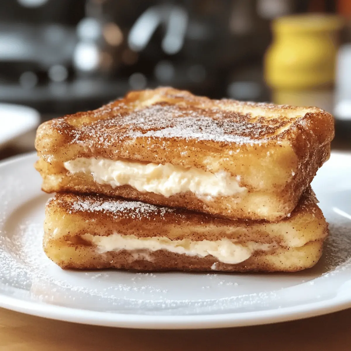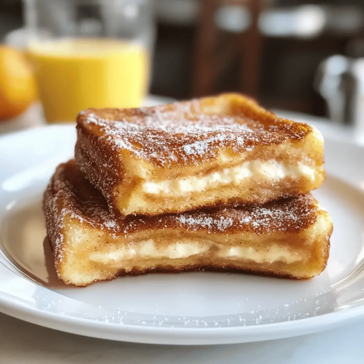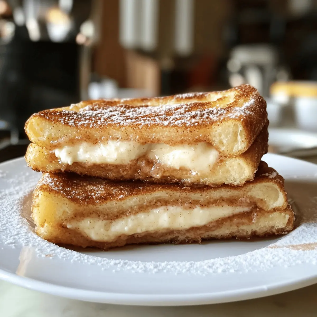 Während ich in meiner Küche stehe und das köstliche Aroma von frisch gebratenem Brot in der Luft liegt, kann ich die Vorfreude auf mein heutiges Rezept kaum zurückhalten: Churro Stuffed French Toast mit Zimt-Zucker. Diese Verführung aus knusprigen Churros und fluffigem französischen Toast bietet nicht nur einen himmlischen Genuss, sondern ist auch schnell zubereitet – perfekt für das gemütliche Wochenende oder einen besonderen Brunch mit Freunden. Mit einer zarten Füllung aus cremigem Frischkäse und dem süßen, knusprigen Überzug wird jede Portion zum Highlight auf dem Frühstückstisch. Worauf warten Sie noch? Lassen Sie uns gemeinsam dieses himmlische Gericht zubereiten und vielleicht sogar eine persönliche Note hinzufügen! Warum werden Sie dieses Rezept lieben? Einfachheit: Die Zubereitung ist unkompliziert und erfordert keine besonderen Fähigkeiten in der Küche, sodass jeder es genießen kann. Wunderbarer Geschmack: Die Kombination aus Frischkäse und Zimt-Zucker sorgt für einen unwiderstehlich leckeren Geschmack, der den Morgen versüßt. Vielseitigkeit: Sie können verschiedene Füllungen ausprobieren, wie Nutella oder fruchtige Marmelade, um es nach Ihrem Geschmack zu gestalten. Perfekt für Brunch: Ideal für ein gemütliches Frühstück mit Freunden oder Familie – Jeder wird begeistert sein! Zeitersparnis: In nur wenigen Schritten verwandeln Sie einfache Zutaten in ein beeindruckendes Gericht. Churro Stuffed French Toast Zutaten Für den Toast Challah-Brot – bietet eine weiche, fluffige Basis; Brioche oder Texas Toast sind gute Alternativen. Eier – dienen als Bindemittel und sorgen für eine cremige Panade. Vollmilch – verleiht der Mischung einen reichhaltigen Geschmack; Mandel- oder Hafermilch sind gute, milchfreie Alternativen. Vanilleextrakt – intensiviert den Geschmack und das Aroma. Für die Füllung Frischkäse – sorgt für eine cremige, reiche Füllung; alternativ kann auch griechischer Joghurt verwendet werden. Puderzucker – süßt die Füllung und gibt ihr eine feine Note. Für die Zuckermischung Zucker – süßt den Toast und wird für die Beschichtung verwendet. Brauner Zucker – fügt eine tiefe, melassiertote Note hinzu. Zimt – sorgt für den charakteristischen Churro-Geschmack. Tipps zur Zubereitung Nutzen Sie dick geschnittenes Brot, um ein Durchweichen zu verhindern. Lassen Sie die Eimischung vor dem Eintauchen des Brotes ein paar Minuten ruhen, um das beste Ergebnis zu erzielen. Vermeiden Sie es, das Brot zu lange einzuweichen, um eine matschige Konsistenz zu vermeiden. Die Zubereitung des Churro Stuffed French Toast verspricht ein unvergessliches Geschmackserlebnis und bringt eine süße Note in Ihr Frühstück, die Sie nicht verpassen sollten! Schritt-für-Schritt-Anleitung für Churro Stuffed French Toast Schritt 1: Eimischung vorbereiten Verquirlen Sie in einer flachen Schüssel die Eier, die Vollmilch und den Vanilleextrakt gründlich miteinander. Stellen Sie sicher, dass alle Zutaten gut vermischt sind, sodass eine homogene Mischung entsteht. Lassen Sie die Eimischung für etwa fünf Minuten ruhen, damit sich die Aromen entfalten können. Schritt 2: Füllung zubereiten In einer separaten Schüssel vermengen Sie den Frischkäse, den Puderzucker und einen Spritzer Milch, bis eine glatte und cremige Konsistenz erreicht ist. Diese Füllung sorgt für den dekadenten Kern Ihres Churro Stuffed French Toast. Halten Sie die Mischung bereit, während Sie das Brot vorbereiten. Schritt 3: Zuckermischung herstellen Mischen Sie in einer flachen Schale den Zucker, den braunen Zucker und den Zimt zu einer gleichmäßigen Zuckermischung. Diese Mischung wird später verwendet, um Ihren französischen Toast eine süße und aromatische Überzug zu geben, der dem klassischen Churro ähnelt. Schritt 4: Toast zusammenstellen Nehmen Sie zwei Scheiben des Challah-Brots und breiten Sie eine großzügige Menge der Frischkäsefüllung zwischen ihnen aus. Drücken Sie die Scheiben leicht zusammen, sodass die Füllung gut verteilt und die Füllung nicht herausquillt. Dieser Schritt ist entscheidend für den köstlichen Geschmack des Churro Stuffed French Toast. Schritt 5: Brot in Eimischung tauchen Tauchen Sie das gefüllte Brot vorsichtig in die Eimischung, sodass jede Seite gut benetzt ist. Achten Sie darauf, dass das Brot nicht zu lange eingeweicht wird, um eine matschige Textur zu vermeiden. Stellen Sie sicher, dass jede Ecke gut beschichtet ist, um die optimale Balance zwischen dem fluffigen Inneren und der knusprigen Außenseite zu gewährleisten. Schritt 6: Toast braten Erhitzen Sie eine große Pfanne bei mittlerer Hitze und geben Sie etwas Öl oder Butter hinzu. Braten Sie den gefüllten Toast etwa 3-4 Minuten pro Seite, bis er goldbraun und knusprig ist. Achten Sie darauf, dass die Hitze nicht zu hoch ist, um ein Anbrennen zu vermeiden, während das Innere schön gart. Schritt 7: In Zuckermischung wälzen Sobald der Churro Stuffed French Toast goldbraun und knusprig ist, nehmen Sie ihn direkt aus der Pfanne und wälzen ihn sofort in der vorbereiteten Zuckermischung. So bleibt der Zucker gut haften und verleiht jedem Bissen den köstlichen Churro-Geschmack. Genießen Sie sofort! Lagerungstipps für Churro Stuffed French Toast Zimmertemperatur: Bewahren Sie den Churro Stuffed French Toast nicht länger als 2 Stunden bei Raumtemperatur auf, um eine optimale Frische zu erhalten. Kühlschrank: Lagern Sie Reste in einem luftdichten Behälter im Kühlschrank für bis zu 2 Tage. So bleibt die Füllung cremig und der Toast frisch. Tiefkühler: Für eine langfristige Lagerung können Sie den gefüllten Toast gut in Frischhaltefolie einwickeln und bis zu 3 Monate einfrieren. Denken Sie daran, ihn gut abzutauen, bevor Sie ihn wieder erhitzen. Wiedererwärmung: Stellen Sie sicher, dass Sie Reste im Toaster oder im Ofen bei niedriger Temperatur (etwa 150 °C) aufwärmen, um die knusprige Textur des Churro Stuffed French Toast zu erhalten. Was passt zu Ch