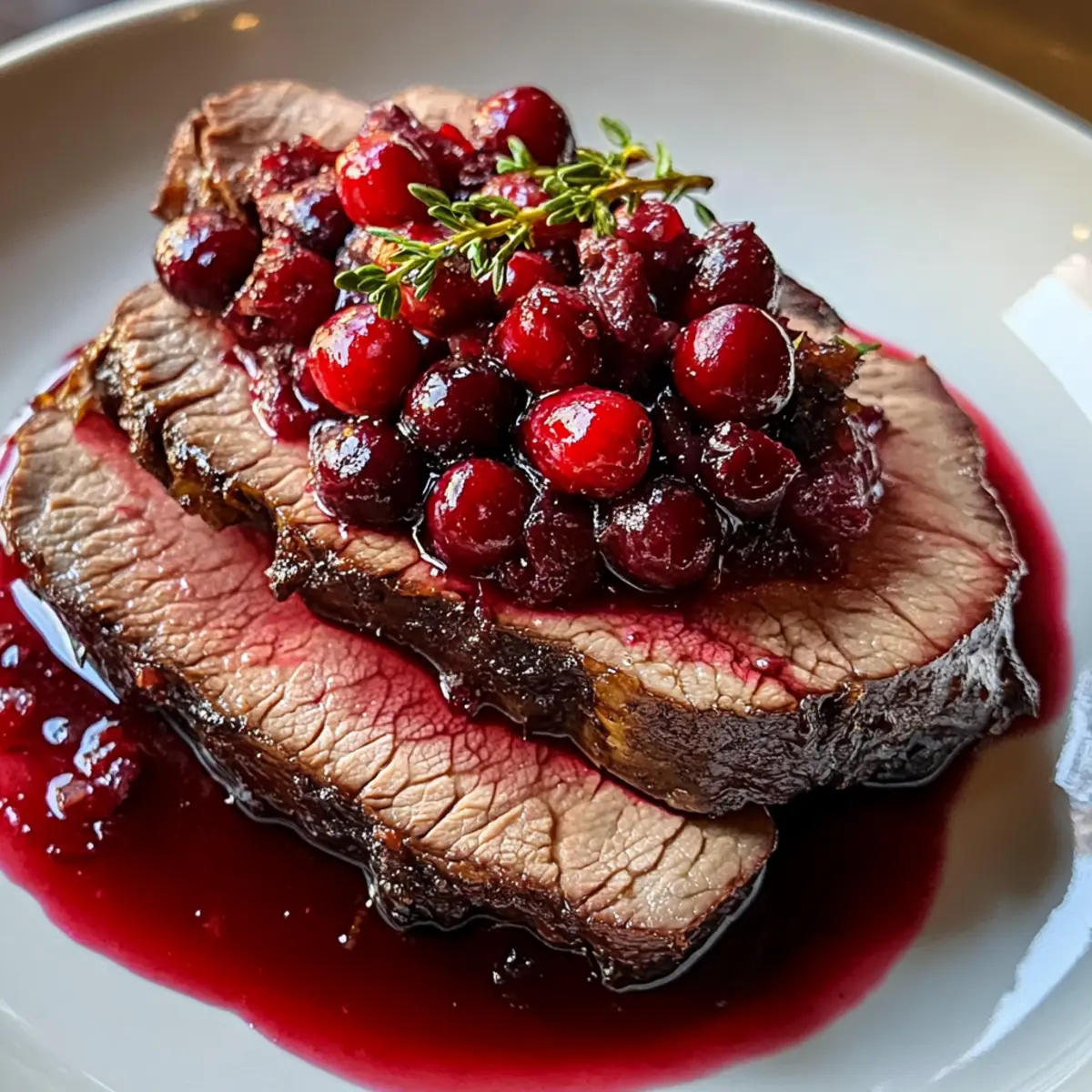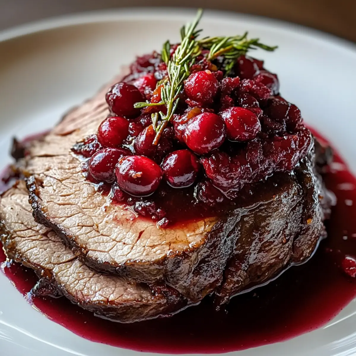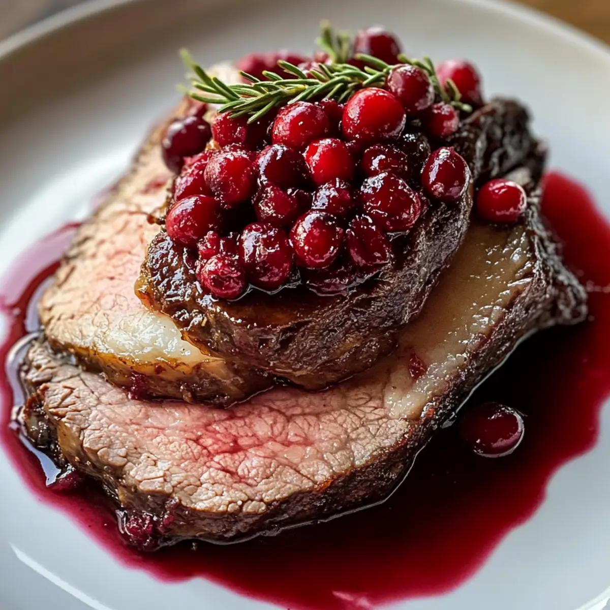 We alle kennen das Gefühl, wenn der Duft von frisch gebratenem Fleisch und aromatischen Kräutern durch die Küche zieht. Heute lade ich euch ein, ein köstliches Gericht zu zaubern: den Cranberry-Rinderbraten. Dieses Rezept vereint die herzhaften Aromen von zartem Rindfleisch mit einer erfrischenden, süß-sauren Cranberry-Sauce und sorgt somit für ein unvergessliches Geschmackserlebnis, das perfekt zu festlichen Anlässen passt. Dieser saftige Braten ist nicht nur einfach zuzubereiten, sondern beeindruckt auch eure Gäste und bringt festliche Stimmung auf den Tisch. Seid ihr bereit, euren nächsten Feiertagsabend zu einem ganz besonderen Erlebnis zu machen? Warum wirst du diesen Rinderbraten lieben? Vielfältige Variationen: Dieser Cranberry-Rinderbraten lässt sich leicht anpassen, indem du unterschiedliche Rindfleischstücke wie Ribeye oder Chuck verwendest. Unvergleichlicher Geschmack: Die Kombination aus herzhaftem Rindfleisch und süß-saurer Cranberry-Sauce sorgt für ein Geschmackserlebnis, das die Geschmacksknospen verzaubert. Einfache Zubereitung: Auch wenn das Rezept anspruchsvoll aussieht, sind die Schritte unkompliziert und für jeden Koch geeignet. Festliche Präsentation: Durch die Garnitur mit frischen Cranberries und Rosmarin wird jeder Teller zum Blickfang. Perfekt für besondere Anlässe: Egal ob für ein Familienfest oder ein Abendessen mit Freunden, dieser Braten bringt festliche Stimmung und wird begeistern! Bereite ihn zu und genieße dazu vielleicht auch meine garlic mashed potatoes für ein rundum leckeres Menü. Cranberry-Rinderbraten Zutaten Für den Braten Rindfleisch (3 bis 4 Pfund) – Wähle ein Stück wie Chuck oder Ribeye für optimale Zartheit und Geschmack. Cranberries (1 Tasse) – Frisch oder gefroren, sie bringen eine spritzige Note in dein Gericht. Rinderbrühe (1 Tasse) – Sorgt für Feuchtigkeit und verstärkt das Aroma der Sauce. Zucker (1/2 Tasse) – Balanciert die Säure der Cranberries; Honig kann als alternative Süßungsquelle verwendet werden. Balsamico-Essig (1/4 Tasse) – Fügt der Sauce Tiefe und eine willkommene Säure hinzu. Sojasauce (2 Esslöffel) – Bringt einen herzhaften Umami-Geschmack in den Braten. Dijon-Senf (1 Esslöffel) – Verleiht einen leichten Biss und fördert das Gleichgewicht der Aromen. Olivenöl (1 Esslöffel) – Hilft, die Gewürze am Fleisch haften zu lassen. Knoblauch (4 Zehen, gehackt) – Gibt der Sauce und dem Rindfleisch ein hervorragendes Aroma. Salz (1 Teelöffel) – Unverzichtbar für die Würze. Schwarzer Pfeffer (1 Teelöffel) – Fügt eine milde Schärfe hinzu. Thymian (1 Teelöffel) – Sorgt für eine erdige Note und ein angenehmes Aroma. Rosmarin (1 Teelöffel) – Verleiht dem Gericht einen unvergesslichen Duft. Garnitur (frische Cranberries und Rosmarin) – Optional, aber schön für die Präsentation. Für die Cranberry-Sauce Cranberries (1 Tasse) – Für eine reichhaltige und fruchtige Sauce. Beef Broth (1 Tasse) – Fügt Geschmack und Feuchtigkeit hinzu. Zucker (1/2 Tasse) – Hilft, die Säure der Cranberries zu balancieren und kann durch Honig ersetzt werden. Mit diesen Zutaten zauberst du einen köstlichen Cranberry-Rinderbraten für deine nächsten festlichen Anlässe! Step-by-Step Instructions für Cranberry-Rinderbraten Step 1: Ofen vorheizen Heize den Ofen auf 163 °C (325 °F) vor. Diese Temperatur sorgt dafür, dass der Cranberry-Rinderbraten gleichmäßig gart und zart bleibt. Während der Ofen sich aufheizt, kannst du mit den Vorbereitungen für die Cranberry-Sauce beginnen. Step 2: Cranberry-Sauce zubereiten In einem kleinen Topf kombinierst du die Cranberries, die Rinderbrühe, den Zucker, den Balsamico-Essig, die Sojasauce, den Dijon-Senf und den Knoblauch. Bringe alles zum Kochen und lasse die Mischung 10 bis 15 Minuten köcheln, bis die Cranberries aufplatzen und die Sauce etwas eindickt. Rühre hin und wieder um, um ein Anbrennen zu vermeiden. Step 3: Rindfleisch vorbereiten Reibe das Rindfleisch gründlich mit Olivenöl ein und würze es großzügig mit Salz, Pfeffer, Thymian und Rosmarin. Diese Gewürze verleihen deinem Cranberry-Rinderbraten ein aromatisches Profil, das die Gäste begeistern wird. Stelle sicher, dass das Fleisch gleichmäßig gewürzt ist, um den besten Geschmack zu erzielen. Step 4: Rinderbraten anbraten Lege das gewürzte Rindfleisch in eine Bratpfanne und gieße die Hälfte der vorbereiteten Cranberry-Sauce über das Fleisch. Dies trägt dazu bei, dass die Aromen gut durchdringen, während das Fleisch im Ofen gart. Achte darauf, dass die Sauce gleichmäßig verteilt ist, um eine optimale Feuchtigkeit zu gewährleisten. Step 5: Braten garen Decke die Bratpfanne mit Alufolie ab und brate das Fleisch im vorgeheizten Ofen für 2 bis 2,5 Stunden. Überprüfe die Kerntemperatur mit einem Fleischthermometer – für medium-rare solltest du etwa 57 °C (135 °F) anstreben und für medium ungefähr 63 °C (145 °F). Achte darauf, dass das Fleisch zart und saftig bleibt. Step 6: Baste mit Sauce Nimm die Folie nach 2 Stunden ab und baste das Fleisch 30 Minuten vor Ende der Garzeit mit der restlichen Cranberry-Sauce. Dies gibt dem Cranberry-Rinderbraten eine schöne Bräunung und eine köstliche Glasur. Achte darauf, dass die Sauce gleichmäßig auf das Fleisch verteilt wird, damit es noch saftiger wird. Step 7: Fleisch ruhen lassen Nach dem Garen den Braten aus dem Ofen nehmen und ihn 15 Minuten ruhen lassen. Dies ist wichtig, um die Säfte im Fleisch zu verteilen und die Zartheit zu verbessern. Vermeide es, das Fleisch sofort zu schneiden, da es sonst austrocknen könnte. Step 8: Anrichten und servieren Schneide den Cranberry-Rinderbraten in dünne Scheiben und serviere ihn mit der reservierten Sauce darüber. Garniere das Gericht optional mit frischen Cranberries und Rosmarin, um eine festliche Präsentation zu gestalten. Dieses Gericht wird garantiert zum Highlight auf deinem Tisch! Cranberry-Rinderbraten Variationen und Substitutionen Du kannst dein