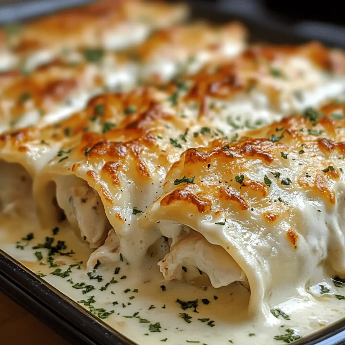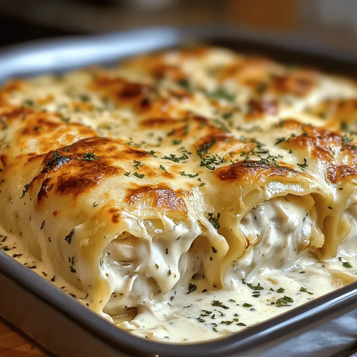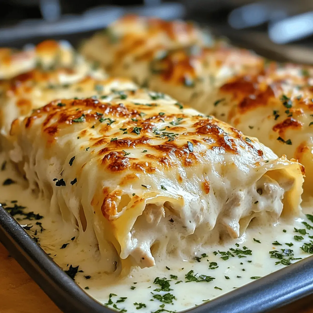 Zu Recht sagt man, dass es manchmal die kleinen Änderungen sind, die den größten Eindruck hinterlassen. Diese cremigen Chicken Alfredo Lasagna Rolls sind genau das: eine köstliche Abwandlung des klassischen Pasta-Gerichts. In zarten Lasagne-Nudeln gewickelt, vereinen sie die reichhaltigen Aromen der Alfredo-Sauce mit einer befriedigenden Textur, die perfekt für Familienessen oder besondere Anlässe geeignet ist. Das Beste daran? Die Zubereitung ist ein Kinderspiel und sie sind ein echter Publikumsliebling – ideal, um Fast Food hinter sich zu lassen. Neugierig, wie schnell Sie diese köstlichen Rollen auf den Tisch bringen können? Neugierig auf diese köstlichen Rollen? Köstlich und Cremig: Diese Chicken Alfredo Lasagna Rolls sind eine wahre Geschmacksexplosion, die jeder lieben wird. Einfach zuzubereiten: Mit nur wenigen Schritten und einigen Grundzutaten zaubern Sie im Handumdrehen ein Comfort Food, das begeistert. Vielseitig: Passen Sie das Rezept an, indem Sie verschiedene Käsesorten oder Gemüse hinzufügen. Perfekt für kreative Köche! Publikumsliebling: Ob beim Familienessen oder einem gemütlichen Abend mit Freunden, dieses Gericht wird sicher für strahlende Gesichter sorgen. Zeitersparnis: Weniger Vorbereitungszeit im Vergleich zu traditioneller Lasagne – genießen Sie mehr Zeit am Tisch! Chicken Alfredo Lasagna Roll Zutaten Für die Füllung Lasagne-Nudeln – Struktur und Grundlage des Gerichts; verwenden Sie Noodles, die nicht gekocht werden müssen, um Zeit zu sparen. Gegartes Hähnchen – Fügt Protein und Herzhaftigkeit hinzu; zerrupftes Rotisserie-Hähnchen ist ein guter Zeit-Sparer. Ricotta-Käse – Sorgt für Cremigkeit und hilft, die Füllung zu binden; ersetzen Sie ihn durch Hüttenkäse für eine leichtere Variante. Geriebener Parmesan – Fügt einen scharfen, salzigen Geschmack hinzu; verwenden Sie frisch geriebenen Käse für die besten Ergebnisse. Geriebener Mozzarella – Schmilzt wunderbar für eine schmelzige Textur; kann durch Provolone oder eine milchfreie Alternative ersetzt werden. Alfredo-Sauce – Grundgeschmack, der die Füllung vereint und Feuchtigkeit hinzufügt; fertig gekaufte Sauce spart Zeit, oder herstellen Sie eine hausgemachte für einen frischeren Geschmack. Knoblauchpulver – Fügt aromatische Tiefe hinzu; frischer, gehackter Knoblauch kann für einen stärkeren Geschmack verwendet werden. Italienische Gewürzmischung – Bringt würzige Noten, die das Hähnchen verstärken; lassen Sie sie weg, wenn Sie einen schlichten Geschmack bevorzugen oder verwenden Sie frische Kräuter für mehr Frische. Salz und Pfeffer – Verbessert den Gesamtschmeck; an den individuellen Geschmack anpassen. Frische Petersilie (zum Garnieren) – Fügt Farbe und Frische hinzu; kann durch Basilikum für eine andere Kräuternote ersetzt werden. Für das Topping Zusätzlicher Mozzarella – Für einen leckeren, geschmolzenen Käseüberzug; verwenden Sie eine Mischung aus verschiedenen Käsesorten für ein interessantes Geschmacksprofil. Diese cremigen Chicken Alfredo Lasagna Rolls sind wahrhaftig ein Genuss und bieten eine willkommene Abwechslung, die sich perfekt in ein gemütliches Abendessen oder ein Familienfest integriert! Schritt-für-Schritt-Anleitung für cremige Hähnchen Alfredo Lasagna Rollen Step 1: Nudeln vorbereiten Kochen Sie die Lasagne-Nudeln in reichlich Salzwasser, bis sie al dente sind, etwa 8-10 Minuten. Lassen Sie sie gut abtropfen und legen Sie die Nudeln anschließend flach auf ein Küchentuch, damit sie nicht zusammenkleben. Dies ist der erste Schritt, um die cremigen Hähnchen Alfredo Lasagna Rollen perfekt zuzubereiten. Step 2: Füllung mischen Vermengen Sie in einer großen Schüssel das zerrupfte Hähnchen, den Ricotta-Käse, eine Tasse Mozzarella, Parmesan, Knoblauchpulver, italienische Gewürze, Salz und Pfeffer, bis eine cremige Masse entsteht. Diese Mischung wird das Herzstück unserer Lasagna Rollen sein – der nächste Schritt ist entscheidend für den Geschmack. Step 3: Rollen zusammenstellen Verteilen Sie eine Schicht Alfredo-Sauce gleichmäßig auf dem Boden einer 9×13-Zoll Auflaufform. Legen Sie jeweils einen Esslöffel der Hähnchenmischung auf jede Lasagne-Nudel und rollen Sie diese auf, wobei die Nahtseite nach unten zeigt, wenn Sie sie in die Form legen. Wiederholen Sie diesen Vorgang für alle Nudeln, um die köstlichen cremigen Hähnchen Alfredo Lasagna Rollen zusammenzustellen. Step 4: Mit Sauce und Käse toppen Gießen Sie die restliche Alfredo-Sauce gleichmäßig über die angerichteten Rollen und bestreuen Sie diese mit dem verbleibenden Mozzarella. Achten Sie darauf, dass jede Rolle gut bedeckt ist, damit die Käseschicht beim Backen schön schmilzt und eine goldbraune Kruste bildet. Step 5: Backen Heizen Sie den Ofen auf 190°C vor. Decken Sie die Auflaufform mit Aluminiumfolie ab und backen Sie die Lasagna Rollen 25 Minuten lang. Entfernen Sie dann die Folie und backen Sie sie für weitere 15-20 Minuten, bis sie blubbern und goldbraun sind. Der aromatische Geruch wird durch die Küche ziehen – ein wahrhaft befriedigendes Zeichen für das bevorstehende Essen. Step 6: Garnieren und servieren Lassen Sie die geschichteten Rollen nach dem Backen einige Minuten abkühlen. Garnieren Sie das Gericht dann mit frischer Petersilie für einen Farbtupfer und die perfekte finale Note. Servieren Sie die cremigen Hähnchen Alfredo Lasagna Rollen warm und genießen Sie die köstliche Kombination der Aromen, die sowohl Familie als auch Freunde begeistern wird. Lagerungstipps für Chicken Alfredo Lasagna Rolls Raumtemperatur:: Es ist am besten, die Chicken Alfredo Lasagna Rolls bei Raumtemperatur nicht länger als 2 Stunden stehen zu lassen, um die Frische und Sicherheit zu gewährleisten. Kühlschrank:: Bewahren Sie die ungebackenen Rollen bis zu 24 Stunden im Kühlschrank auf. Decken Sie die Form gut ab, um ein Austrocknen zu vermeiden. Gefrierschrank:: Gefrorene Chicken Alfredo Lasagna Rolls können bis zu 2 Monat