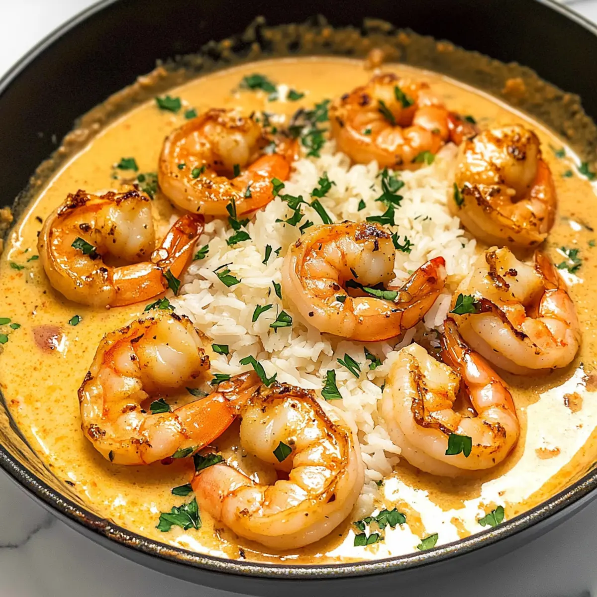 6. Nimm die Pfanne vom Herd und garniere das Gericht mit frisch gehackter Petersilie. Serviere die cremigen Kokosnussgarnelen heiß.