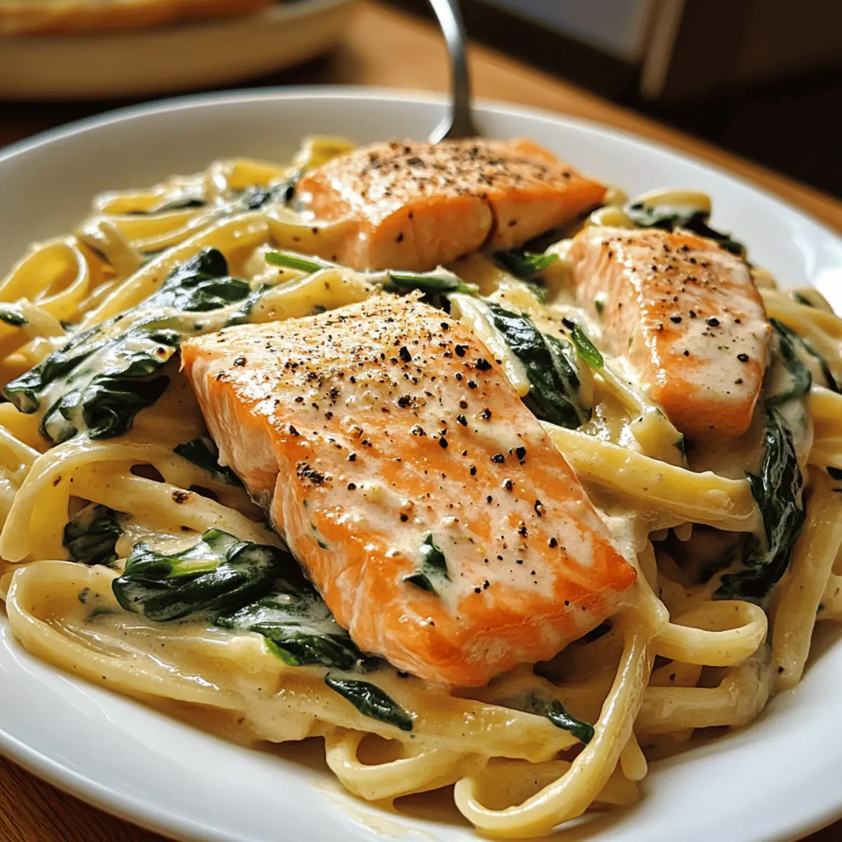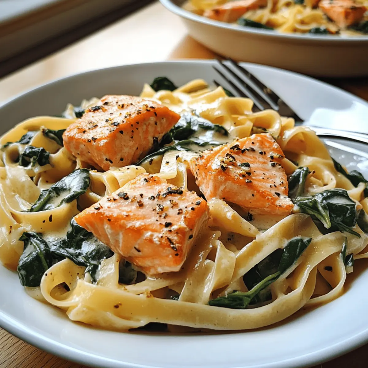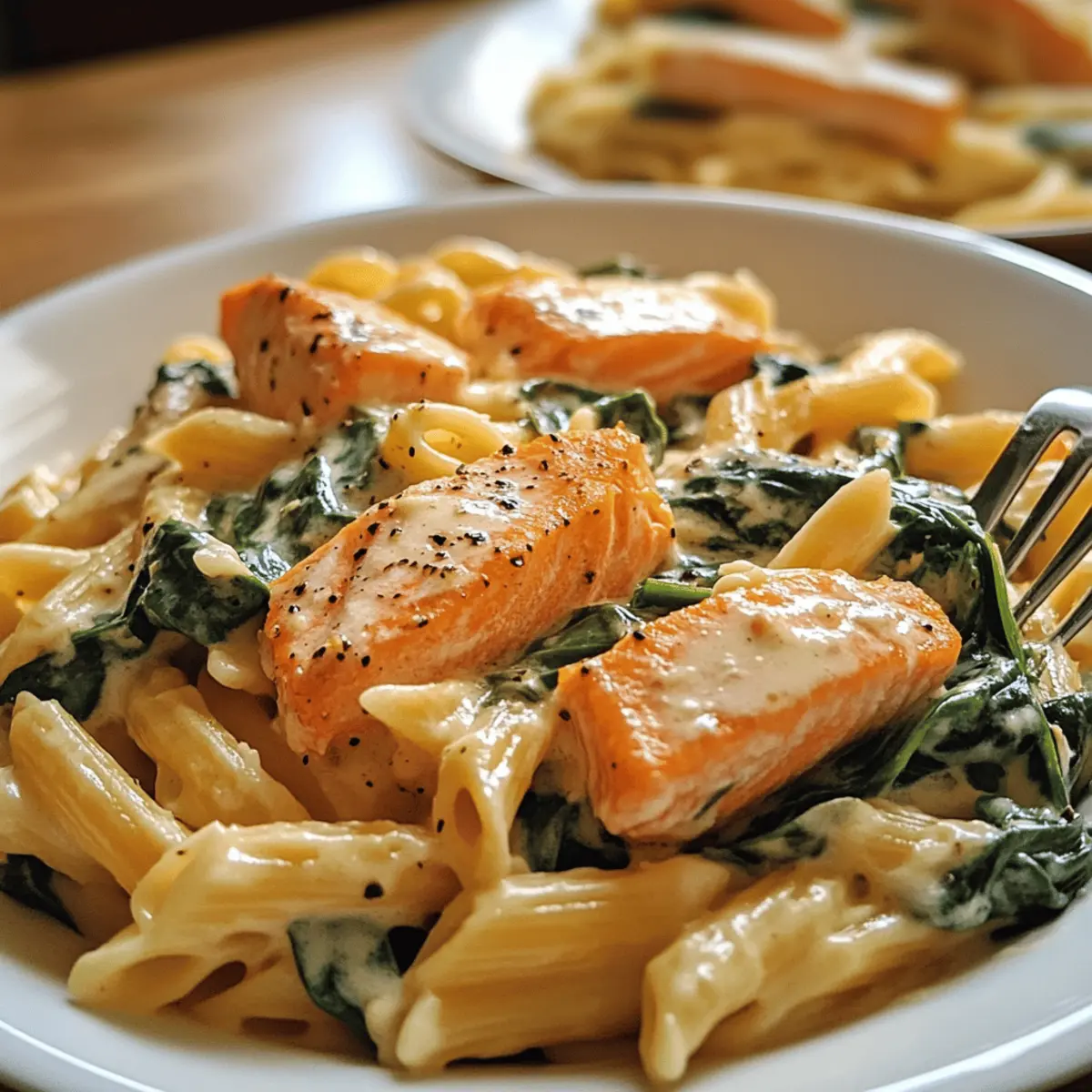 „Ich habe eine aufregende Entdeckung gemacht, die jeden Pasta-Liebhaber begeistern wird.“ Diese cremige Spinach Salmon Pasta kombiniert die zarten Aromen von flauschigem Lachs, lebhafter Spinat und einer köstlichen Knoblauch-Parmesan-Soße, die in nur 30 Minuten fertig ist. Diese gesunde und schnelle Mahlzeit ist nicht nur reich an Omega-3-Fettsäuren, sondern auch ein wahres Highlight für geschäftige Wochentage oder besondere Anlässe. Ob für ein entspanntes Familienessen oder ein romantisches Dinner, dieser Genuss vereint Vergnügen mit Nährstoffen. Und das Beste? Ihr könnt das Rezept kinderleicht an verschiedene Ernährungsbedürfnisse anpassen. Seid ihr bereit, eure Kochkünste auf das nächste Level zu heben? Warum wirst du dieses Rezept lieben? Einfachheit: Die Zubereitung ist kinderleicht und erfordert nur einfache Kochtechniken – perfekt für Anfänger und Profis. Frischer Geschmack: Die Kombination aus zartem Lachs, lebhaftem Spinat und einer cremigen Knoblauch-Parmesan-Sauce sorgt für ein Geschmackserlebnis der Extraklasse. ** Vielseitigkeit:** Ob glutenfrei oder low-carb – dieses Rezept lässt sich mühelos an verschiedene Vorlieben anpassen. Schnelle Zubereitung: In nur 30 Minuten zaubert ihr eine nahrhafte Mahlzeit, ideal für beschäftigte Wochentage. Familienfreundlich: Dieser köstliche Genuss wird garantiert ein Hit bei Jung und Alt – ein ideales Gericht für ein entspanntes Familienessen oder ein romantisches Dinner. Probiert auch unsere Pfeffer Haehnchen Pasta für einen weiteren schnellen Genuss oder entdeckt die One Pot Rezept Möglichkeiten! Cremige Spinat-Lachs-Pasta Zutaten Für die Pasta • Pasta – Wählt eure Lieblingssorte; Vollkornpasta erhöht den Ballaststoffgehalt. • Salmon – Bevorzugt Wildlachs für Geschmack und Omega-3-Fettsäuren; Räucher- oder Dosenlachs sind gute Alternativen. • Spinach – Frischer Babyspinat sorgt für zarte Textur; normale Spinatblätter können ebenfalls verwendet werden, wenn sie gehackt werden. Für die Sauce • Knoblauch – Frisch gehackt bringt das volle Aroma; Knoblauchpulver kann im Notfall verwendet werden. • Parmesan – Frisch gerieben sorgt für die beste Konsistenz und Geschmack; für eine milchfreie Variante ist Hefe eine gute Wahl. • Schlagsahne – Liefert die Cremigkeit der Sauce; Kokosnusscreme oder griechischer Joghurt sind leichtere Alternativen. Wichtiger Hinweis: Diese cremige Spinat-Lachs-Pasta ist ideal für schnelle, gesunde Mahlzeiten und kann leicht an verschiedene Ernährungsbedürfnisse angepasst werden! Schritt-für-Schritt-Anleitung für Cremige Spinat-Lachs-Pasta Step 1: Lachs vorbereiten Heize eine Pfanne bei mittlerer Hitze vor und lege den Lachs mit der Hautseite nach unten hinein. Würze den Lachs großzügig mit Salz und Pfeffer. Brate ihn für etwa 3-4 Minuten, bis sich die Haut knusprig anfühlt. Wende den Lachs vorsichtig und brate ihn für weitere 3-4 Minuten, bis er leicht flockig und eine Innentemperatur von 52-54°C erreicht hat. Step 2: Soße zubereiten Entferne den Lachs aus der Pfanne und lasse ihn kurz ruhen. In derselben Pfanne erhitzt du bei schwacher bis mittlerer Hitze 2 Knoblauchzehen, die du vorher fein gehackt hast. Brate sie für etwa 30 Sekunden, bis sie duften, und gieße dann 200ml Schlagsahne sowie 100g frisch geriebenen Parmesan dazu. Rühre alles gut um, sodass eine cremige Sauce entsteht. Step 3: Pasta kochen Während die Soße köchelt, bringe einen großen Topf mit gesalzenem Wasser zum Kochen. Füge 250g deiner bevorzugten Pasta hinzu und koche sie gemäß der Packungsanweisung al dente. Achte darauf, 100ml vom Nudelwasser aufzuheben, bevor du die Pasta abgießst. Step 4: Zutaten kombinieren Gib die abgegossene Pasta und 150g frischen Babyspinat in die Pfanne mit der Soße. Mische alles gut, sodass die Pasta gleichmäßig mit der cremigen Soße bedeckt wird. Sollte die Soße zu dick sein, füge nach und nach das reservierte Nudelwasser hinzu, bis die gewünschte Konsistenz erreicht ist. Step 5: Fertigstellen und servieren Die cremige Spinat-Lachs-Pasta ist jetzt bereit zum Servieren. Teile die Pasta auf Teller auf und lege die gebratenen Lachsstücke darauf. Garniere das Gericht mit zusätzlichem frisch geriebenem Parmesan und einem Spritzer Zitronensaft für zusätzlichen Geschmack. Aufbewahrungstipps für cremige Spinat-Lachs-Pasta Raumtemperatur:: Diese Pasta sollte nicht länger als 2 Stunden bei Raumtemperatur stehen gelassen werden, um die Frische und Sicherheit der Zutaten zu gewährleisten. Kühlschrank:: Bewahrt die Reste der cremigen Spinat-Lachs-Pasta in einem luftdichten Behälter im Kühlschrank auf, wo sie bis zu 3 Tage haltbar sind. Gefrierschrank:: Für längere Vorratshaltung könnt ihr die Pasta bis zu 2 Monate im Gefrierschrank aufbewahren. Am besten in Portionsbehältern einfrieren und vor dem Servieren im Kühlschrank auftauen. Wiedererwärmen:: Ergibt beim Wiedererwärmen eine perfekte Konsistenz, indem du etwas Milch oder Brühe hinzufügst, um die Cremigkeit wiederherzustellen und die Pasta gleichmäßig zu erhitzen. Was passt zur cremigen Spinat-Lachs-Pasta? Genießen Sie ein harmonisches Mahl, das Ihre Sinne verzaubert und die Aromen Ihres Hauptgerichts perfekt ergänzt. Knoblauchbrot: Knuspriges, butteriges Knoblauchbrot ist der perfekte Begleiter, um die cremige Soße aufzusaugen. Es bringt eine wunderbar aromatische Note hinzu. Erfrischender grüner Salat: Ein leichter Salat aus Rucola und Kirschtomaten bringt Frische und einen knackigen Kontrast zur cremigen Pasta. Zitronenlimonade: Ein spritziges Getränk, das mit seiner Säure die Reichhaltigkeit der Soße ausgleicht und für eine besondere Erfrischung sorgt. Sauvignon Blanc: Ein kühler, frischer Weißwein verstärkt die Aromen von Lachs und Spinat und rundet das Gesamterlebnis ab. Gebackene Zucchini: Gegrillte oder gebackene Zucchini sorgt für eine gesunde, köstliche Komponente, die die Geschmäcker harmonisch verbindet. Panna Cotta: Ein leichtes Des