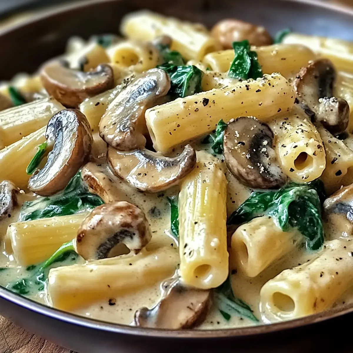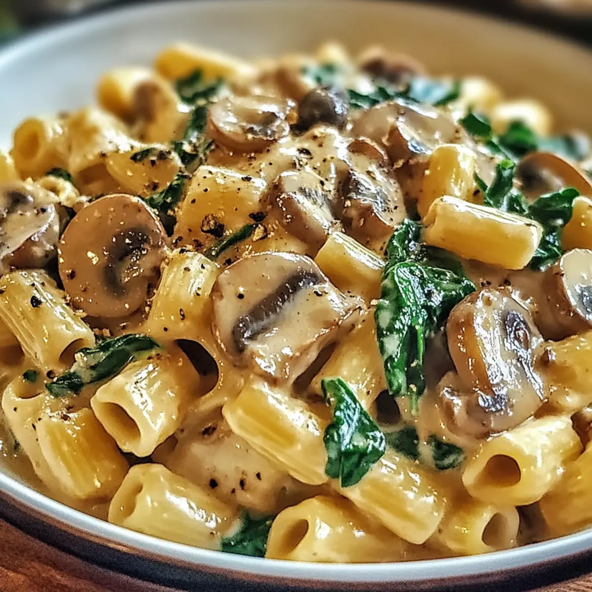 Gib nun den frischen Spinat in die Pfanne und vermische ihn gründlich mit den Champignons. Lasse alles 2-3 Minuten kochen, bis der Spinat zusammenfällt und seine leuchtende Farbe behält. Dies sorgt für einen zusätzlichen Nährstoffschub in deiner cremigen toskanischen Pilz-Pasta-Pfanne.