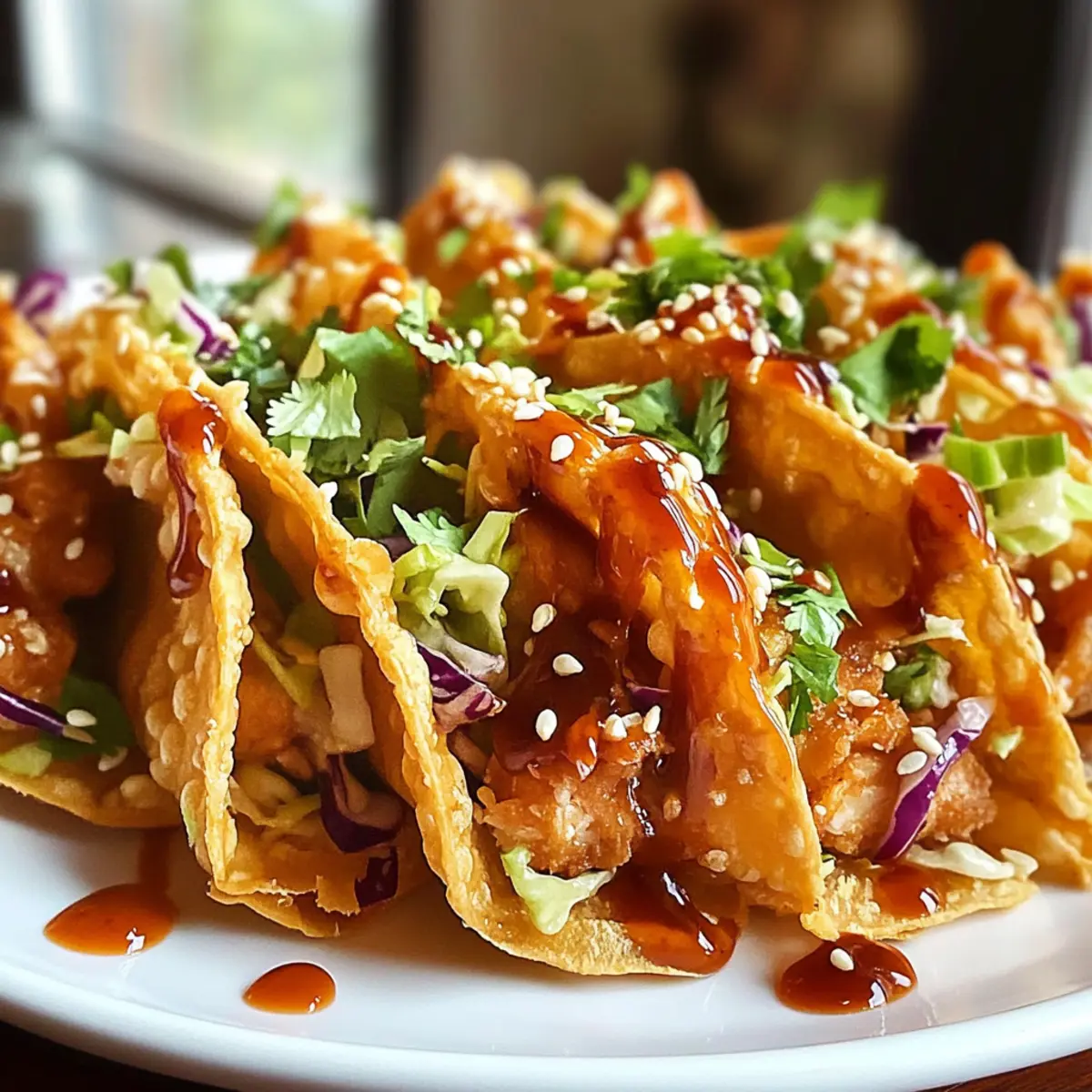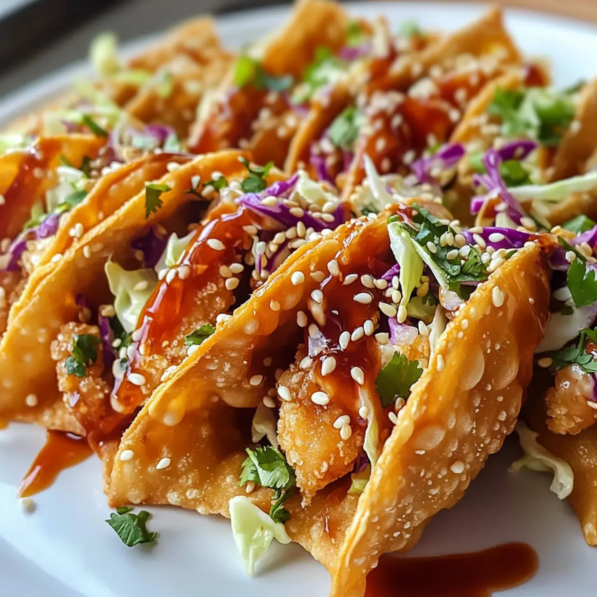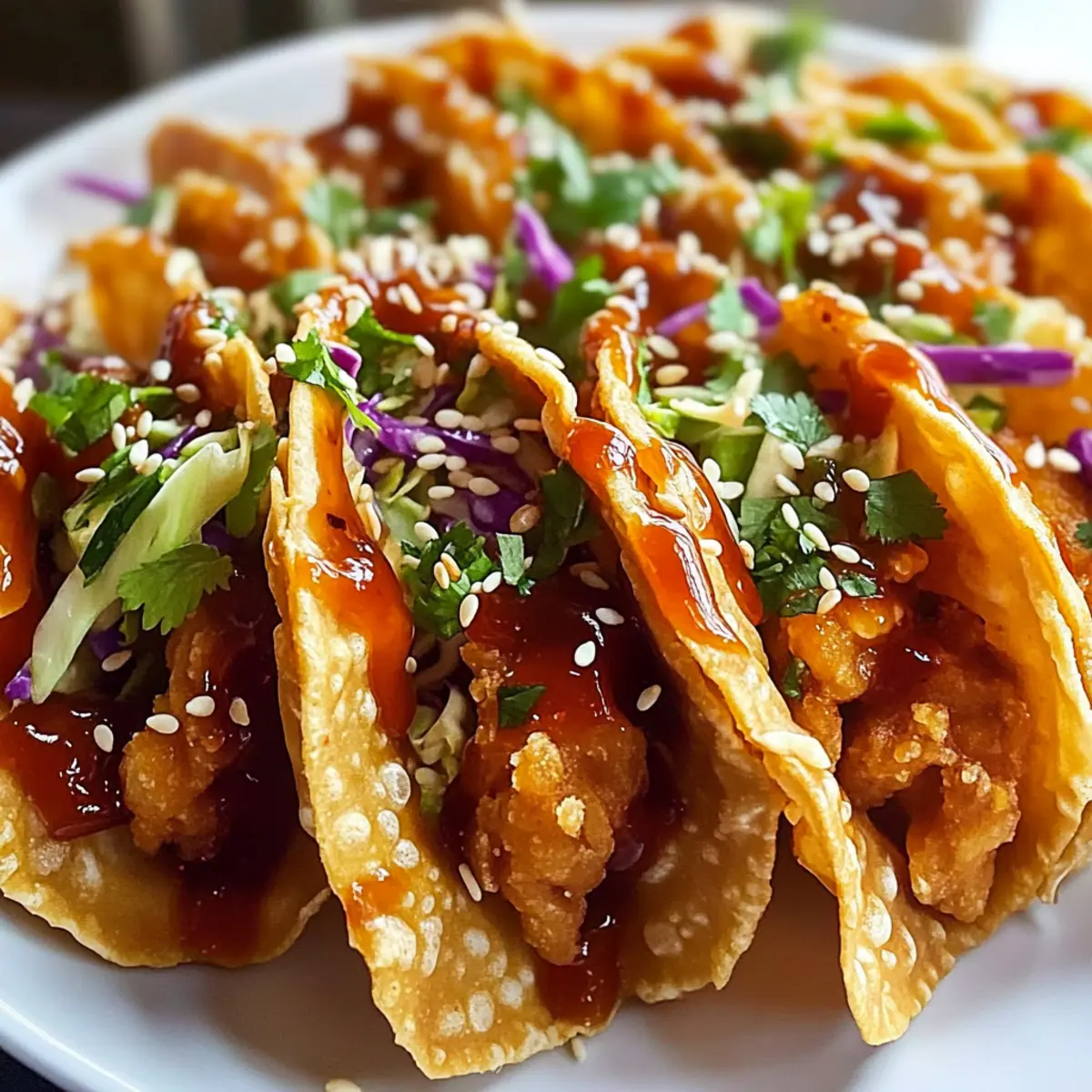In einem kleinen Restaurant in der Stadt entdeckte ich einmal diese köstlichen, knusprigen Chicken Wonton Tacos. Als die ersten Bissen meine Lippen berührten, war ich sofort in die harmonische Verbindung von asiatischen Aromen und mexikanischer Tradition verliebt. Diese Crispy Chicken Wonton Tacos sind nicht nur ein Fest für die Sinne, sondern auch schnell und einfach zubereitet – sie sind ideal für hektische Abende oder bei unerwarteten Gästen. Die knusprigen Wonton-Hüllen umhüllen zarten Teriyaki-Hühnchen und erfrischenden Coleslaw, was ein Gericht ergibt, das sowohl sättigend als auch aufregend ist. Bereit, Ihre Taco-Nacht zu revolutionieren? Tauchen wir ein in diese geschmackvolle Fusion! Warum werden Sie dieses Rezept lieben? Einfachheit in der Zubereitung: Die Schritte sind unkompliziert, sodass auch Anfänger im Kochen schnell ein köstliches Ergebnis erzielen. Vielseitige Füllungen: Sie können die Proteinquelle nach Belieben variieren – ganz gleich, ob Hühnchen, Garnelen, Schweinefleisch oder Tofu! Knusprige Textur: Die Wonton-Hüllen bieten einen perfekten Crunch, der jede Mahlzeit aufregend macht. Frische Aromen: Die Kombination aus Teriyaki-Hühnchen und knusprigem Coleslaw sorgt für ein harmonisches Geschmacksprofil, das alle begeistert. Schnelle Zubereitungszeit: In nur 25 Minuten auf dem Tisch – ideal für geschäftige Abende oder Überraschungsbesuche. Diese Tacos sind nicht nur ein Genuss, sondern auch eine großartige Möglichkeit, um mit der ganzen Familie neue Aromen zu entdecken. Probieren Sie auch einmal das Kunst der Espresso oder das Kinder Bueno Dessert, um Ihre Dessertauswahl zu erweitern! Crispy Chicken Wonton Tacos Zutaten Für die Füllung: Hühnerbrust ohne Knochen und Haut – Stellt die Hauptproteinquelle dar und kann durch Garnelen, Schweinefleisch oder Tofu ersetzt werden. Teriyakisauce – Fügt Süße und Umami-Aromen hinzu; verwenden Sie eine natriumarme Variante für eine leichtere Option. Sesamöl – Verstärkt den Geschmack mit einem nussigen Aroma; bei Nussallergien können Sie Kokosöl verwenden. Sojasauce – Sorgt für Salzigkeit und Tiefe in der Marinade; Tamari kann als glutenfreie Option genutzt werden. Knoblauch (gehackt) – Liefert ein aromatisches Geschmacksprofil. Frischer Ingwer (gerieben) – Gibt eine angenehme Wärme und Würze. Für den Coleslaw: Coleslaw-Mix (Kohl und Karotten) – Bildet die frische, knusprige Füllung; vorgeriebener Coleslaw spart Zeit. Frühlingszwiebeln – Bringt einen frischen Geschmack in den Slaw. Reisessig – Fügt Säure hinzu, um die Aromen im Slaw auszubalancieren. Honig – Verstärkt die Süße im Slaw. Für die Wonton-Hüllen: Wonton-Hüllen – Bilden die knusprige Schale, die die Füllung hält; können auch bei 190°C gebacken werden für eine gesündere Alternative zum Frittieren. Süße Chilisauce – Als Topping sorgt sie für eine Mischung aus Süße und Schärfe. Sesam und gehackter Koriander – Garnierung für zusätzlichen Biss und Frische. Diese Zutaten machen Ihre Crispy Chicken Wonton Tacos zu einem echten Genuss und bieten eine spannende asiatische Fusion in der Küche! Step-by-Step Instructions für Crispy Chicken Wonton Tacos Step 1: Hähnchen marinieren Schneiden Sie die Hähnchenbrust ohne Knochen und Haut in dünne Stücke. Mischen Sie das Hähnchen in einer Schüssel mit Teriyakisauce, ½ Esslöffel Sesamöl, Sojasauce, gehacktem Knoblauch und geriebenem Ingwer. Lassen Sie die Mischung für 10 Minuten ziehen, damit die Aromen gut einziehen können. Step 2: Hähnchen braten Erhitzen Sie eine beschichtete Pfanne auf mittlerer Stufe. Geben Sie das marinierte Hähnchen in einer einzigen Schicht in die heiße Pfanne und braten Sie es für etwa 5-7 Minuten, bis das Hähnchen nicht mehr rosa ist und eine goldene Farbe hat. Rühren Sie gelegentlich um, um ein gleichmäßiges Garergebnis zu erzielen. Step 3: Coleslaw zubereiten In einer Schüssel kombinieren Sie den vorbereiteten Coleslaw-Mix aus Kohl und Karotten mit gehackten Frühlingszwiebeln. Fügen Sie Reisessig, Honig und das verbleibende Sesamöl hinzu. Mischen Sie alles gut durch, bis eine gleichmäßige Mischung entsteht, die die Aromen vereint. Step 4: Wonton-Hüllen frittieren Erhitzen Sie in einer kleinen Pfanne etwa 1,5 cm Öl bei mittlerer Hitze. Frittieren Sie die Wonton-Hüllen für 20-30 Sekunden pro Seite, bis sie leicht golden und knusprig sind. Achten Sie darauf, die Wonton-Hüllen nicht zu lange zu braten, um ein Überbraten zu vermeiden. Step 5: Tacos zusammenstellen Nehmen Sie die knusprigen Wonton-Hüllen und füllen Sie jede mit dem gebratenen Hähnchen und dem zubereiteten Coleslaw. Träufeln Sie etwas süße Chilisauce über die Füllung für zusätzlichen Geschmack und garnieren Sie die Tacos mit Sesam und gehacktem Koriander für die perfekte Präsentation. Expertentipps für Crispy Chicken Wonton Tacos Vorbereitung ist alles: Halten Sie Ihre Wonton-Hüllen unter einem feuchten Papiertuch, während Sie die Füllung zubereiten, um ein Austrocknen zu verhindern. Aromafülle maximieren: Bewahren Sie etwas Teriyakisauce zum Träufeln über das gekochte Hähnchen auf, um den Geschmack der Crispy Chicken Wonton Tacos zu intensivieren. Temperatur prüfen: Überwachen Sie die Öltemperatur beim Frittieren; verwenden Sie einen Holzstäbchen-Test – wenn sofort Blasen auftreten, ist das Öl bereit. Technik für knusprige Hüllen: Vermeiden Sie es, die Wonton-Hüllen zu lange zu frittieren. 20-30 Sekunden pro Seite reichen aus, um sie perfekt knusprig zu machen. Resteverwertung: Lagern Sie Hähnchen und Slaw getrennt in luftdichten Behältern, um die Frische der Crispy Chicken Wonton Tacos zu bewahren, da die Schalen ihre Knusprigkeit verlieren, wenn sie zusammengebaut sind. Vorbereitung der Crispy Chicken Wonton Tacos Crispy Chicken Wonton Tacos sind perfekt für die Vorbereitung, um Ihnen Zeit in der hektischen Woche zu sparen! Sie können das Hähnchen bis zu 24 Stunden im Voraus marinieren und 