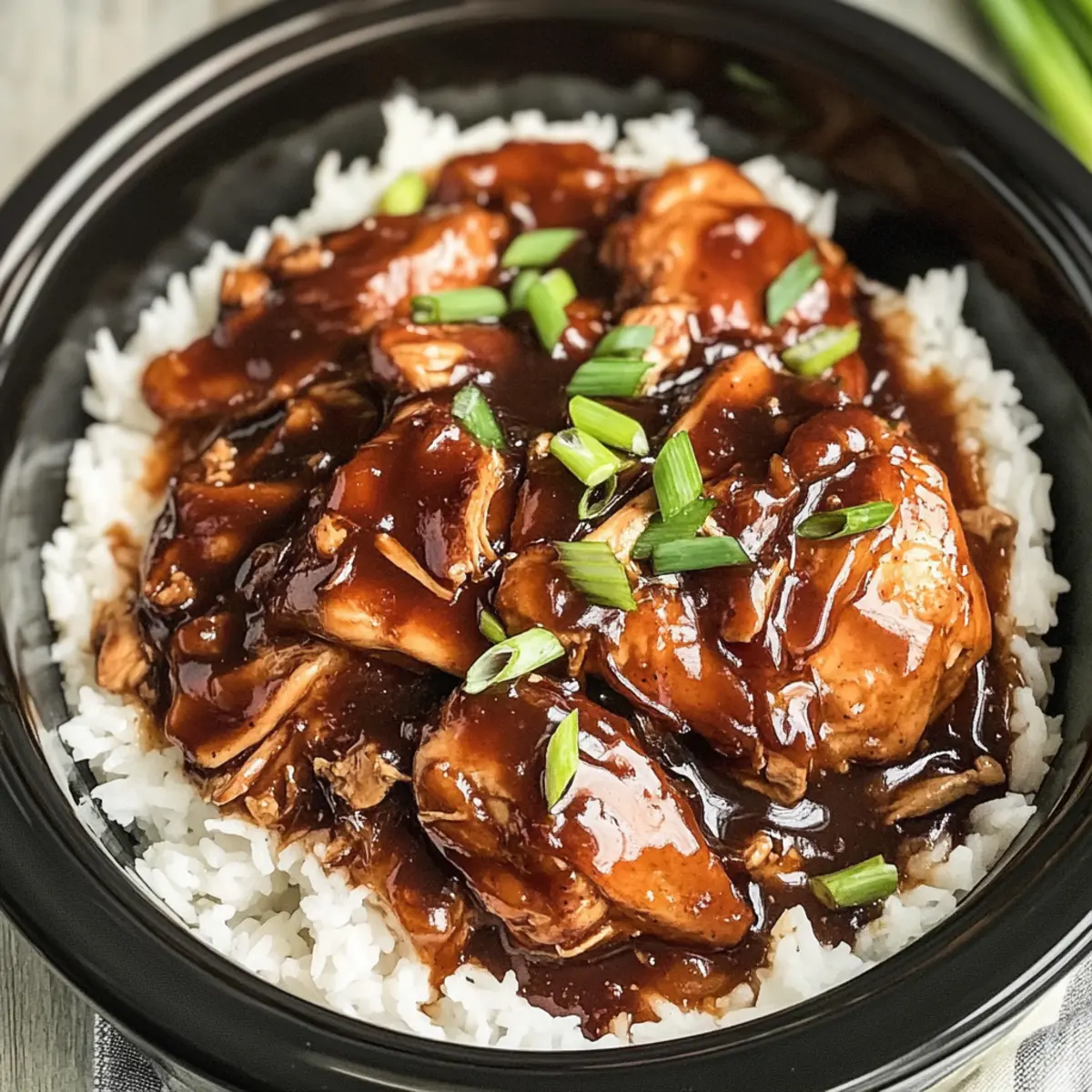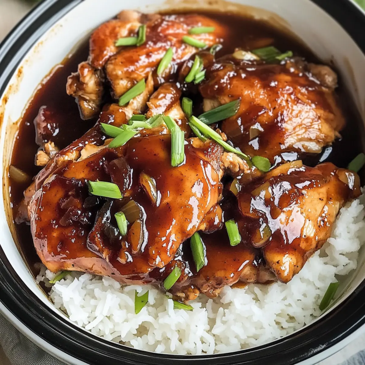 Das Crock Pot Bourbon Hühnchen ist nun fertig zum Servieren! Vor dem Anrichten mit frisch gehackten Frühlingszwiebeln garnieren, um zusätzliche Farbe und Geschmack hinzuzufügen. Serviere das Hähnchen über einem Bett aus kochendem, dampfendem Reis, damit die Soße perfekt aufgenommen wird und wirf einen letzten Blick auf diese herrliche, glänzende Kreation.