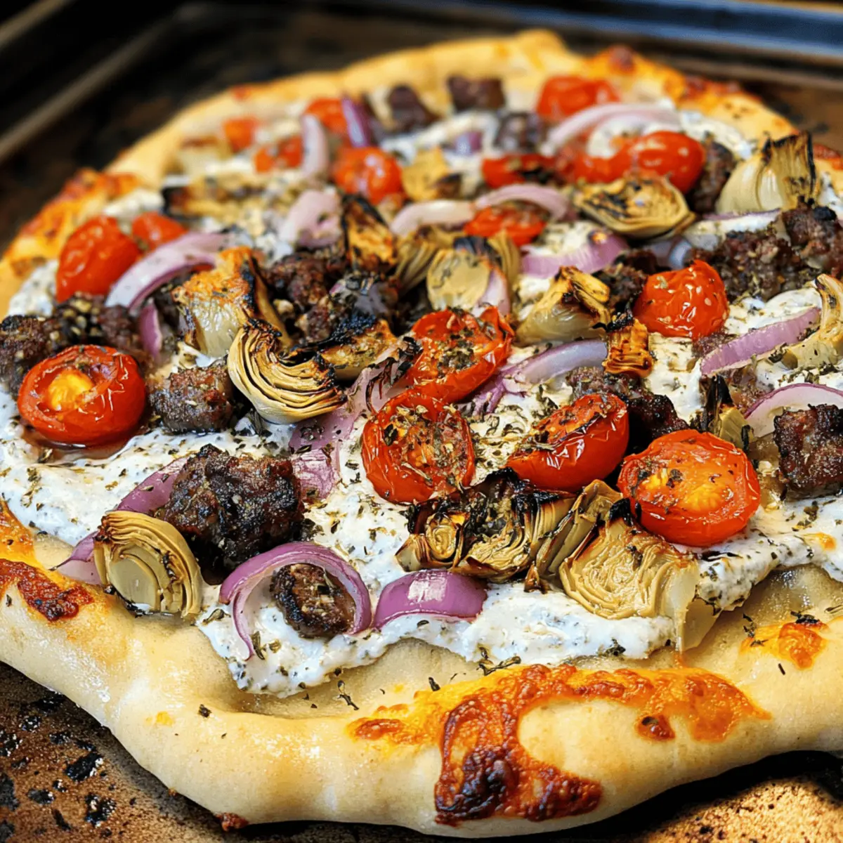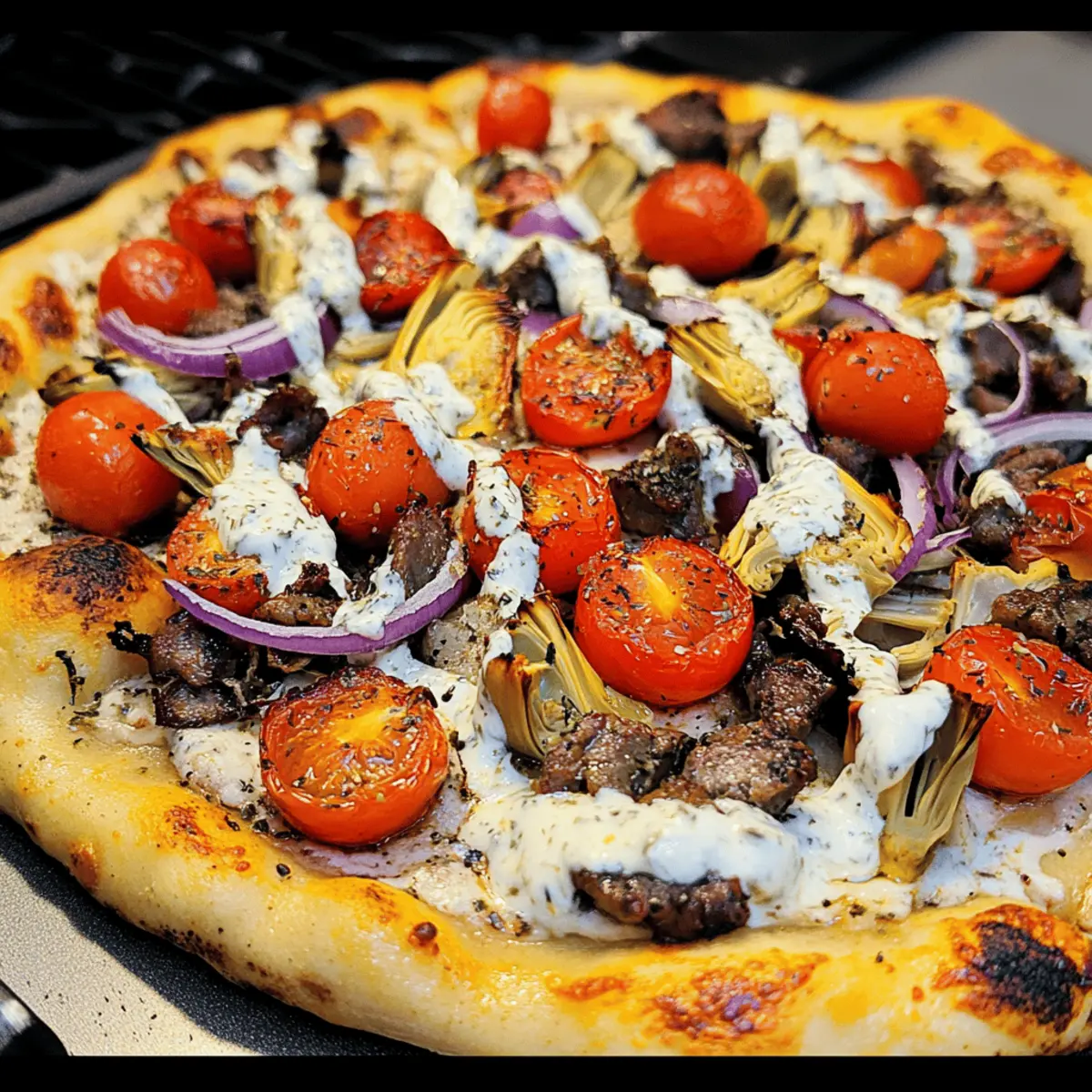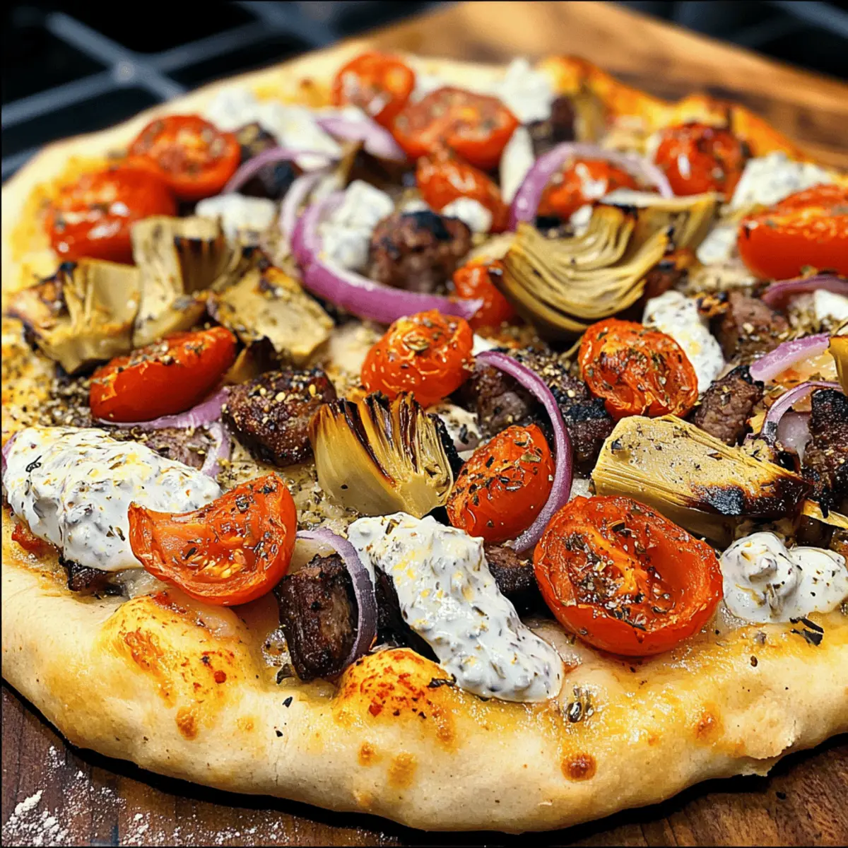Als ich neulich in meiner Küche stand, um eine aufregende neue Pizza-Variante auszuprobieren, hatte ich keine Ahnung, dass ich bald die perfekte Mischung aus griechischen und amerikanischen Aromen entdecken würde. Diese Gyro Pizza mit einem erfrischenden Tzatziki-Topping ist mehr als nur ein einfaches Gericht – sie ist eine Einladung zu einem kulinarischen Abenteuer! Ideal für ein schnelles Abendessen unter der Woche, kombiniert dieses Rezept Schnelligkeit mit einem aufregenden Geschmackserlebnis. Stellen Sie sich die knusprige Kruste vor, die zarte Streifen von Gyro-Fleisch und das Aroma von gerösteten Tomaten und Artischocken vereint. Wenn Sie auf der Suche nach einem Rezept sind, das alle Geschmacksknospen begeistert und leicht zuzubereiten ist, sind Sie hier genau richtig! Was würde Sie davon abhalten, in die Welt dieser köstlichen Fusion einzutauchen? Warum ist diese Pizza so besonders? Einzigartiger Geschmack: Diese Gyro Pizza kombiniert die Aromen Griechenlands mit der beliebten amerikanischen Pizza und bietet somit ein unvergleichliches Geschmackserlebnis. Einfache Zubereitung: Mit nur wenigen Schritten zaubern Sie ein köstliches Gericht, das ideal für stressige Wochentage ist. Vielfältige Anpassungen: Ob mit vegetarischen Toppings oder verschiedenen Käsesorten – Sie können diese Pizza ganz nach Ihrem Geschmack gestalten. Perfekt für Gäste: Diese Pizza ist ein echter Publikumsmagnet und wird Ihre Freunde und Familie begeistern! Kombinieren Sie sie mit einer frischen griechischen Salat für ein vollendetes Mahl. Sie könnten auch für eine geschmackliche Abwechslung den Teig nach dem Rezept für Artisan Pizza Teig ausprobieren! Zeitersparnis: Bereiten Sie den Teig und die Tzatziki-Sauce im Voraus vor, um noch mehr Zeit zu sparen, wenn es darauf ankommt. Genießen Sie diese köstliche Fusion und verwandeln Sie ein einfaches Abendessen in ein besonderes Erlebnis! Gyro Pizza Zutaten Hier sind die Zutaten, die Sie benötigen, um diese köstliche Gyro Pizza zuzubereiten: Für den Teig: Mehl – bildet die Struktur des Pizzateigs; Sie können auch Vollkornmehl für eine gesündere Option verwenden. Schnellwirkende Hefe – ein Treibmittel, das hilft, den Teig schnell aufgehen zu lassen; Instant-Trockenhefe kann als Ersatz verwendet werden. Salz – hebt den Geschmack des Teigs und der Beläge. Warmes Wasser (~43°C) – aktiviert die Hefe; Achten Sie darauf, dass es nicht zu heiß ist, da dies die Hefe abtöten kann. Olivenöl – sorgt für die Fülle im Teig und unterstützt das Bräunen; kann bei Bedarf durch Pflanzenöl ersetzt werden. Für den Tzatziki: Naturjoghurt – bildet die Basis für das Tzatziki und sorgt für Cremigkeit und einen schönen Geschmack; jeder Naturjoghurt ist ein guter Ersatz. Griechische Marinade oder Dressing – intensiviert den Geschmack und verleiht einen mediterranen Touch; alternativ können Sie auch ein Vinaigrette verwenden. Knoblauch (gehackt) – bringt Tiefe und Geschmack ins Tzatziki; frisch ist am besten, aber auch gehackter Knoblauch aus dem Glas ist in Ordnung. Frischer Dill – liefert aromatischen Geschmack für das Tzatziki; Sie können getrockneten Dill verwenden, wenn nötig. Zitronensaft – bringt Frische ins Tzatziki; in der Not kann auch abgefüllter Zitronensaft verwendet werden. Englische Gurke (in Scheiben) – dient als frische Garnierung; jede Gurkensorte funktioniert hier gut. Für die Pizza-Beläge: Gyro-Fleisch (gehackt) – die Hauptproteinquelle; für eine herzhafte Note; alternativ können Sie auch gerupftes Hähnchen oder Lamm verwenden. Rote Zwiebel (in Scheiben) – sorgt für Süße und Crunch; Schalotten sind ebenfalls ein guter Ersatz. Cherrytomaten (in Scheiben) – bringen Frische auf die Pizza; Sie können bei Bedarf auch gewürfelte normale Tomaten verwenden. Rote/orange Paprika (in Scheiben) – verleiht Farbe und Süße; grüne Paprika können als Ersatz dienen. Artischockenherzen (in Scheiben) – tragen einen einzigartigen Geschmack und eine interessante Textur bei; es können auch Dosen- oder Tiefkühl-Artischocken verwendet werden. Portabella-Pilze (gehackt) – sorgen für eine fleischige Textur; können weggelassen oder durch eine andere Pilzart ersetzt werden. Genießen Sie die Zubereitung dieser köstlichen Gyro Pizza mit leckerem Tzatziki und lassen Sie sich von dem besonderen Geschmack verzaubern! Schritt-für-Schritt-Anleitung für Gyro Pizza mit Tzatziki Step 1: Hefe aktivieren Mischen Sie lauwarmes Wasser (ca. 43°C) und die schnellwirkende Hefe in einer Schüssel. Lassen Sie diese Mischung 10 Minuten ruhen, bis sie schaumig wird und Blasen wirft. Dies zeigt an, dass die Hefe aktiv ist und bereit, den Teig aufgehen zu lassen. Step 2: Teig herstellen Geben Sie das Mehl und das Salz in eine große Schüssel. Fügen Sie das Olivenöl und die aktivierte Hefemischung hinzu. Mischen Sie die Zutaten gut, bis sich ein dicker, zusammenhängender Teig bildet. Dies dauert etwa 2-3 Minuten, bis die Zutaten vollständig vermengt sind. Step 3: Teig kneten Kneten Sie den Teig auf einer bemehlten Arbeitsfläche für etwa 10 Minuten, bis er glatt und elastisch ist. Achten Sie darauf, dass Ihr Teig nicht klebrig ist; fügen Sie bei Bedarf etwas mehr Mehl hinzu. Legen Sie den Teig anschließend in eine geölte Schüssel und decken Sie ihn ab, um ihn 1 Stunde aufzugehen, bis er sich verdoppelt hat. Step 4: Zutaten vorbereiten Während der Teig aufgeht, heizen Sie Ihren Ofen mit einem Pizzastein auf 200°C vor. Schneiden Sie die Cherrytomaten und Artischockenherzen in Scheiben und legen Sie sie auf ein Backblech. Beträufeln Sie sie mit Olivenöl und rösten Sie sie 10-15 Minuten, bis sie weich und leicht karamellisiert sind. Step 5: Tzatziki zubereiten In einer Schüssel vermengen Sie den Naturjoghurt, frischen Dill, Zitronensaft und den gehackten Knoblauch. Mischen Sie alle Zutaten gründlich, bis sie gut kombiniert sind. Stellen Sie die Tzatziki-Mischung beiseite in den Kühlschrank, damit sie bis zu