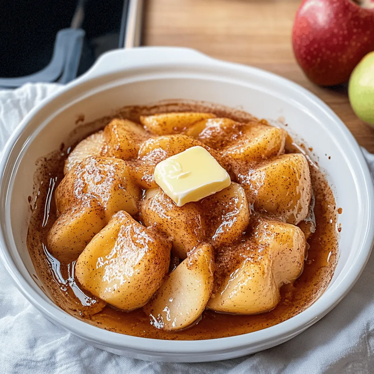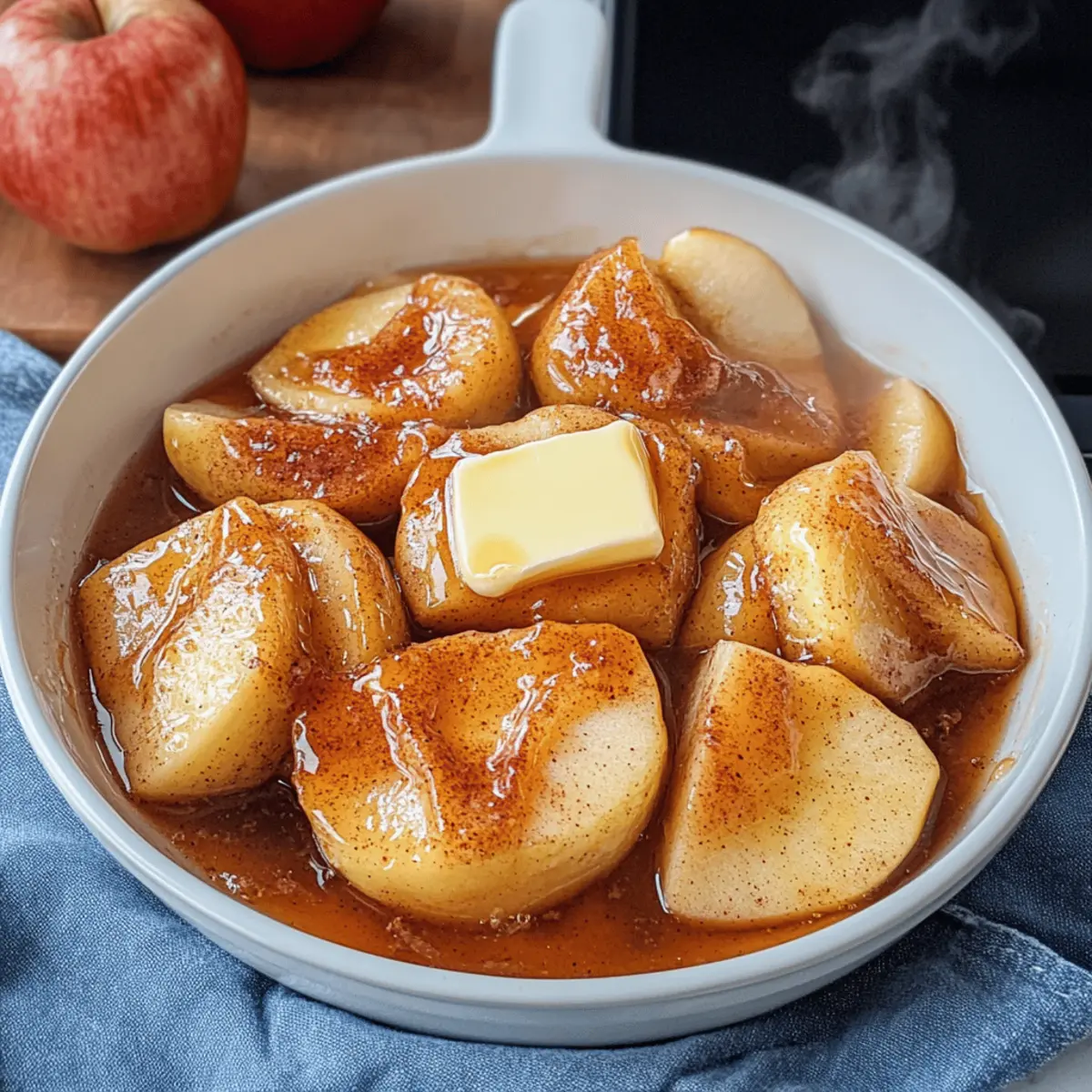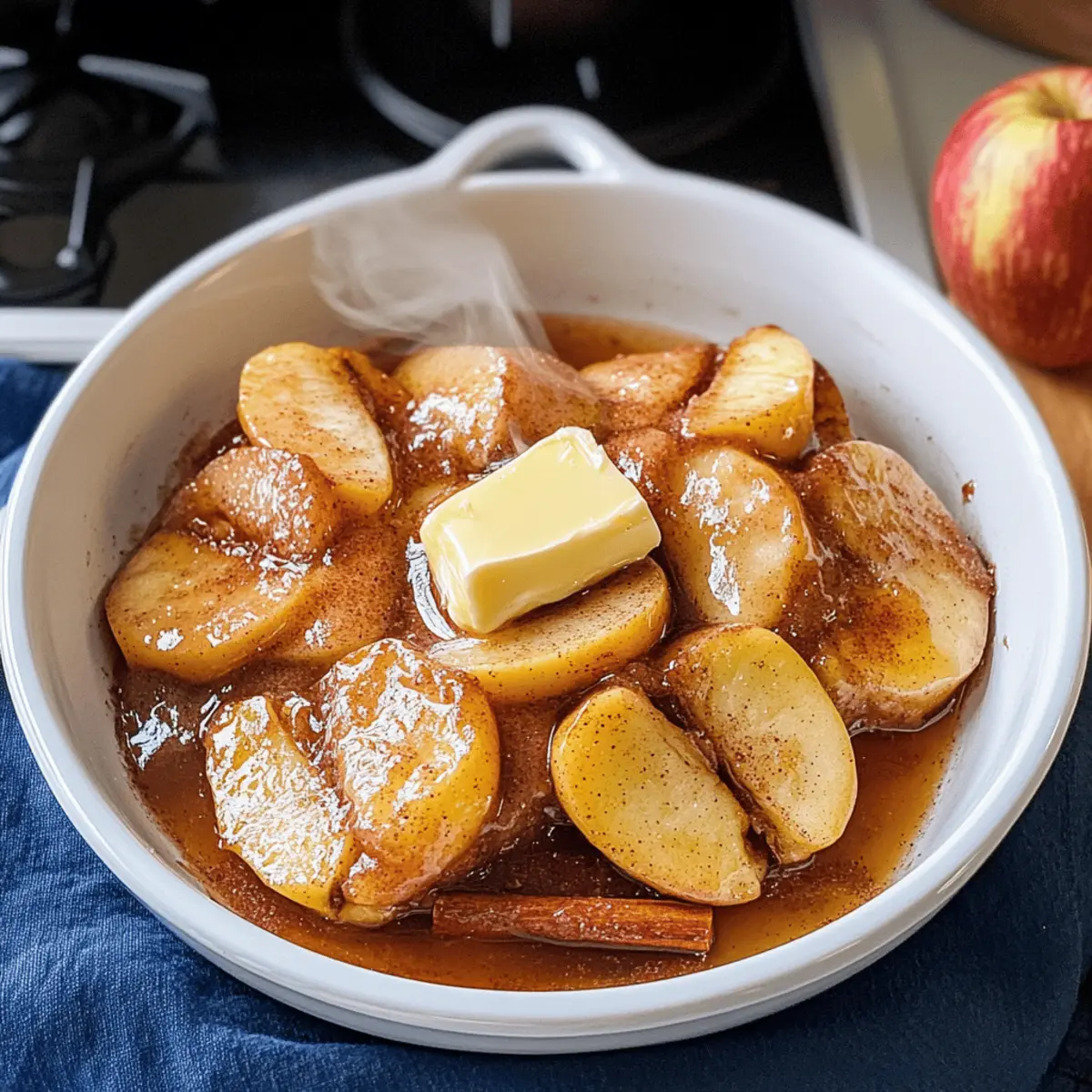 Perfekte Textur: Die warmen, zarten Äpfel werden in einer buttrigen, aromatischen Sauce serviert, die an einen klassischen Apfelkuchen erinnert.