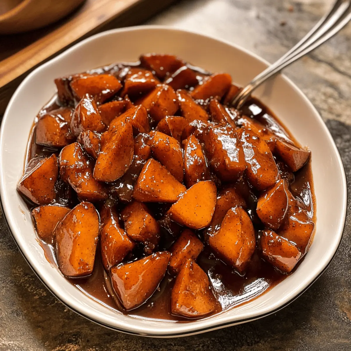 4. Nehme den Topf vom Herd und serviere die kandierten Süßkartoffeln sofort.