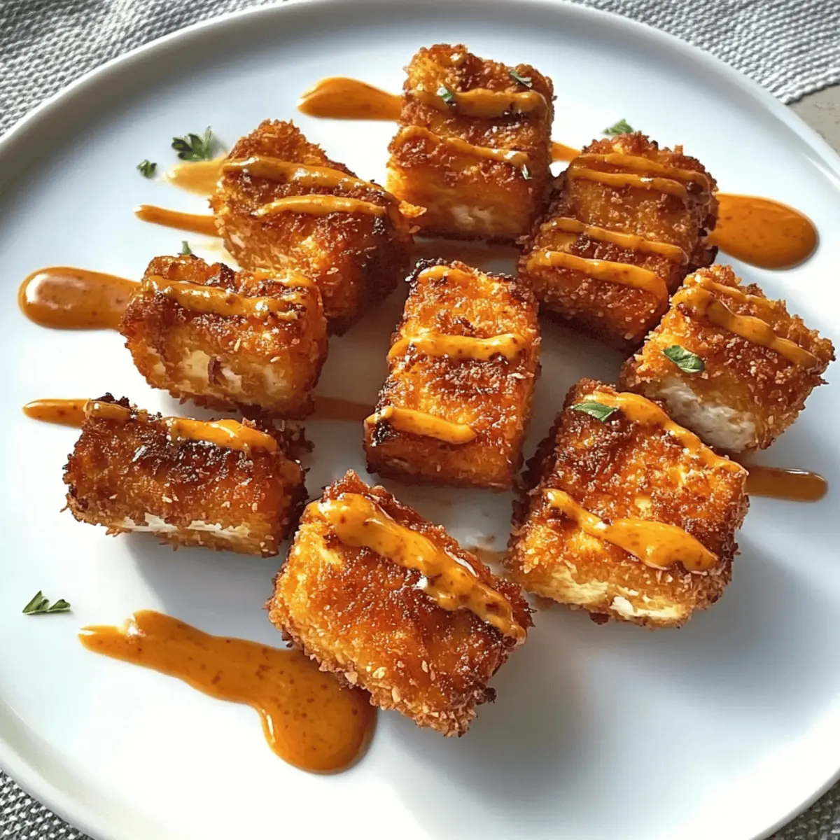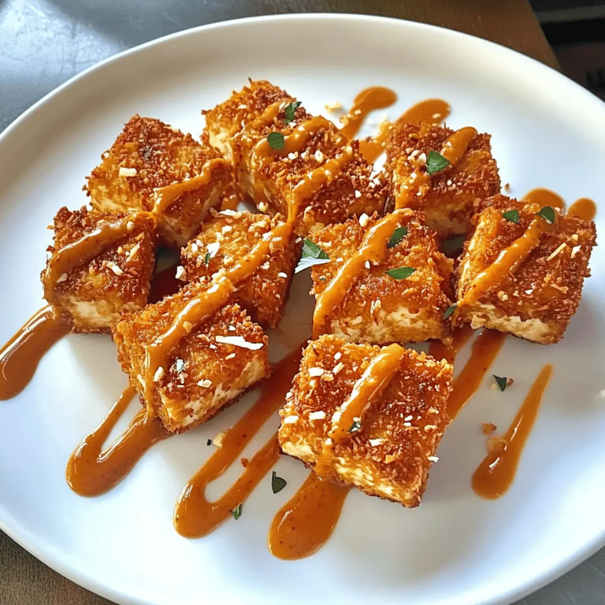 Garnieren den Kokos-Tofu nach Belieben, zum Beispiel mit frischen Kräutern oder Sesam. Serviere ihn sofort, während er noch heiß und knusprig ist. Dieser köstliche Kokos-Tofu mit würziger Sauce ist perfekt als Snack oder Vorspeise und wird sicherlich Eindruck machen.