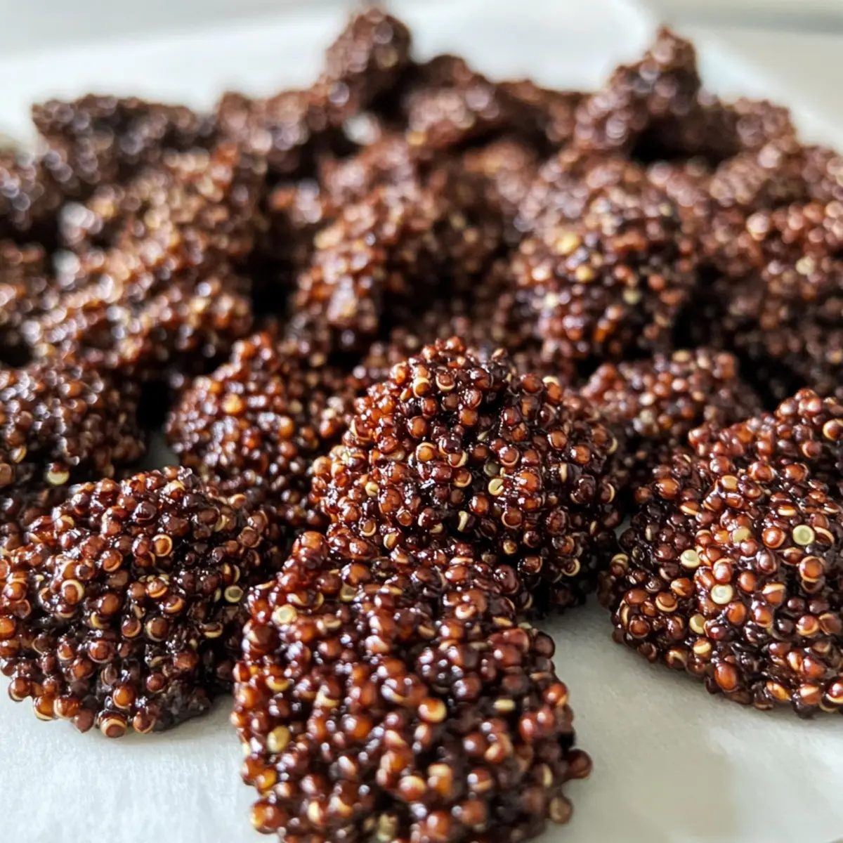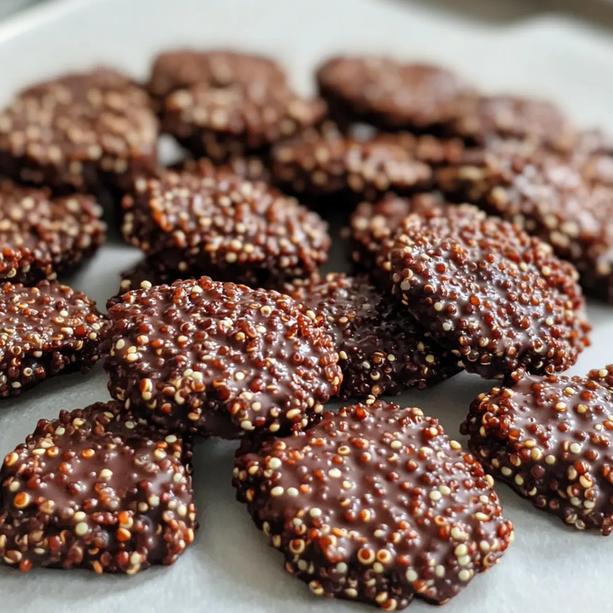Köstliche und gesunde Dunkle Schokoladen-Quinoa-Crisps, perfekt als Snack für alle, die Genuss ohne Schuldgefühle suchen.