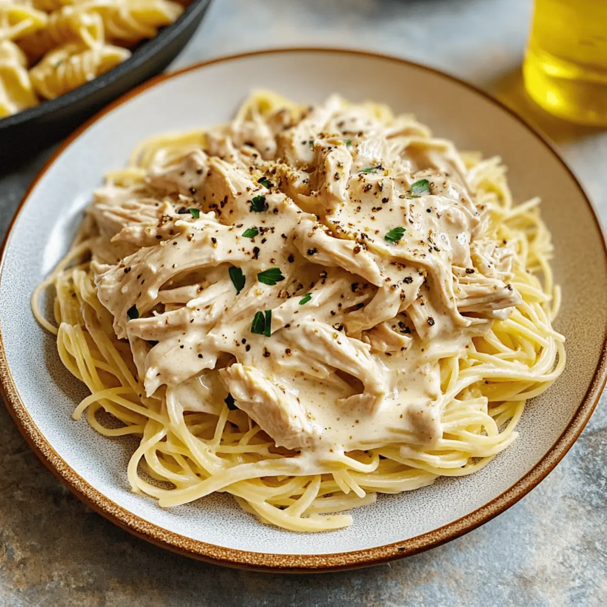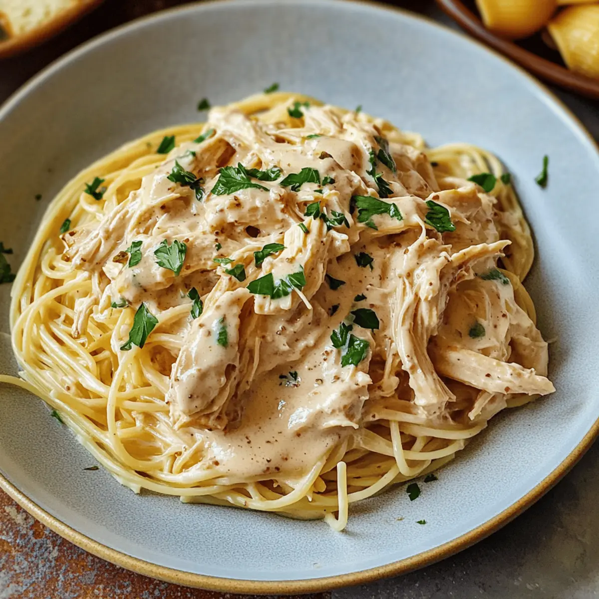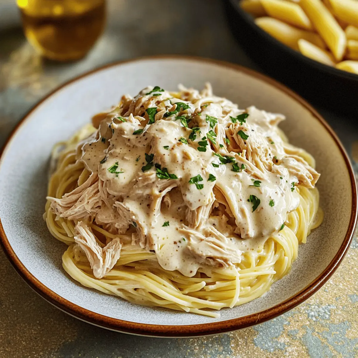 Eines Abends, als ich nach einem langen Tag nach Hause kam, sehnte ich mich nach einem Gericht, das nicht nur sättigend, sondern auch einfach zuzubereiten ist. Die Lösung? Diese einfache Slow Cooker Angel Chicken Pasta mit cremiger Sauce! Die Kombination aus zarten, saftigen Hühnchen und einer köstlichen, aromatischen Sauce sorgt für ein Geschmackserlebnis, das die ganze Familie begeistern wird. Perfekt für hektische Wochentage, erfordert dieses Rezept minimale Vorbereitungszeit und bietet dennoch maximalen Genuss. Stell dir vor, wie du dich nach einem langen Arbeitstag zurücklehnst und über dem zarten Pasta-Bett schwelgst. Bist du bereit, einen neuen Familienliebling zu entdecken? Warum wirst du dieses Rezept lieben? Einfachheit: Das Rezept ist unkompliziert und erfordert keine besonderen Kochkünste. Aromatischer Geschmack: Die Kombination aus frischen Kräutern und cremiger Sauce sorgt für ein Geschmackserlebnis, das sowohl Kinder als auch Erwachsene begeistert. Familienfreundlich: Mit seiner leicht nachvollziehbaren Zubereitung ist dieses Gericht ideal für hektische Wochentage. Vielseitigkeit: Du kannst es einfach anpassen, indem du z.B. Hühnchen durch Pute ersetzt oder Gemüse hinzufügst. Wenn du schon einmal ein köstliches anderes Gericht wie Crack Chicken Gnocchi probiert hast, wirst du diese Pasta lieben! Zutaten für die Angel-Hühnchen-Pasta • Für das Hühnchen 2 lbs Hähnchenbrust ohne Haut – Hauptprotein, das das Gericht herzhaft macht; das Ersetzen durch Thighs sorgt für mehr Geschmack. • Für die cremige Sauce 8 oz Frischkäse, weich – Verleiht der Sauce Cremigkeit; griechischer Joghurt kann für eine leichtere Option verwendet werden. 2 Esslöffel Butter – Verstärkt den Geschmack und die Reichhaltigkeit; kann durch Olivenöl ersetzt werden. 1 Dose (10 oz) Champignoncremesuppe – Bietet eine herzhafte Basis; kann durch hausgemachte Champignonsauce ersetzt werden. 2 Knoblauchzehen, gehackt – Infusion von aromatischem Geschmack; frischer Knoblauch ist bevorzugt für einen stärkeren Geschmack. 1 Tasse Weißwein (Pinot Grigio oder Sauvignon Blanc) – Fügt Tiefe und Säure hinzu; für eine alkoholfreie Version mit Hühnerbrühe ersetzen. ½ Tasse Hühnerbrühe oder Wasser – Befeuchtet die Sauce; Brühe verbessert den Geschmack. 1 Esslöffel italienisches Gewürz – Bringt eine Mischung aus Kräutern für einen authentischen Geschmack; individuelle Kräuter wie Basilikum und Oregano können verwendet werden. ½ Teelöffel Granulierten Knoblauch – Verstärkt den Knoblauchgeschmack; optional, wenn frischer Knoblauch verwendet wird. ½ Teelöffel Salz – Verbessert den Gesamtgeschmack; nach Vorliebe anpassen. • Für die Pasta 10 oz Engelshaar-Pasta, gekocht und abgetropft – Basis für das Gericht; jede Pastasorte kann als Ersatz verwendet werden. • Garnierungen (optional) Schnittlauch – Für eine frische Garnitur; kann durch Petersilie ersetzt werden. Rote Pfefferflocken – Fügt einen Kick hinzu; weglassen für ein milderes Gericht. Diese Zutaten sorgen dafür, dass deine Angel-Hühnchen-Pasta ein unvergessliches Erlebnis wird! Schritt-für-Schritt-Anleitung für einfache Slow Cooker Engel-Hühnchen-Pasta Schritt 1: Slow Cooker vorbereiten Lege die Hähnchenbrust gleichmäßig auf den Boden des Slow Cookers. Achte darauf, dass die Stücke nicht überlappen, damit sie gleichmäßig garen. Dies bildet die Basis für die köstliche Sauce, die du später hinzufügst. Stelle den Slow Cooker auf die niedrige Stufe, während du die Sauce zubereitest. Schritt 2: Die cremige Sauce mischen In einer mittelgroßen Schüssel kombinierst du den weichgerührten Frischkäse, die Butter, die Champignoncremesuppe, den gehackten Knoblauch, den Weißwein, die Hühnerbrühe, das italienische Gewürz, den granulierten Knoblauch und das Salz. Rühre kräftig, bis die Mischung cremig und gut vermengt ist. Diese aromatische Sauce wird dein Hähnchen und die Pasta wunderbar verfeinern. Schritt 3: Im Slow Cooker kombinieren Gieße die cremige Sauce gleichmäßig über die Hähnchenbrust im Slow Cooker. Stelle sicher, dass jedes Stück gut mit der Sauce bedeckt ist. Dies sorgt dafür, dass das Hähnchen während des Garens saftig bleibt und die Aromen der Sauce aufnehmen kann. Daraufhin kannst du den Deckel schließen und das Kochen beginnen. Schritt 4: Kochen Lasse das Hähnchen im Slow Cooker auf niedriger Stufe für etwa 6 Stunden oder bis es zart und durchgegart ist. Du weißt, dass das Hähnchen fertig ist, wenn es leicht mit einer Gabel zerteilt werden kann. Der köstliche Duft von der Engel-Hühnchen-Pasta wird bald dein Zuhause erfüllen. Schritt 5: Pasta vorbereiten Während das Hähnchen kocht, bringe einen großen Topf mit gesalzenem Wasser zum Kochen. Koche die Engelshaar-Pasta gemäß den Anweisungen auf der Verpackung al dente. Nach dem Abgießen sollte die Pasta leicht klebrig sein, aber nicht matschig. Halte die Pasta bereit, bis das Hähnchen fertig ist. Schritt 6: Servieren Sobald das Hähnchen gar ist, verwende zwei Gabeln, um es vorsichtig zu zerteilen und mit der Sauce im Slow Cooker zu vermischen. Füge die gekochte Pasta hinzu und vermenge sie gut, sodass die Engel-Hühnchen-Pasta gleichmäßig mit der cremigen Sauce bedeckt ist. Jetzt ist dein Essen bereit, serviert zu werden! Variationen & Alternativen Lass deiner Kreativität beim Kochen freien Lauf und passe dieses Rezept ganz nach deinem Geschmack an! Vegetarisch: Ersetze das Hühnchen durch Champignons oder Kichererbsen, um eine herzhafte, fleischlose Variante zu erhalten. Dies verleiht dem Gericht einen neuen, interessanten Geschmack. Anderweitige Pasta: Nutze Fettuccine oder Penne, um eine andere Textur und noch mehr Vielfalt auf den Teller zu bringen. Die Wahl der Pasta kann das gesamte Esserlebnis verändern. Zusätzliche Gemüseeinlage: Füge während der letzten Stunde des Kochens saisonale Gemüse wie Erbsen oder Spinat hinzu, um die Nährstoffe zu erhöhen und mehr Farbe ins S
