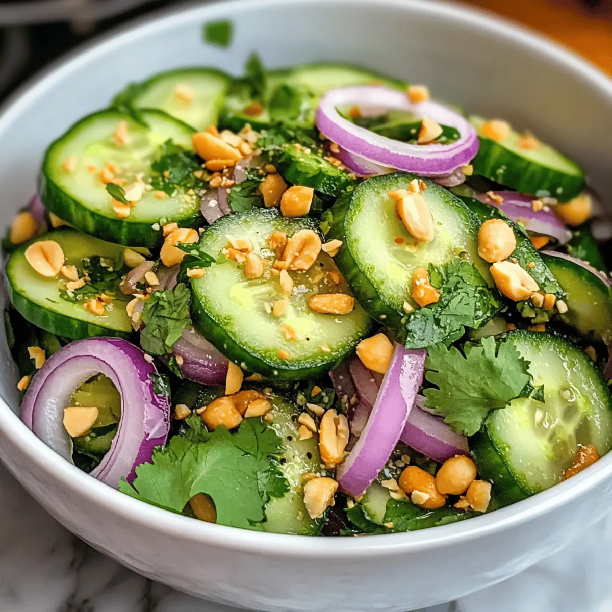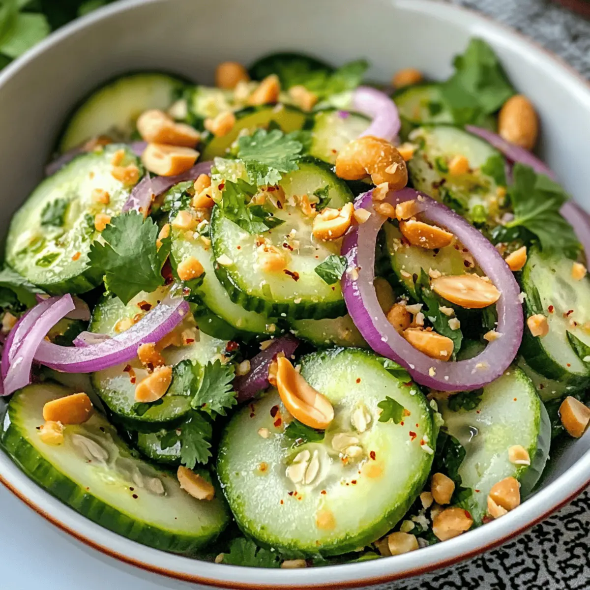 Kürzlich saß ich im Freien und genoss die warmen Sonnenstrahlen, als mir der perfekte Gedanke kam: eine erfrischende Thai Gurkensalat mit knusprigen Erdnüssen! Dieser Salat begeistert nicht nur mit seiner knackigen Textur, sondern auch mit einem herrlichen Mix aus süß-sauren Aromen. Die knackigen persischen Gurken harmonieren wunderbar mit der Spritzigkeit des Reisessigs und dem nussigen Geschmack der zerstoßenen Erdnüsse. Dieses Rezept ist nicht nur schnell zubereitet, sondern auch eine tolle Möglichkeit, frische Zutaten zu nutzen und eine gesunde, vegane Beilage auf den Tisch zu bringen. Stell dir vor, wie dieser Salat jede Grillparty oder jedes sommerliche Essen perfekt ergänzt. Bist du bereit, deinen Gaumen mit einem echten Geschmackserlebnis zu verwöhnen? Warum wird dieser Salat dein neues Lieblingsgericht? Einfachheit: Die Zubereitung ist unkompliziert und benötigt nur grundlegende Kochfähigkeiten. Perfekt für Kochanfänger und Profis! Erfrischender Geschmack: Die Kombination aus knackigen Gurken, süßem Reisessig und nussigen Erdnüssen sorgt für ein Geschmackserlebnis, das die Sinne belebt. Vielseitigkeit: Dieser Salat passt zu zahlreichen Gerichten, wie gegrillten Thai Kokosnuss oder würzigen Currys – ideal für jede Gelegenheit! Gesundheit: Vegan, glutenfrei und kalorienarm – eine perfekte Wahl für gesundheitsbewusste Genießer. Zeitersparnis: In nur wenigen Minuten zubereitet, eignet sich dieser Salat hervorragend für spontane Essensanlässe und Grillpartys. Zutaten für den Thai Gurkensalat • Frisch und knackig! Für die Salatzutaten Persische Gurken – genießen Sie die Süße und Knackigkeit; können durch englische Gurken ersetzt werden oder Garten-Gurken ohne Kerne verwendet werden. Reisessig – verleiht dem Dressing eine angenehme Spritzigkeit; kein Ersatz nötig, aber Apfelessig kann für einen anderen Geschmack verwendet werden. Zucker – balanciert die Säure im Dressing; brauner Zucker kann für einen karamelisierten Geschmack genutzt werden. Rote Zwiebel – fügt eine scharfe Note hinzu; Schalotten sind eine mildere Alternative. Frischer Koriander – verstärkt den Geschmack und bringt Frische; kann weggelassen oder durch Minze ersetzt werden. Zerstoßene Erdnüsse – sorgen für Crunch und Nussigkeit; durch geschnittene Mandeln ersetzen oder für eine nussfreie Version ganz weglassen. Schritt-für-Schritt-Anleitung für Erfrischenden thailändischen Gurkensalat mit Erdnüssen Step 1: Gurken vorbereiten Schneide die persischen Gurken dünn und lege sie in ein Sieb. Streue Salz über die Gurkenscheiben und mische sie gut durch, damit sie gleichmäßig bedeckt sind. Lass die Gurken für 10 Minuten stehen, damit das Salz die Feuchtigkeit entziehen kann. Dies sorgt dafür, dass der erfrischende thailändische Gurkensalat nicht wässrig wird. Step 2: Gurken abtrocknen Nach 10 Minuten benutze ein Papiertuch, um die Gurkenscheiben vorsichtig abzutrocknen. Drücke leicht, um überschüssige Feuchtigkeit zu entfernen. Dies ist wichtig, um eine optimale Konsistenz in deinem Salat zu gewährleisten. Wenn die Gurken trocken sind, platziere sie in einer großen Schüssel für die nächste Zubereitung. Step 3: Dressing zubereiten In einer kleinen Schüssel mischst du den Reisessig mit dem Zucker. Stelle die Schüssel für 30 Sekunden in die Mikrowelle, damit der Zucker vollständig aufgelöst wird. Du kannst auch alles gründlich verrühren, wenn du keine Mikrowelle verwenden möchtest. Das Dressing wird gleichmäßiger und verleiht dem Salat die süß-säuerliche Note. Step 4: Salatzutaten kombinieren Gib die abgetrockneten Gurkenscheiben sowie die dünn geschnittene rote Zwiebel in die große Schüssel. Gieße das vorbereitete Dressing über die Gurken und Zwiebeln. Rühre alles vorsichtig um, damit sich die Aromen gut vermischen. Der erfrischende thailändische Gurkensalat nimmt so die köstlichen Geschmäcker auf. Step 5: Koriander hinzufügen Füge frisch gehackten Koriander zu dem Salat hinzu und mische alles erneut gut durch. Der Koriander bringt zusätzliche Frische und Geschmack in deinen Salat. Lass den Salat nun für mindestens 20 Minuten im Kühlschrank ziehen, damit sich die Aromen entfalten können und du die optimale Frische genießen kannst. Step 6: Mit Erdnüssen garnieren Kurz vor dem Servieren streue die zerstoßenen Erdnüsse über den Salat. Diese sorgen für den nötigen Crunch und eine nussige Note. Achte darauf, die Erdnüsse erst kurz vor dem Servieren hinzuzufügen, um ihre Knusprigkeit zu bewahren. Dein erfrischender thailändischer Gurkensalat mit Erdnüssen ist nun bereit, serviert zu werden! Was passt zu Erfrischendem thailändischem Gurkensalat mit Erdnüssen? Dieser frische Salat bringt so viele herzliche Aromen mit sich und kann wunderbar mit verschiedenen Gerichten kombiniert werden. Gegrilltes Hähnchen-Satay: Die zarten Fleischspieße ergänzen die knackige Frische des Salats perfekt und bieten eine ausgewogene Mahlzeit. Das rauchige Aroma des Satays harmoniert mit der Spritzigkeit des Salats. Würzige Currys: Der Salat ist ein erfrischender Kontrapunkt zu scharfen Currys und hilft, die Hitze der Gewürze zu mildern. Seine knackige Textur und süß-säuerlicher Geschmack bieten eine großartige Balance. Banh Mi Sandwiches: Als Topping auf knusprigem Baguette bringt der Salat eine knackige Frische, die die würzige Füllung des Sandwiches aufwertet. Die Kombination macht das Banh Mi noch schmackhafter. Sommerliche Grillpartys: Ideal für Grillbuffets, da er leicht und erfrischend ist. Der Salat kann einfach vorbereitet und als Beilage zu gegrilltem Gemüse oder Fleisch serviert werden. Tropische Fruchtsäfte: Ein kühles Glas Ananas- oder Mango-Saft rundet die Mahlzeit ab und verstärkt die süßen Aromen des Salats. Diese Getränke bringen eine zusätzliche Erfrischung. Knusprige Frühlingsrollen: Diese Beilage bringt eine wunderbare Texturvielfalt in die Mahlzeit. Die heiße, knusprige Füllung wird durch die fris