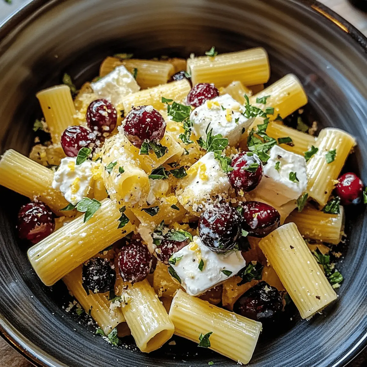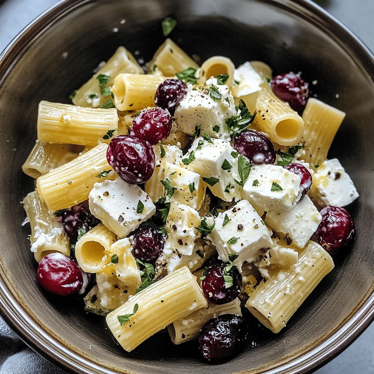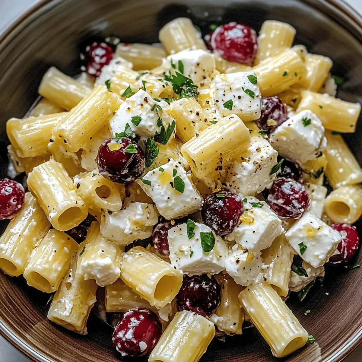 Ein erfrischender Feta und Cranberry Rigatoni Salat mit einer leckeren Zitronen-Vinaigrette, ideal für leichtes Mittagessen.