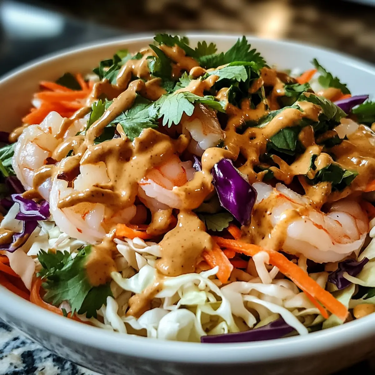 Das vorbereitete Erdnussdressing gleichmäßig über den Salat träufeln und alles vorsichtig vermengen, sodass jedes Gemüse und jede Garnele gut mariniert ist. Vermeiden Sie kräftiges Mischen, um die zarten Zutaten nicht zu zerdrücken. Dieser Schritt sollte etwa 2 Minuten in Anspruch nehmen, sodass der Salat frisch und knackig bleibt.