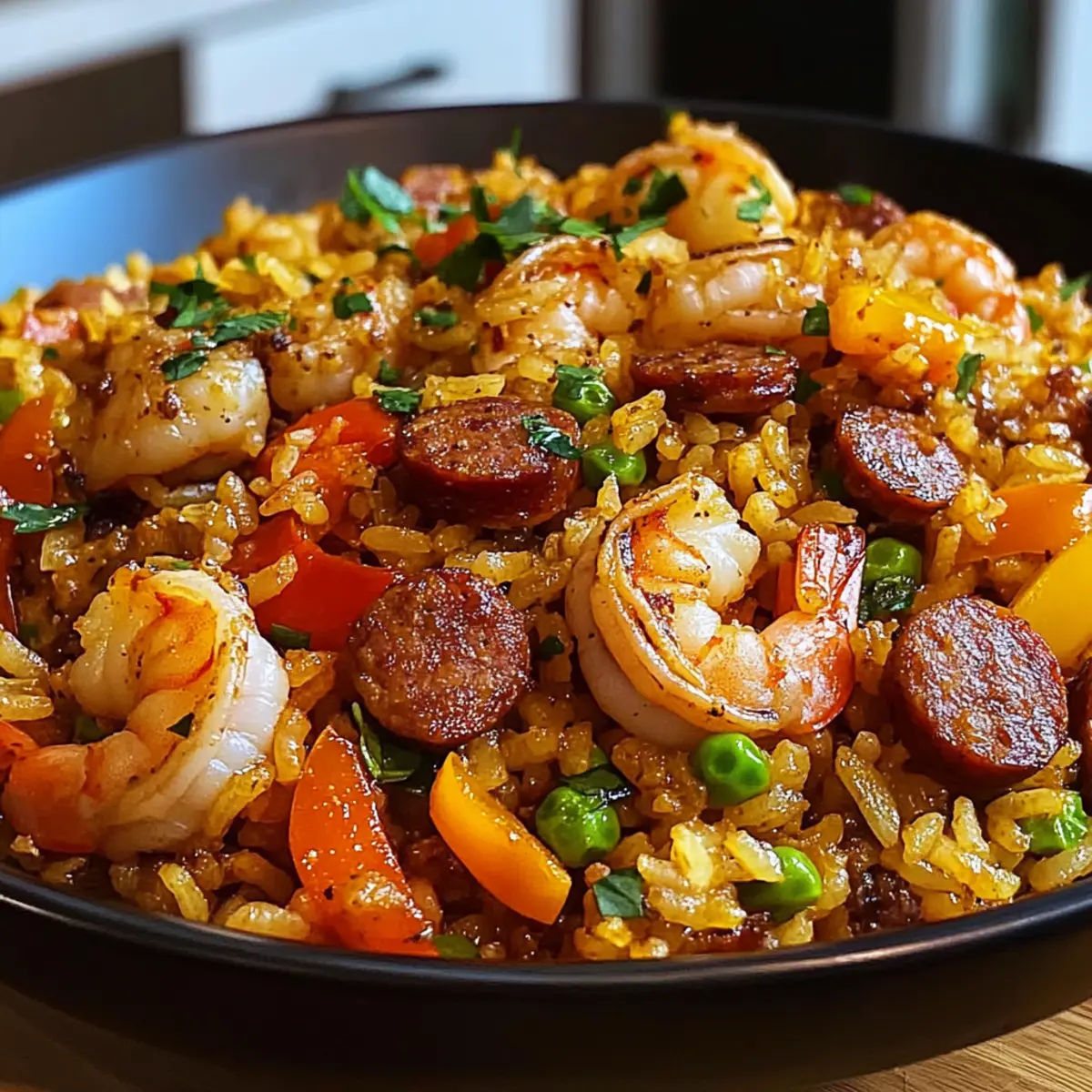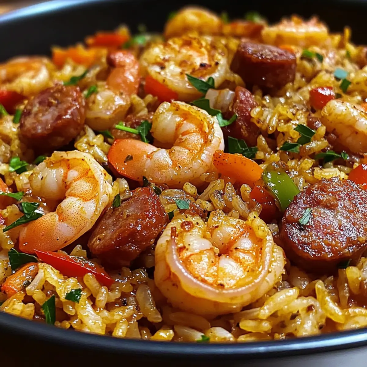 Die Gewürze in der Luft waren so einladend, dass ich nicht widerstehen konnte, einen Blick in die Küche zu werfen. Dort wartete ein köstliches Gericht auf mich: Garnelenwurst Dirty Rice. Diese verführerische Mischung aus saftigen Garnelen, würziger Wurst und zartem Reis ist nicht nur ein Fest für die Sinne, sondern auch ein beliebter Klassiker der südlichen Küche. Die Zubereitung ist kinderleicht und erfordert nur einen einzigen Topf, was bedeutet, dass das Aufräumen nach dem Kochen ein Kinderspiel ist. Ob für ein entspanntes Familienessen oder eine fröhliche Zusammenkunft mit Freunden – diese schmackhafte Speise wird garantiert alle begeistern. Bereit, mehr über diese herzhafte Delikatesse zu erfahren? Lass uns zusammen in die Welt des Garnelenwurst Dirty Rice eintauchen! Warum ist Garnelenwurst Dirty Rice so besonders? Einfachheit: Die Zubereitung ist unkompliziert und benötigt nur einen Topf. Das macht es ideal für Kochanfänger und vielbeschäftigte Menschen. Unvergleichlicher Geschmack: Die Kombination aus saftigen Garnelen und gewürzter Wurst sorgt für eine Geschmacksexplosion in jedem Bissen. Vielseitig: Du kannst kreativ sein, indem du weitere Gemüse wie Erbsen oder Mais hinzufügst, der Fantasie sind keine Grenzen gesetzt! Perfekt für jede Gelegenheit: Ob gemütliches Familienessen oder Feier mit Freunden, dieses Gericht zieht alle in seinen Bann. Schnell und bequem: In weniger als 30 Minuten auf dem Tisch, sparst du Zeit und hast mehr Gelegenheit zum Genießen. Schau dir auch unser Rezept für Avocado Toast Rezept an, wenn du nach weiteren schnellen und leckeren Ideen suchst! Garnelenwurst Dirty Rice Zutaten Hinweis: Dieses Rezept für Garnelenwurst Dirty Rice ist nicht nur köstlich, sondern auch einfach zuzubereiten! Für den Reis Langkornreis – bildete die perfekte Grundlage für unser Gericht; brauner Reis kann für zusätzliche Nährstoffe verwendet werden. Für die Proteinquelle Garnelen (geschält und entdarmt) – sorgen für einen frischen, saftigen Geschmack; gefrorene Garnelen können problemlos verwendet werden; vorher auftauen. Räucherwurst (in Scheiben geschnitten) – liefert eine köstliche, rauchige Note; für eine leichtere Variante kann Hähnchenwurst genutzt werden. Für das Gemüse Paprika (gehackt) – bringt Farbe und zusätzliche Aromen ins Spiel; jede Farbe der Paprika ist geeignet. Zwiebel (gehackt) – fügt Süße und Tiefe hinzu; Schalotten können für einen milderen Geschmack genutzt werden. Knoblauch (gehackt) – verbessert das gesamte Geschmacksprofil; frischer Knoblauch ist ideal. Für die Würze Hühnerbrühe (mit wenig Natrium) – dient als Flüssigkeit für den Reis und verleiht zusätzliche Aromen; Gemüsebrühe ist eine gute vegane Option. Cajun-Gewürzmischung – sorgt für die charakteristische Schärfe; die Menge kann nach persönlichem Geschmack angepasst werden. Olivenöl – perfekt zum Anbraten der Zutaten; jede andere Kochöl-Variante kann ebenfalls verwendet werden. Für die Garnitur Frühlingszwiebeln (gehackt) – bringen einen frischen Abschluss; sind optional, aber sehr empfehlenswert! Schritt-für-Schritt-Anleitung für Garnelenwurst Dirty Rice Schritt 1: Zutaten vorbereiten Schneide die Paprika und die Zwiebel in kleine Stücke. Achte darauf, die Garnelen vorher aufzutauen, falls du gefrorene verwendest. Lege alle Zutaten bereit, damit du sie während des Kochens schnell und einfach verwenden kannst. Schritt 2: Aromaten anbraten Erhitze in einer großen Pfanne bei mittlerer Hitze etwas Olivenöl. Füge die gehackte Zwiebel und die Paprika hinzu und brate sie etwa 5-7 Minuten lang an, bis sie weich sind und duftend. Lass die Mischung regelmäßig umrühren, damit sie gleichmäßig gart. Schritt 3: Wurst anbraten Gib die in Scheiben geschnittene Räucherwurst in die Pfanne und brate sie weitere 5 Minuten, bis sie schön gebräunt ist. Dies sorgt dafür, dass die Aromen der Wurst in die anderen Zutaten übergehen, und verleiht deinem Garnelenwurst Dirty Rice einen köstlichen Geschmack. Schritt 4: Knoblauch und Gewürze hinzufügen Rühre den gehackten Knoblauch und die Cajun-Gewürzmischung unter die angebratenen Zutaten und brate alles für etwa 1-2 Minuten an. Achte darauf, dass der Knoblauch nicht verbrennt, damit der Geschmack nicht bitter wird. Du solltest jetzt eine köstliche, würzige Aromatik in der Luft haben. Schritt 5: Reis und Brühe integrieren Füge den Langkornreis in die Pfanne hinzu und rühre gut um, damit der Reis die Aromen aufnimmt. Gieße dann die Hühnerbrühe dazu und bringe die Mischung zum Kochen. Lass alles auf hoher Temperatur sprudeln, bis es anfängt zu kochen, bevor du die Hitze reduzierst. Schritt 6: Garnelen und köcheln lassen Gib die aufgetauten Garnelen in die Pfanne, rühre alles gut durch und decke die Pfanne ab. Lasse alles bei schwacher Hitze etwa 20 Minuten köcheln, bis der Reis gar ist und die Flüssigkeit aufgenommen wurde. Rühre gelegentlich um und achte darauf, dass der Reis nicht anbrennt. Schritt 7: Servieren und garnieren Lockere den Reis vorsichtig mit einer Gabel auf und garniere das Gericht mit frisch gehackten Frühlingszwiebeln. Serviere dein Garnelenwurst Dirty Rice heiß und genieße die köstlichen Aromen dieses südlichen Klassikers. Was passt gut zu Garnelenwurst Dirty Rice? Die Kombination von Aromen in diesem Gericht kann durch köstliche Beilagen noch verstärkt werden! Frischer Feldsalat: Mit einem leichten Dressing verleiht dieser Salat einen knackigen Kontrast zur herzhaften Würze des Reises. Knoblauchbrot: Dieses knusprige Brot ist perfekt, um jede köstliche Soße aufzutunken und ergänzt die Aromen des Garnelenwurst Dirty Rice wunderbar. Ratatouille: Das reichhaltige, gedünstete Gemüse bringt zusätzliche Frische und Farbe auf den Teller und harmoniert hervorragend mit den intensiven Gewürzen. Zitronige Limonade: Ein erfrischendes Getränk, das die Würze des Gerichts wunderbar balanciert und einen spritzigen Frischekick gibt. S