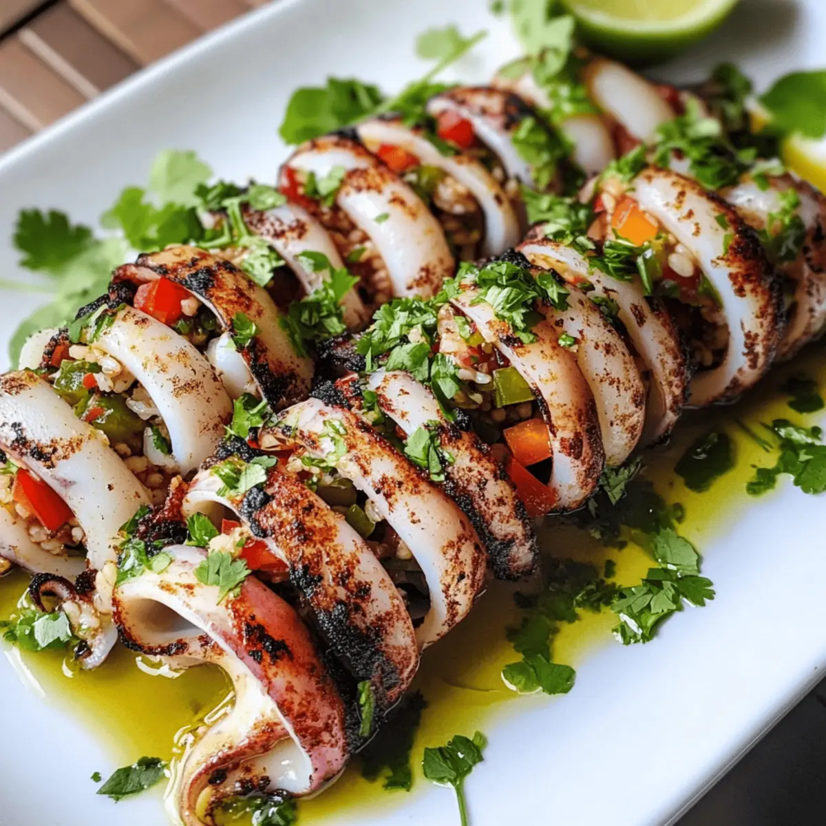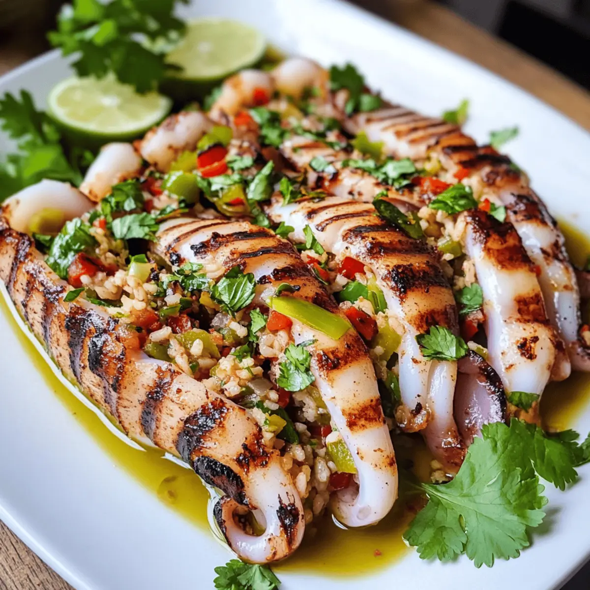 Entdecken Sie die köstliche Kombination aus gegrilltem Tintenfisch und würziger Reisfüllung in diesem einfachen Rezept.