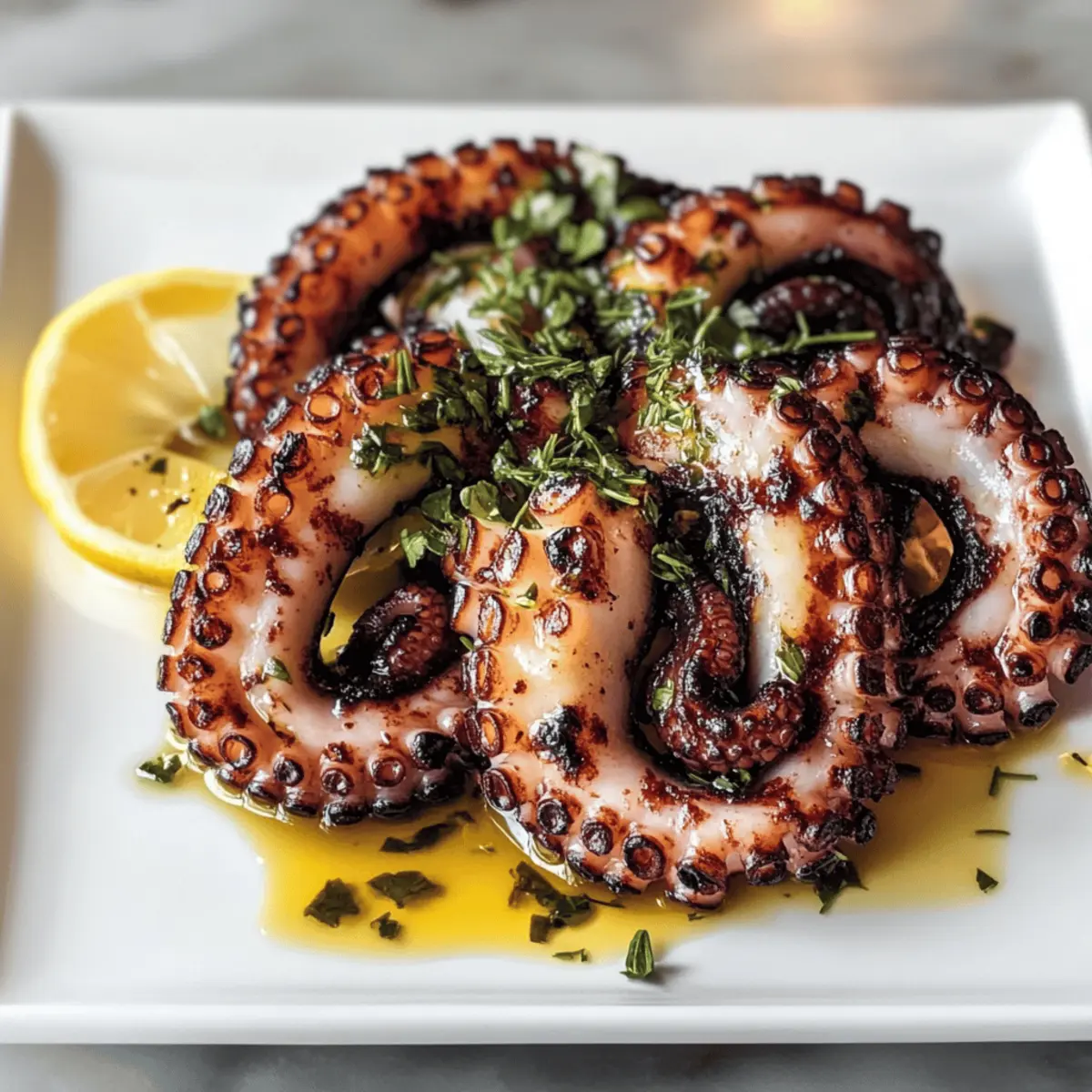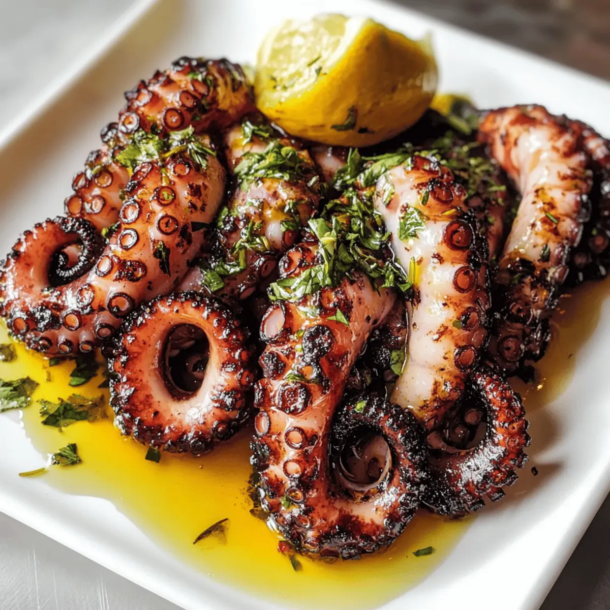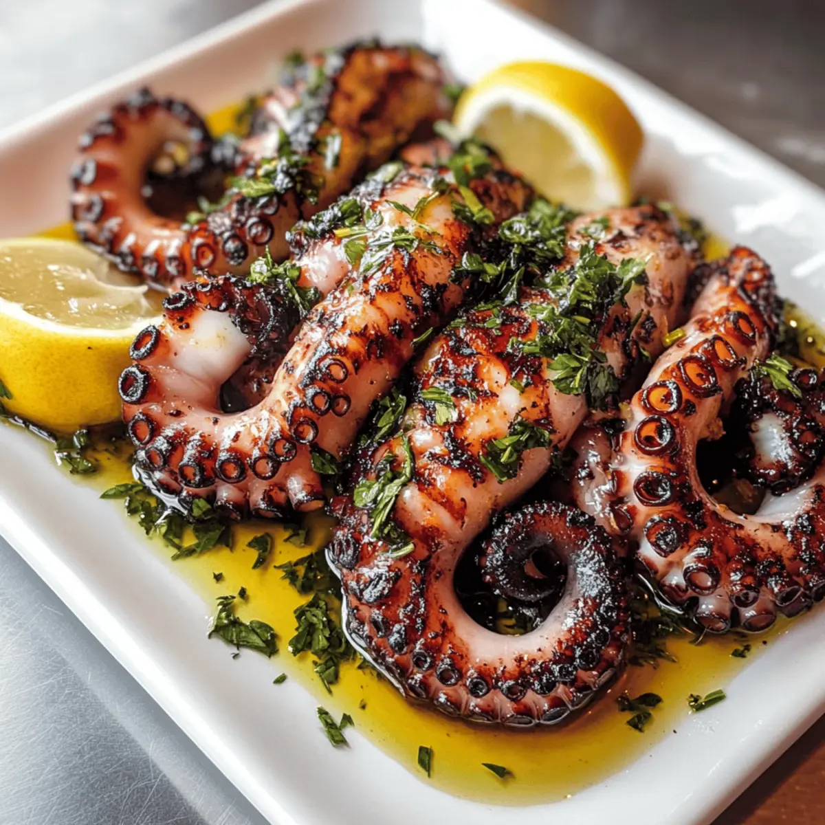 Stell dir vor, du sitzt an einem sonnigen Strand in Griechenland, während der Duft gegrillten Oktopus in der Luft liegt. Diese mediterrane Spezialität wird nicht nur von Feinschmeckern geschätzt, sondern hat auch für jeden zu Hause etwas zu bieten – besonders wenn man sich nach einer gesunden, eiweißreichen Mahlzeit sehnt. Mein Rezept für „Mediterranean Grilled Octopus with Herb Marinade“ vereint die Aromen von frischem Oktopus mit einer köstlichen Marinade aus Knoblauch, Zitrone und Oregano. Sie ist nicht nur einfach zuzubereiten, sondern auch ein wahrer Publikumsmagnet für Dinnerpartys. Dieses Gericht ist perfekt, um den Alltag hinter sich zu lassen und sich in die sonnigen Küstenregionen des Mittelmeers zu träumen. Bereit für eine kulinarische Reise? Lass uns loslegen! Warum solltest du Oktopus grillen? Einzigartiger Geschmack: Gegrillter Oktopus bringt den unvergleichlichen Geschmack des Mittelmeers direkt auf deinen Tisch. Leicht zuzubereiten: Mit wenigen Schritten verwandelst du frischen Oktopus in ein kulinarisches Meisterwerk. Vielseitig: Serviere ihn als Vorspeise oder Hauptgericht, ideal für festliche Anlässe oder ein einfaches Abendessen. Gesunde Wahl: Reich an Eiweiß und fettarm – perfekt für eine gesunde Ernährung. Zuschauerliebling: Dieses Gericht wird deine Gäste beeindrucken und Gespräche anregen. Probiere auch meine anderen Rezepte wie Gegrillte Hähnchen Brokkoli oder Salsa Verde Pepper für weitere gesunde und schmackhafte Optionen! Zutaten für Gegrillten Oktopus • Entdecke, wie einfach es ist, köstlichen gegrillten Oktopus zuzubereiten! Für den Oktopus Oktopus – Das Hauptbestandteil, das für Geschmack und Textur sorgt; verwende frischen oder gefrorenen, der gut gereinigt und zart gemacht ist. Für die Marinade Olivenöl (1/4 Tasse) – Bringt reichhaltigen Geschmack und hilft beim Grillen; du kannst auch Avocadoöl als Alternative verwenden. Knoblauch (2 Zehen) – Verleiht dem Gericht ein intensives Aroma; entweder fein gehackt für einen kräftigen Geschmack oder ganz für etwas Milderes. Getrockneter Oregano (1 Teelöffel) – Dieser typische mediterrane Kräuter fügt eine aromatische Note hinzu; kann durch Thymian oder Basilikum ersetzt werden, falls notwendig. Zitrone – Sorgt für die nötige Frische und Säure im Gericht; verwende sowohl Saft als auch Zest. Eine Limette kann auch als Alternative genutzt werden. Salz und Pfeffer – Verfeinert den Geschmack; nach persönlichem Geschmack verwenden. Viel Spaß beim Ausprobieren dieses einfachen und schmackhaften Rezepts für gegrillten Oktopus! Schritt-für-Schritt-Anleitung für Gegrillten Oktopus Schritt 1: Oktopus reinigen und zart machen Spüle den Oktopus unter kaltem Wasser gründlich ab und entferne dann den Schnabel, die Augen und die Innereien. Um die Zartheit zu gewährleisten, koche ihn entweder 30–40 Minuten lang in einem großen Topf mit sprudelndem Wasser oder massiere ihn für 5–10 Minuten mit grobem Salz, bis er weich wird. Schritt 2: Marinade vorbereiten In einer kleinen Schüssel verrühre das Olivenöl, die fein gehackten Knoblauchzehen, den Zitronensaft, den getrockneten Oregano sowie eine Prise Salz und Pfeffer. Die Marinade sollte gut vermischt sein, damit sich die Aromen entfalten können. Dieser Schritt ist entscheidend für den Geschmack des gegrillten Oktopus, also achte darauf, alles gut zu kombinieren. Schritt 3: Oktopus marinieren Lege den gereinigten Oktopus in eine flache Schale und gieße die Marinade gleichmäßig über ihn. Achte darauf, dass der Oktopus vollständig bedeckt ist, damit er die Aromen aufnehmen kann. Decke die Schale ab und stelle sie für mindestens 1 Stunde, idealerweise über Nacht, in den Kühlschrank, damit der Oktopus schön durchziehen kann. Schritt 4: Grill vorheizen Heize den Grill auf mittelhohe Hitze vor, etwa 200 °C (400 °F). Stelle sicher, dass der Grill gut aufgeheizt ist, bevor du den Oktopus darauf legst. Ein vorgeheizter Grill sorgt für eine sehenswerte Grillmarkierung und die perfekte Textur. Schritt 5: Oktopus grillen Nimm den marinierten Oktopus aus der Schüssel und lasse überschüssige Marinade abtropfen. Lege den Oktopus vorsichtig auf den Grill und grille ihn 15–20 Minuten pro Seite. Achte darauf, dass der Oktopus schöne Grillmarkierungen hat und zart ist, wenn du ihn an diesen Punkten stichst, um die Garheit zu prüfen. Schritt 6: Ruhen und servieren Lass den gegrillten Oktopus einige Minuten ruhen, nachdem du ihn vom Grill genommen hast. Dies ermöglicht es den Säften, sich zu setzen und die Konsistenz zu verbessern. Schneide den Oktopus in mundgerechte Stücke und serviere ihn warm, eventuell mit etwas frischer Zitrone und einer Beilage von deinem Lieblingsgemüse oder Salat. Lagerungstipps für Gegrillten Oktopus Raumtemperatur: Serviere den Oktopus frisch zubereitet; bei Zimmertemperatur sollte er nicht länger als 2 Stunden stehen bleiben, um Qualität und Sicherheit zu gewährleisten. Kühlschrank: Lagere Reste in einem luftdichten Behälter bis zu 2 Tage im Kühlschrank. Achte darauf, das Gericht gut abzudecken, um die Aromen zu bewahren. Gefrierer: Gegrillten Oktopus kann man bis zu 3 Monate im Gefrierschrank aufbewahren. Wickele ihn fest in Klarsichtfolie und lege ihn dann in einen luftdichten Behälter oder Gefrierbeutel. Aufwärmen: Um die Zartheit zu erhalten, erwärme den Oktopus langsam in der Mikrowelle oder bei schwacher Hitze in einer Pfanne. Vermeide starkes Kochen, um ein Austrocknen zu verhindern. Vorbereitung für Gegrillten Oktopus: So gelingt die Planung für die Woche! Gegrillter Oktopus eignet sich hervorragend für die Vorbereitung deiner Mahlzeiten und kann bis zu 24 Stunden im Voraus mariniert werden, was dir wertvolle Zeit am Tag des Grillens spart. Bereite die Marinade einfach in einer Schüssel zu und lege den gereinigten Oktopus hinein, bevor du ihn im Kühlschrank lagerst – so können die Aromen intensiv einziehen. Denke daran, ihn in einem luftdichten Behält