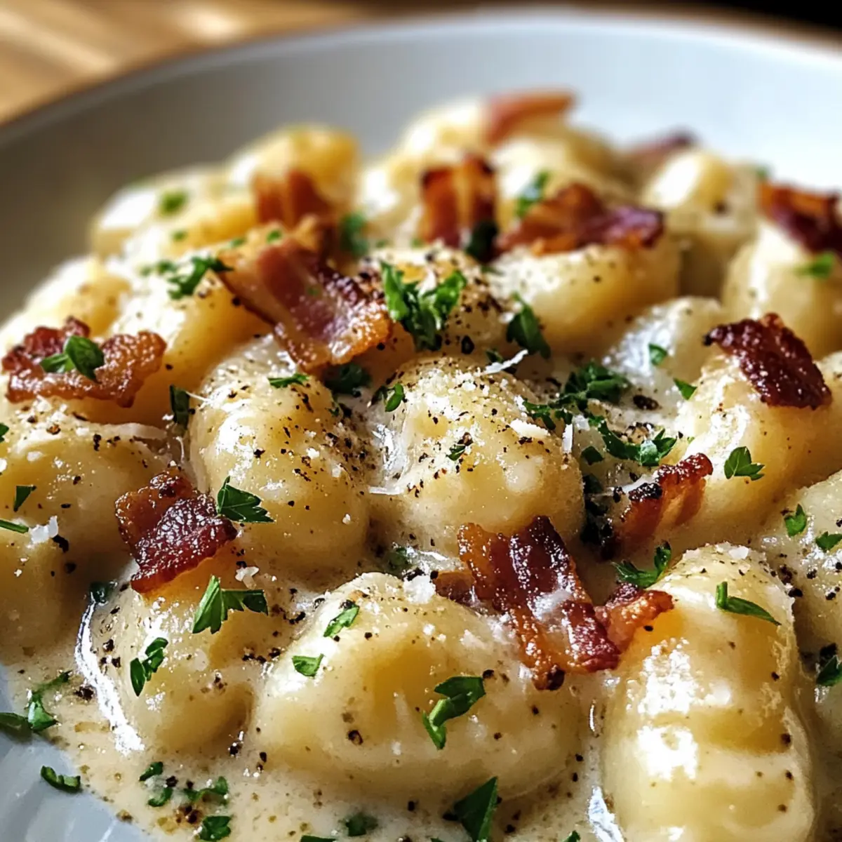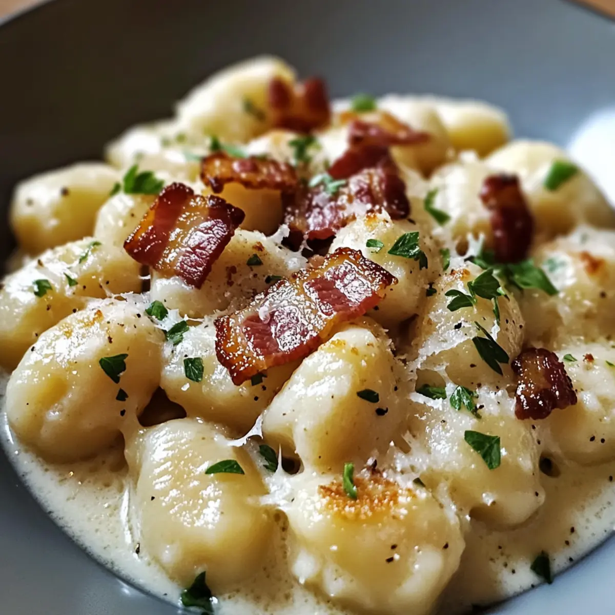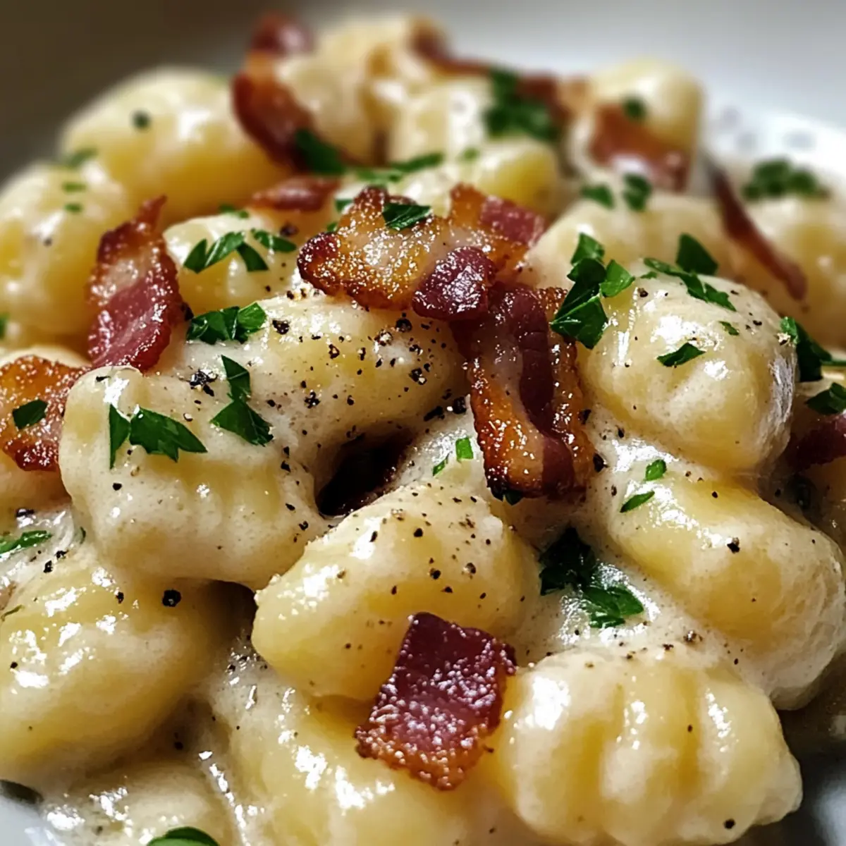 Ein delikater Duft von knusprigem Bacon breitet sich in der Küche aus und verwandelt den Raum in eine einladende Wohlfühloase. Mein Lieblingsrezept für Gnocchi Carbonara mit Bacon und Parmesan ist genau das, was man nach einem langen Tag braucht – ein echtes Comfort Food, das in weniger als 30 Minuten zubereitet werden kann. Diese köstliche Kombination aus fluffigen Kartoffelgnocchi in einer cremigen Sauce spricht sowohl erfahrene Köche als auch Anfänger an und wird garantiert die ganze Familie begeistern. Zudem lässt sich das Rezept wunderbar an verschiedene Vorlieben anpassen – ob mit leichterem Putenbacon oder sogar einer vegetarischen Variante. Wer kann da schon widerstehen? Das wird heute Abend auf jeden Fall ein Hit! Seid ihr bereit, den Kochlöffel zu schwingen? Warum ist Gnocchi Carbonara so beliebt? Einfachheit: Dieses Rezept lässt sich mühelos und schnell zubereiten – in weniger als 30 Minuten kommt ihr an euer köstliches Abendessen. Vielseitigkeit: Ob mit zartem Putenbacon oder als vegetarische Variante mit Pilzen, es gibt zahlreiche Anpassungsmöglichkeiten. Cremiger Genuss: Die Kombination aus fluffigen Gnocchi und einer gehaltvollen, cremigen Sauce sorgt für ein wahres Geschmackserlebnis. Familienfreundlich: Kinder und Erwachsene werden gleichermaßen begeistert sein – es ist das ideale Gericht für ein unkompliziertes Familienessen. Hochwertige Zutaten: Mit frischen Eiern und echtem Parmesan ist jede Portion ein Fest für die Sinne. Für weitere Anregungen schaut euch auch meine Zweimal Gebackene Beladene an! Gnocchi Carbonara Zutaten • Perfekt für schnelles Kochen! Für die Gnocchi Kartoffelgnocchi – Sie sind die Grundlage des Gerichts; wählt zwischen hausgemachten oder gekauften für mehr Komfort. Für die Sauce Eier – Sie sind unerlässlich für die cremige Konsistenz der Sauce; frische Eier liefern die besten Ergebnisse. Parmesankäse – Verleiht der Sauce nussige und salzige Tiefe; könnt ihr durch Pecorino Romano ersetzen, wenn ihr es schärfer mögt. Knoblauch – Verstärkt den Geschmack des Gerichts; frischer Knoblauch ist für optimalen Geschmack bevorzugt. Olivenöl (oder Butter) – Wird zum Braten des Bacons verwendet und fügt Reichtum hinzu. Für den Bacon Bacon – Sorgt für würzigen Geschmack und knusprige Textur; kann durch Pancetta oder Putenbacon für leichtere Optionen ersetzt werden. Für die Garnitur Frische Petersilie, gehackt – Fügt Farbe und Frische hinzu; kann durch Basilikum oder Schnittlauch ersetzt werden. Salz – Zum Würzen; hebt die Aromen des Gerichts hervor. Schwarzer Pfeffer – Fügt eine Prise Wärme und Würze hinzu. Schritt-für-Schritt-Anleitung für Gnocchi Carbonara Step 1: Gnocchi kochen Füllt einen großen Topf mit gesalzenem Wasser und bringt es zum Kochen. Fügt die Kartoffelgnocchi hinzu und kocht sie, bis sie an die Oberfläche steigen, was etwa 2 bis 3 Minuten dauert. Achtet darauf, sie nicht zu lange zu kochen, da sie sonst matschig werden. Sobald sie flott schwimmen, nehmt sie mit einer Schaumkelle heraus und lasst sie abtropfen. Step 2: Bacon braten Erhitzt etwas Olivenöl in einer großen Pfanne bei mittlerer Hitze. Gebt den gewürfelten Bacon hinein und bratet ihn für 5 bis 7 Minuten, bis er knusprig ist. Die goldbraune Farbe ist ein Zeichen dafür, dass der Bacon gut ist. Fügt den gehackten Knoblauch hinzu und bratet alles für eine weitere Minute, bis der Knoblauch duftet, aber nicht verbrennt. Step 3: Sauce vorbereiten In einer separaten Schüssel verquirlt ihr die Eier mit dem geriebenen Parmesan, bis alles gut vermischt ist. Dieser Schritt ist entscheidend für die cremige Sauce der Gnocchi Carbonara. Stellt sicher, dass ihr frische Zutaten verwendet, um den besten Geschmack zu erzielen. Haltet die Mischung bereit, während die restlichen Schritte vorbereitet werden. Step 4: Gnocchi kombinieren Wenn der Bacon knusprig ist, gebt die abgetropften Gnocchi in die Pfanne mit dem Bacon und dem Knoblauch. Nehmt die Pfanne von der Hitze, um ein Überkochen der Eier in der nächsten Phase zu verhindern. Mischt alles gut durch, sodass die Gnocchi mit dem aromatischen Bacon umhüllt sind. Step 5: Sauce erstellen Während sich alles in der Pfanne befindet, gießt die Eier- und Käse-Mischung über die Gnocchi. Rührt schnell um, sodass die Eier durch die Wärme der Gnocchi cremig werden, ohne zu stocken. Würzt die Mischung mit Salz und frisch gemahlenem schwarzen Pfeffer, um den Geschmack abzurunden. Step 6: Servieren Verteilt die Gnocchi Carbonara auf Teller und garniert sie mit frisch gehackter Petersilie sowie zusätzlichem Parmesan. Wenn ihr die zusätzlichen Aromen mögt, könnt ihr auch einen Spritzer schwarzer Pfeffer darüber streuen. Serviert die Gnocchi warm und genießt diese köstliche, cremige Wohlfühlmahlzeit mit der ganzen Familie! Expertentipps für Gnocchi Carbonara Eier nicht überhitzen: Achtet darauf, die Pfanne vor dem Hinzufügen der Eimischung vom Herd zu nehmen, um das Rührei zu vermeiden. Glatt vermischen: Verwendet einen Schneebesen, um die Eier und den Käse zu vermengen, für eine gleichmäßige und cremige Sauce. Gnocchi richtig kochen: Lasst die Gnocchi nicht zu lange im Wasser, denn sie sollen nur kochen, bis sie an die Oberfläche steigen. Variationen bedenken: Für variantenreiche Gnocchi Carbonara, probiert Putenbacon oder sautierte Pilze als leckere Alternativen. Reste richtig lagern: Bewahrt übriggebliebene Gnocchi in einem luftdichten Behälter im Kühlschrank auf, um die Frische zu erhalten. Gnocchi Carbonara: Vorbereitungen für stressfreies Kochen Gnocchi Carbonara ist perfekt für die Vorbereitung im Voraus! Ihr könnt die Kartoffelgnocchi und den Bacon bis zu 24 Stunden im Voraus zubereiten und separat aufbewahren, um die Qualität zu erhalten. Kocht die Gnocchi nach Anweisung und bratet den Bacon, bis er knusprig ist. Lagert beides in luftdichten Behältern im Kühlschrank. Die Eier- und Käsemischung kann bis zu 3 Tage im Voraus verquirlt und