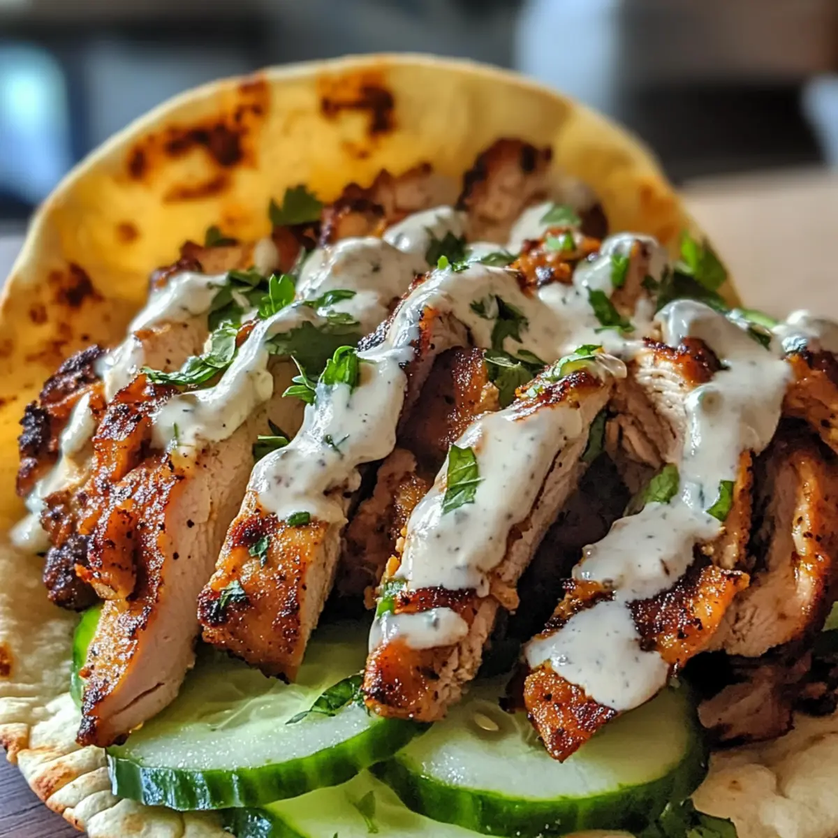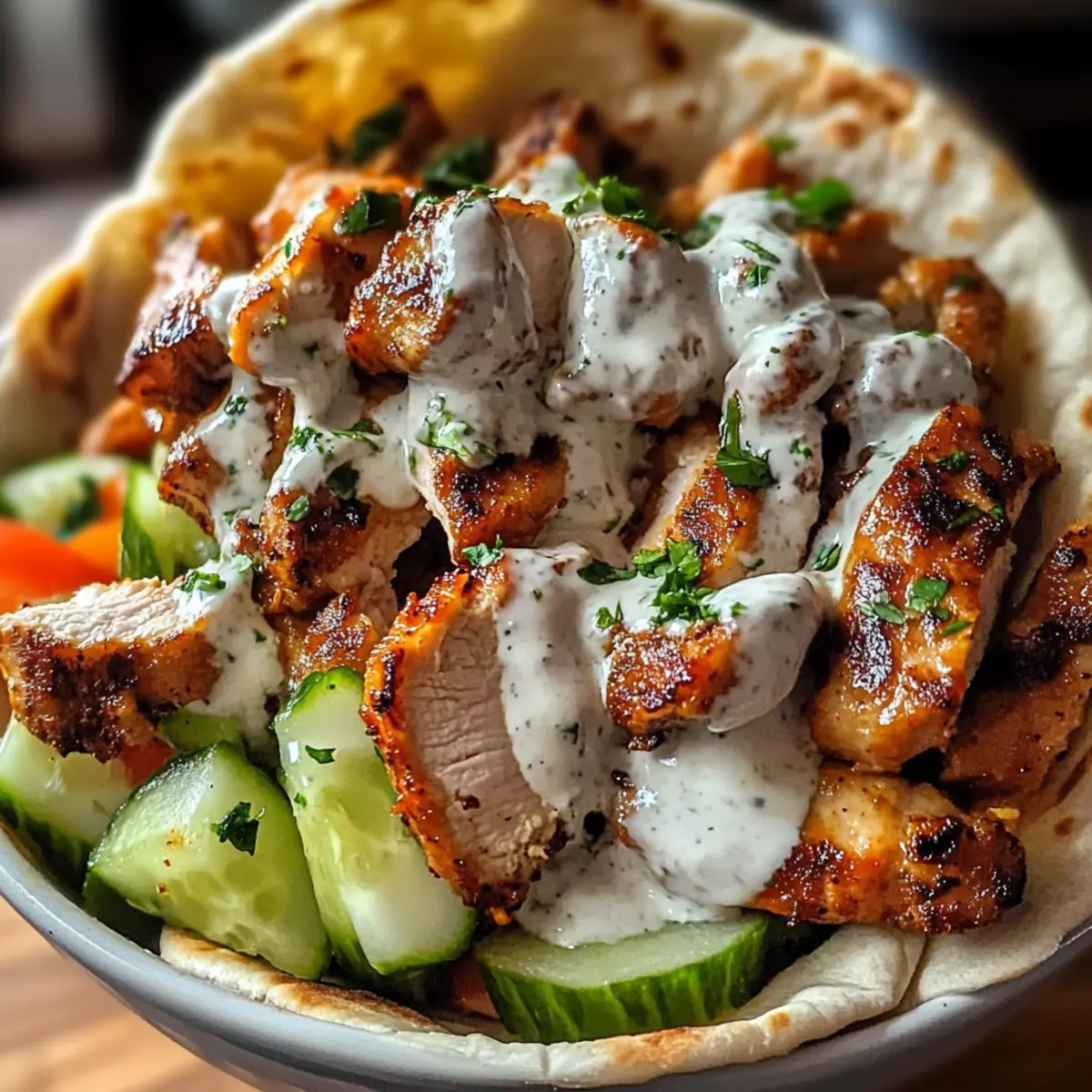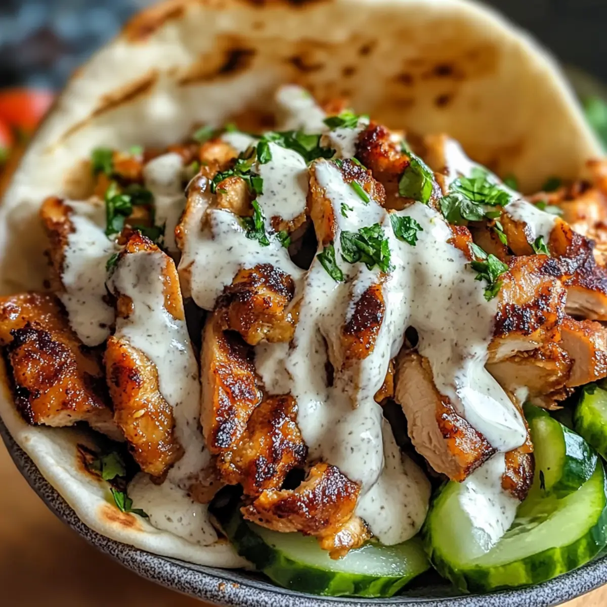 Ein Duft, der aus der Küche strömt, kann Erinnerungen wecken und eine Vorfreude auf den Genuss entfachen. So geht es mir jedes Mal, wenn ich mein einfaches Hähnchen Shawarma mit selbstgemachter Knoblauchsoße zubereite. In weniger als 90 Minuten verwandle ich frische Zutaten in ein Gericht, das sowohl für geschäftige Wochentage als auch für entspannte Wochenendessen perfekt ist. Die Kombination aus saftigem Hähnchen und der cremigen Knoblauchsoße ist nicht nur ein Publikumsmagnet, sondern auch wunderbar anpassbar für Meal-Prep-Fans. Werfen Sie einen Blick auf mein Rezept und lassen Sie sich inspirieren – sind Sie bereit, Ihre Liebsten mit diesem köstlichen Genuss zu beeindrucken? Warum ist dieses Hähnchen Shawarma einzigartig? Einfachheit pur: Die Zubereitung ist unkompliziert und erfordert nur einige grundlegende Kochkenntnisse. Reiche Aromen: Die Kombination aus Gewürzen und Knoblauchsoße sorgt für ein geschmackliches Erlebnis, das Ihre Geschmacksknospen verwöhnt. Vielfältig anpassbar: Sie können das Rezept nach Belieben variieren, indem Sie beispielsweise Hühnchenbrust anstelle von -schenkeln verwenden oder gesunde Beilagen wählen. Perfekt für Meal Prep: Dieses Hähnchen Shawarma lässt sich hervorragend im Voraus zubereiten und bietet Ihnen schnelle, köstliche Mahlzeiten für die Woche – ideal für alle, die wenig Zeit haben. Geselliges Essen: Ob für ein Familienessen oder ein Treffen mit Freunden – dieses Gericht zieht alle in seinen Bann. Lassen Sie sich inspirieren und besuchen Sie auch meine anderen Rezeptideen, um mehr leckere Gerichte zu entdecken! Hähnchen Shawarma Zutaten Für die Marinade • Olivenöl – Sorgt für Feuchtigkeit und Reichtum; verwenden Sie Avocadoöl für einen leichteren Geschmack. • Kreuzkümmel – Verleiht warme, erdige Noten; kann weggelassen werden, wenn nicht vorhanden. • Paprika – Bringt milde Süße und kräftige Farbe; geräucherte Paprika fügt zusätzliche Geschmacksnuancen hinzu. • Kurkuma – Bietet einen warmen, leicht bitteren Geschmack und hat gesundheitliche Vorteile; kann mit Currypulver ersetzt werden. • Koriander – Leichte, zitrusartige Note, die die Wärme verstärkt; Petersilie kann als Ersatz dienen. • Zimt – Fügt Marinaden Wärme und Komplexität hinzu; bei Bedarf mit einer kleinen Menge Muskatnuss ersetzen. • Gehackter Knoblauch – Ein unverzichtbarer Geschmacksbestandteil für das Shawarma und die Soße; Menge je nach Vorliebe anpassen. • Zitronensaft – Bringt Aromen zur Geltung und wirkt als Zartmacher; Limettensaft ist ein guter Ersatz. • Salz und Pfeffer – Verbessern den Gesamtschmack; nach Geschmack anpassen. Für die Knoblauchsoße • Mayonnaise – Die Basis für die cremige Soße; kann auch durch griechischen Joghurt ersetzt werden für eine leichtere Variante. • Minced garlic – Es sorgt für den vollen Knoblauchgeschmack in der Soße; beliebig anpassen für weniger Intensität. Schritt-für-Schritt-Anleitung für Hähnchen Shawarma mit Knoblauchsoße Step 1: Marinade vorbereiten In einer Schüssel Olivenöl, Kreuzkümmel, Paprika, Kurkuma, Koriander, Zimt, gehackten Knoblauch, Zitronensaft, Salz und Pfeffer gut vermengen. Mischen Sie die Zutaten gründlich, bis eine homogene Marinade entsteht. Lassen Sie diese für einige Minuten ziehen, damit sich die Aromen entfalten können. Step 2: Hähnchen marinieren Die Hähnchenstücke in die vorbereitete Marinade geben und gut marinieren, sodass sie gleichmäßig bedeckt sind. Decken Sie die Schüssel ab und lassen Sie das Hähnchen mindestens 30 Minuten im Kühlschrank marinieren, besser noch über Nacht, damit die Aromen besonders gut durchziehen. Step 3: Hähnchen garen Eine Grillpfanne oder einen Grill auf mittelhohe Hitze vorheizen. Ein wenig Öl in die Pfanne geben, um ein Ankleben zu verhindern. Das marinierte Hähnchen für 5-7 Minuten pro Seite garen, bis es goldbraun ist und eine Innentemperatur von 75 °C erreicht. Achten Sie darauf, es nicht zu lange zu garen, damit das Hähnchen saftig bleibt. Step 4: Knoblauchsoße zubereiten In einer Schüssel Mayonnaise, gehackten Knoblauch, Zitronensaft und eine Prise Salz gut verrühren. Mischen Sie alle Zutaten, bis die Soße glatt und cremig ist. Schmecken Sie die Soße ab und passen Sie sie nach Wunsch an; vielleicht möchten Sie mehr Knoblauch oder Salz hinzufügen. Step 5: Servieren Das gegarte Hähnchen nach kurz nach dem Garen in Streifen schneiden. Die Hähnchenstreifen in warme Pita-Brote füllen und großzügig mit der Knoblauchsoße toppen. Servieren Sie das Shawarma mit frischem Gemüse, eingelegten Rüben oder einem knackigen Salat für den perfekten Genuss. Lagerungstipps für Hähnchen Shawarma Raumtemperatur:: Hähnchen Shawarma sollte nicht länger als 2 Stunden bei Raumtemperatur stehen bleiben, um die Lebensmittelsicherheit zu gewährleisten. Kühlschrank:: Bewahren Sie übrig gebliebenes Hähnchen Shawarma in einem luftdichten Behälter im Kühlschrank auf, wo es bis zu 3 Tage frisch bleibt. Einfrieren:: Für längere Lagerung können Sie das Hähnchen Shawarma in Portionen einfrieren. In einem luftdichten Behälter gut verpacken, dann bleibt es bis zu 3 Monate genießbar. Aufwärmen:: Das Aufwärmen gelingt am besten in der Pfanne oder Mikrowelle bei niedriger Temperatur, um die Saftigkeit des Hähnchens zu erhalten. Tipps für das beste Hähnchen Shawarma Marinieren maximieren: Längeres Marinieren verbessert die Aromen erheblich. Planen Sie idealerweise eine Übernachtung ein, um das volle Geschmackspaket zu erreichen. Grillen oder Backen: Während Grillen das beste Aroma liefert, können Sie das Hähnchen auch bei 220 °C im Ofen für 20–25 Minuten garen. Achten Sie auf die Zeit! Hähnchenstück wählen: Hähnchenschenkel sind saftiger; wenn Sie Brustfilets verwenden, beobachten Sie die Zubereitungszeit, um Trockenheit zu vermeiden. Soße zum Vorkochen: Die Knoblauchsoße kann im Voraus zubereitet und bis zu drei Tage im Kühlschrank aufbewahr