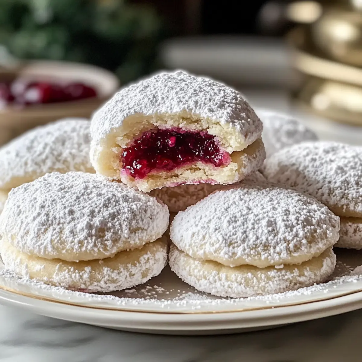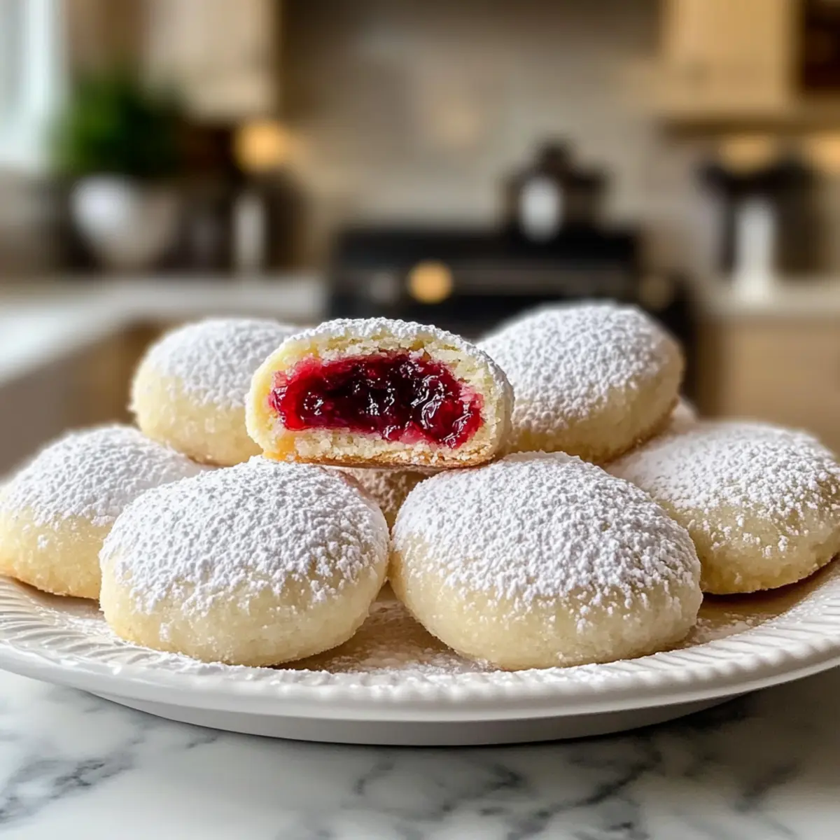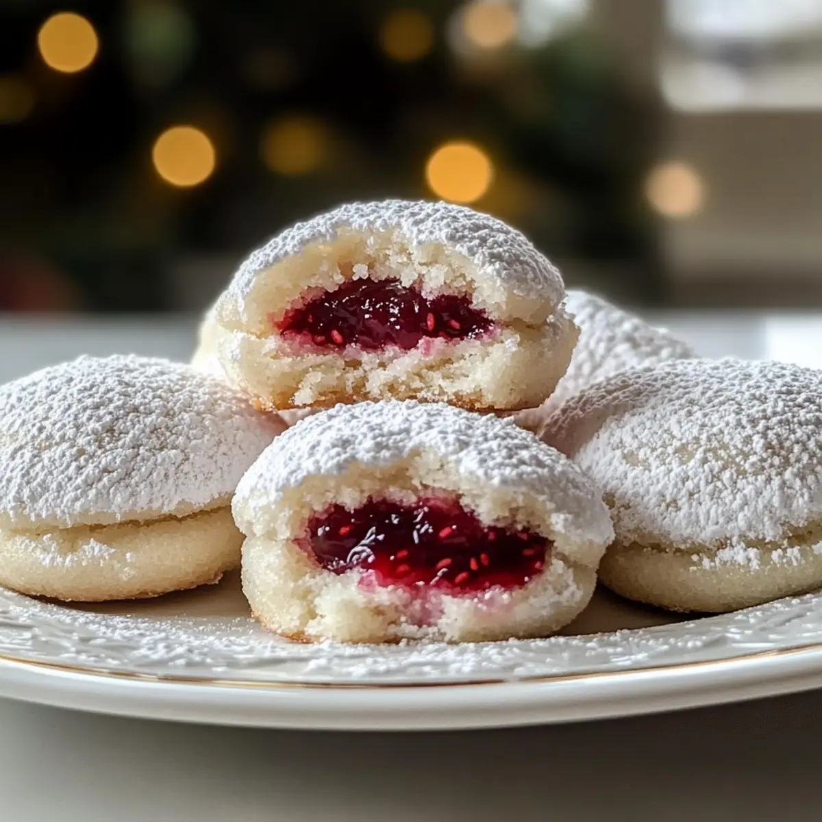 Plötzlich erfuhr ich von einem unverhofften Geheimnis: Himbeergefüllte Mandel-Schneekekse, die nicht nur glutenfrei sind, sondern auch ein echter Genuss für die Sinne! Diese zarten Kekse vereinen die leichten Aromen von Mandeln mit der spritzigen Frische der Himbeeren und machen sie zur perfekten Ergänzung für jede süße Feier. Die einfache Zubereitung bringt den zusätzlichen Vorteil, dass sie sich hervorragend für unerwartete Gäste eignen oder um sich selbst an einem gemütlichen Nachmittag zu verwöhnen. Und während die ersten Backwaren im Ofen goldbraun werden, kann ich es kaum erwarten, die duftenden Köstlichkeiten mit einem Hauch Puderzucker zu vollenden. Neugierig, wie diese himmlischen Kekse ganz einfach gelingen? Warum sind diese Kekse so besonders? Ein Genuss für alle: Himbeergefüllte Mandel-Schneekekse sind glutenfrei und bieten eine wunderbare Kombination aus nussigem Mandelgeschmack und fruchtiger Himbeernote, die begeistert. Einfache Zubereitung: Das Rezept ist unkompliziert und auch für Backanfänger leicht umsetzbar – perfekt, wenn Freunde spontan vorbeischauen! Ideal für jeden Anlass: Ob festliche Feier oder gemütlicher Nachmittagskaffee, diese Kekse sind vielseitig einsetzbar und beeindrucken jeden Gaumen. Pfiffige Variationen: Experimentiere mit verschiedenen Marmeladensorten oder entdecke nussfreie Alternativen für unvergessliche Geschmackserlebnisse. Probiere auch andere Rezepte wie die Kunst der Espresso oder das Kinder Bueno Dessert, um deine Backfähigkeiten zu erweitern! Süße Geschenke: Verpacke die Kekse nett und verschenke sie als liebevolle, selbstgemachte Aufmerksamkeit zu besonderen Anlässen. Himbeergefüllte Mandel-Schneekekse Zutaten Für den Teig Mandelmehl – Glutenfreies Mehl, das einen nussigen Geschmack und eine zarte Textur verleiht; kannst du auch durch Haselnussmehl ersetzen, wenn du allergisch bist. Puderzucker – Sorgt für die süße Note und das charakteristische, schneebedeckte Finish; keine substitutions nötig. Butter – Ungesalzene Butter intensiviert den Geschmack und bindet die Zutaten; achte darauf, dass sie weich ist für einfache Verarbeitung. Eier – Sie geben Struktur; Eier in Zimmertemperatur führen zu den besten Ergebnissen. Vanilleextrakt – Verbessert den Gesamteindruck; kann für einen stärkeren Mandelgeschmack durch Mandelextrakt ersetzt werden. Für die Füllung Himbeermarmelade – Die Hauptfülle; wähle hochwertige Marmelade für den besten Geschmack; auch andere Fruchtaufstriche wie Erdbeere oder Blaubeere sind möglich. Zum Bestäuben Puderzucker – Für die finale schneebedeckte Optik; einfach großzügig darüberstreuen, nachdem die Kekse abgekühlt sind. Viel Freude beim Ausprobieren dieses köstlichen Rezepts für Himbeergefüllte Mandel-Schneekekse! Schritt-für-Schritt-Anleitung für Himbeergefüllte Mandel-Schneekekse Step 1: Ofen vorheizen Heize deinen Backofen auf 175 °C vor und prepare ein Backblech mit Backpapier. Dies ist ein wichtiger Schritt, um sicherzustellen, dass die Himbeergefüllten Mandel-Schneekekse gleichmäßig backen und ihre zarte Textur erhalten bleibt. Während der Ofen aufheizt, kannst du dich auf die Zubereitung des Teigs konzentrieren. Step 2: Teig mixen In einer großen Schüssel die weiche Butter mit dem Puderzucker cremig rühren, bis eine luftige Konsistenz entsteht. Füge die Eier nacheinander hinzu und rühre sie gründlich unter. Mische dann den Vanilleextrakt ein und gib schließlich das Mandelmehl hinzu, bis ein glatter Teig entsteht. Diese Mischung wird die zarten Grundlagen für die Kekse bilden. Step 3: Kekse formen Jetzt ist es an der Zeit, die Kekse zu gestalten! Nimm mit einem Esslöffel Portionen des Teigs und forme sie zu kleinen Bällen. Mit deinem Daumen drücke vorsichtig eine Vertiefung in jede Kugel, um Platz für die köstliche Himbeermarmelade zu schaffen. Achte darauf, dass die Keksbälle gleichmäßig groß sind, damit sie gleichmäßig backen. Step 4: Mit Marmelade füllen Fülle jede Vertiefung mit etwa einem Teelöffel Himbeermarmelade. Anschließend die Ränder des Teigs vorsichtig zusammendrücken, um die Marmelade zu versiegeln. Dies sorgt dafür, dass die Füllung während des Backens nicht ausläuft. Diese zarten Himbeergefüllten Mandel-Schneekekse brauchen nur einen kleinen Kniff, um perfekt zu werden. Step 5: Backen Platziere die Kekse auf dem vorbereiteten Backblech und achte darauf, genügend Abstand zwischen ihnen zu lassen, da sie beim Backen auseinanderlaufen. Backe die Kekse für 12 bis 15 Minuten, bis die Ränder goldbraun sind. Lass die köstlichen Kekse im Ofen ihre Farbe annehmen, während sich der verführerische Duft im Raum verbreitet. Step 6: Mit Puderzucker bestäuben Lasse die Kekse auf dem Backblech etwas abkühlen, bevor du sie auf ein Kuchengitter überträgst. Sobald sie vollständig abgekühlt sind, bestäube sie großzügig mit Puderzucker für den klassischen schneebedeckten Look. Diese finale Berührung macht die Himbeergefüllten Mandel-Schneekekse nicht nur optisch ansprechend, sondern fügt auch eine süße Note hinzu. Was passt gut zu Himbeergefüllten Mandel-Schneekeksen? Die perfekte Ergänzung zu diesen zarten, gefüllten Köstlichkeiten kann das Erlebnis zu einem unvergesslichen Genuss machen. Frischer Obstsalat: Eine bunte Mischung aus saisonalen Früchten bringt Frische und Schönes auf den Tisch. Der süße Geschmack des Obstes punktet im Kontrast zur Himbeermarmelade und bietet eine fruchtige Erfrischung. Kaffee oder Tee: Ein warmes Getränk, das den Geschmack der Kekse unterstreicht, ist ideal. Der aromatische Kaffee oder ein fein abgestimmter Tee wirken harmonisch und laden zum gemütlichen Verweilen ein. Vanilleeis: Eine Kugel cremiges Vanilleeis sorgt für einen köstlichen Kontrast und macht aus jedem Keks ein kleines Dessertparadies. Die Kälte des Eises betont die zarte Textur der Kekse und sorgt für einen genussvollen Mix. Schokoladensauce: Für Schokoladenliebhaber ist eine zarte 