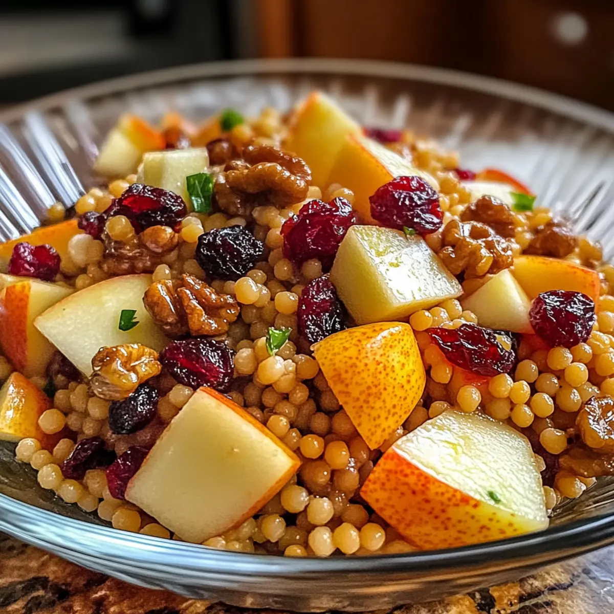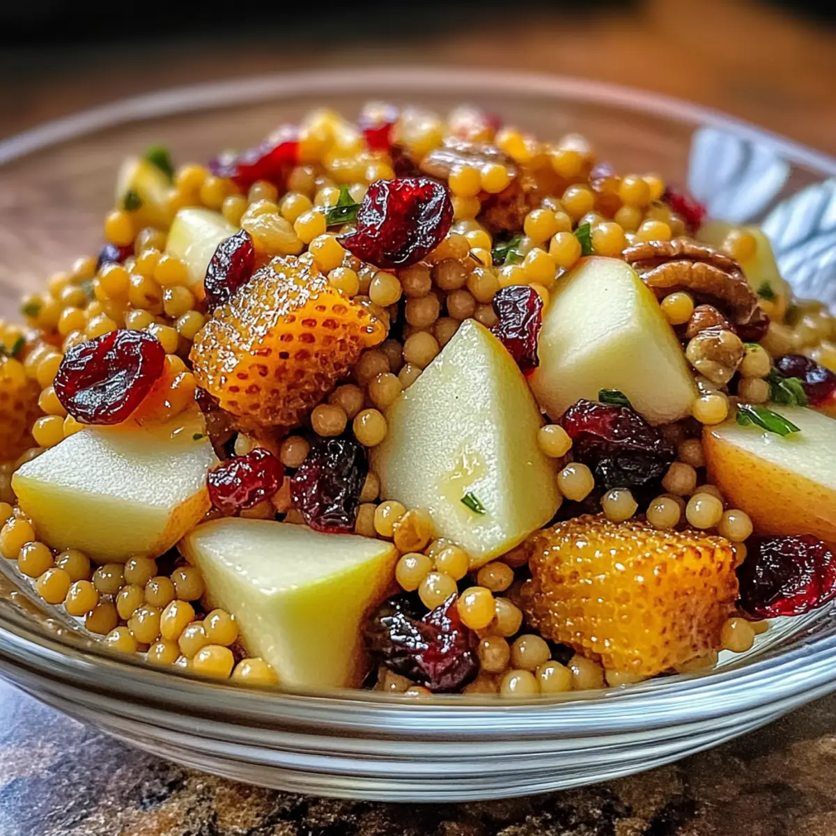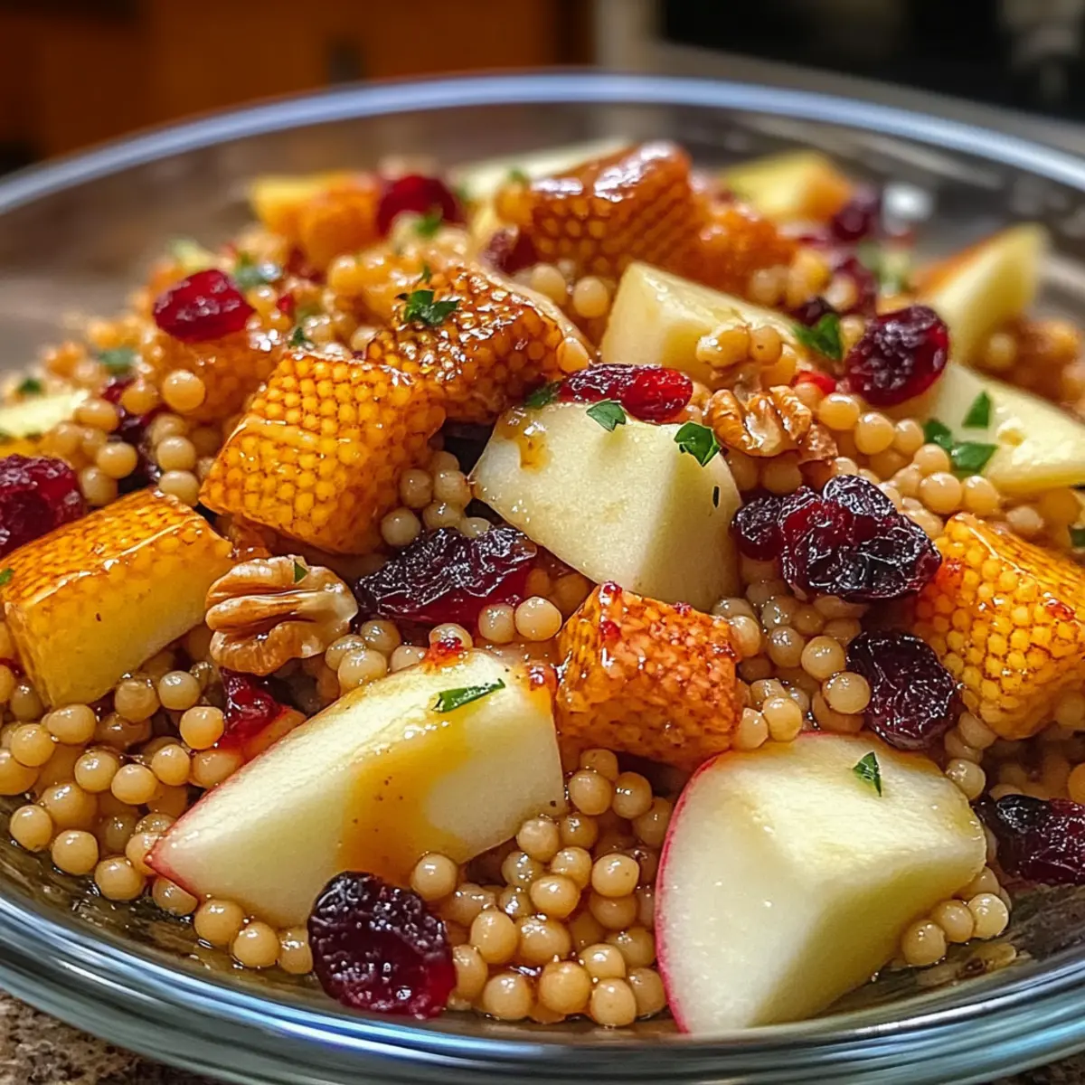 Die Blätter färben sich golden und die Luft riecht nach Zimt – der Herbst hat etwas Magisches an sich. In dieser Jahreszeit gibt es nichts Besseres, als sich mit einem wärmenden Gericht wie dem Honig Herbst Perlen Couscous Salat zu verwöhnen. Dieser Salat ist nicht nur eine wahre Augenweide, sondern auch ein gesundes Plädoyer gegen die Fast-Food-Müdigkeit, das in nur 25 Minuten zubereitet ist. Stell dir vor, wie der süße Honig mit den knackigen Walnüssen und den herbstlichen Äpfeln harmoniert – ein Fest für die Sinne! Ob als leichtes Mittagessen oder als Beilage zu festlichen Anlässen, dieser Salat bringt die Aromen des Herbstes direkt auf deinen Tisch. Bist du bereit, in die Welt der gesunden, selbstgemachten Küche einzutauchen? Warum wirst du diesen Salat lieben? Einfachheit: Die Zubereitung des Honig Herbst Perlen Couscous Salats ist kinderleicht und benötigt nur 25 Minuten, perfekt für hektische Tage. Gesunde Zutaten: Mit frischem Obst, Nüssen und gesunden Fetten bringt dieser Salat nicht nur Farbe auf deinen Teller, sondern auch nährstoffreiche Vorteile für deinen Körper. Vielseitigkeit: Ob als leichtes Mittagessen oder als festliche Beilage zu gegrilltem Fleisch – dieser Salat passt zu jeder Gelegenheit und kann leicht abgewandelt werden! Aromatische Kombination: Der süße Honig, knackige Walnüsse und frische Äpfel verleihen dem Salat ein unverwechselbares Geschmackserlebnis, das jedes Fast-Food-Gericht in den Schatten stellt. Herbstliche Stimmung: Dieser Salat fängt die Essenz des Herbstes ein und ist eine wahre Freude für alle, die saisonale Küche lieben. Probiere ihn auch als Beilage zu einem herzhaften Chili oder zu einem leckeren Streuselkuchen Mit Pudding für den perfekten herbstlichen Genuss! Honig Herbst Perlen Couscous Salat Zutaten • Entdecke die köstlichen Bestandteile eines gesunden Herbstsalats! Für den Salat Gemüsebrühe – bietet eine reichhaltige Geschmacksbasis; verwende hochwertige Brühe für beste Ergebnisse. Perlen-Couscous – das Hauptzutat mit zähem Biss; für eine glutenfreie Option mit Quinoa oder Farro ersetzen. Honig – fügt Süße hinzu und balanciert die herzhaften Elemente; alternativ kann auch Ahornsirup verwendet werden. Würfelig geschnittene Äpfel – sorgt für Süße und Knackigkeit; saisonale Sorten empfehlen sich für den besten Geschmack. Getrocknete Cranberries – liefert einen herben Kontrast; auch Rosinen können als Alternative dienen. Gehackte Walnüsse – bringt Crunch und nussigen Geschmack; für eine nussfreie Variante Kürbiskerne verwenden. Für das Dressing Olivenöl – bildet die Basis für das Dressing und hebt die Aromen hervor; Avocado- oder ein anderes bevorzugtes Öl sind ebenfalls geeignet. Apfelessig – sorgt für Säure und belebt die Aromen; Zitronensaft kann als Substitute dienen. Salz und Pfeffer – Gewürze zur Verbesserung des Gesamtgeschmacks. Für das Topping Feta-Käse – optional als cremiges Topping; kann für eine vegane Variante weggelassen werden. Dieser Honig Herbst Perlen Couscous Salat wird deine Geschmacksnerven begeistern und ist ein perfektes Beispiel für saisonales, gesundes Essen! Schritt-für-Schritt-Anleitung für den Honig Herbst Perlen Couscous Salat Step 1: Gemüsebrühe zum Kochen bringen Bringe in einem mittelgroßen Topf 500 ml Gemüsebrühe bei hoher Hitze zum Kochen. Achte darauf, dass die Brühe sprudelnd kocht, um einen reichen Geschmack zu gewährleisten. Dies dauert etwa 5 Minuten. Eine qualitativ hochwertige Gemüsebrühe wird den Honig Herbst Perlen Couscous Salat besonders aromatisch machen. Step 2: Perlen-Couscous hinzufügen und garen Füge den Perlen-Couscous zur kochenden Brühe hinzu und rühre gut um, damit er nicht kleben bleibt. Reduziere die Hitze auf mittlere Stufe und lasse den Couscous für 8-10 Minuten köcheln, bis er zart, aber bissfest ist. Wenn er gar ist, siebe überschüssige Brühe ab und lasse den Couscous kurz abkühlen. Step 3: Zutaten kombinieren In einer großen Schüssel vermenge den gekochten Couscous mit 2 Esslöffeln Honig, gewürfelten Äpfeln, getrockneten Cranberries und den gehackten Walnüssen. Rühre vorsichtig, damit die Zutaten nicht zerdrückt werden. Diese Mischung bringt die süßen und knackigen Elemente zusammen, die diesen Honig Herbst Perlen Couscous Salat so besonders machen. Step 4: Dressing zubereiten In einer kleinen Schüssel verquirle 3 Esslöffel Olivenöl, 1 Esslöffel Apfelessig, eine Prise Salz und frisch gemahlenen Pfeffer. Rühre gut um, bis alles zu einer homogenen Sauce verbunden ist. Das Dressing wird den Salat lebendiger und schmackhafter machen, indem es die Aromen des Honig Herbst Perlen Couscous Salat hervorhebt. Step 5: Dressing unterrühren und servieren Gieße das Dressing über die Couscous-Mischung und werfe alles sorgfältig zusammen, bis die Zutaten gleichmäßig bedeckt sind. Der Salat kann sofort serviert werden, ist aber auch kalt sehr schmackhaft. Optional kannst du den Salat mit zerbröckeltem Feta-Käse garnieren, um eine cremige Note hinzuzufügen, die perfekt zu den anderen Aromen passt. Aufbewahrungstipps für Honig Herbst Perlen Couscous Salat Raumtemperatur:: Der Honig Herbst Perlen Couscous Salat sollte nicht länger als 2 Stunden bei Raumtemperatur stehen gelassen werden, um die Frische zu bewahren. Kühlschrank:: In einem luftdichten Behälter hält sich der Salat bis zu 3 Tage im Kühlschrank; die Aromen werden im Laufe der Zeit intensiver. Einfrieren:: Der Salat ist nicht ideal zum Einfrieren, da die Texturen der Zutaten beim Auftauen leiden können. Am besten frisch genießen! Wiedererwärmung:: Wenn du den Salat auf Zimmertemperatur bringen möchtest, lasse ihn einfach 30 Minuten bei Raumtemperatur stehen. Feta-Käse erst kurz vor dem Servieren hinzufügen. Expert Tips für den Honig Herbst Perlen Couscous Salat Hochwertige Brühe: Verwende eine hochwertige Gemüsebrühe, da sie entscheidend für den Geschmack des Honig Herbst Perlen Couscous Salats i
