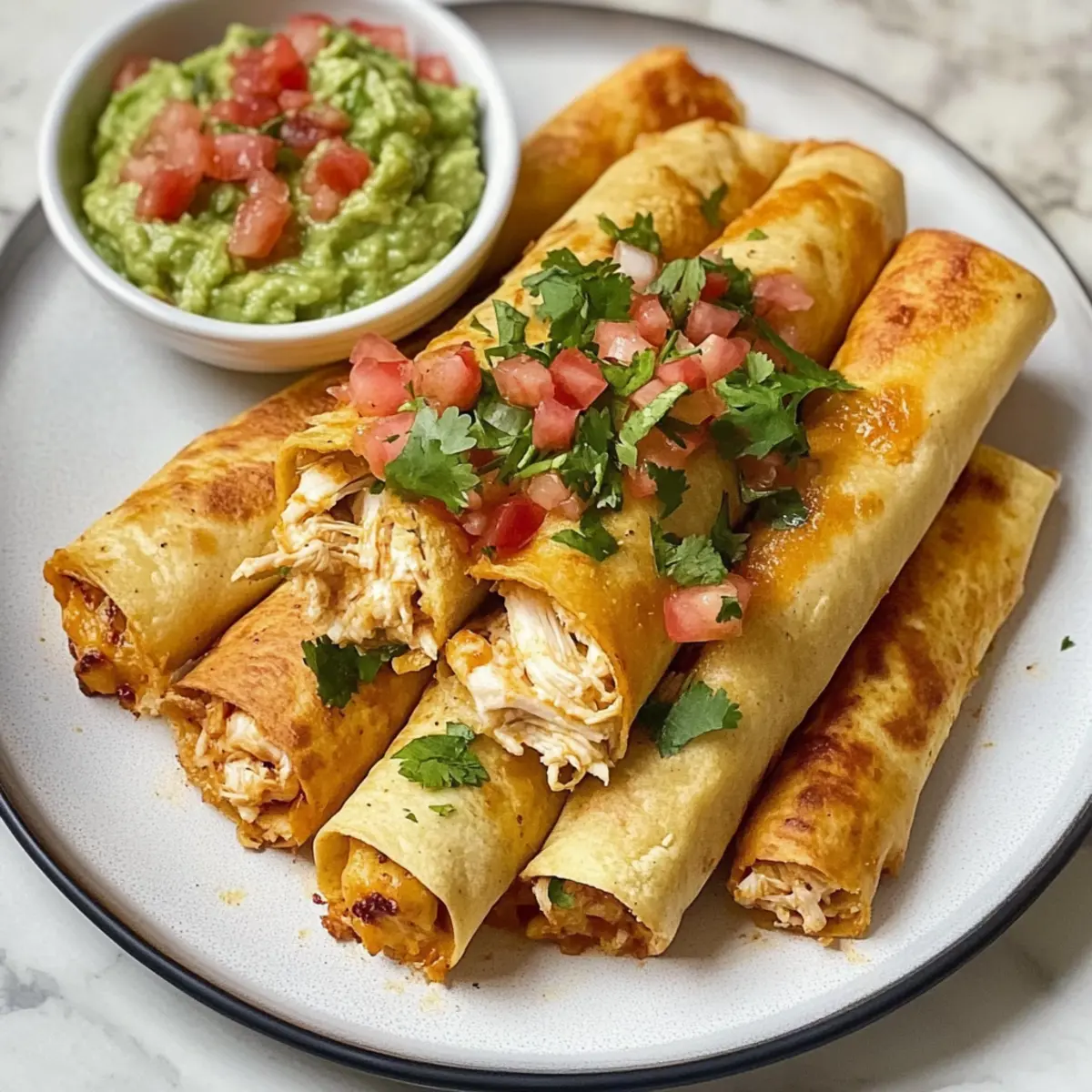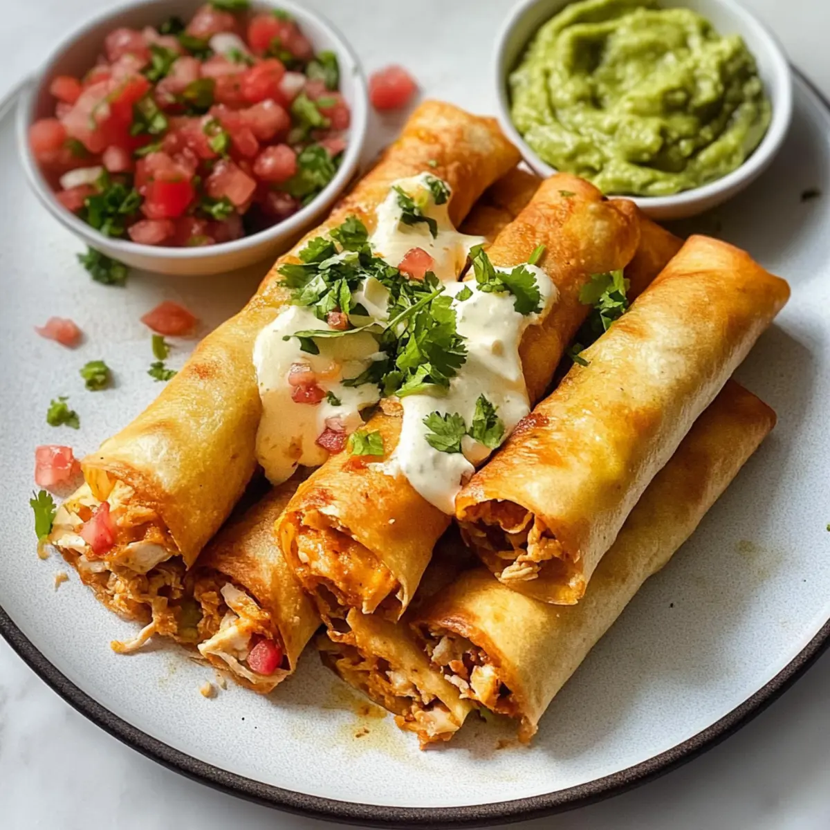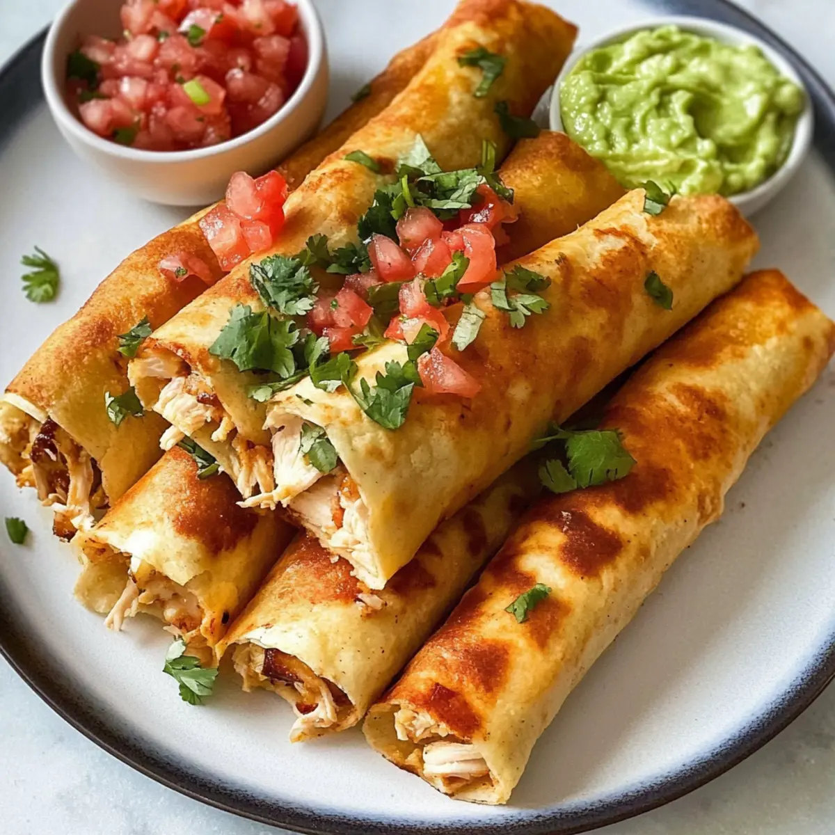 Die Küche erobert uns oft in den unvorhergesehensten Momenten. Neulich, während ich auf dem Weg nach Hause war, überkam mich ein Heißhunger auf etwas Knuspriges und Herzhaftes – und so begannen meine Gedanken an Hühnchen Flautas, die perfekten kleinen Rollen, gefüllt mit zartem Hähnchen, schmelzendem Käse und einem Hauch von grünen Chilis. Diese Flautas sind nicht nur schnell zubereitet, sondern auch äußerst vielseitig; ob mit verschiedenen Käsesorten oder sogar einem anderen Fleisch – der Fantasie sind keine Grenzen gesetzt! Sie eignen sich hervorragend für gesellige Abende oder als unkompliziertes Abendessen unter der Woche. Bist du bereit, deine Freunde mit einem neuen Lieblingsgericht zu begeistern? Warum wirst du diese Flautas lieben? Crispy Genuss: Diese Hühnchen Flautas sind knusprig und perfekt für alle, die eine leckere, selbstgemachte Mahlzeit schätzen. Vielseitigkeit pur: Du kannst verschiedene Füllungen und Käsesorten ausprobieren – sei es mit zartem Schweinefleisch oder einer Mischung aus Käse, wie Monterey Jack, um deinen Geschmack zu treffen. Zeitsparend: Ideal für stressige Wochentage, sind sie in kürzester Zeit zubereitet. Geselliges Essen: Perfekt für Feiern und gesellige Abende, erfreuen sie sich großer Beliebtheit bei Freunden und Familie. Wenn du nach einer weiteren Inspiration suchst, schau dir unser Rezept für Kokosnuss Curry Lachs oder für Lachs Knuspriger Reis an! Hühnchen Flautas Zutaten • Diese Zutaten sind die Grundlage für köstliche Hühnchen Flautas, die du anpassen kannst! Für die Füllung Zerhacker Hähnchen – bietet die Hauptproteinquelle; du kannst es durch zartes Schweine- oder Rindfleisch ersetzen. Dosengehackte grüne Chilis – verleihen einen milden Gewürzgeschmack; stattdessen kannst du Salsa oder eingelegte Jalapeños verwenden. Geriebener Cheddar – sorgt für einen leckeren Geschmack; probiere auch Monterey Jack, Pepper Jack oder Oaxaca Käse. Queso Blanco (oder zerbröckelter Feta) – bringt eine cremige Textur und etwas Säure; ersetze es durch eine ähnliche Käsesorte nach deinem Geschmack. Koshersalz – verstärkt den Geschmack; lass es weg, wenn du bereits gewürztes Hähnchen verwendest. Scharfe Soße (optional) – fügt eine angenehme Schärfe hinzu; passe die Menge deinem persönlichen Geschmack an. Für die Tortillas Mehl-Tortillas (7”) – sind die perfekte Hülle für deine Füllung; verwende für eine glutenfreie Option Mais-Tortillas. Zum Frittieren Neutrales Öl (z. B. Gemüse- oder Rapsöl) – sorgt für den knusprigen Effekt; stelle sicher, dass das Öl heiß genug ist für das perfekte Ergebnis. Schritt-für-Schritt-Anleitung für Hühnchen Flautas Step 1: Tortillas vorbereiten Wärme die Mehl-Tortillas in der Mikrowelle, indem du sie in ein feuchtes Papiertuch wickelst und für 20 Sekunden erhitzt. Dies verhindert, dass sie beim Falten reißen und sorgt dafür, dass deine Hühnchen Flautas gleichmäßiger gerollt werden können. Step 2: Tortillas füllen Lege eine Portion der Hähnchenfüllung auf jede Tortilla. Rolle die Tortilla straff auf und achte darauf, die Füllung gut zu umschließen. Falls nötig, sichere die Flautas mit Zahnstocher, sodass sie während des Frittierens nicht auseinanderfallen. Step 3: Öl erhitzen In einer tiefen Pfanne erhitzt du das Öl auf 175-190°C (350-375°F). Das Öl ist heiß genug, wenn es zu sichten Blasen bildet oder ein Stück Tortilla bei Kontakt sofort anfängt zu brutzeln. Dies ist der perfekte Zeitpunkt, um die Hühnchen Flautas hinzuzufügen. Step 4: Flautas frittieren Frittiere die Flautas in Chargen, sodass sie genug Platz haben, um gleichmäßig zu bräunen. Jede Charge sollte etwa 3-4 Minuten pro Seite frittieren, bis sie goldbraun und knusprig sind. Verwende eine Zange, um die Flautas vorsichtig zu wenden, und lasse sie anschließend auf Küchenpapier abtropfen. Step 5: Servieren und genießen Serviere die frisch frittierten Hühnchen Flautas warm mit deinen Lieblingsdips wie Guacamole, Sauerrahm oder Pico de Gallo. Experimentiere mit verschiedenen Toppings und genieße diesen köstlichen Snack mit Familie und Freunden! Tipps für die besten Hühnchen Flautas Öltemperatur überprüfen: Stelle sicher, dass das Öl die perfekte Temperatur hat, um eine knusprige Textur zu erreichen. Nutze einen Tortilla-Streifen, um die Temperatur zu testen. Füllung festrollen: Rolle die Tortillas straff, um sicherzustellen, dass die Füllung nicht beim Frittieren herausfällt. Verwende Zahnstocher, wenn nötig. Variationen probieren: Experimentiere mit verschiedenen Käsesorten oder Füllungen wie Pulled Pork oder Gemüse, um deine eigenen leckeren Hühnchen Flautas zu kreieren. In Chargen frittieren: Frittiere die Flautas in kleinen Mengen, damit sie genug Platz haben, gleichmäßig zu bräunen und knusprig zu werden. Richtig abtropfen lassen: Lasse die Hühnchen Flautas nach dem Frittieren auf Küchenpapier abtropfen, um überschüssiges Öl zu entfernen und die Knusprigkeit zu bewahren. Was passt zu Hühnchen Flautas? Die perfekte Kombination macht jede Mahlzeit zu einem besonderen Erlebnis und lässt die Geschmacksknospen tanzen. Pico de Gallo: Frisch und spritzig, dieser mexikanische Salat aus Tomaten, Zwiebeln und Koriander gibt den Flautas den perfekten frischen Kick. Guacamole: Cremig und reichhaltig, die Avocadopaste ergänzt die knusprigen Flautas harmonisch und bringt zusätzliche Aromen ins Spiel. Sauerrahm: Ein Klecks davon verleiht den Flautas eine erfrischende Note und mildert die Schärfe der Füllung. Mexikanischer Reis: Dieser würzige Reis ist einfach zuzubereiten und lässt sich ideal als Beilage kombinieren, um das Gericht zu vervollständigen. Refried Beans: Diese weichen, herzhaften Bohnen bieten eine großartige Textur und eignen sich hervorragend als Proteinbeilage. Mais-Salat: Ein leichter und farbenfroher Salat bringt frische und süße Noten hinein und bietet einen wunderbaren Kontrast zu den knusprigen Flautas. Kalte Lim