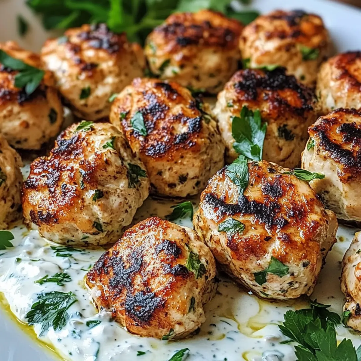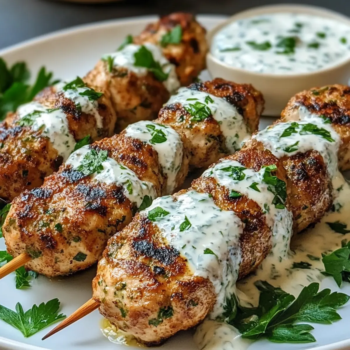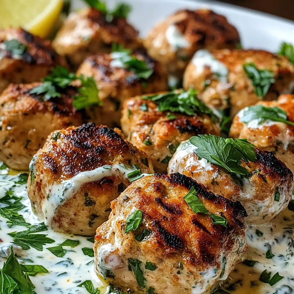 Hast du jemals beim Grillen die perfekte Kombination aus Saftigkeit und Gewürzen erzielt? Mein Rezept für Hühnchen Kofta mit Knoblauch Joghurt Sauce bringt genau das auf den Tisch. In weniger als 30 Minuten kannst du ein familienfreundliches Abendessen zaubern, das sowohl Erwachsene als auch Kinder begeistert. Die köstlichen Koftas sind nicht nur glutenfrei, sondern auch einfach zuzubereiten, sodass du im Handumdrehen eine gesunde Alternative zu Fast Food inszenieren kannst. Mit jeder Bissen entfaltet sich eine harmonische Explosion aus Aromen, die durch die cremige Joghurt Sauce noch verstärkt wird. Bist du bereit, deine Grillkünste zu entfalten? Lass uns gemeinsam in die Welt der Hühnchen Kofta eintauchen! Warum wirst du dieses Rezept lieben? Einfachheit, Die Zubereitung ist schnell und unkompliziert – unter 30 Minuten und du hast ein köstliches Gericht auf dem Tisch. Familienfreundlich, Kinder lieben die würzigen Koftas, die sich perfekt für ein schnelles Abendessen eignen. Vielseitigkeit, Serviere sie mit frischem Pita-Brot oder einem bunten Salat für ein rundum gelungenes Mahl. Gesund, Mit frischen Zutaten wie Hühnchen und Joghurt ist dieses Gericht eine tolle Alternative zu Fast Food. Warum nicht auch einen Blick auf diese Mediterranen Variationen werfen? Geschmack, Der unverwechselbare Geschmack von Gewürzen und der cremigen Sauce wird deine Geschmacksknospen verzaubern! Hühnchen Kofta Zutaten • Möchtest du wissen, was du für diese köstlichen Hühnchen Kofta mit Knoblauch Joghurt Sauce benötigst? Hier ist die Zusammenstellung der Zutaten: Für die Koftas Gemahlenes Hühnchen – die Hauptquelle für Protein; für eine leichtere Option kannst du auch gemahlenen Truthahn verwenden. Zwiebel – sorgt für Süße und Feuchtigkeit; verwende am besten gelbe oder weiße Zwiebeln für den besten Geschmack. Knoblauch – verleiht ein aromatisches Aroma; frisch gehackter Knoblauch ist am intensivsten. Frische Petersilie – fügt Frische und Farbe hinzu; als Alternative kannst du Koriander für ein anderes Geschmacksprofil verwenden. Gemahlener Kreuzkümmel – bietet erdige, warme Noten. Gemahlener Koriander – ergänzt den Kreuzkümmel mit seinem zitrusartigen Hintergrund. Salz – verbessert den Gesamtgeschmack; passe die Menge an deine Diätbedürfnisse an. Schwarzer Pfeffer – sorgt für Schärfe; frisch gemahlener Pfeffer ist am besten für den Geschmack. Olivenöl – verhindert das Ankleben der Koftas und hilft beim Grillen für eine goldene Kruste. Für die Knoblauch Joghurt Sauce Naturjoghurt – bildet die Grundlage für die Sauce und sorgt für Cremigkeit; griechischer Joghurt kann für einen dickeren Dip verwendet werden. Zitronensaft – bringt Frische in die Joghurt Sauce und fügt Säure hinzu; frisch gepresster Saft ist optimal. Eine Prise Salz – verstärkt den Geschmack der Sauce. Mit diesen Zutaten bist du bestens vorbereitet, um deine eigenen Hühnchen Kofta mit Knoblauch Joghurt Sauce zuzubereiten! Schritt-für-Schritt-Anleitung für Hühnchen Kofta mit Knoblauch Joghurt Sauce Step 1: Zutaten vermengen In einer großen Schüssel das gemahlene Hühnchen, die fein gehackte Zwiebel, den frisch gehackten Knoblauch, die gehackte Petersilie, den Kreuzkümmel, den gemahlenen Koriander, Salz und schwarzen Pfeffer gut vermengen. Die Mischung sollte gleichmäßig verteilt sein und eine kompakte Konsistenz haben. Dies dauert etwa 5 Minuten, um sicherzustellen, dass alle Aromen gut miteinander verbunden sind. Step 2: Koftas formen Forme aus der Hühnchenmischung kleine, ovale Koftas mit einer Länge von etwa 5–7 cm. Achte darauf, dass sie fest geformt sind, um ein Brechen während des Grillens zu vermeiden. Lege die geformten Koftas auf einen Teller und stelle sie beiseite. Dieser Schritt dauert nur etwa 10 Minuten. Step 3: Grill vorheizen Heize den Grill auf mittlere bis hohe Hitze vor (ca. 200–220 °C) und bestreiche das Grillrost leicht mit Olivenöl, um ein Ankleben der Koftas zu verhindern. Das Vorheizen des Grills fördert eine schön gebräunte und knusprige Außenschicht der Hühnchen Kofta. Dieser Vorgang sollte etwa 5 Minuten in Anspruch nehmen. Step 4: Koftas grillen Lege die geformten Koftas vorsichtig auf den Grill und grille sie 10–12 Minuten lang. Wende die Koftas alle 3–4 Minuten, bis sie goldbraun und durchgegart sind. Achte darauf, dass sie eine Innentemperatur von mindestens 75 °C erreichen, damit sie saftig bleiben. Der köstliche Duft und die goldene Farbe zeigen, dass sie fertig sind. Step 5: Joghurt Sauce zubereiten Während die Koftas grillen, bereite die Knoblauch Joghurt Sauce vor. Mische in einer separaten Schüssel den Naturjoghurt mit dem frisch gepressten Zitronensaft und einer Prise Salz. Rühre die Zutaten gut um, bis eine cremige Konsistenz entsteht. Dies sollte nur etwa 3 Minuten in Anspruch nehmen und bietet einen erfrischenden Kontrast zu den würzigen Koftas. Step 6: Servieren und genießen Sobald die Hühnchen Koftas gegrillt und schön gebräunt sind, serviere sie auf einem Teller zusammen mit der Knoblauch Joghurt Sauce an der Seite. Optional kannst du warmes Pita-Brot oder einen frischen Salat hinzufügen, um das Gericht abzurunden. Lass dich von den Aromen und Texturen verführen! Aufbewahrung von Hühnchen Kofta Raumtemperatur: Verwende die Hühnchen Kofta innerhalb von 2 Stunden nach dem Grillen, um die beste Qualität zu gewährleisten. Bei Zimmertemperatur verderben Lebensmittel schnell. Kühlschrank: Bewahre übrig gebliebene Hühnchen Kofta in einem luftdichten Behälter bis zu 3 Tage im Kühlschrank auf. Kalte Koftas schmecken auch in Salaten oder Wraps köstlich. Gefrierschrank: Ungekochte Hühnchen Kofta können bis zu 3 Monate eingefroren werden. Lege sie in einer flachen Schicht auf ein Backblech, bevor du sie in einen Gefrierbeutel umschichtest. Wiederaufwärmen: Erwärme gekochte Kofta im Ofen bei 180 °C für etwa 10 Minuten oder in der Mikrowelle für 1-2 Minuten. Genieß sie mit der cremige
