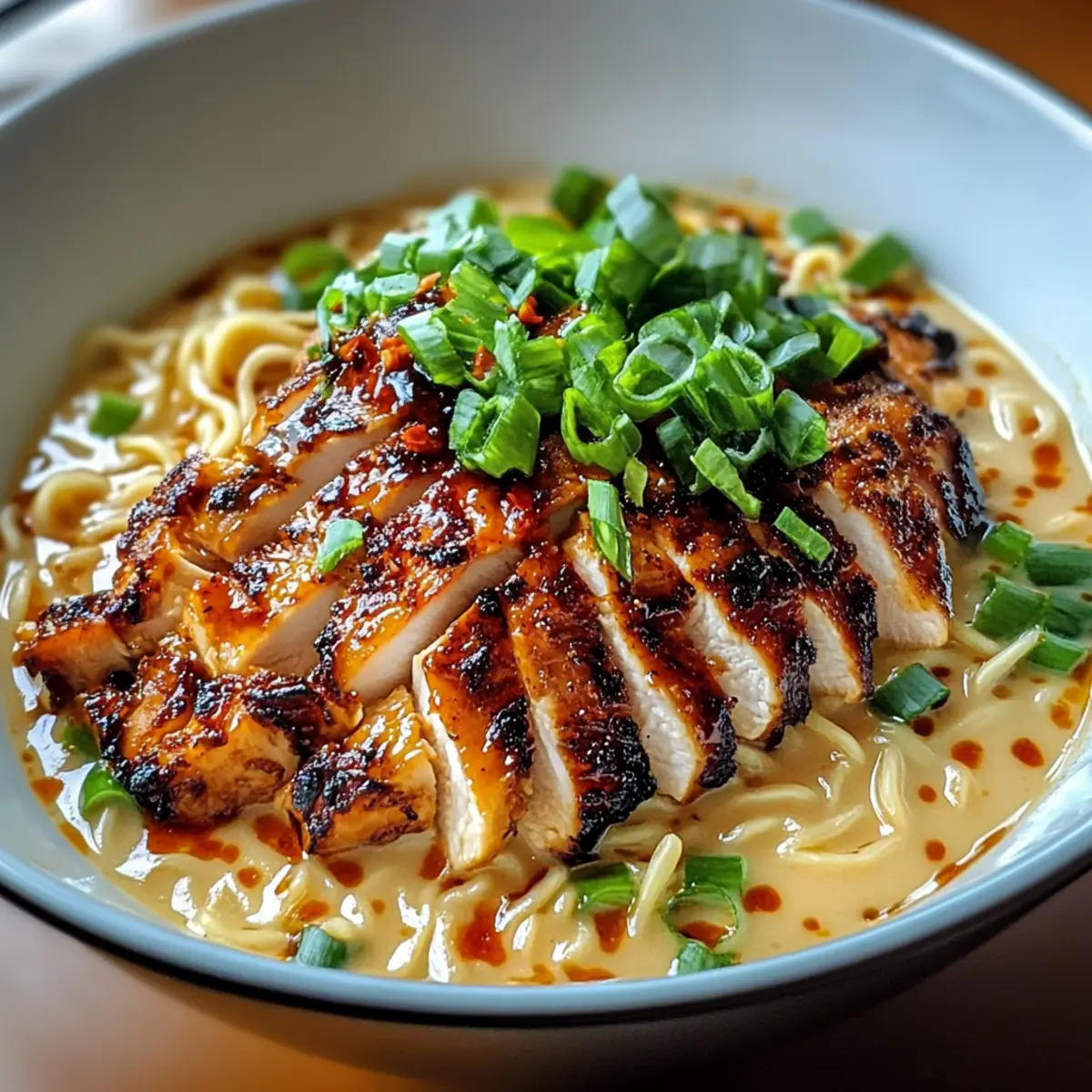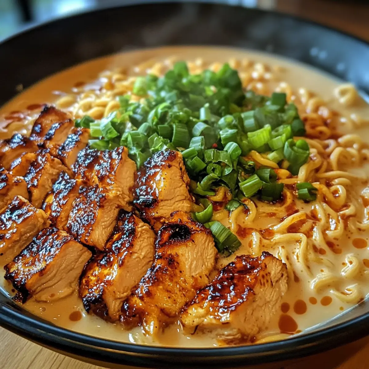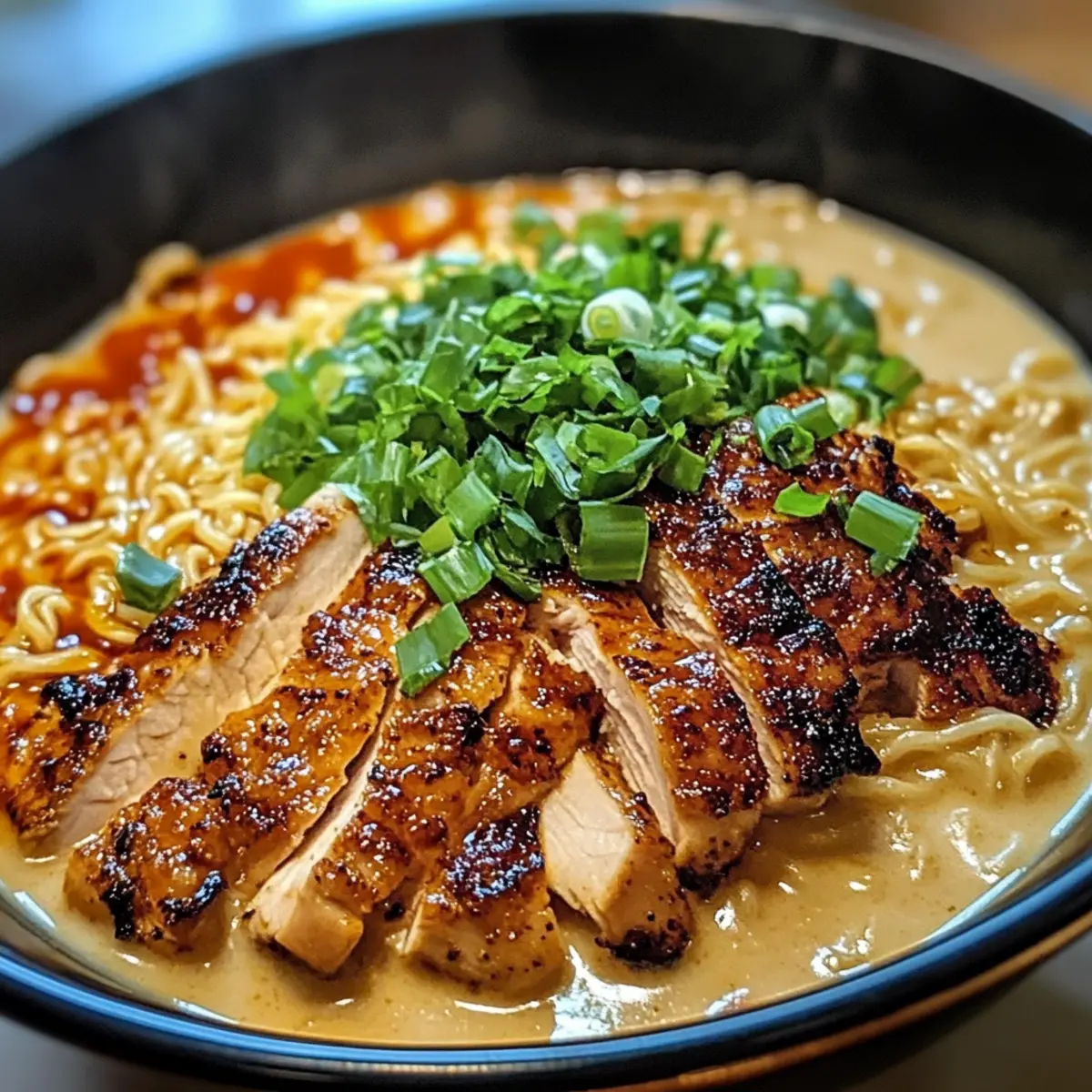 Es war einer dieser hektischen Wochentage, als der Hunger plötzlich zuschlug und ich nur noch den Wunsch hatte, etwas Schmackhaftes und Schnelles zu zaubern. Genau in diesem Moment fiel mein Blick auf die Zutaten in meinem Kühlschrank und die Idee für eine köstliche Hühnchen Ramen mit cremiger Knoblauchsoße war geboren. Diese Mischung aus zartem, angebratenem Hühnerfleisch und herzhaften, würzigen Nudeln in einer cremigen Brühe ist nicht nur ein Genuss für die Sinne, sondern auch ein schnelles Komfortessen, das perfekt für den Feierabend geeignet ist. Da ich auch fleischlose Varianten mit Tofu oder Pilzen anbieten kann, bleibt niemand auf der Strecke. Lass uns gemeinsam in diese köstliche, wärmende Schale eintauchen – bereit für ein unvergessliches Geschmackserlebnis? Warum wird dieses Rezept geliebt? Einfachheit: Die Zubereitung ist unkompliziert und benötigt nur grundlegende Kochfähigkeiten, ideal für schnelle Wochentage. Würzige Vielfalt: Diese Ramen vereinen zartes Hühnerfleisch, aromatische Gewürze und eine samtige Sauce zu einem unvergleichlichen Geschmackserlebnis. Vielseitige Optionen: Egal, ob du Fleisch isst oder nicht – die Möglichkeit, Tofu oder Pilze zu verwenden, macht es für alle geeignet. Zeitersparnis: In weniger als 30 Minuten zauberst du ein herzhaftes Gericht, das selbst den anspruchsvollsten Gaumen zufriedenstellt. Beliebtes Komfortessen: Diese Hühnchen Ramen sind nicht nur sättigend, sondern bringen auch ein Stück Gemütlichkeit in deinen Alltag, perfekt für einen entspannten Abend zu Hause. Entdecke auch weitere köstliche Optionen wie Air Fryer Mozzarella oder Knoblauchbutter Steakspitzen Rezept für noch mehr Genuss! Hühnchen Ramen Zutaten Für das Hühnchen Hähnchenbrustfilets oder Oberschenkel – Hauptprotein, das Saftigkeit und Geschmack bietet; ideal zum Braten. Chilipulver – Fügt der Gewürzmischung Schärfe hinzu; für eine mildere Version die Menge reduzieren. Paprika – Verleiht der Hähnchenhaut Farbe und Tiefe; eine tolle Ergänzung für den Geschmack. Salz & schwarzer Pfeffer – Essenziell für die Gewürze; gut abschmecken für das beste Ergebnis. Pflanzenöl – Optimal zum Anbraten des Hähnchens; für eine perfekte goldene Kruste. Für die Brühe Hühnerbrühe – Basis für die Ramenbrühe; sorgt für Geschmack und Fülle; für vegetarische Optionen Gemüsebrühe verwenden. Sojasauce – Fügt Umami und Salzigkeit hinzu; für mehr Tiefe im Geschmack. Sesamöl – Verleiht der Brühe einen nussigen Geschmack; nicht sparen! Knoblauch – Aromatisch und verstärkt sowohl die Sauce als auch die Brühe; frisch hacken für das beste Aroma. Schlagsahne – Macht die Brühe und die cremige Knoblauchsoße reichhaltig und cremig. Für die Ramen Ramen-Nudeln – Hauptkohlenhydrat; nach Belieben mit Udon oder Soba ersetzen. Frühlingszwiebeln – Für den letzten Schliff und frischen Geschmack; toll zum Garnieren. Chiliöl – Optional für zusätzliches Aroma und Schärfe; perfekt für die Liebhaber von würzigem Essen. Diese Zutaten werden in einer köstlichen Kombination für deine Hühnchen Ramen mit cremiger Knoblauchsoße zusammengestellt. Lass dich inspirieren und genieße die Vielfalt! Schritt-für-Schritt-Anleitung für Hühnchen Ramen mit cremiger Knoblauchsoße Step 1: Hähnchen marinieren Mische in einer Schüssel Chilipulver, Paprika, Salz und Pfeffer. Reibe die Hähnchenbrustfilets oder Oberschenkel gründlich mit dieser Gewürzmischung ein und lasse das Hähnchen für mindestens 15 Minuten marinieren. So zieht der Geschmack schön ein und das Hähnchen wird später zart und aromatisch. Step 2: Hähnchen anbraten Erhitze in einer großen Pfanne bei mittelhoher Temperatur etwas Pflanzenöl. Lege die marinierten Hähnchenstücke in die Pfanne und brate sie etwa 5-7 Minuten pro Seite an, bis sie schön goldbraun und durchgegart sind. Achte darauf, dass sie eine herrliche Kruste haben, bevor du sie aus der Pfanne nimmst und zum Ruhen auf einen Teller legst. Step 3: Cremige Knoblauchsoße vorbereiten In derselben Pfanne lässt du etwas Butter schmelzen. Füge den gehackten Knoblauch hinzu und brate ihn kurz an, bis er aromatisch duftet, was etwa 1-2 Minuten dauert. Gieße die Schlagsahne hinzu und lasse die Soße bei niedriger Hitze köcheln, bis sie leicht eindickt. Stelle die Soße beiseite, während die anderen Komponenten zubereitet werden. Step 4: Ramen-Nudeln kochen Bringe in einem großen Topf Wasser zum Kochen. Koche die Ramen-Nudeln nach Packungsanweisung, bis sie al dente sind. Das dauert in der Regel 3-4 Minuten. Sobald sie fertig sind, gieße das Wasser ab und spüle die Nudeln kurz mit kaltem Wasser, um das Kochen zu stoppen. Step 5: Würzige Brühe zubereiten In einem separaten Topf erhitze etwas Sesamöl bei mittlerer Temperatur. Füge den gehackten Knoblauch hinzu und brate ihn für 1-2 Minuten an. Gieße dann die Hühnerbrühe, Sojasauce und die Schlagsahne hinein. Lasse die Brühe 5-7 Minuten simmern, damit sich die Aromen verbinden und die Brühe reichhaltig wird. Step 6: Ramen-Schalen zusammenstellen Verteile die gekochten Ramen-Nudeln gleichmäßig auf Schalen. Gieße die heiße Brühe darüber und lege die in Scheiben geschnittenen Hähnchenstücke darauf. Drizzle die cremige Knoblauchsoße darüber und garniere jede Schale mit frischen Frühlingszwiebeln und, wenn gewünscht, einem Hauch Chiliöl für zusätzliche Schärfe. Variationen & Substitutionen für Hühnchen Ramen Es gibt viele Möglichkeiten, dieses Rezept nach deinem Geschmack anzupassen und zu variieren, sodass jeder Biss einzigartig wird. Vegetarisch: Ersetze die Hähnchenstücke durch knusprig gebratenen Tofu oder Pilze für eine köstliche, fleischlose Option. Beide Varianten bieten einen wunderbaren Umami-Geschmack und passen perfekt zur cremigen Brühe. Milchfrei: Verwende statt Schlagsahne Kokosmilch oder eine pflanzliche Sahne, um die Ramen vegan und laktosefrei zu genießen. Das verleiht dem Gericht eine subtile, tropisc