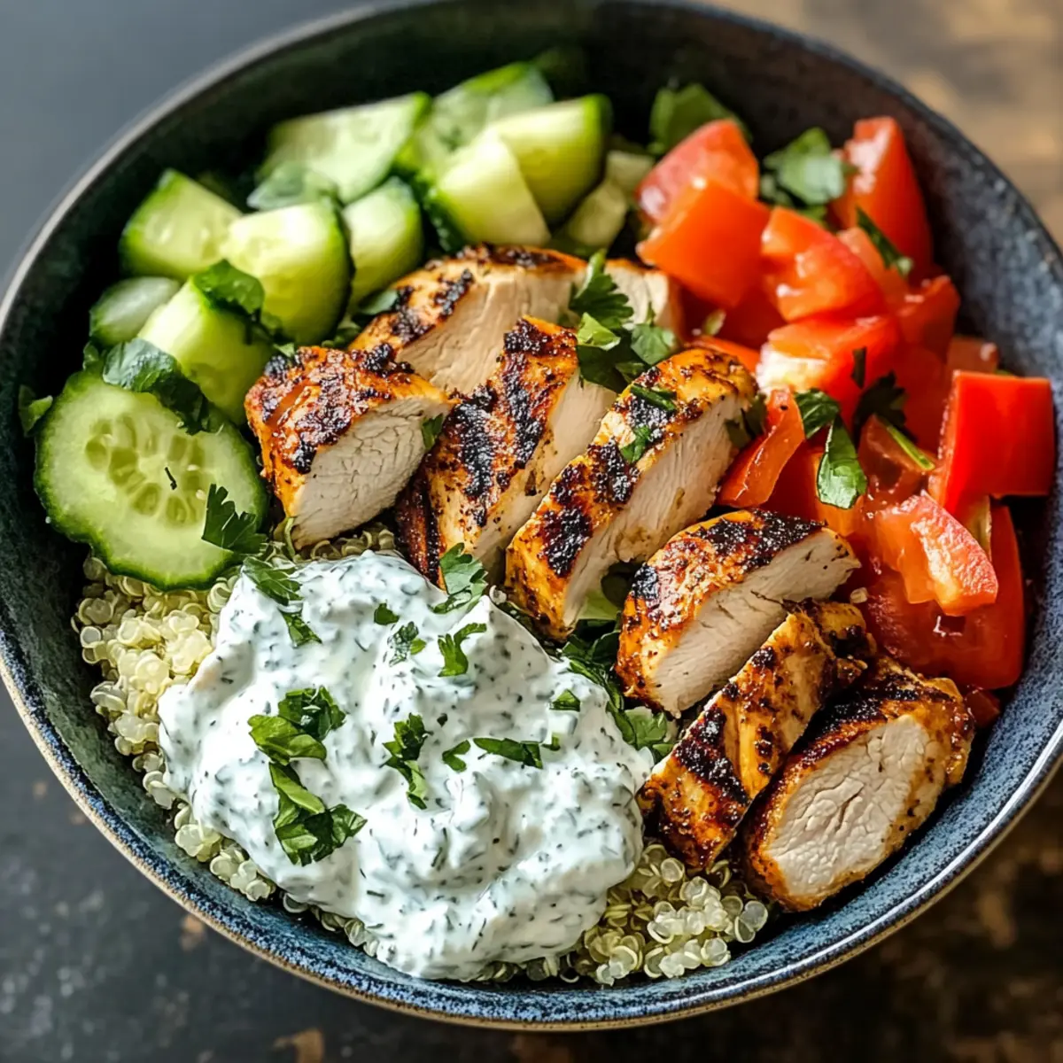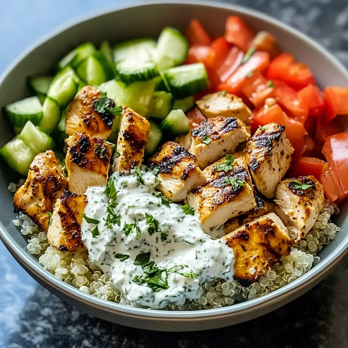 Als ich neulich über den Markt schlenderte, verzauberten mich die frischen Aromen der mediterranen Küche—die saftigen Zucchini, die leuchtenden Tomaten und das einladende Duftet von Kräutern. Diese inspirierenden Eindrücke führten mich zu meinem Rezept für Hühnchen Tzatziki Schalen. Diese köstliche und leichte Mahlzeit ist nicht nur schnell zubereitet, sondern bietet auch Platz für kreative Variationen wie Garnelen, Lamm oder Halloumi. Perfekt für hektische Abende oder als Highlight bei einem entspannten Mittagessen, vereint dieses Rezept gesunde Zutaten in einer harmonischen Kombination. Und das Beste? Du kannst die Schalen ganz nach deinem Geschmack anpassen! Bist du bereit, deine nächste Mahlzeit in ein mediterranes Fest zu verwandeln? Warum werden Sie dieses Rezept lieben? Vielfalt, die begeistert! Diese Hühnchen Tzatziki Schalen lassen sich leicht anpassen, egal ob Sie Garnelen, Lamm oder Halloumi verwenden möchten. Gesunde Zutaten sorgen für ein ausgewogenes Essen, das sowohl nahrhaft als auch schmackhaft ist. Schnelle Zubereitung: In kürzester Zeit zaubern Sie ein köstliches Gericht, ideal für hektische Wochentage. Mediterranes Flair bringt Abwechslung in Ihre Küche und begeistert Familie und Freunde gleichermaßen. Und wenn Sie nach inspirierenden Beilagen suchen, sind unsere gegrillten Hähnchen-Brokkoli-Schalen genau das Richtige! Hühnchen Tzatziki Schalen Zutaten Hinweis: Genieße die frischen Aromen, die diese Hühnchen Tzatziki Schalen so unwiderstehlich machen! Für das Hühnchen • Hähnchenbrust – Hauptprotein; stelle sicher, dass es entbeint und ohne Haut ist, um die Zubereitung zu erleichtern. • Olivenöl – Fügt Feuchtigkeit und Geschmack zur Marinade hinzu; kann durch Avocadoöl ersetzt werden für eine neutrale Option. • Zitronensaft – Sorgt für Säure und Frische; frisch ist ideal, aber auch aus der Flasche kann verwendet werden. • Knoblauch – Fügt Tiefe und Aroma hinzu; frische Zehen sind besser, aber Pulver kann alternativ genutzt werden. • Salz & Pfeffer – Essentielle Gewürze zum Abschmecken. Für das Tzatziki • Gurke – Schlüsselzutaten für Tzatziki; sorgt für Frische; kann durch Zucchini ersetzt werden, wenn nicht verfügbar, aber überflüssige Feuchtigkeit entfernen! • Griechischer Joghurt – Basis für Tzatziki, liefert Cremigkeit; kann durch pflanzlichen Joghurt für vegane Optionen ersetzt werden. • Frischer Dill – Bringt einen aromatischen Geschmack mit sich; getrockneter Dill kann als Ersatz verwendet werden, aber nur etwa 1 Teelöffel aufgrund der Intensität. Für die Schalen • Frisches Gemüse (optional) – Für zusätzlichen Crunch und Farbe; angebratene Paprika oder Paprika eignen sich hervorragend. • Körnerbasis (wahlweise) – Serviere die Schalen auf Quinoa, Couscous oder frischem Salat für eine gesunde, nahrhafte Grundlage. Diese Zutaten ergeben die köstlichen Hühnchen Tzatziki Schalen, die leicht und vielseitig sind und perfekt für dein nächstes Dinner geeignet sind! Schritt-für-Schritt-Anleitung für Hühnchen Tzatziki Schalen Step 1: Hähnchen marinieren Mische in einer Schüssel Olivenöl, Zitronensaft, zerdrückten Knoblauch, Salz und Pfeffer. Lege die entbeinte Hähnchenbrust in die Marinade und wende sie, sodass sie gleichmäßig bedeckt ist. Lasse das Hähnchen mindestens 30 Minuten marinieren, idealerweise jedoch 2-4 Stunden im Kühlschrank, damit die Aromen gut einziehen können. Step 2: Tzatziki vorbereiten Reibe die Gurke und presse überschüssige Feuchtigkeit aus, um ein wässriges Tzatziki zu vermeiden. In einer Schüssel vermische die ausdrückte Gurke mit griechischem Joghurt, gehacktem Knoblauch, frischem Dill, Salz und Pfeffer. Rühre alles gut um und stelle das Tzatziki für mindestens 30 Minuten im Kühlschrank kalt, damit sich die Aromen entfalten. Step 3: Hähnchen braten Erhitze eine Grillpfanne oder eine normale Pfanne bei mittlerer bis hoher Hitze. Lege die marinierten Hähnchenbrüste in die heiße Pfanne und grille sie für etwa 6-8 Minuten pro Seite, bis die Innentemperatur 74°C erreicht. Achte darauf, dass das Hähnchen schön gebräunt und mit Grillstreifen versehen ist, bevor du es aus der Pfanne nimmst. Step 4: Schalen anrichten Schneide das gegrillte Hühnchen in dünne Scheiben. Wähle eine Basis für deine Schalen, wie Quinoa, Couscous oder frischen Salat. Lege die geschnittenen Hähnchenstücke auf die Körnerbasis und füge großzügig das vorbereitete Tzatziki hinzu. Garnieren kannst du die Schalen mit frischem Gemüse, wie gegrillten Paprika oder bunten Tomaten, um Farbe und Crunch hinzuzufügen. Perfekte Vorbereitung der Hühnchen Tzatziki Schalen Diese Hühnchen Tzatziki Schalen sind ideal für die Vorbereitung im Voraus! Du kannst das Hähnchen bis zu 24 Stunden marinieren, was dazu beiträgt, die Aromen tief in das Fleisch einziehen zu lassen. Das Tzatziki lässt sich ebenfalls gut vorbereiten und kann bis zu 3 Tage im Kühlschrank aufbewahrt werden; achte nur darauf, die Gurke gut auszupressen, um ein Wässrigwerden zu vermeiden. Bei der finalen Zubereitung einfach das mariniertes Hähnchen in der Pfanne braten und in dünne Scheiben schneiden, bevor du es über die gewählte Körnerbasis legst. So hast du ein leckeres, gesundes Gericht mit minimalem Aufwand – perfekt für hektische Abende! Hühnchen Tzatziki Schalen Variationen Es gibt so viele Möglichkeiten, dieses Gericht nach deinem Geschmack zu gestalten und zu personalisieren! Garnelen: Tausche das Hühnchen gegen saftige Garnelen für ein schnelles, maritimes Geschmackserlebnis. Einfach marinieren und grillen! Lamm: Verwende zarte Lammsteaks für eine reichhaltigere und aromatische Variante. Lamm passt hervorragend zu frischen Kräutern im Tzatziki. Halloumi: Für eine vegetarische Option grillst du Halloumi. Er wird schön knusprig und bietet eine perfekte Textur zu den frischen Zutaten. Kichererbsen: Ersetze das Fleisch durch geröstete Kichererbsen für eine proteinreich
