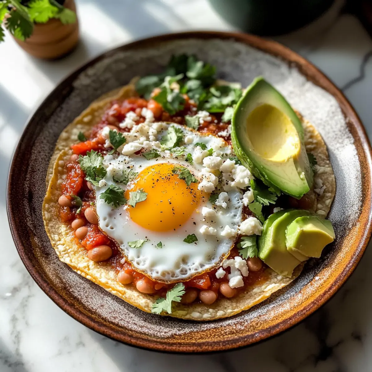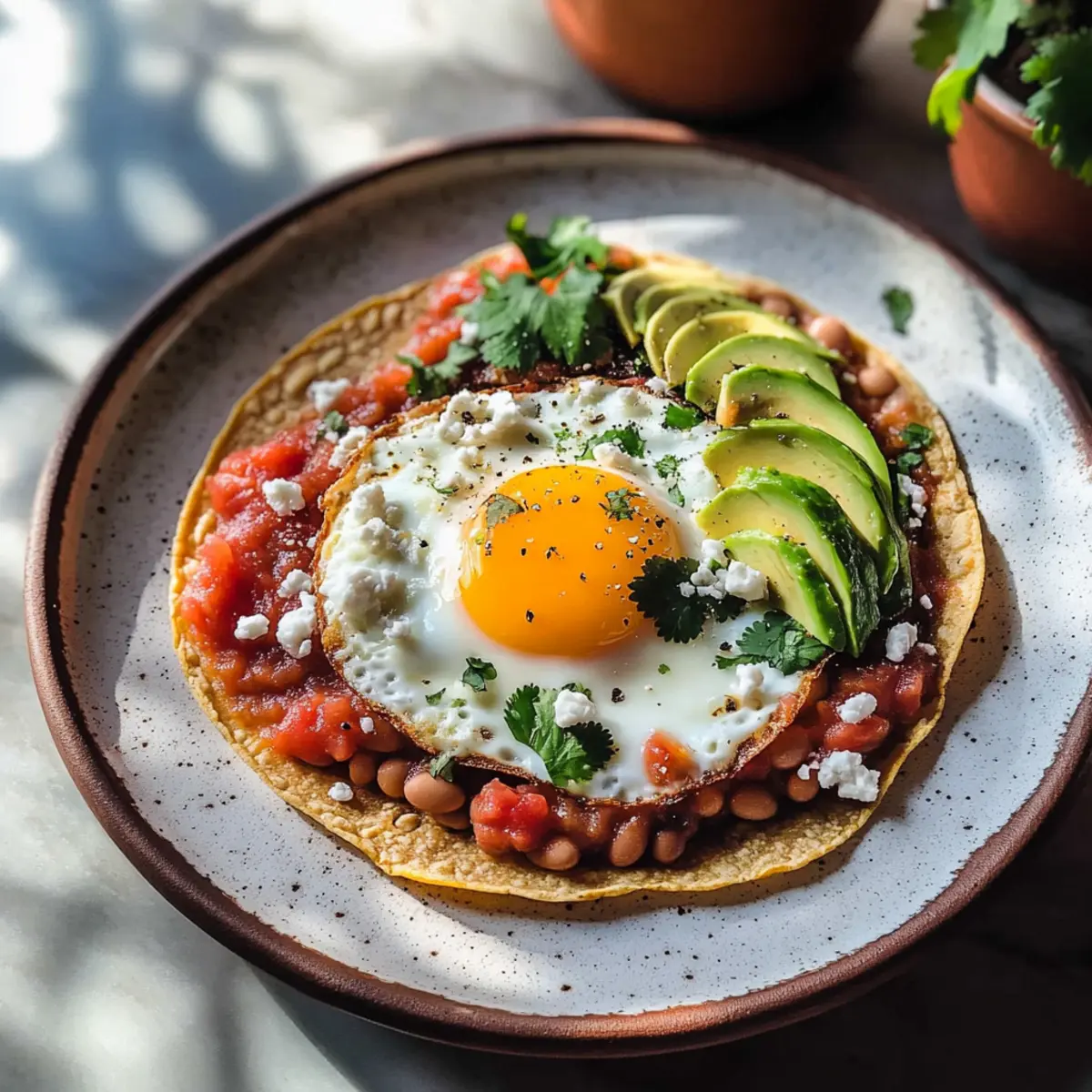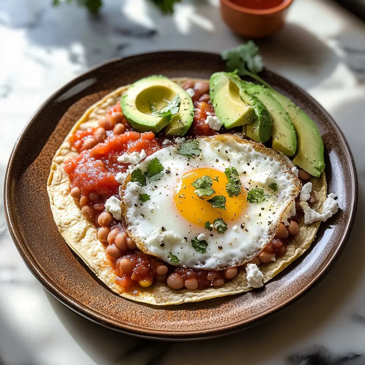 Wenn alle Komponenten zubereitet sind, beginne mit dem Anrichten. Verteile jeweils einen Löffel der warmen Refried Bohnen auf jede knusprige Tortilla. Platziere dann ein frisch gebratenes Ei auf jeder Bohne, gefolgt von einem großzügigen Löffel Salsa deiner Wahl.
