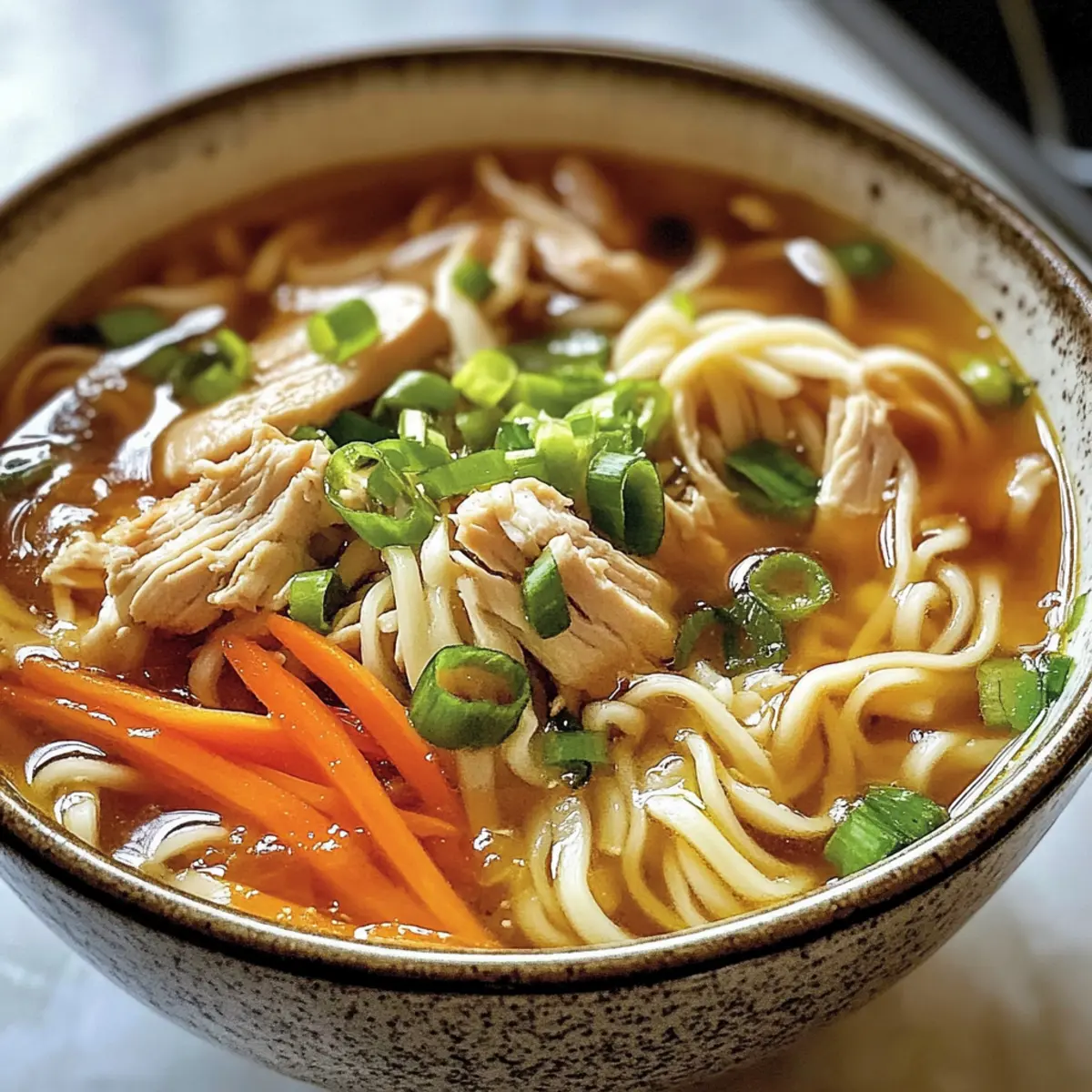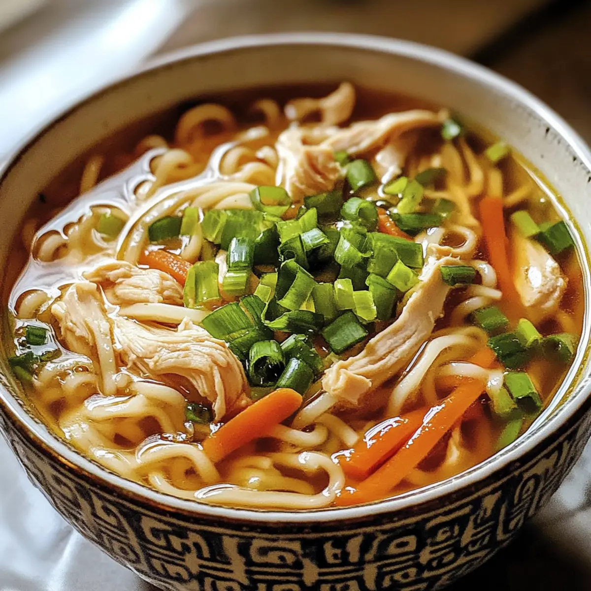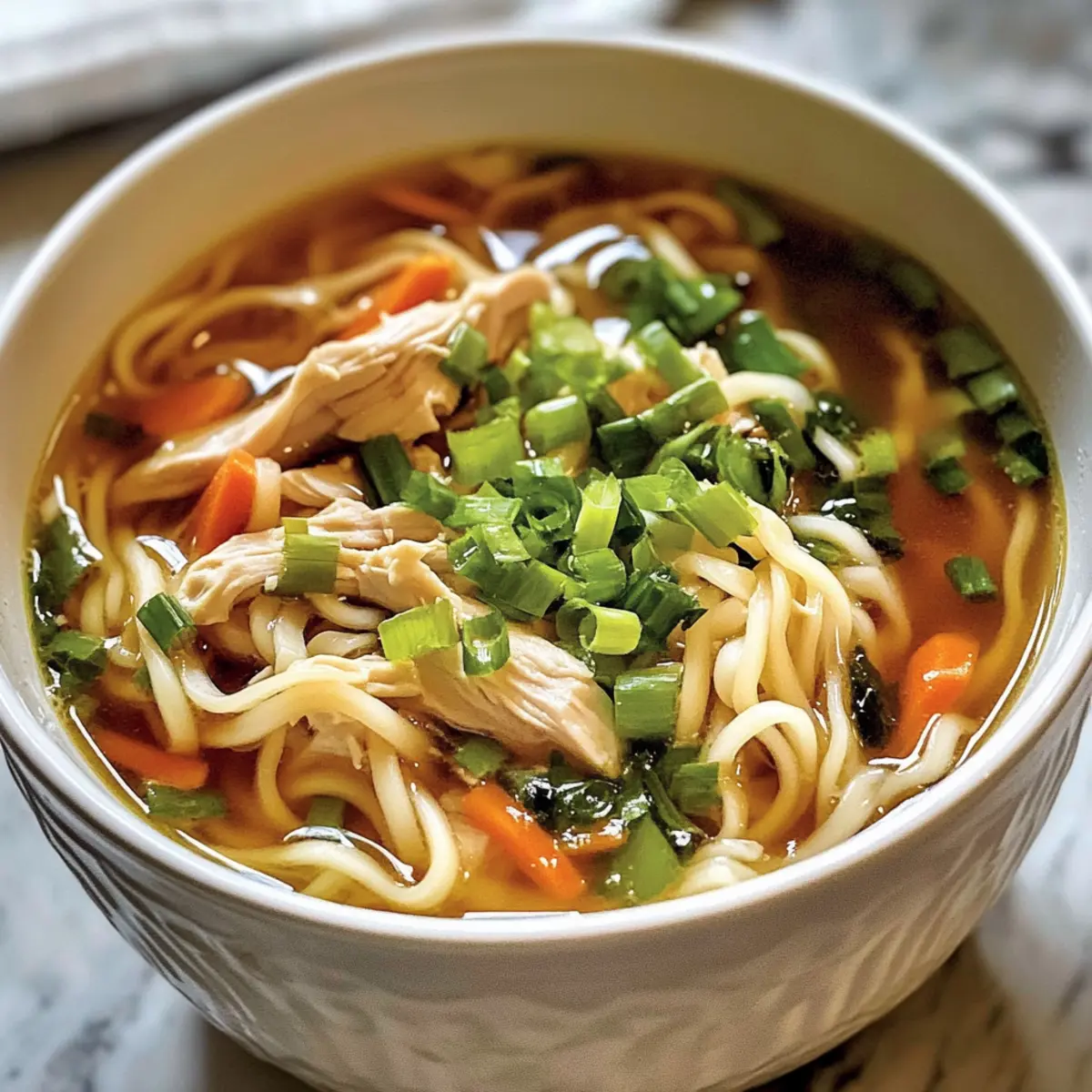 Als ich neulich den Duft von frisch gekochtem Ingwer und Frühlingszwiebeln in der Küche wahrnahm, fühlte ich mich sofort an meine Kindheit erinnert, als meine Mutter oft ihre köstliche Ingwer-Frühlingszwiebel-Hühnchen-Nudelsuppe zubereitete. Diese wärmende Suppe ist nicht nur ein wahrer Komfort für die kalten Tage, sondern auch eine herzliche Umarmung in einer Schüssel. Mit zartem Hühnchen, weichen Nudeln und einem geschmackvollen Brühe, die reich an aromatischen Zutaten ist, bietet sie eine frische Wendung des klassischen Rezepts. Der große Vorteil? Sie ist schnell zubereitet und lässt sich leicht anpassen, sodass jeder die perfekten Aromen nach seinem Geschmack treffen kann. Wer kann da schon widerstehen? Lass uns gemeinsam in die Welt dieser wohltuenden Suppe eintauchen, um herauszufinden, wie wir sie ganz nach unserem Gusto gestalten können! Warum ist diese Suppe so besonders? Wärmend und herzhaft: Diese Ingwer-Frühlingszwiebel-Hühnchen-Nudelsuppe ist wie eine Umarmung an kalten Tagen. Einfach anzupassen: Egal, ob du Gemüse hinzuzufügen oder die Nudeln wechseln möchtest, die Anpassungsfähigkeit ist grenzenlos! Schnell zubereitet: Mit nur wenigen einfachen Schritten kannst du in kürzester Zeit ein kulinarisches Meisterwerk schaffen. Familienfreundlich: Ideal für alle Altersgruppen – von kleinen Feinschmeckern bis zu anspruchsvollen Erwachsenen. Diese Suppe wird alle begeistern! Ingwer-Frühlingszwiebel-Hühnchen-Nudelsuppen Zutaten Diese köstliche Suppe ist nicht nur leicht zuzubereiten, sondern auch anpassbar für jeden Geschmack! Für die Brühe Hühnchenschenkel (ohne Haut und Knochen) – Diese sind die Hauptquelle für Proteine und sorgen für eine saftige Konsistenz in der Suppe. Alternativ können Hähnchenbrüste verwendet werden, allerdings muss die Garzeit angepasst werden. Knoblauch (6 Zehen) – Verleiht der Suppe eine aromatische Tiefe, wenn er sanft angebraten wird. Ingwer (3 Zoll, geschält und fein gehackt) – Fügt eine angenehme Wärme und Frische hinzu, die das Gericht lebendig macht. Frühlingszwiebeln (200-230 g, geteilt) – Bieten einen knackigen Biss; die weißen Teile werden gekocht, während die grünen für die Garnierung verwendet werden. Koscheres Salz (4 TL) – Verstärkt die Aromen der Zutaten; die Menge kann nach Geschmack angepasst werden. Frisch gemahlener Pfeffer – Sorgt für eine feine Würze und zusätzliche Geschmackstiefe in der Brühe. Wasser (2,5 l) – Die Basis der Brühe, in der die Aromen verströmt werden. Für die Nudeln und Gemüse Getrocknete Ramen- oder Locken-Nudeln (225 g) – Sorgen für das charakteristische, tröstende Element in der Suppe; darauf achten, dass die Textur zart, aber nicht matschig ist. Karotte (1 Tasse, in dünne Streifen geschnitten) – Fügt nicht nur Süße, sondern auch eine schöne Farbe hinzu; kann durch andere Gemüsesorten wie Pak Choi ersetzt werden. Für die Würze Schwarzer Reisessig (60 ml) – Bringt einen angenehmen Säuregehalt; kann auch durch Reis- oder Weißweinessig ersetzt werden. Sojasauce (60 ml) – Gibt der Brühe tiefe Umami-Geschmäcker. Geröstetes Sesamöl (30 ml) – Fügt ein nussiges Aroma hinzu; frisches Sesamöl hat einen stärkeren Geschmack. Crispy Chili Öl – Ideal für Schärfeliebhaber, kann nach Geschmack hinzugefügt werden, um dem Gericht eine zusätzliche Geschmackstiefe zu verleihen. Mit diesen Zutaten wird die Ingwer-Frühlingszwiebel-Hühnchen-Nudelsuppe zu deinem neuen Lieblingsgericht, das nicht nur satt macht, sondern auch gut für die Seele ist! Step-by-Step Instructions für Ingwer-Frühlingszwiebel-Hühnchen-Nudelsuppe Step 1: Brühe kochen Gib die Hühnchenschenkel, den geschnittenen Knoblauch, den fein gehackten Ingwer, die weißen Teile der Frühlingszwiebeln, das koschere Salz und frisch gemahlenen Pfeffer in einen großen Topf. Fülle diesen mit 2,5 Litern Wasser und bringe die Mischung zum Kochen. Reduziere die Hitze auf mittlere Stufe und lasse die Brühe 15 Minuten lang ohne Deckel köcheln, bis das Hühnchen zart und durchgegart ist. Step 2: Sauce zubereiten Während die Brühe kocht, bereite die Sauce vor. Vermische in einer kleinen Schüssel 60 ml schwarzen Reisessig, 60 ml Sojasauce und 30 ml geröstetes Sesamöl mit einem Schneebesen. Schmecke die Mischung ab und füge nach Belieben etwas Crispy Chili Öl hinzu, um mehr Schärfe zu erreichen. Die Sauce wird die Suppe geschmacklich aufwerten. Step 3: Hühnchen zerkleinern Nehme die gegarten Hühnchenschenkel aus dem Topf und lasse sie auf einem Schneidebrett kurz abkühlen. Verwende zwei Gabeln, um das Hühnchen in zarte Stücke zu zerkleinern. Stelle das zerkleinerte Hühnchen vorerst beiseite, während du die Nudeln und das Gemüse zubereitest. Step 4: Nudeln und Karotten hinzufügen Füge die getrockneten Ramen- oder Locken-Nudeln und die dünn geschnittene Karotte in die Brühe im Topf hinzu. Koche alles unter ständigem Rühren gemäß der Packungsanweisung für 3-4 Minuten, bis die Nudeln zart sind. Achte darauf, das Nudelwasser nicht zu stark sprudeln zu lassen, um ein Überkochen zu vermeiden. Step 5: Hühnchen zurückgeben Sobald die Nudeln fertig sind, gib das zerkleinerte Hühnchen zurück in den Topf. Rühre sanft um und lasse die Suppe für eine weitere Minute bei niedriger Hitze erwärmen. Überprüfe die Gewürze und füge bei Bedarf mehr Salz oder Pfeffer hinzu, um die Ingwer-Frühlingszwiebel-Hühnchen-Nudelsuppe perfekt abzustimmen. Step 6: Anrichten und servieren Verteile die heiße Ingwer-Frühlingszwiebel-Hühnchen-Nudelsuppe in Schalen. Garniere jede Portion großzügig mit den grünen Teilen der Frühlingszwiebeln und beträufele sie mit der zuvor zubereiteten Sauce. Biete zusätzlich Crispy Chili Öl für die Liebhaber von Schärfe an, damit jeder nach Geschmack anpassen kann. Ingwer-Frühlingszwiebel-Hühnchen-Nudelsuppe Variationen Lass deiner Kreativität freien Lauf und passe diese köstliche Suppe nach deinem Geschmack an! Fleisch-Optionen: D