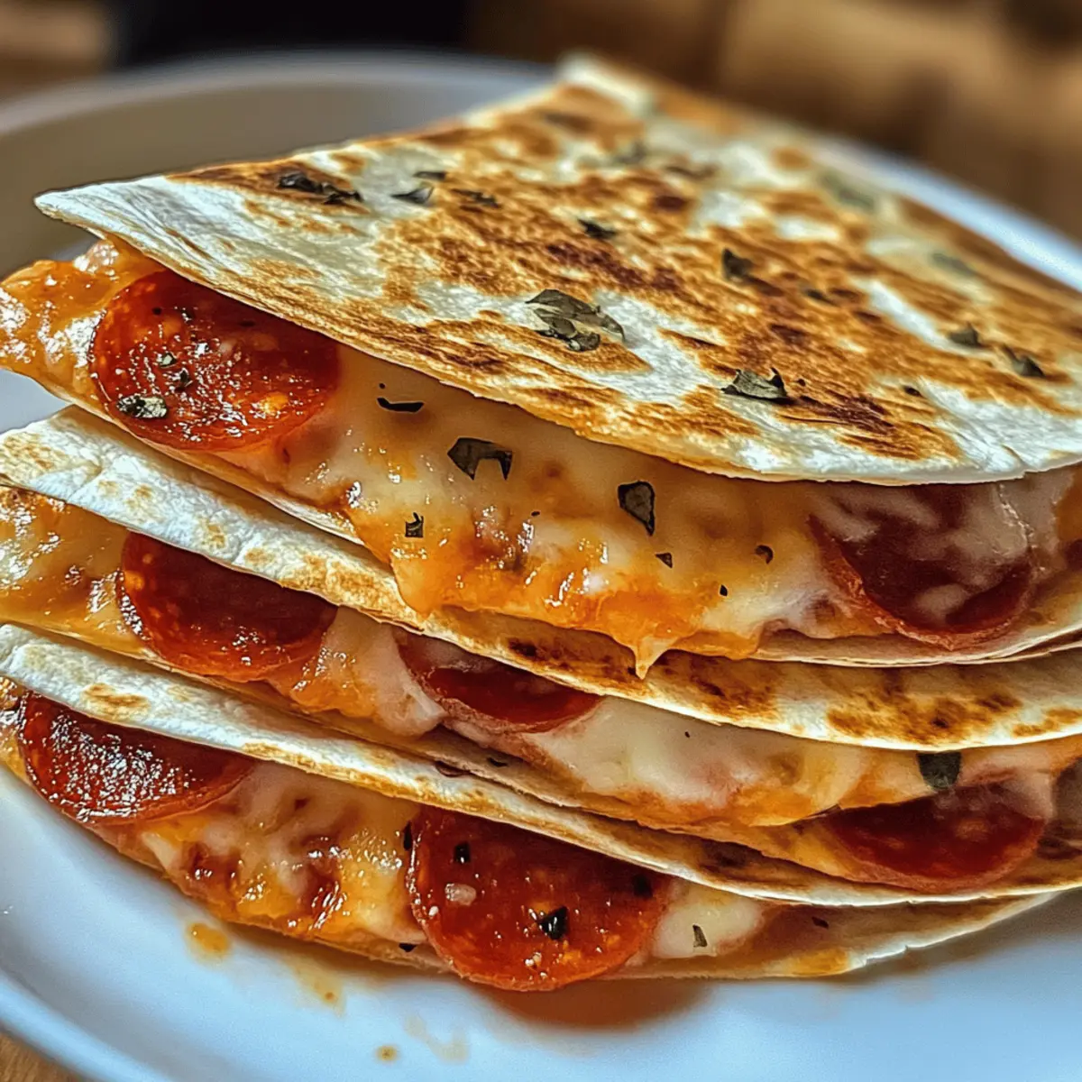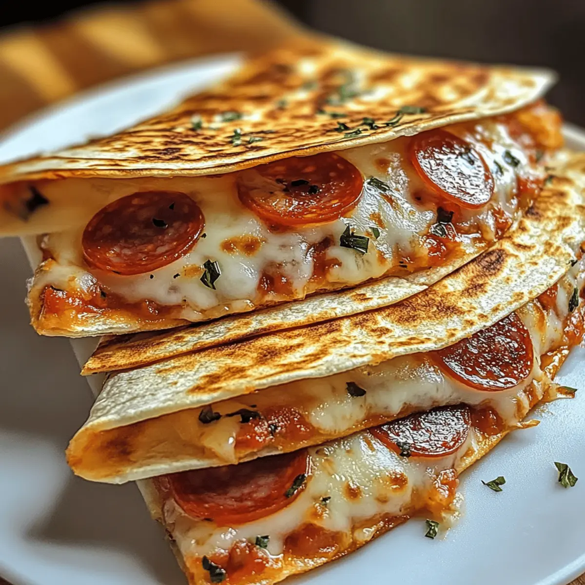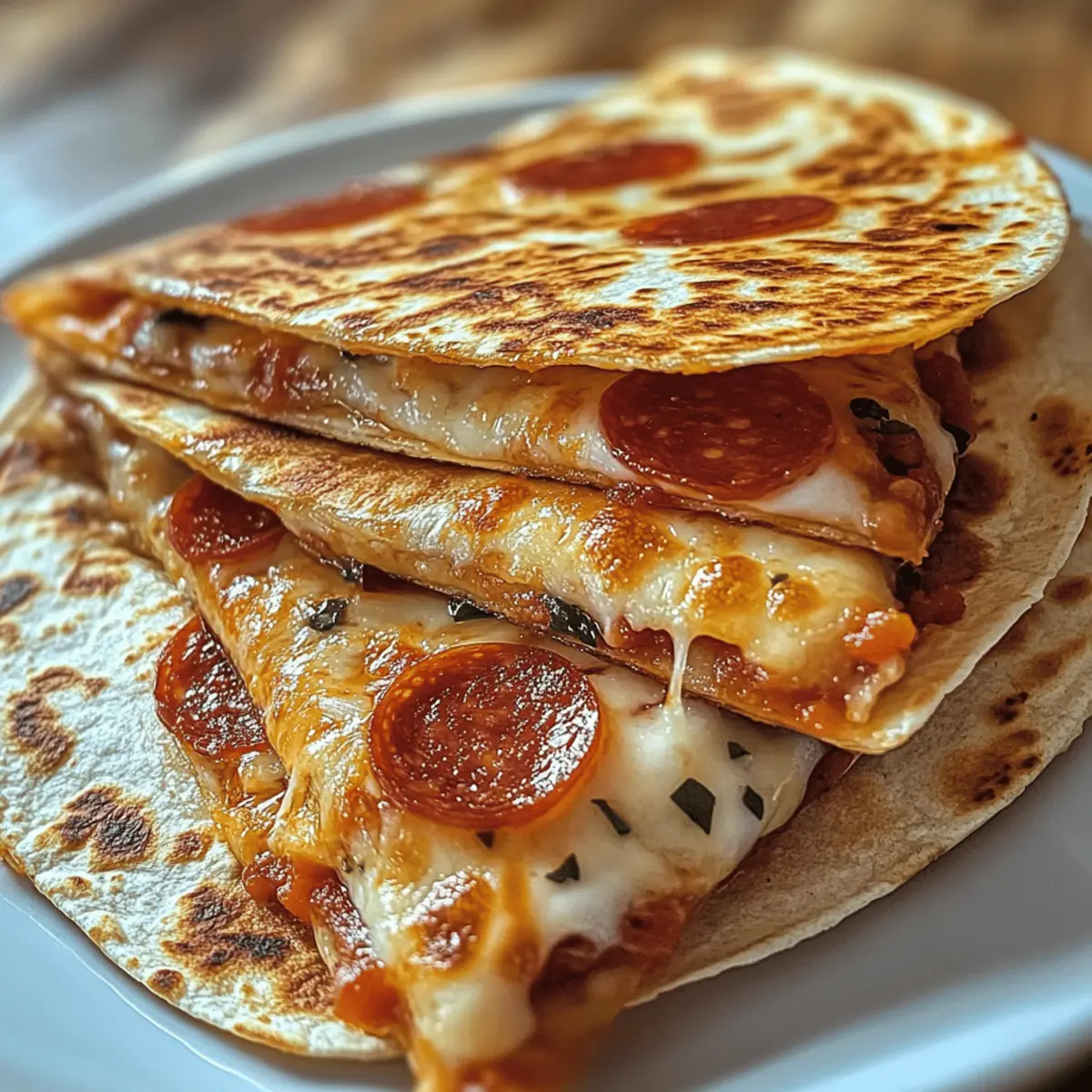 Könnte es etwas Schöneres geben, als in der kühleren Abendluft bei einem frisch zubereiteten Snack zusammenzukommen? Diese unwiderstehlichen Pepperoni Quesadillas sind nicht nur ein Genuss, sondern auch der perfekte schnelle Snack für unbeschwerte Abende mit der Familie. In weniger als 20 Minuten zaubern Sie eine köstliche Kombination aus knusprigen Tortillas, schmelzendem Mozzarella und herzhaftem Pfefferminzwurst, die alle glücklich macht. Und das Beste daran? Sie sind vollständig anpassbar, sodass Sie mit verschiedenen Füllungen experimentieren können—ob Sie nun die klassische Variante oder eine pflanzenbasierte bevorzugen. Neugierig, was diese Quesadillas noch zu bieten haben? Warum werden diese Quesadillas geliebt? Schnelligkeit, mit nur 20 Minuten Zubereitungszeit sind diese Quesadillas die ideale Lösung für das Abendessen nach einem langen Tag. Vielseitigkeit: Mit einer Auswahl an Füllungen, von klassischer Pepperoni bis zu gesundheitsbewussten veganen Alternativen, ist für jeden Geschmack etwas dabei. Familienfreundlich: Einfache Zubereitung und jederzeit genussvoll – die ganze Familie wird begeistert sein! Crispy Genuss: Die perfekte Kombination aus goldbraun knusprigen Tortillas und geschmolzenem Käse – ein Genuss, der zum Dahinschmelzen bringt. Einfaches Experimentieren: Variieren Sie Zutaten nach Lust und Laune; wir empfehlen, diese mit frischem Gemüse oder verschiedenen Käsesorten zu kombinieren. Probieren Sie auch unsere anderen Snack-Rezepte für mehr Inspiration! Quesadilla Zutaten • Diese köstlichen Pepperoni Quesadillas sind einfach zuzubereiten! Für die Tortillas Mehl-Tortillas – Sie bilden die Grundlage und sollten groß genug sein, um die Füllung gut zu halten. Für die Füllung Puten-Pfefferminzwurst – Verleiht Geschmack und Protein; kann durch pflanzliche Wurst ersetzt werden für eine vegetarische Alternative. Geriebener Mozzarella – Sorgt für das schmelzende Vergnügen; kann auch durch Cheddar oder Monterey Jack ersetzt werden für unterschiedliche Geschmacksmöglichkeiten. Knoblauchpulver – Für extra Geschmack; frischer, gehackter Knoblauch kann ebenfalls verwendet werden. Italienische Gewürzmischung – Hebt die Aromen; optional und nach Geschmack anpassbar. Für das Kochen Butter oder Olivenöl – Für das Braten, um eine goldbraune, knusprige Textur zu erzielen; beide können austauschbar verwendet werden. Für das Dippen Pizzasoße – Zum Bestreichen der Tortillas und zum Eintunken; jede bevorzugte Pizza- oder Marinara-Soße kann verwendet werden. Step-by-Step Instructions für Irresistible Pepperoni Quesadillas Step 1: Tortillas vorbereiten Bestreichen Sie eine Seite jeder Mehl-Tortilla gleichmäßig mit Pizzasoße. Achten Sie darauf, die Sauce bis zum Rand zu verteilen, um ein Auslaufen beim Falten der Quesadillas zu vermeiden. Dies sorgt für zusätzlichen Geschmack und ein saftiges Ergebnis. Step 2: Käse hinzufügen Streuen Sie den geriebenen Mozzarella gleichmäßig über die Sauce auf jeder Tortilla. Verwenden Sie ausreichend Käse, um eine cremige Füllung zu gewährleisten, die beim Erhitzen schmilzt und die Quesadillas zusammenhält. Step 3: Füllung schichten Legen Sie die Puten-Pfefferminzwurst über den Käse und würzen Sie alles mit Knoblauchpulver und italienischer Gewürzmischung. Diese Gewürze verstärken den Geschmack und geben den Quesadillas einen aromatischen Kick. Step 4: Tortillas falten Falten Sie jede Tortilla vorsichtig in der Mitte, sodass die Füllungen eingeklemmt sind. Drücken Sie die Ränder leicht zusammen, um eine gute Versiegelung zu gewährleisten, die hilft, dass beim Braten die Füllung nicht herausfällt. Step 5: Quesadillas braten Heizen Sie eine Pfanne bei mittlerer Hitze vor und geben Sie ein wenig Butter oder Olivenöl hinein. Sobald das Fett heiß ist und schimmert, legen Sie die gefalteten Tortillas hinein. Braten Sie sie 2-3 Minuten lang auf jeder Seite, bis sie goldbraun und knusprig sind. Step 6: Quesadillas schneiden und servieren Nehmen Sie die Quesadillas aus der Pfanne und lassen Sie sie kurz abkühlen. Schneiden Sie sie mit einem scharfen Messer in Keile und servieren Sie sie warm mit zusätzlicher Pizzasoße zum Dippen. Genießen Sie diese unwiderstehlichen Pepperoni Quesadillas mit der ganzen Familie! Lagerungstipps für Pepperoni Quesadillas Zimmertemperatur: Lassen Sie die Quesadillas nach dem Braten auf einem Gitterrost abkühlen, um eine matschige Unterseite zu vermeiden. Genießen Sie sie frisch zubereitet! Kühlschrank: Bewahren Sie die gekochten Quesadillas in einem luftdichten Behälter auf, um sie bis zu 3 Tage lang frisch zu halten. Stellen Sie sicher, dass sie abgekühlt sind, bevor Sie sie lagern. Gefriertruhe: Einfrieren Sie ungekochte, vorbereitete Quesadillas, indem Sie sie mit Frischhaltefolie umwickeln und in einem Gefrierbeutel aufbewahren. Sie sind bis zu 2 Monate haltbar. Wiedererwärmung: Erhitzen Sie die Quesadillas im Ofen für 10–15 Minuten bei 180 °C oder in einer Pfanne bei mittlerer Hitze, bis der Käse wieder schmilzt und die Tortilla knusprig ist. Variationen & Alternativen Passen Sie Ihre Quesadillas nach Lust und Laune an und entdecken Sie neue Geschmackserlebnisse! Vegetarisch: Ersetzen Sie die Puten-Pfefferminzwurst durch pflanzliche Alternativen wie gebratene Auberginen oder saisonales Gemüse. Käsevielfalt: Nutzen Sie verschiedene Käsesorten wie Cheddar oder Gouda für einen intensiveren Geschmack und eine neue Geschmackstiefe. Extra würzig: Fügen Sie jalapeños oder eine Prise Cayennepfeffer hinzu, um Ihrer Quesadilla einen spannenden Kick zu verleihen. Tex-Mex-Style: Integrieren Sie schwarze Bohnen und frische Salsa in die Füllung für einen herzhaften mexikanischen Genuss. Fruchtige Süße: Ergänzen Sie die Quesadilla mit dünn geschnittenen Ananasstücken oder Äpfeln, um eine süße Note hinzuzufügen. Dipp-Option: Verwenden Sie verschiedene Dips wie Guacamole oder Sauerrahm als köstliche Begleitung; für mehr Abw