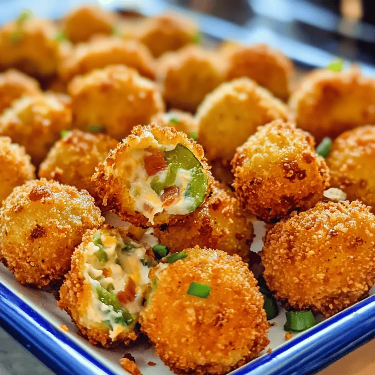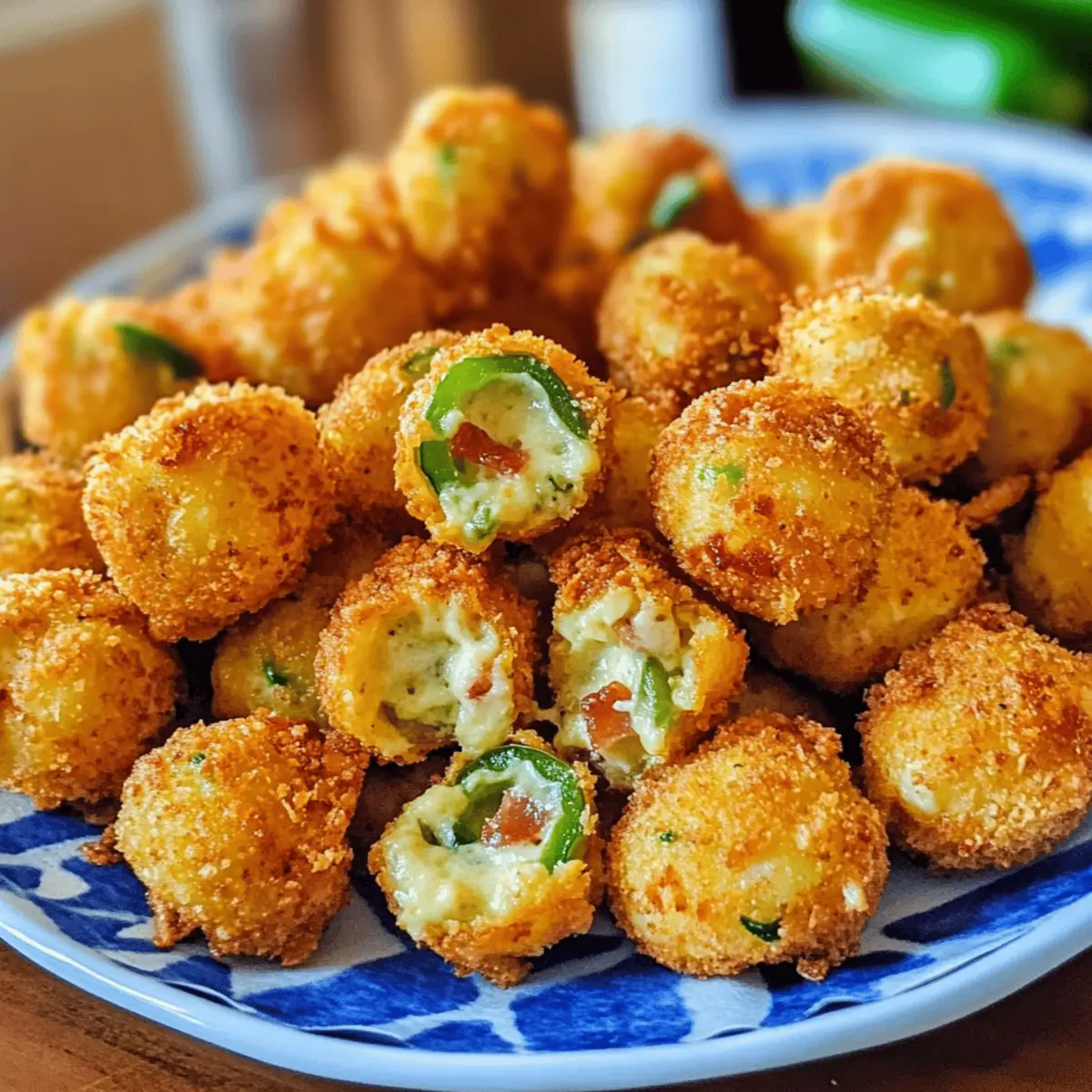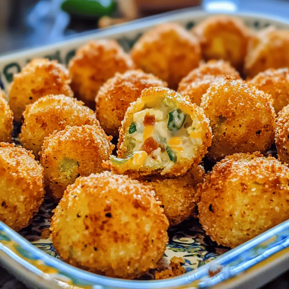 Es gibt kaum einen Snack, der so viel Freude bereitet wie diese knusprigen Jalapeño Popper Bites. Mit einer Kombination aus cremigem Käse, rauchigem Speck und einer Prise Schärfe sind sie die perfekte Wahl für gesellige Abende, spannende Spielnächte oder einfach als Teil eines köstlichen Snack-Buffets. Was ich an diesem Rezept besonders liebe, ist die Flexibilität: Die Bites sind nicht nur einfach zuzubereiten, sondern lassen sich auch nach Belieben anpassen, um jedem Geschmack gerecht zu werden. Egal, ob du es feurig magst oder lieber eine mildere Variante bevorzugst, mit diesen Jalapeño Popper Bites kannst du garantiert jeden begeistern. Bist du bereit, deine nächste Snack-Session auf das nächste Level zu heben? Warum sind diese Jalapeño Popper Bites unwiderstehlich? Köstlicher Crunch: Diese Jalapeño Popper Bites bieten einen unwiderstehlichen Knusper-Moment, der in Kombination mit dem cremigen Käse und dem rauchigen Speck jeden Snackliebhaber begeistert. Anpassbar: Du kannst die Schärfe mit verschiedenen Jalapeños und Sriracha anpassen, sodass sie für jeden Gaumen geeignet sind – von mild bis feurig! Schnell zubereitet: Innerhalb kürzester Zeit kannst du diese leckeren Bites zubereiten und sie sind perfekt für spontane Gäste oder gemütliche Abende mit Freunden. Vielfältige Serviervorschläge: Diese Bites passen hervorragend zu frischer Salsa oder cremigem Ranch-Dip und verwandeln jedes Snack-Buffet in ein Fest! Geselliges Erlebnis: Sie sind die ideale Fingerfood-Option für Partys oder Game Nights und sorgen garantiert für Begeisterung bei deinen Gästen. Lange Haltbarkeit: Bereite die Bites bis zu 2 Tage im Voraus vor und friere sie ein, so hast du immer einen leckeren Snack parat! Jalapeño Popper Bites Zutaten Für die Füllung: • Frischkäse – sorgt für eine cremige Basis und bindet die Füllung; kann durch weichen Ziegenkäse für mehr Geschmack ersetzt werden. • Pepper Jack Käse – fügt einen würzigen Geschmack hinzu; kann durch Cheddar oder Monterey Jack für einen milderen Geschmack ersetzt werden. • Jalapeños – sorgt für Schärfe und Geschmack; du kannst mildere Paprika verwenden oder die Samen entfernen für eine weniger scharfe Variante. • Zerkleinerteter Speck – verleiht Rauchigkeit und Textur; kann durch zerbröckelten Wurst oder ganz weggelassen werden für eine vegetarische Option. • Sriracha-Sauce – verstärkt die Schärfe; passe die Menge an oder lasse sie weg für eine weniger scharfe Version. Für die Panade: • Allzweckmehl – für eine gleichmäßige Beschichtung beim Frittieren und sorgt dafür, dass die Panade haftet. • Panko-Semmelbrösel – sorgt für eine knusprige Textur; reguliere Semmelbrösel können anstelle von Panko verwendet werden, wenn dies nicht verfügbar ist. • Normale Semmelbrösel – helfen bei der Textur und der Haftung in der Panade. • Knoblauchpulver – fügt Geschmackstiefe hinzu; frischer, gehackter Knoblauch kann für einen intensiveren Geschmack verwendet werden. • Cayennepfeffer – sorgt für zusätzliche Schärfe; lass ihn weg für nicht scharfe Bites. • Salz & Pfeffer – zur Geschmacksverbesserung. Für die Bindung: • Eier – binden die Panade; Flachseier können als vegane Option verwendet werden. Für das Frittieren: • Erdnussöl oder Rapsöl – wird zum Frittieren verwendet; auch pflanzliches Öl kann verwendet werden. Schritt-für-Schritt-Anleitung für Crispy Jalapeño Popper Bites Schritt 1: Füllung zubereiten In einer großen Schüssel Frischkäse, Pepper Jack Käse, gewürfelte Jalapeños, zerkleinerten Speck und Sriracha gut vermengen. Achte darauf, dass die Mischung gleichmäßig ist und alle Zutaten gut miteinander verbunden sind. Das dauert etwa 5 Minuten. Die Konsistenz sollte cremig und leicht zu formen sein, damit die Bites später gut zusammenhalten. Schritt 2: Bites formen und einfrieren Nutze einen Esslöffel, um Portionen der Füllung abzunehmen, und forme diese zu kleinen Bällchen, etwa so groß wie ein Tischtennisball. Lege die Bällchen auf ein mit Backpapier ausgelegtes Backblech und stelle sicher, dass sie genügend Platz haben. Für etwa 30 Minuten in den Gefrierer legen, damit sie fest werden und beim Frittieren nicht auseinanderfallen. Schritt 3: Panierstation einrichten Bereite deine Panierstation vor, indem du drei große Schalen bereitstellst. Fülle die erste mit Allzweckmehl, die zweite mit verquirlten Eiern und die dritte mit einer Mischung aus Panko- und normalen Semmelbröseln, gewürzt mit Knoblauchpulver, Cayennepfeffer, Salz und Pfeffer. Stelle sicher, dass alles griffbereit ist, während du die Jalapeño Popper Bites panierst. Schritt 4: Öl erhitzen Erhitze in einem großen Topf Erdnuss- oder Rapsöl auf einer Temperatur zwischen 365 und 375°F (185 bis 190°C). Verwende ein Küchenthermometer, um die Temperatur zu überprüfen. Das Öl sollte heiß genug sein, um beim Eintauchen der Bites eine sanfte Blasenbildung zu erzeugen, was auf die richtige Frittiertemperatur hinweist. Schritt 5: Bites panieren Nimm die gefrorenen Bällchen aus dem Gefrierer und wälze sie zuerst im Mehl, um eine dünne Schicht zu bilden. Tauche sie dann in die verquirlten Eier, sodass sie gut bedeckt sind. Schließlich rolle die Bites in der Paniermischung aus Panko- und normalen Semmelbröseln, bis sie vollständig ummantelt sind. Dieser Schritt sorgt für den perfekten Knusper. Schritt 6: Frittieren Lass die panierten Jalapeño Popper Bites vorsichtig in das heiße Öl gleiten. Frittiere sie für etwa 30 Sekunden oder bis sie goldbraun sind. Achte darauf, dass du sie nicht überfüllst, da sie mehr Öl aufnehmen könnten und nicht gleichmäßig garen. Verwende einen Schaumlöffel, um sie vorsichtig aus dem Öl zu heben, wenn sie fertig sind. Schritt 7: Abtropfen lassen und servieren Entferne die frittierten Bites aus dem Öl und lasse sie auf einem mit Küchenpapier ausgelegten Teller abtropfen. Dies entfernt überschüssiges Öl und sorgt für