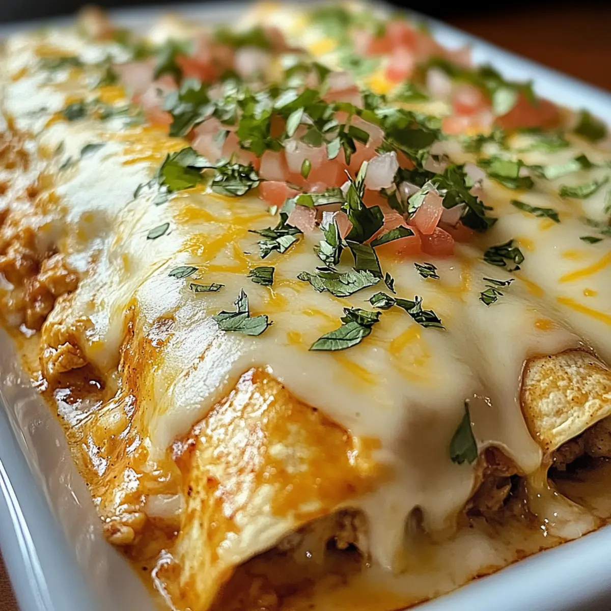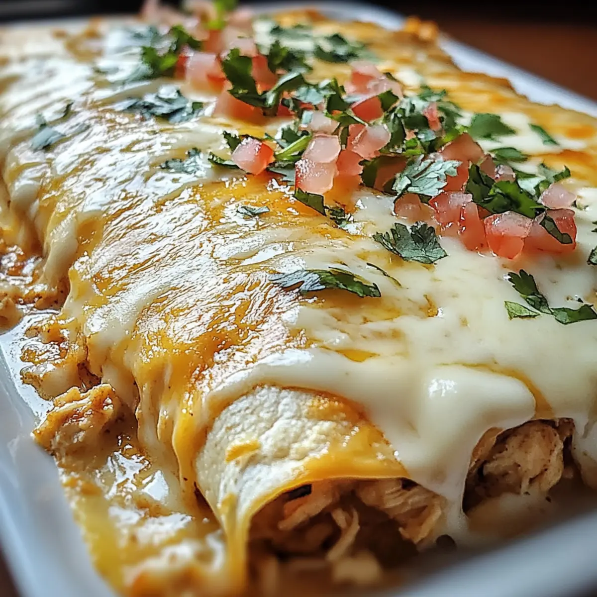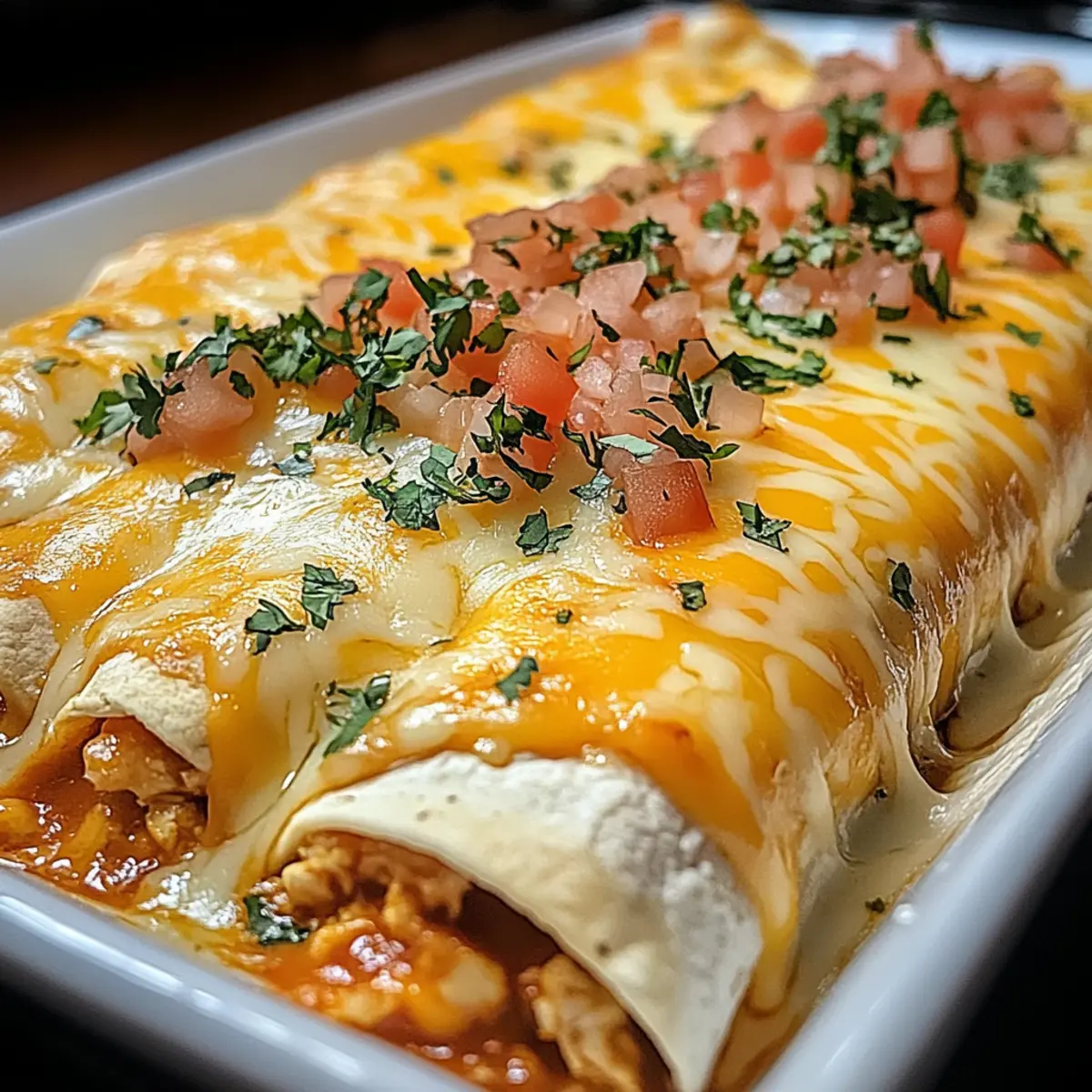 Wusstest du, dass man mit nur wenigen Zutaten ein echtes Festmahl zaubern kann? Die Käse-Hähnchen-Enchiladas sind nicht nur ein schneller Genuss, sondern auch das perfekte Rezept für alle, die sich eine köstliche Abwechslung von Fast Food wünschen. In nur 10 Minuten bereitet ihr dieses Spiel aus weichen Tortillas, cremigem Hähnchen und schmelzendem Käse vor, das eure Familie und Freunde lieben werden. Egal, ob ihr kreative Variationen mit verschiedenen Proteinen und Toppings ausprobieren oder einfach nur die herzliche Umarmung einer klassischen, mexikanischen Genussreise erleben möchtet – dieses Gericht bringt Wärme und Zufriedenheit auf den Tisch. Seid dabei, wenn wir diese unwiderstehlichen Enchiladas zubereiten und entdeckt, welche köstlichen Möglichkeiten sich für euer Abendessen bieten! Warum sind Käse-Hähnchen-Enchiladas so beliebt? Einfachheit: Mit nur wenigen Zutaten sind diese Enchiladas in nur 10 Minuten zubereitet und perfekt für stressige Abende. Vielseitig: Egal, ob ihr Hühnchen, Gemüse oder sogar Bohnen verwenden möchtet, die Anpassungsmöglichkeiten sind nahezu unbegrenzt. Familienfreundlich: Jeder liebt schmelzenden Käse und herzhaftes Hähnchen – ein Gericht, das die ganze Familie zusammenbringt! Sättigend: Diese köstlichen Enchiladas sind nicht nur lecker, sondern auch nahrhaft und bieten eine tolle Balance von Protein und Kohlenhydraten. Perfekte Textur: Die Kombination aus weichen Tortillas, cremiger Füllung und geschmolzenem Käse sorgt für ein unwiderstehliches Geschmackserlebnis – ein echter Genuss! Entdeckt weitere kreative Ideen, wie ihr diese Enchiladas verfeinern könnt, zum Beispiel mit verschiedenen Toppings und Beilagen. Käse-Hähnchen-Enchiladas Zutaten • Mit den folgenden Zutaten zaubert ihr die perfekten Käse-Hähnchen-Enchiladas! Für die Füllung Zerkrümeltes Hähnchen – Hauptprotein; verwendet gekaufte Rotisserie-Hähnchen für mehr Bequemlichkeit. Taco-Gewürz – Gibt dem Hähnchen Geschmack; ein Päckchen oder selbstgemachte Variante für milderen Geschmack wählen. Sauerrahm – Sorgt für Cremigkeit und balanciert die Aromen; griechischer Joghurt kann eine gesündere Alternative sein. Geriebener Cheddar-Käse – Trägt zum schmelzigen Käsegeschmack bei; alternativ Monterey Jack oder Pepper Jack verwenden. Gehackte grüne Chilischoten – Fügt Würze und Geschmack hinzu; für eine mildere Version weglassen oder Jalapeños für mehr Schärfe verwenden. Für die Käsesauce Velveeta-Käse – Schafft eine glatte, cremige Käsesauce; überlegt, ob ihr fettarmen Velveeta für eine leichtere Option verwenden wollt. Würfelige Tomaten mit grünen Chilischoten – Verleiht der Sauce zusätzlichen Geschmack; nicht abtropfen lassen für ein reichhaltigeres Ergebnis. Für die Enchiladas Tortillas – Hüllen für die Enchiladas; wählt zwischen Mais-, Weizen- oder Vollkorn-Tortillas basierend auf diätetischen Vorlieben. Diese Zutaten kombinieren sich zu einem unwiderstehlichen Gericht, das garantiert ein Hit mit Familie und Freunden wird! Schritt-für-Schritt-Anleitungen für Käse-Hähnchen-Enchiladas Step 1: Ofen vorheizen Heize deinen Ofen auf 175°C (350°F) vor, um eine gleichmäßige Hitzeverteilung zu gewährleisten. Dies ist ein entscheidender Schritt, damit die Käse-Hähnchen-Enchiladas gleichmäßig garen und eine goldene, würzige Kruste erhalten. Während der Ofen vorheizt, kannst du die Füllung vorbereiten. Step 2: Füllung zubereiten Vermische in einer großen Schüssel das zerkrümelte Hähnchen, Taco-Gewürz, Sauerrahm, geriebenen Cheddar-Käse und die gehackten grünen Chilischoten. Rühre alles gut um, bis die Mischung gleichmäßig und cremig ist. Du solltest die Farben und Texturen der Zutaten gut sehen, bevor du mit der nächsten Zubereitung fortfährst. Step 3: Käsesauce herstellen Nimm einen kleinen Topf und erhitze die Velveeta-Käsewürfel zusammen mit den würfelig geschnittenen Tomaten und ihren Säften bei mittlerer bis hoher Hitze. Rühre häufig um, bis die Mischung völlig geschmolzen und glatt ist. Achte darauf, dass die Sauce nicht anbrennt – sie sollte cremig und glänzend sein. Step 4: Tortillas füllen Lege eine Tortilla auf eine saubere Arbeitsfläche und gib etwa ½ bis ¾ Tasse der Hähnchenmischung in die Mitte. Rolle die Tortilla Burrito-artig auf, sodass die Füllung gut eingeschlossen ist. Wiederhole diesen Schritt mit allen Tortillas, um sicherzustellen, dass jede vollständig gefüllt ist. Step 5: Enchiladas anrichten Fette eine 9×13-Zoll große Auflaufform leicht ein und lege die gefüllten Tortillas mit der Nahtseite nach unten hinein. Achte darauf, dass sie sich nicht überlappen, damit sie gleichmäßig garen. Die Form sollte gut gefüllt sein, um das köstliche Ergebnis zu maximieren. Step 6: Sauce gießen Verteile die geschmolzene Käsesauce gleichmäßig über die aufgerollten Enchiladas in der Auflaufform. Stelle sicher, dass jede Enchilada gut mit der Sauce bedeckt ist, um eine schöne, schmelzende Oberfläche beim Backen zu erzielen. Dies wird das gewünschte klebrige und gooey Gefühl erzeugen. Step 7: Backen Schiebe die Form in den vorgeheizten Ofen und backe die Käse-Hähnchen-Enchiladas 20 bis 25 Minuten lang, bis die Oberseite sprudelt und goldbraun wird. Achte darauf, dass die Ränder der Enchiladas leicht knusprig sind, was ein Zeichen dafür ist, dass sie perfekt gebacken sind. Expertentipps für Käse-Hähnchen-Enchiladas Frische Zutaten: Verwende frische Kräuter und Gemüse für den besten Geschmack; frischer Koriander oder Avocado sind hervorragende Garnierungen. Tortillas richtig füllen: Fülle die Tortillas nicht zu voll, um ein einfaches Rollen zu gewährleisten; dies verhindert das Auslaufen der Füllung. Backzeit im Auge behalten: Achte darauf, die Backzeit genau zu verfolgen; überbackene Enchiladas können trocken werden. Käse schmelzen: Stelle sicher, dass der Velveeta ganz geschmolzen ist; füge einen Schuss Milch hinzu, wenn Klumpen en
