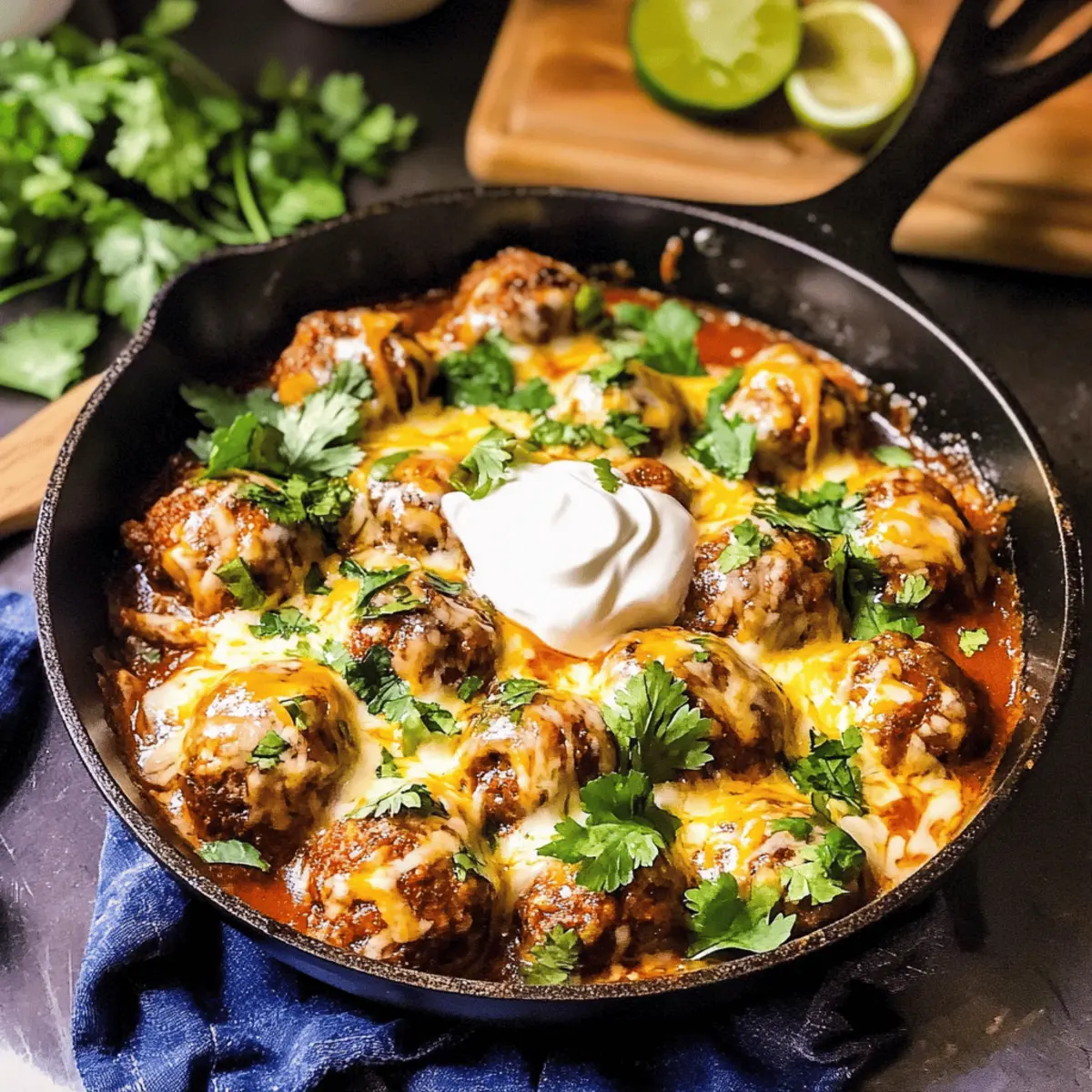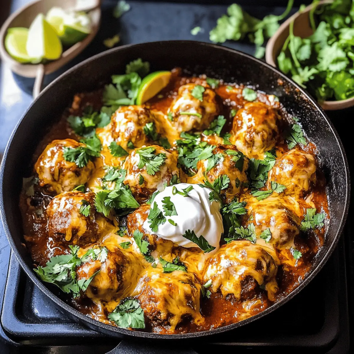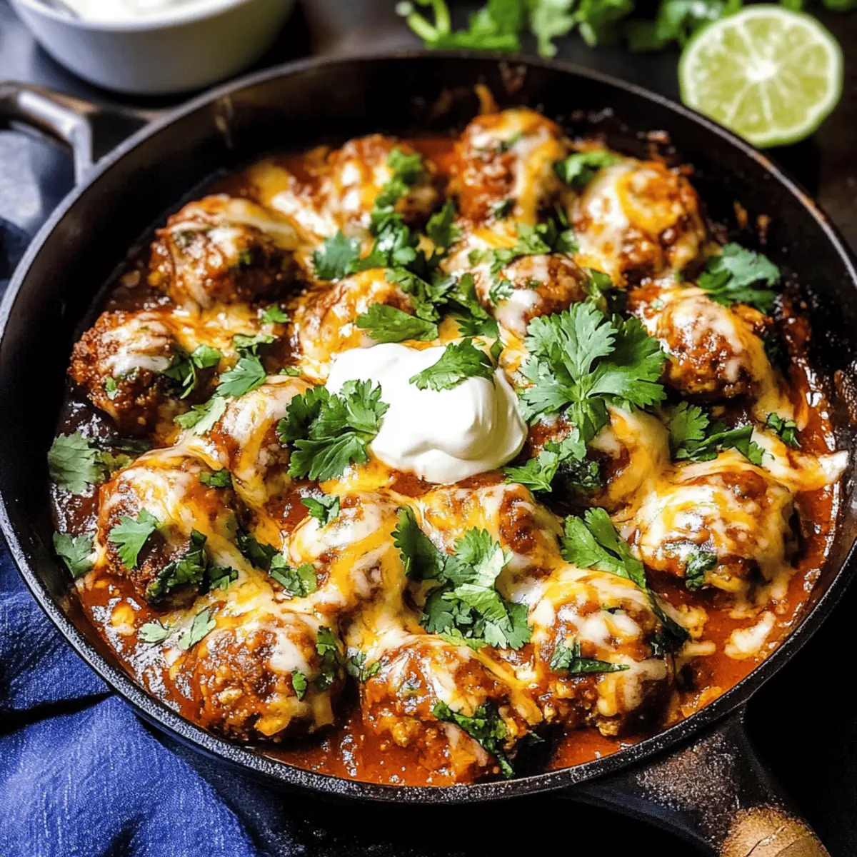 Es war ein hektischer Wochentag, als ich nach einem schnellen und nahrhaften Abendessen suchte. Plötzlich fiel mein Blick auf die leuchtend roten Paprika und die zarten Fleischbällchen im Kühlschrank – die perfekte Sekunde, um unser Keto Enchilada Meatball Skillet zu zaubern! Dieses Rezept ist nicht nur ein wahrer Genuss für den Gaumen, sondern auch ein schnelles, kohlenhydratarmes Gericht, das in nur 25 Minuten auf dem Tisch steht. Die Kombination aus saftigen Fleischbällchen, umhüllt von einer würzigen Enchiladasauce und geschmolzenem Käse, ist nicht nur eine willkommene Abwechslung vom Alltag, sondern auch ideal, um die ganze Familie zu begeistern. Neugierig, wie einfach es ist, dieses köstliche Gericht zuzubereiten? Lass uns gemeinsam eintauchen! Warum wirst du dieses Rezept lieben? Einfachheit: Die Zubereitung unseres Keto Enchilada Fleischbällchen Pfanne ist kinderleicht, sodass auch Kochanfänger im Handumdrehen ein köstliches Gericht zaubern können. Vielseitigkeit: Du kannst die Zutaten nach deinem Geschmack anpassen. Ob mit Rinderhackfleisch, Hähnchen oder einer pflanzlichen Alternative – die Möglichkeiten sind unbegrenzt. Würzige Aromen: Die Kombination aus zarter Sauce und schmelzendem Käse sorgt für einen echten Geschmacksrausch, der an traditionelle Enchiladas erinnert, aber mit einem modernen Twist. Schnell zubereitet: In nur 25 Minuten bist du bereit, ein köstliches, gesundes Gericht zu genießen, das ideal für stressige Wochentage ist. Ideal für die ganze Familie: Dieses Rezept belebt das Abendessen und wird selbst die kleinsten Esser begeistern; am besten servierst du es mit Keto Mexican Cauliflower Rice für eine vollwertige Mahlzeit. Keto Enchilada Fleischbällchen Zutaten • Entdecke die einfachen Zutaten für unser köstliches Gericht! Für die Fleischbällchen Hähnchenhackfleisch – ist die Basis und sorgt für leckere, zarte Fleischbällchen; du kannst auch Rinderhackfleisch verwenden. Paprika – bringt Süße und Textur ins Gericht; tausche sie optional gegen Poblano für mehr Schärfe. Jalapeño – sorgt für Würze; lass sie weg oder reduziere die Menge für ein milderes Gericht. Weiße Zwiebel – verstärkt das Aroma der Fleischbällchen. Koriander – bringt Frische ins Gericht; kann bei Bedarf weggelassen werden. Taco-Gewürz – gibt die notwendige Würze; für eine gesündere Option kannst du es selbst zubereiten. Limettensaft – sorgt für eine frische Note; frischer Saft ist empfehlenswert. Mexikanische Käsemischung – gibt Cremigkeit und schmeckt himmlisch; ersetze sie bei Bedarf durch eine milchfreie Variante. Öl – dient zum Braten der Fleischbällchen; verwende Oliven- oder Avocadoöl für eine gesunde Alternative. Enchiladasoße – die Basis des Gerichts; greife zu einer low-carb Variante, um die Zutaten zu kontrollieren. Für das Topping Sauerrahm – sorgt für eine cremige Konsistenz; du kannst griechischen Joghurt als würzige Alternative verwenden. Koriander (zum Garnieren) – frisch und lecker, ist optional. Schritt-für-Schritt-Anleitungen für Keto Enchilada Fleischbällchen Pfanne Schritt 1: Broiler vorheizen Heize den Broiler deines Ofens auf hohe Stufe vor. Dies ist wichtig, um die Käseoberfläche schön goldbraun und sprudelnd zu machen. Nimm dir währenddessen etwas Zeit, um alle Zutaten für das Keto Enchilada Fleischbällchen Pfanne vorzubereiten und greife zur passenden Pfanne, am besten eine aus Gusseisen. Schritt 2: Fleischbällchen Mischung zubereiten In einer großen Schüssel vermischst du das Hähnchenhackfleisch mit der fein gehackten Paprika, der aufgewürfelten Jalapeño, der Zwiebel, dem Koriander, dem Taco-Gewürz und dem Limettensaft. Mische alles gründlich, bis eine gleichmäßige Masse entsteht. Achte darauf, dass alle Zutaten gut verteilt sind, um den vollen Geschmack zu erreichen. Schritt 3: Meatballs formen Erhitze etwas Öl in deiner Gusseisenpfanne bei mittelhoher Hitze. Während das Öl heiß wird, forme aus der Mischung insgesamt 16 Fleischbällchen. Die Fleischbällchen sollten gleichmäßig groß sein, sodass sie gleichmäßig garen. Eine gute Größe ist etwa so groß wie ein Golfball. Schritt 4: Fleischbällchen anbraten Platziere die geformten Fleischbällchen vorsichtig in der heißen Pfanne. Brate sie für etwa 2-3 Minuten pro Seite, bis sie goldbraun und durchgegart sind. Achte darauf, sie nicht zu überfüllen, damit sie gleichmäßig bräunen und nicht dampfen. Schritt 5: Enchiladasoße hinzufügen Sobald die Fleischbällchen schön gebräunt sind, gieße die Enchiladasoße gleichmäßig über sie. Verwende genug Soße, damit alle Fleischbällchen gut bedeckt sind und die Aromen aufnehmen können. Diese Soße verleiht dem Keto Enchilada Fleischbällchen Pfanne seinen charakteristischen Geschmack. Schritt 6: Käse hinzufügen Streue die mexikanische Käsemischung gleichmäßig über die mit Enchiladasoße bedeckten Fleischbällchen. Der Käse sollte großzügig sein, um eine leckere, cremige Schicht zu bilden. Dies wird helfen, das Gericht noch schmackhafter zu machen, wenn es schließlich gebacken wird. Schritt 7: Broil das Gericht Schiebe die Pfanne in den vorgeheizten Broiler und lasse sie für 3-5 Minuten backen. Beobachte das Gericht genau, bis der Käse geschmolzen und sprudelnd ist. Du möchtest eine goldbraune Kruste, also entferne es rechtzeitig, um ein Anbrennen zu vermeiden. Schritt 8: Servieren Nimm die Pfanne vorsichtig aus dem Ofen und lasse sie etwas abkühlen. Serviere die Keto Enchilada Fleischbällchen Pfanne warm, garniert mit einem Klecks Sauerrahm, frischen geschnittenen Jalapeños und etwas Koriander für den zusätzlichen frischen Geschmack. Lagerungstipps für Keto Enchilada Fleischbällchen Zimmertemperatur:: Lass die Fleischbällchen auf Raumtemperatur abkühlen, bevor du sie lagerst, um Kondensation zu vermeiden. Kühlschrank:: Bewahre die restlichen Keto Enchilada Fleischbällchen in einem luftdichten Behälter im Kühlschrank für bis zu 