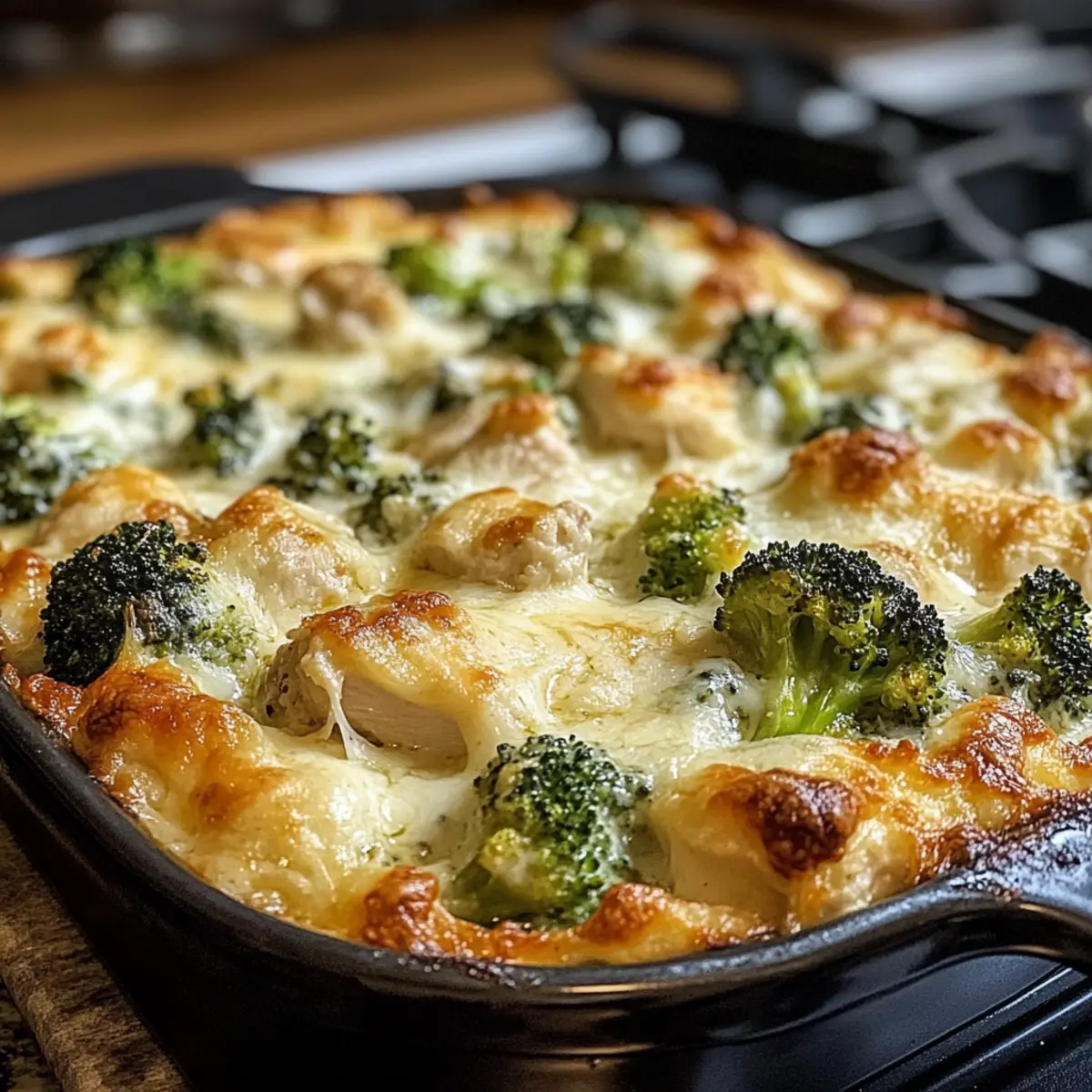 Verteile die Hähnchen- und Brokkolimischung gleichmäßig in der vorbereiteten Auflaufform. Streue zusätzlich geriebenen Mozzarella über die Mischung, um eine noch cremigere und köstlichere Kruste zu erzielen. Dies gibt deinem Gericht eine verführerische goldbraune Oberfläche beim Backen.
