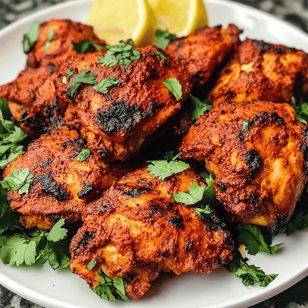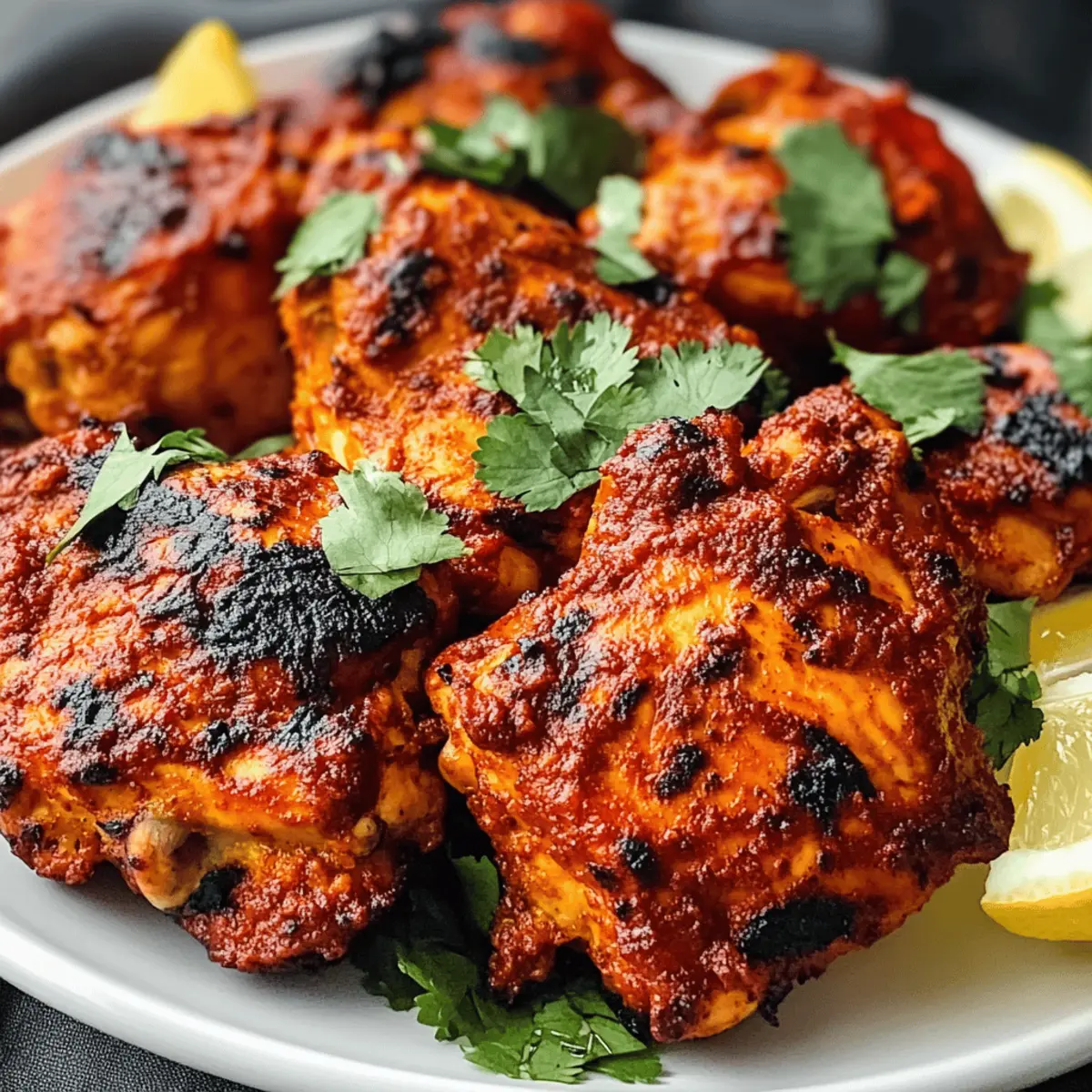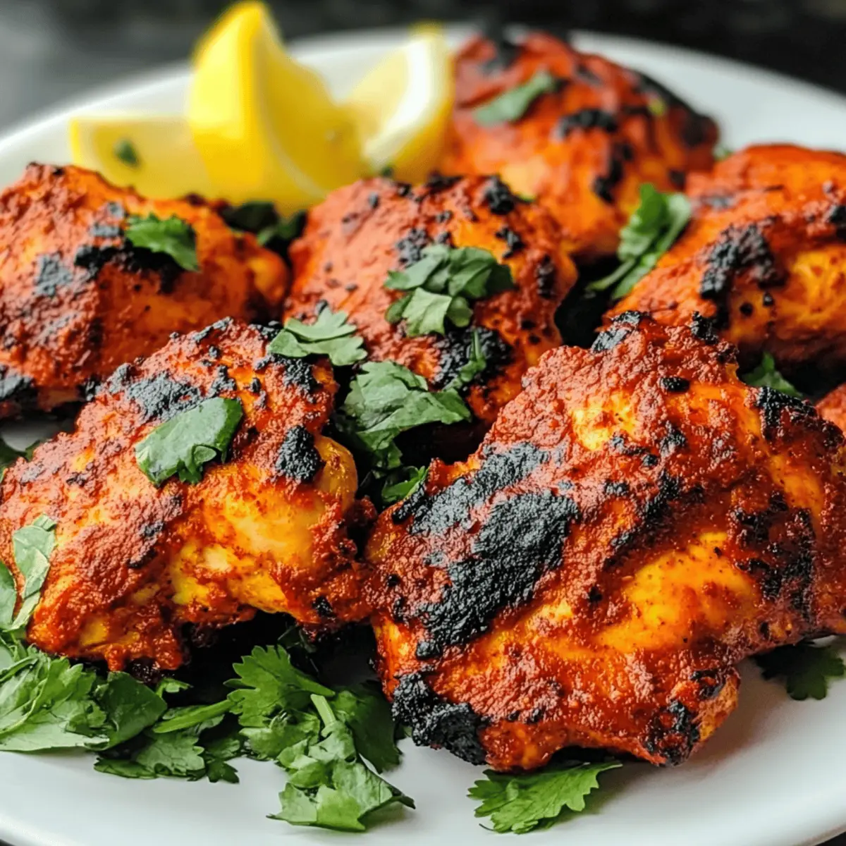 Sobald die ersten Aromen der indischen Gewürze in der Luft liegen, ist es, als ob ich direkt in eine lebhafte Marktstraße in Neu-Delhi versetzt werde. Mit diesem köstlichen Rezept für Tandoori Chicken, das sich auf zarte Hähnchenschenkel in einer aromatischen Joghurtmarinade konzentriert, bringe ich dieses Erlebnis auf den heimischen Tisch. Dieses Gericht ist nicht nur eine perfekte Wahl für festliche Zusammenkünfte oder ein gemütliches Familienessen, sondern auch eine köstliche, keto-freundliche Option für gesundheitsbewusste Genießer. Die Zubereitung ist unkompliziert und die Ergebnisse sind immer ein Hit – ein schmackhaftes Festmahl, das eine wahre Freude für die Geschmacksknospen bietet. Bist du bereit, etwas Einzigartiges zu kreieren? Warum ist Tandoori Hühnchen so besonders? Leckere Aromen: Die einzigartigen Gewürze und das Joghurt sorgen für einen reichhaltigen Geschmack, der Ihre Geschmacksknospen erfreut. Einfacher Prozess: Die Zubereitung ist unkompliziert und erfordert nur grundlegende Kochkenntnisse – perfekt für alle, die gerne selbst kochen. Keto-Freundlich: Dieses Rezept passt hervorragend in eine low-carb Ernährung und ist ideal für gesundheitsbewusste Essgewohnheiten. Vielfalt: Kombinieren Sie das Hühnchen mit frischem Salat oder duftendem Reis, um eine ausgewogene Mahlzeit zu kreieren. Vielleicht interessiert Sie auch unser Marry Chicken Ramen oder das Crack Chicken Gnocchi. Familienfreundlich: Die gesamte Familie wird begeistert sein, und es eignet sich hervorragend für festliche Anlässe. Perfekte Textur: Das Ergebnis ist saftig und zart, mit einer perfekt gebräunten Kruste, die zum Genießen einlädt. Tandoori Hühnchen Zutaten • Ein köstliches Rezept, das Deine Familie lieben wird. Für die Marinade Hühnchenschenkel ohne Knochen – Diese Teile sind saftiger und erleichtern das Marinieren. Limettensaft – Verleiht eine frische, säuerliche Note; kann durch Zitronensaft ersetzt werden. Küchensalz – Essenziell für die Würze; nach Geschmack anpassen. Schwarzer Pfeffer (gemahlen) – Für zusätzliche Schärfe; frisch gemahlen ist am besten. Naturjoghurt – Basis der Marinade, sorgt für Geschmack und Zartheit; kann durch laktosefreien Joghurt ersetzt werden. Knoblauch (gehackt) – Fügt ein aromatisches Element hinzu; frischer Knoblauch ist ideal. Frischer Ingwer (gehackt) – Bringt eine angenehme Wärme; kann in getrockneter Form verwendet werden. Gemahlener Kreuzkümmel – Für erdige Tiefe; kann durch Koriander ersetzt werden. Räucherpaprika – Verleiht eine warme Farbe und Geschmack; normale Paprika ist eine gute Alternative. Gemahlener Kurkuma – Sorgt für eine auffällige Farbe; schwer zu ersetzen ohne Farben zu verändern. Gemahlene Cayenne – Fügt Schärfe hinzu; je nach Vorliebe die Menge anpassen oder weglassen. Schritt-für-Schritt-Anleitungen für Keto Tandoori Hühnchen Schritt 1: Marinieren des Hühnchens Gib Küchensalz, schwarzen Pfeffer und Limettensaft auf die Hühnchenschenkel und reibe sie gut ein. In einer großen Schüssel vermenge den Naturjoghurt mit gehacktem Knoblauch, Ingwer, Kreuzkümmel, Räucherpaprika, Kurkuma und Cayenne. Lege die Hühnchenschenkel in die Marinade und sorge dafür, dass sie gut bedeckt sind. Decke die Schüssel ab und lasse das Hühnchen 6 bis 24 Stunden im Kühlschrank marieren, um die Aromen tief einziehen zu lassen. Schritt 2: Ofen vorheizen Platziere einen Ofenrost in der Mitte und heize den Grill oder den Ofen auf hohe Stufe (ca. 230°C) vor. Die hohe Temperatur sorgt dafür, dass das Keto Tandoori Hühnchen außen schön knusprig wird, während es innen saftig bleibt. Achte darauf, dass der Ofen vollständig vorgeheizt ist, bevor du mit dem nächsten Schritt fortfährst. Schritt 3: Vorbereitung zum Kochen Lege ein Backblech mit Alufolie oder Backpapier aus, um das Aufräumen zu erleichtern. Nimm die marinierten Hühnchenschenkel aus dem Kühlschrank und lege sie gleichmäßig auf das Blech. Achte darauf, dass sie genügend Platz zwischen den einzelnen Stücken haben, um eine gleichmäßige Bräunung zu erreichen. Schritt 4: Hühnchen garen Schiebe das Backblech in den vorgeheizten Ofen und grille das Hühnchen für etwa 15 bis 20 Minuten, bis die Oberseite schön gebräunt ist und leicht angekohlt aussieht. Wende die Stücke vorsichtig und backe sie dann weitere 10 Minuten, bis die Innentemperatur mindestens 74°C erreicht hat. Dies sichert, dass dein Keto Tandoori Hühnchen perfekt durchgegart ist. Schritt 5: Servieren Lass das Hühnchen nach dem Garen einige Minuten ruhen, bevor du es servierst. Dadurch bleibt es besonders saftig und zart. Serviere das Keto Tandoori Hühnchen zusammen mit frischem Salat, duftendem Reis oder warmem Naan, um ein ausgewogenes und köstliches Essen zu genießen. Was passt zu Keto Tandoori Hühnchen? Sofortige Begeisterung kommt auf, wenn man die Aromen des würzigen Hühnchens mit frischen, knackigen Beilagen kombiniert. Frischer Gurkensalat: Ein erfrischender Salat ergänzt das würzige Hühnchen und bringt eine knackige Textur ins Spiel. Duftender Basmati-Reis: Aromatisch und leicht, dieser Reis dient als perfekte Grundlage und rundet das Gericht harmonisch ab. Warmer Naan: Dieses weiche Brote ist ideal, um die köstliche Marinade aufzusaugen und ein ganzheitliches Geschmackserlebnis zu bieten. Gegrilltes Gemüse: Bunte Gemüse wie Paprika und Zucchini bringen nicht nur Farbe auf den Teller, sondern auch eine gesunde Note. Minz-Joghurt-Dip: Diese kühlende Sauce balanciert die Gewürze des Hühnchens perfekt und sorgt für Vielfalt. Limonade oder Mango-Lassi: Erfrischende Getränke setzen einen fruchtigen Akzent und runden das Essen wunderbar ab. Kombiniere diese Beilagen, um ein unvergessliches Abendessen zu schaffen, das nicht nur satt hält, sondern auch die Geschmacksnerven verwöhnt! Meal Prep für Keto Tandoori Hühnchen Das Keto Tandoori Hühnchen ist ideal geeignet für die Vorbereitung, um dir während der Woche Zeit zu sparen! 