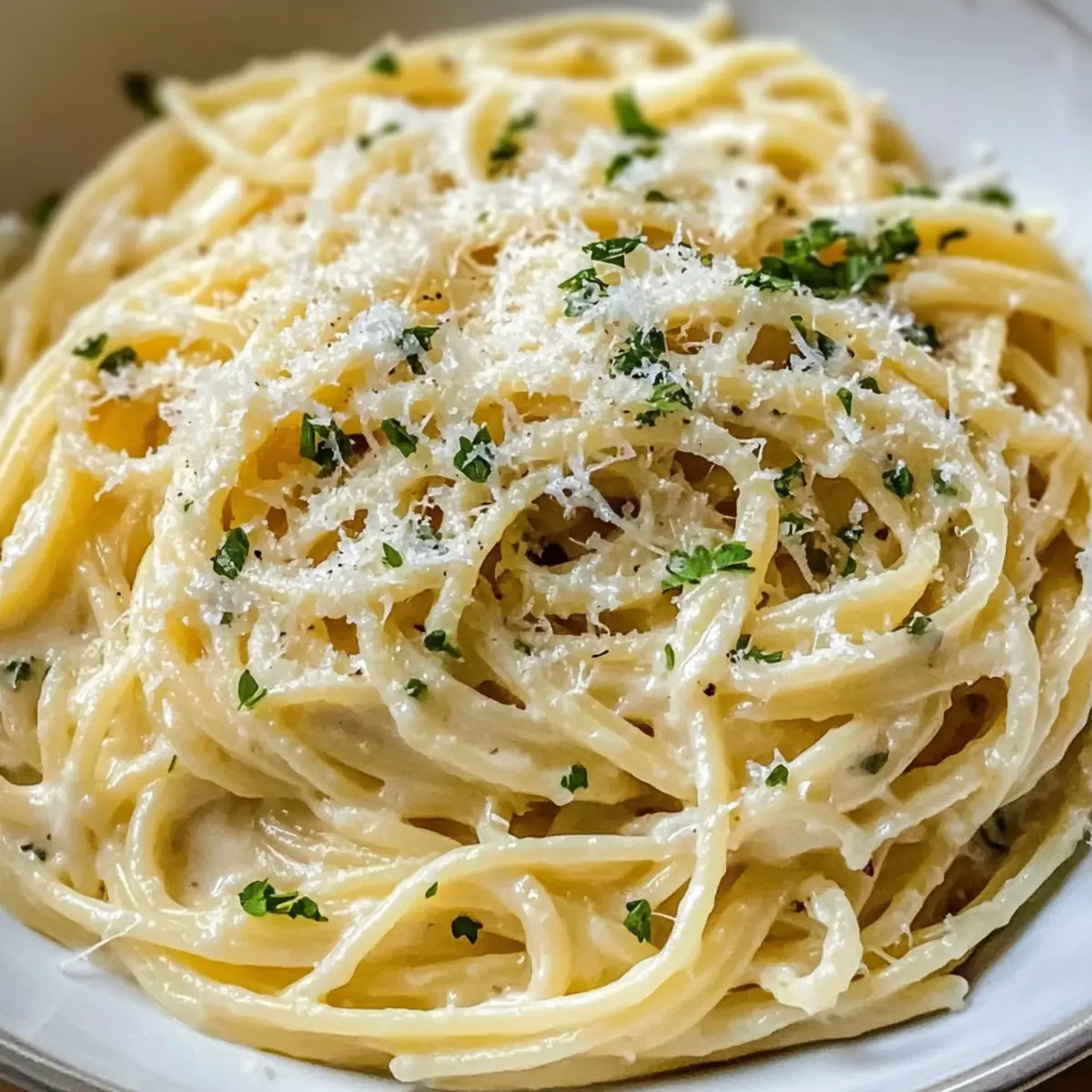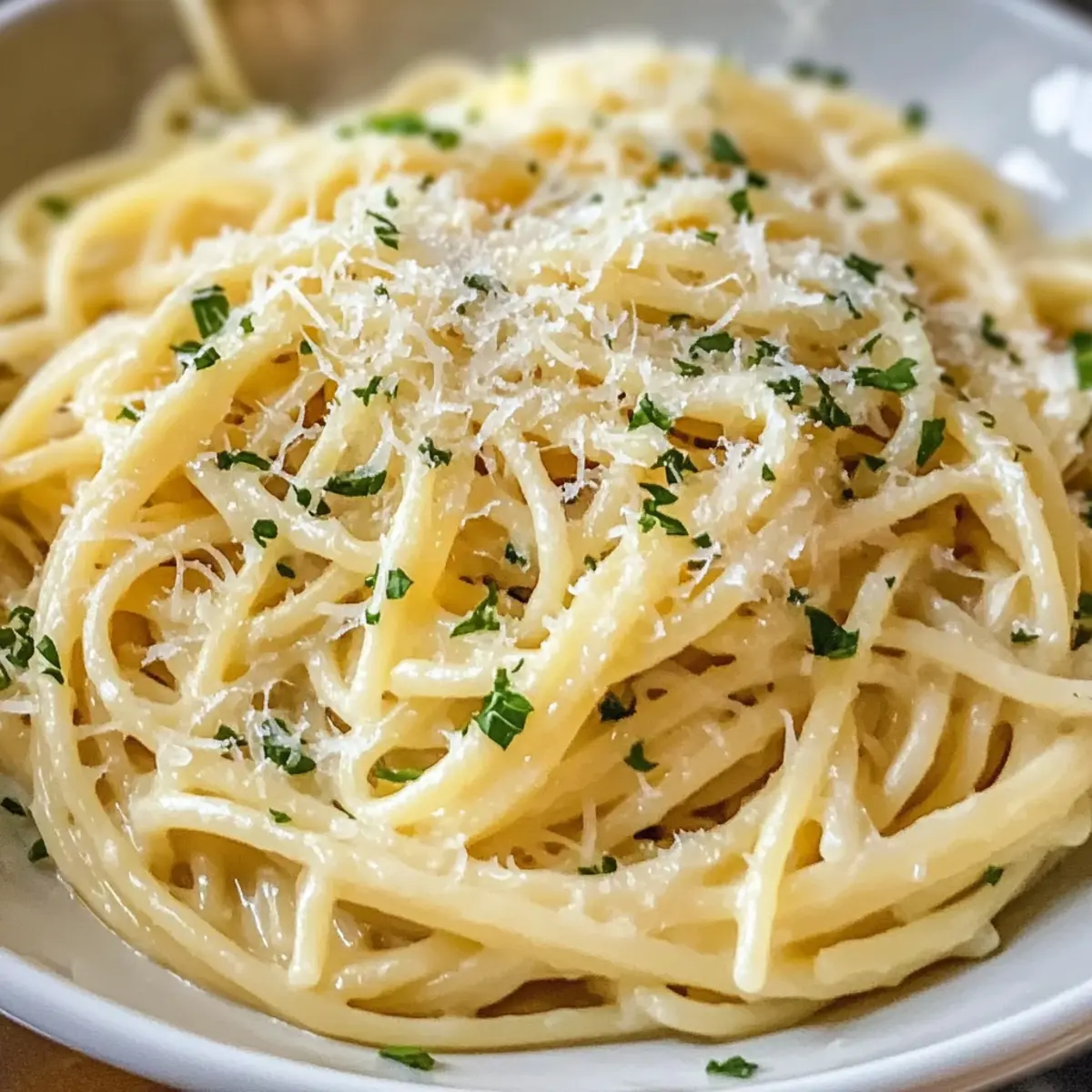 Hast du schon mal überlegt, wie köstlich einfache Gerichte sein können? Die Knoblauch Parmesan Pasta ist nicht nur ein schnelles Abendessen für hektische Wochentage, sondern auch eine wahre Umarmung auf dem Teller. In nur 20 Minuten verwandeln sich butterzarte Nudeln in eine cremige, aromatische Sauce, die mit tiefem Parmesan- und Knoblauchgeschmack begeistert. Und das Beste daran? Dieses Rezept ist so kinderleicht, dass sogar Kochanfänger ihre Familie damit begeistern können. Ob als Comfort Food nach einem langen Tag oder als schnelle Mahlzeit für Freunde – dieses Gericht kommt immer gut an. Bist du bereit, einen Löffel voll Freude zu genießen? Warum wirst du dieses Rezept lieben? Einfachheit: Die Zubereitung von Knoblauch Parmesan Pasta ist kinderleicht und benötigt nur grundlegende Kochkenntnisse. Kreativität: Du kannst das Rezept nach Belieben anpassen, indem du zum Beispiel Garnelen oder Hühnchen hinzufügst. Schnelligkeit: In nur 20 Minuten zauberst du ein köstliches Gericht, das ideal für stressige Wochentage ist. Cremiger Genuss: Die Kombination aus Butter, Parmesan und frischem Knoblauch sorgt für ein unvergleichlich reichhaltiges Aroma, das sowohl Kinder als auch Erwachsene begeistert. Vielseitigkeit: Perfekt als Hauptgericht oder als Beilage zu einem leichten Salat, es wird immer gut ankommen. Gönn dir ein Stück bei dieser feinen Pasta und entdecke das Gefühl von Zuhause bei jedem Bissen! Knoblauch Parmesan Pasta Zutaten Für die Pasta • Pasta – Der Grundpfeiler des Gerichts; passe die Kochzeit je nach Pasta-Sorte an. Für die Sauce • Butter – Verleiht eine wunderbare Cremigkeit und Tiefe; verwende für eine leichtere Option Olivenöl. • Knoblauch – Sorgt für einen intensiven Geschmack; frischer Knoblauch ist am besten für dieses Rezept. • Parmesan – Verantwortlich für die Cremigkeit und den würzigen Geschmack; frisch gerieben liefert das beste Aroma. • Milch – Kombiniert mit Butter und Käse für eine samtige Sauce; ersetze sie durch fettarme Milch für eine leichtere Variante oder durch Sahne für extra Weichheit. Für die Garnitur • Petersilie – Frisch gehackt zur Geschmacks- und Farbauffrischung; optional, aber empfehlenswert für das perfekte Finish. Entdecke mit dieser Knoblauch Parmesan Pasta die einfache Eleganz eines schnellen, kreativen Abendessens! Step-by-Step Instructions for Knoblauch Parmesan Pasta Step 1: Pasta kochen Bring einen großen Topf mit Wasser zum Kochen und füge eine großzügige Prise Salz hinzu. Koche die Pasta gemäß den Anweisungen auf der Verpackung, bis sie al dente ist, meist etwa 8–10 Minuten. Sobald die Pasta fertig ist, gieße sie ab und behalte etwa eine Tasse des Nudelwassers für später. Step 2: Butter und Knoblauch anbraten Erhitze eine große Pfanne bei mittlerer Hitze und füge die Butter hinzu. Lass sie schmelzen und füge den fein gehackten Knoblauch hinzu. Sauté den Knoblauch etwa eine Minute lang, bis er goldbraun und aromatisch ist; achte darauf, dass er nicht verbrennt, um den bitteren Geschmack zu vermeiden. Step 3: Pasta und Sauce kombinieren Reduziere die Hitze auf niedrig und füge die gekochte Pasta in die Pfanne mit dem Knoblauch und der Butter. Rühre kräftig um, um die Pasta gut zu beschichten. Füge nun den frisch geriebenen Parmesan und die Milch hinzu; mische alles, bis der Käse schmilzt und eine cremige Sauce entsteht, die die Pasta umhüllt. Step 4: Sauce anpassen Wenn die Sauce zu dick erscheint, füge nach und nach das reservierte Nudelwasser hinzu, bis die gewünschte Konsistenz erreicht ist. Rühre gut um, damit die Sauce gleichmäßig verteilt wird und die Pasta schön glänzt. Step 5: Abschmecken und garnieren Schmecke die Knoblauch Parmesan Pasta mit Salz und frisch gemahlenem Pfeffer ab, um den Geschmack zu intensivieren. Wenn gewünscht, garniere das Gericht mit frisch gehackter Petersilie, um einen farbenfrohen Akzent hinzuzufügen und den Aromenkick zu verstärken. Step 6: Servieren Sofort servieren, um die cremige Textur und den intensiven Geschmack der Knoblauch Parmesan Pasta zu genießen. Diese schmackhafte, hausgemachte Mahlzeit ist das perfekte Rezept für einen schnellen und leckeren Genuss an jedem Wochentag. Meal Prep für Knoblauch Parmesan Pasta Die Knoblauch Parmesan Pasta ist ideal für die Vorbereitung im Voraus! Du kannst die Pasta bis 3 Tage im Voraus kochen und in einem luftdichten Behälter im Kühlschrank aufbewahren; so sparst du Zeit an hektischen Abenden. Auch die Sauce aus Butter, frischem Knoblauch und Parmesan kann bis zu 24 Stunden vorher zubereitet und in einem separaten Behälter im Kühlschrank gelagert werden. Um die Qualität zu erhalten, achte darauf, die Sauce vor dem Erhitzen mit etwas Milch oder Nudelwasser aufzulockern, sodass sie wieder cremig wird. Wenn du bereit bist zu servieren, kombiniere einfach die vorgekochte Pasta mit der Sauce in einer Pfanne und erhitze alles für 2-3 Minuten – dadurch erhältst du ein frisch zubereitetes, köstliches Gericht mit minimalem Aufwand! Lagerungstipps für Knoblauch Parmesan Pasta Raumtemperatur:: Gekochte Pasta sollte nicht länger als 2 Stunden bei Raumtemperatur stehen gelassen werden, um die Frische zu bewahren. Kühlschrank:: Bewahre die Knoblauch Parmesan Pasta in einem luftdichten Behälter im Kühlschrank auf und genieße sie innerhalb von 3 Tagen. Gefrierschrank:: Für eine längere Lagerung kannst du die Pasta bis zu 3 Monate im Gefrierfach aufbewahren. Denke daran, sie in portionsgerechte Behälter zu füllen und gut zu verpacken. Wiedererhitzen:: Beim Aufwärmen füge etwas Milch oder Butter hinzu, um die Cremigkeit der Sauce wiederherzustellen und ein perfektes Geschmackserlebnis zu gewährleisten. Was passt gut zu Knoblauch Parmesan Pasta? Ergänze deine knoblauchige Pasta mit erfrischenden Beilagen und köstlichen Getränken für ein rundum gelungenes Essen. Knuspriges Brot: Perfekt zum Dippen in die cremige Sauce und für zusätzlichen Crunch. Ein Baguette 
